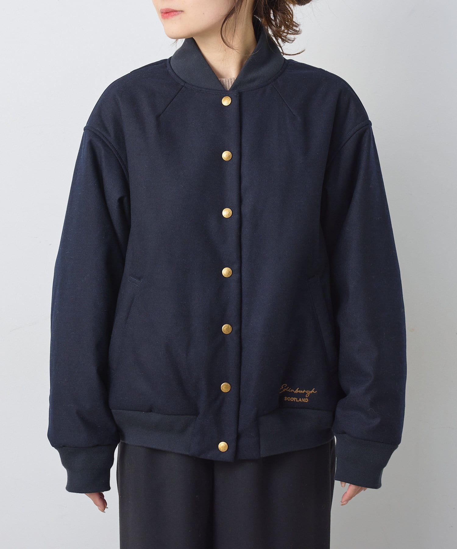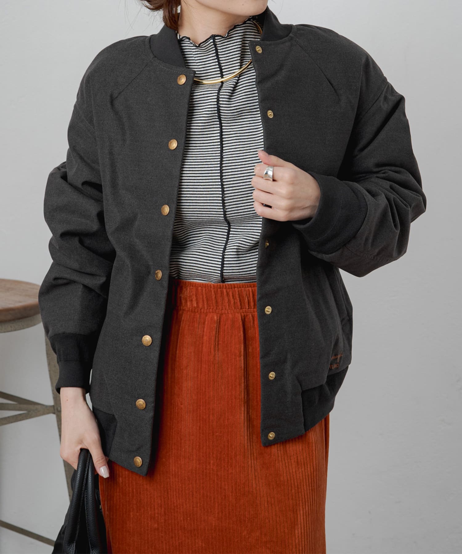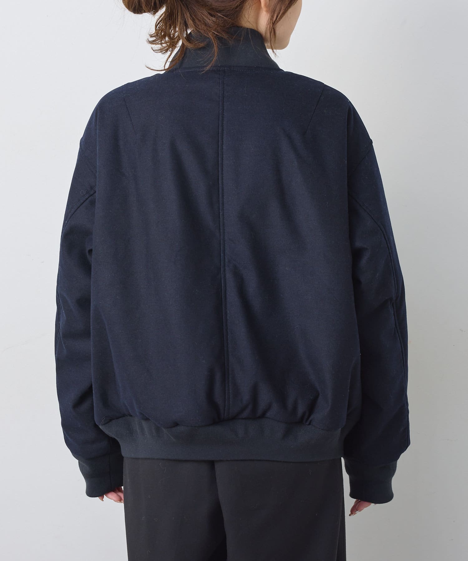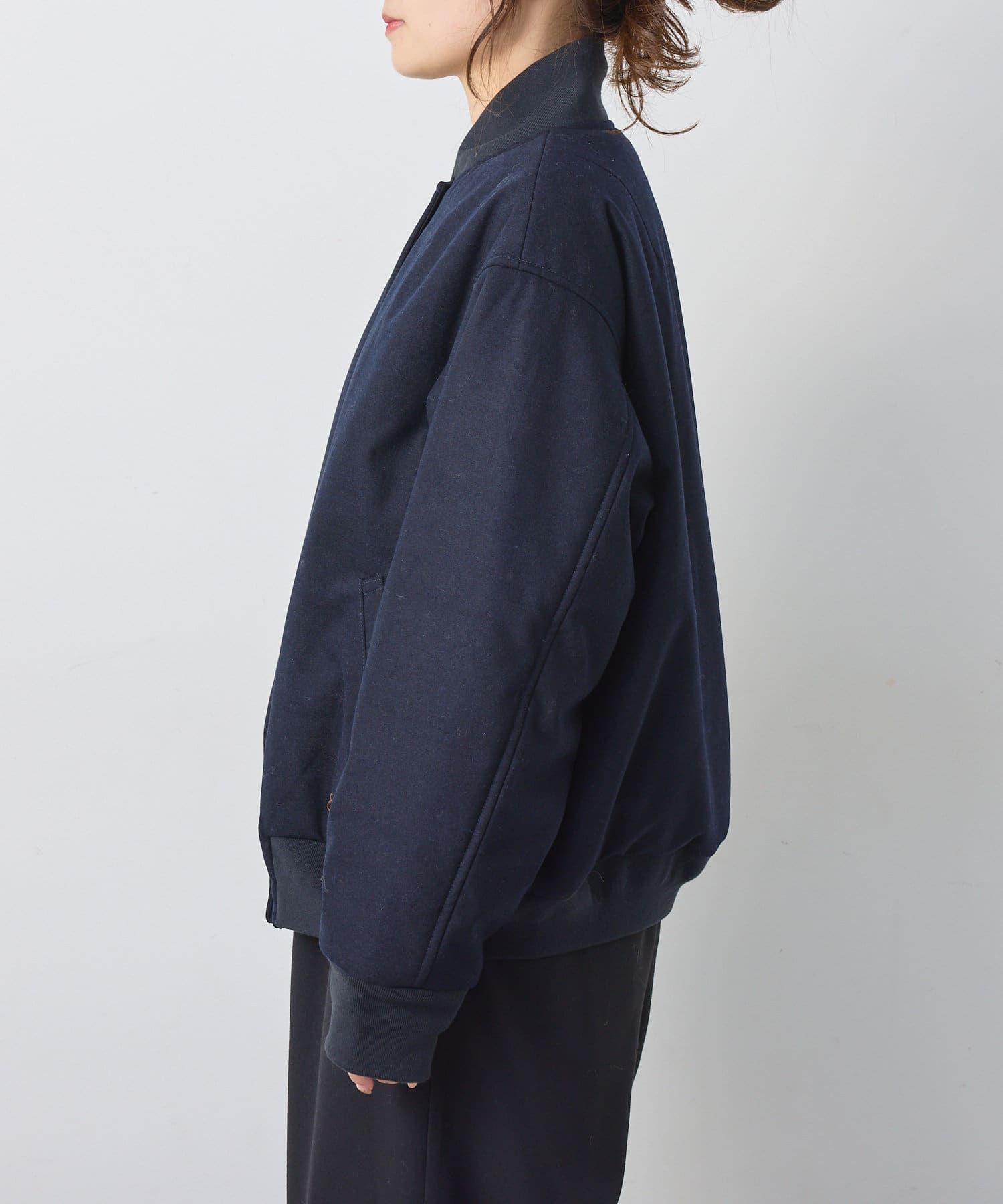 リブ使いが特徴のスタジャンのディティールを、わざと上品見えな素材に落し込むことでMIXされたテイストを楽しめる1着。