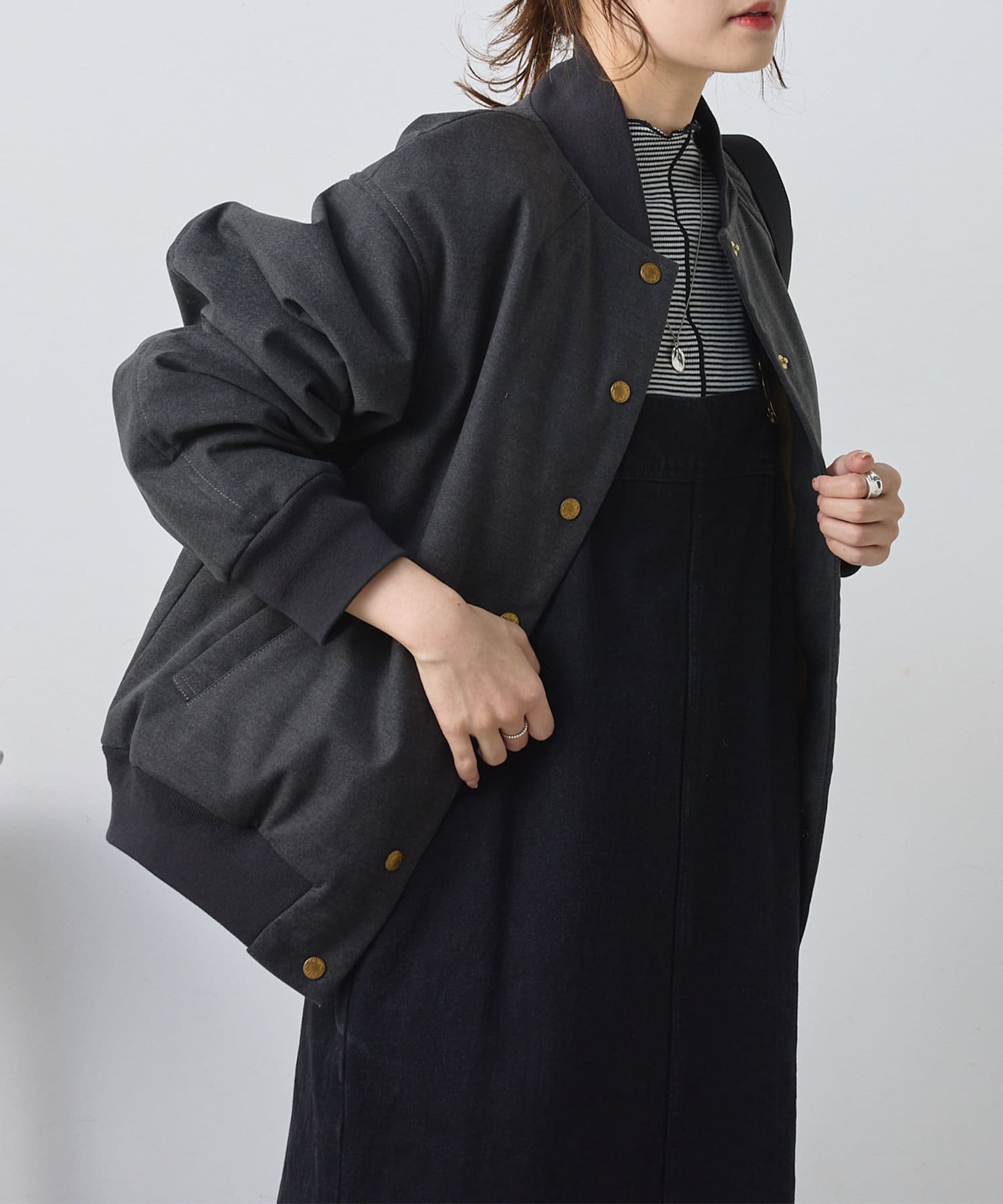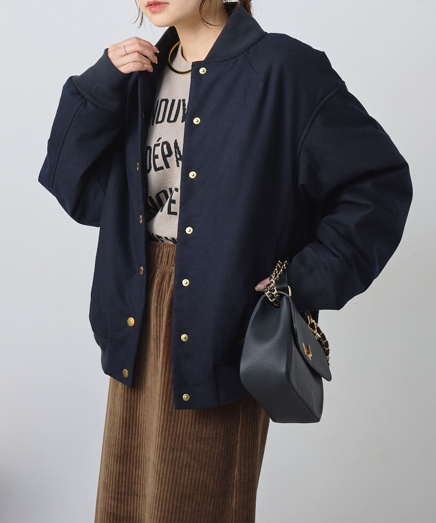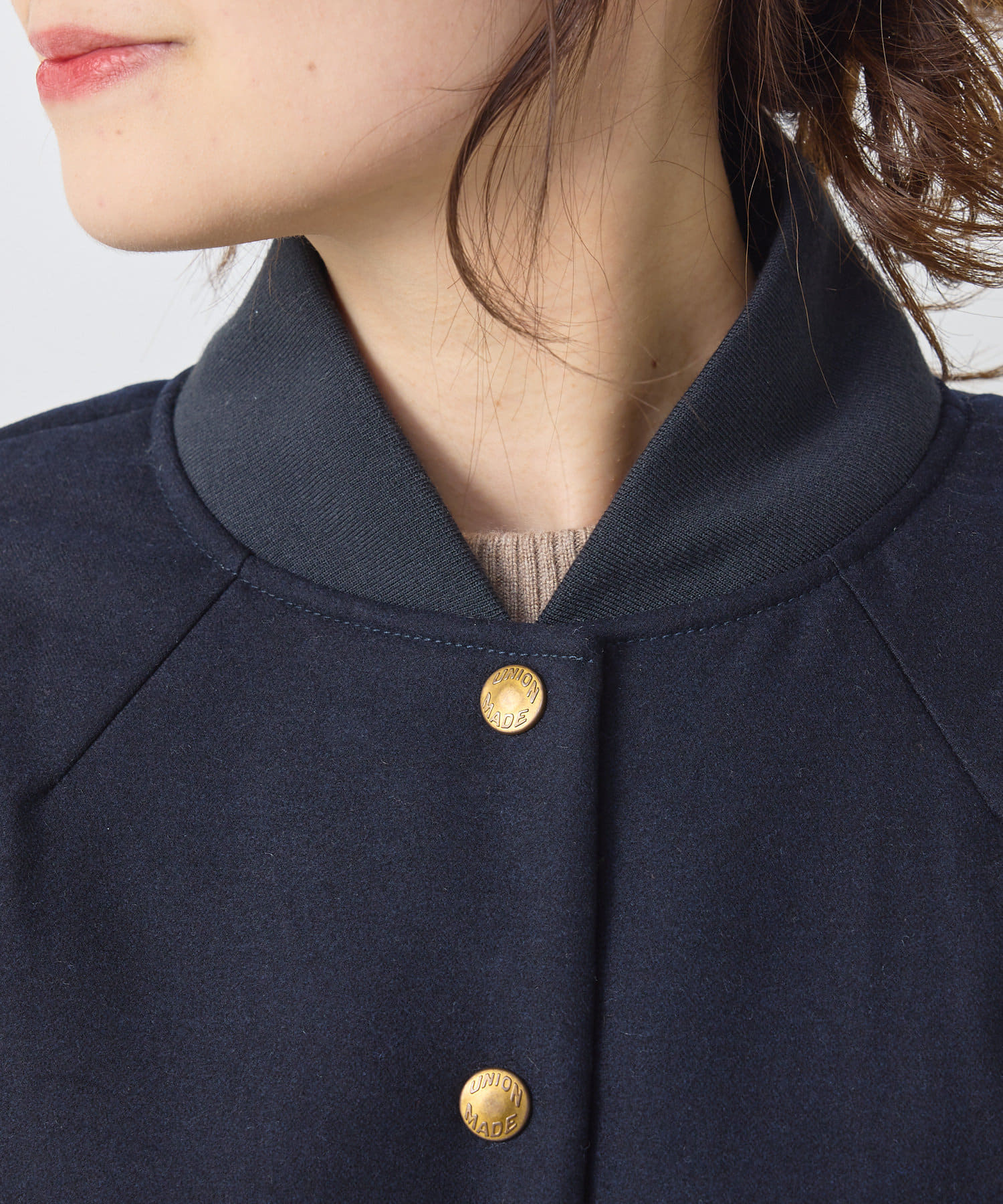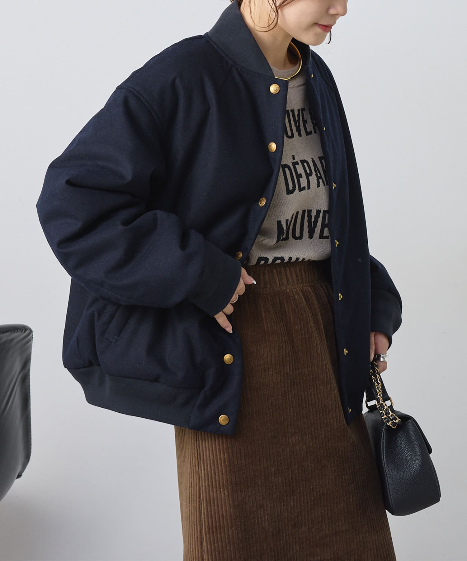 リブ使いが特徴のスタジャンのディティールを、わざと上品見えな素材に落し込むことでMIXされたテイストを楽しめる1着。