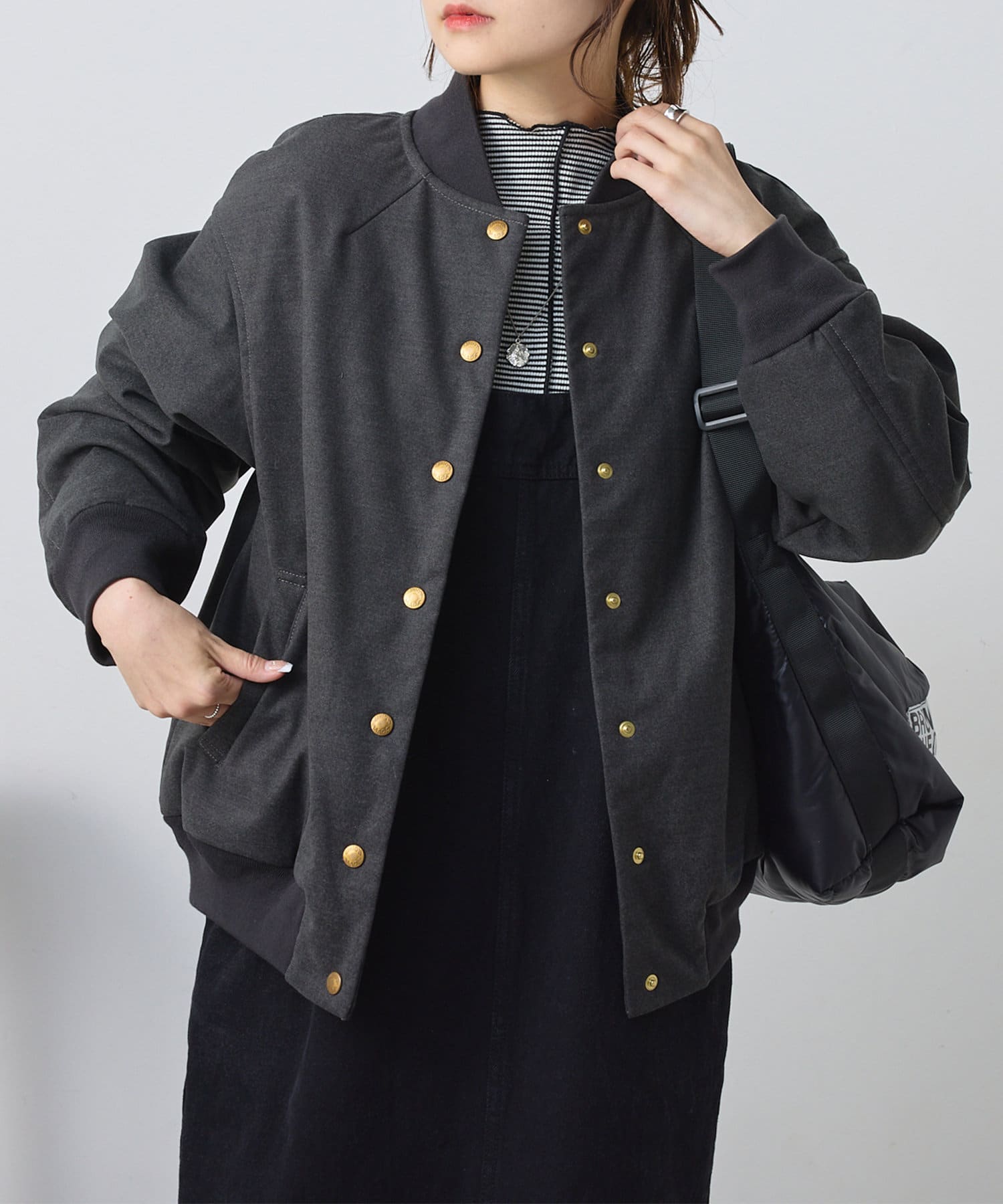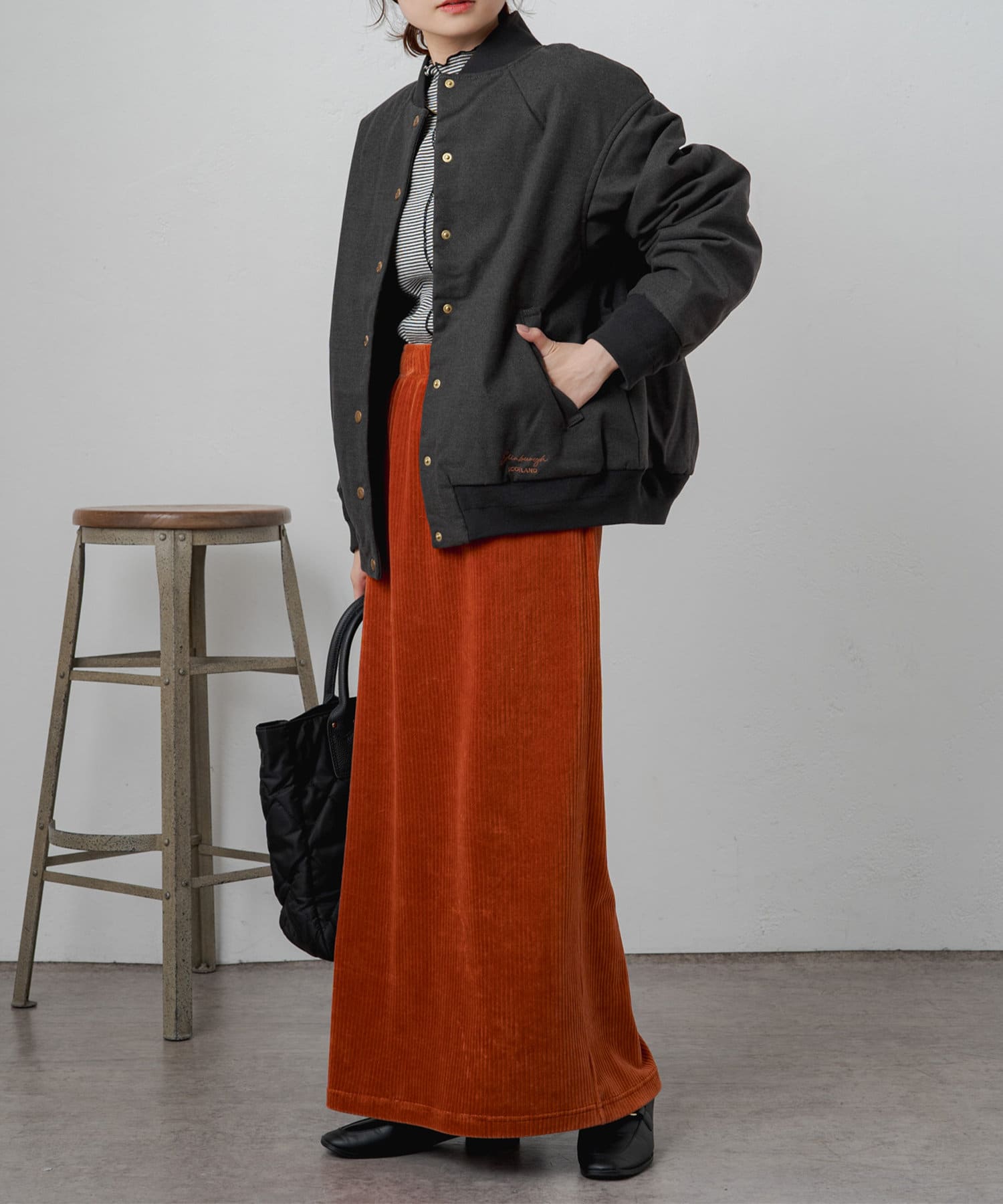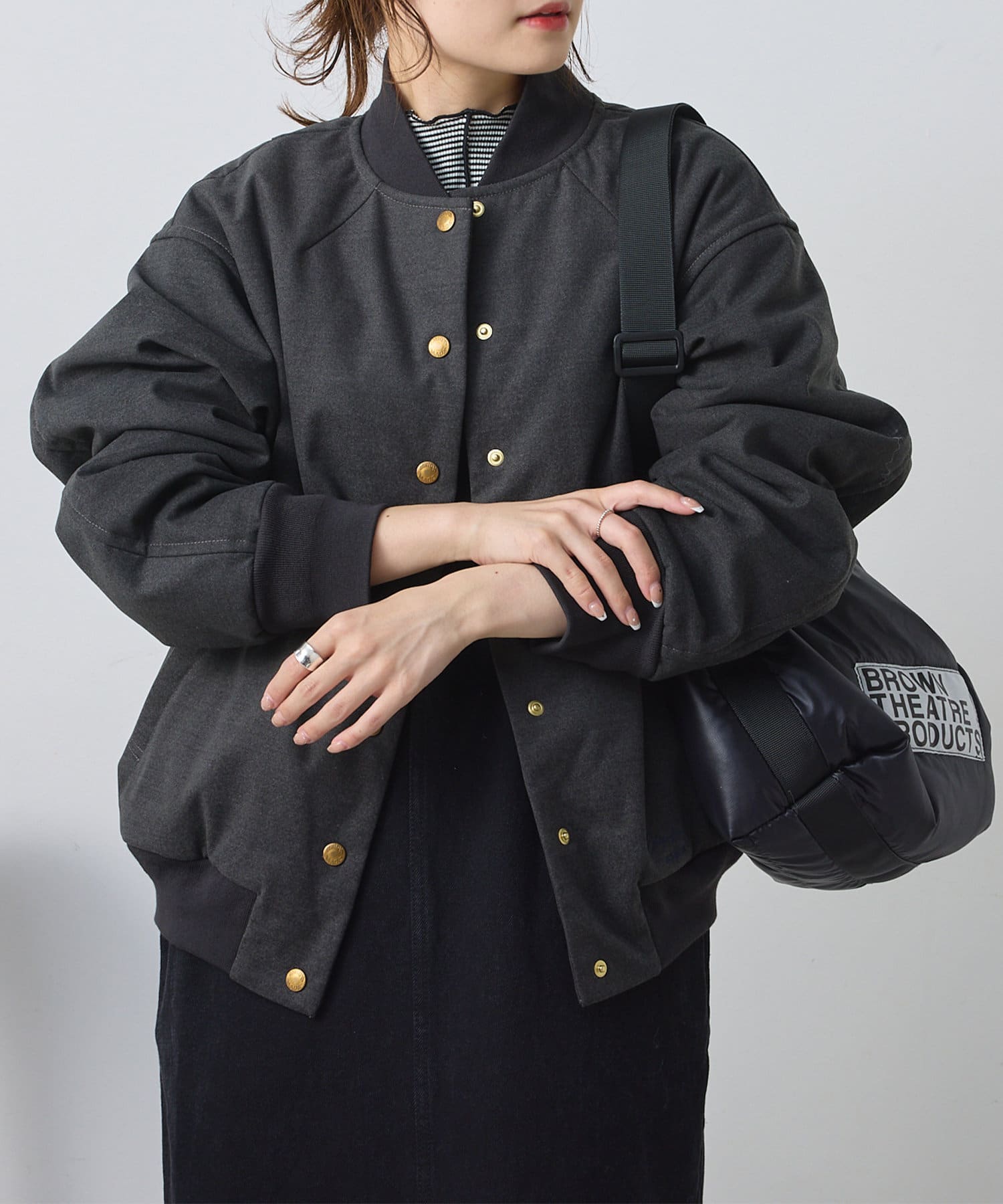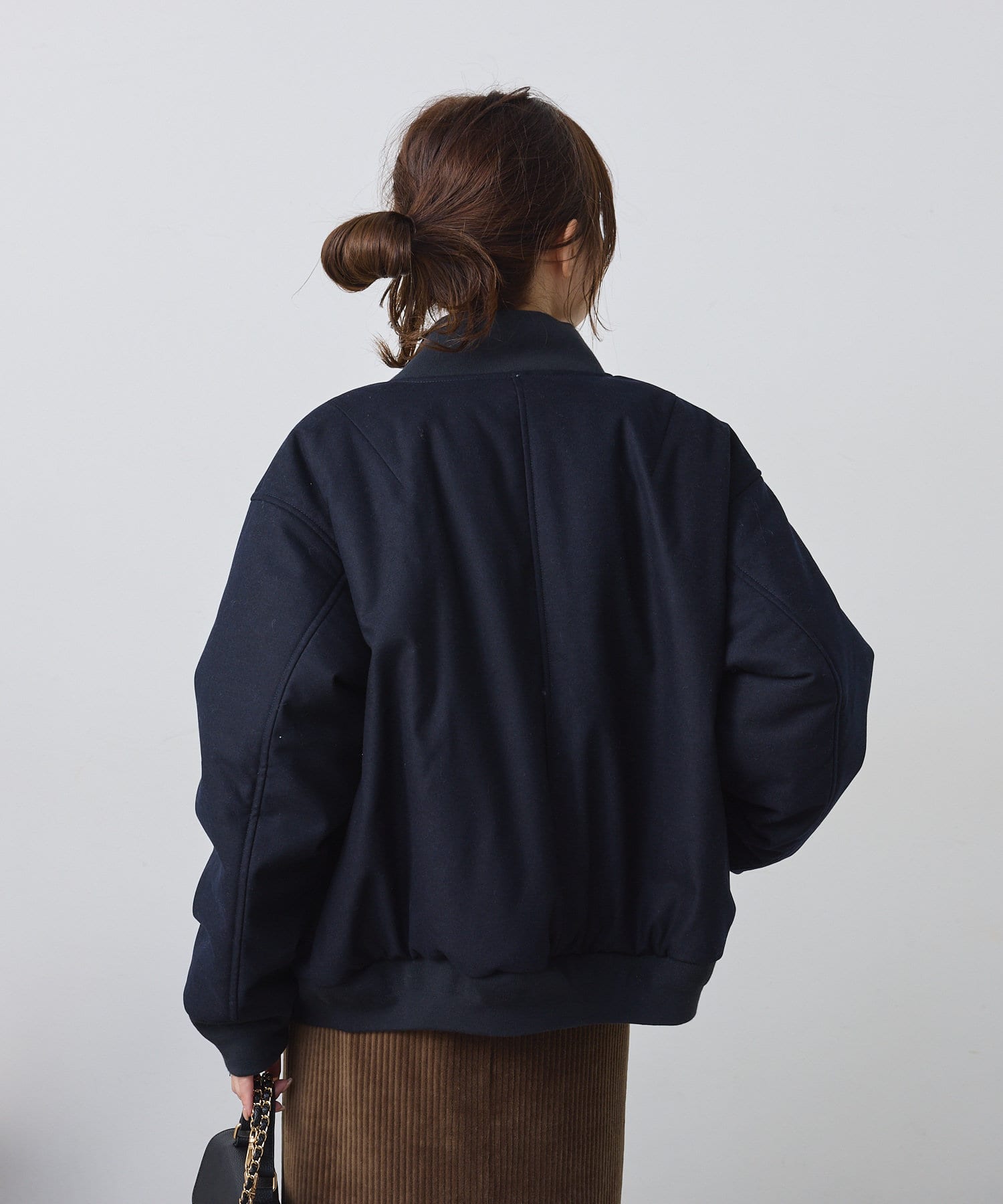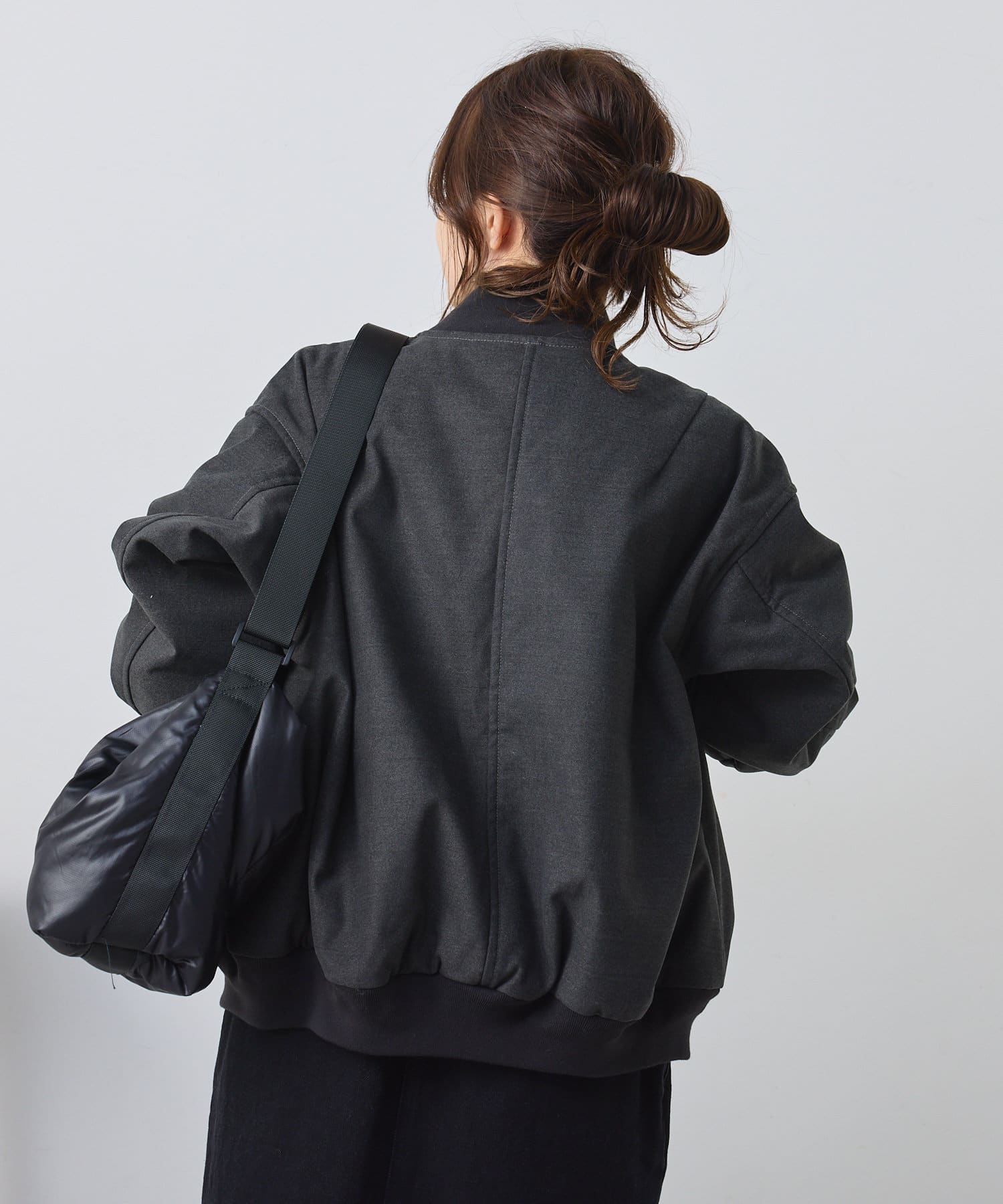 リブ使いが特徴のスタジャンのディティールを、わざと上品見えな素材に落し込むことでMIXされたテイストを楽しめる1着。