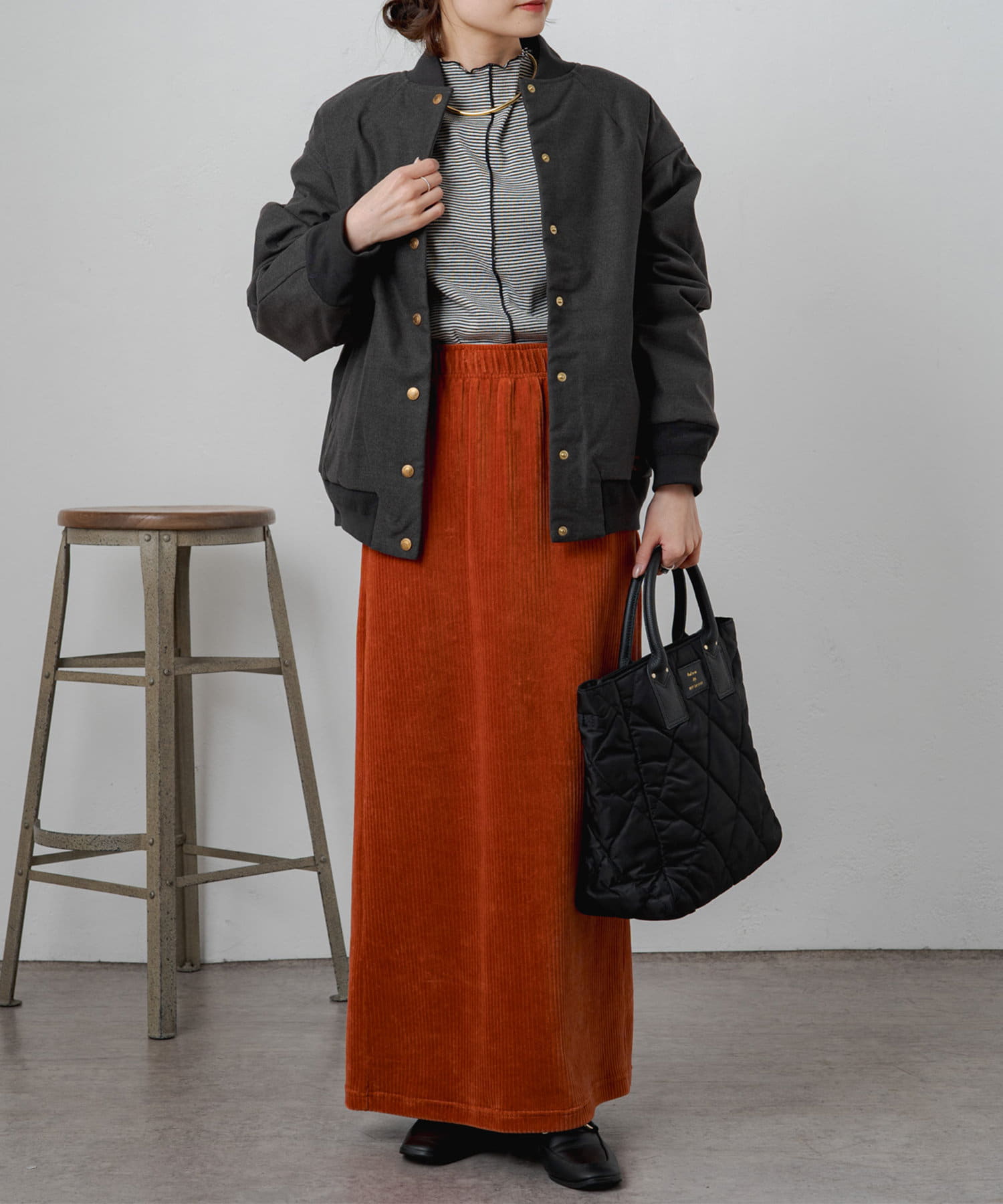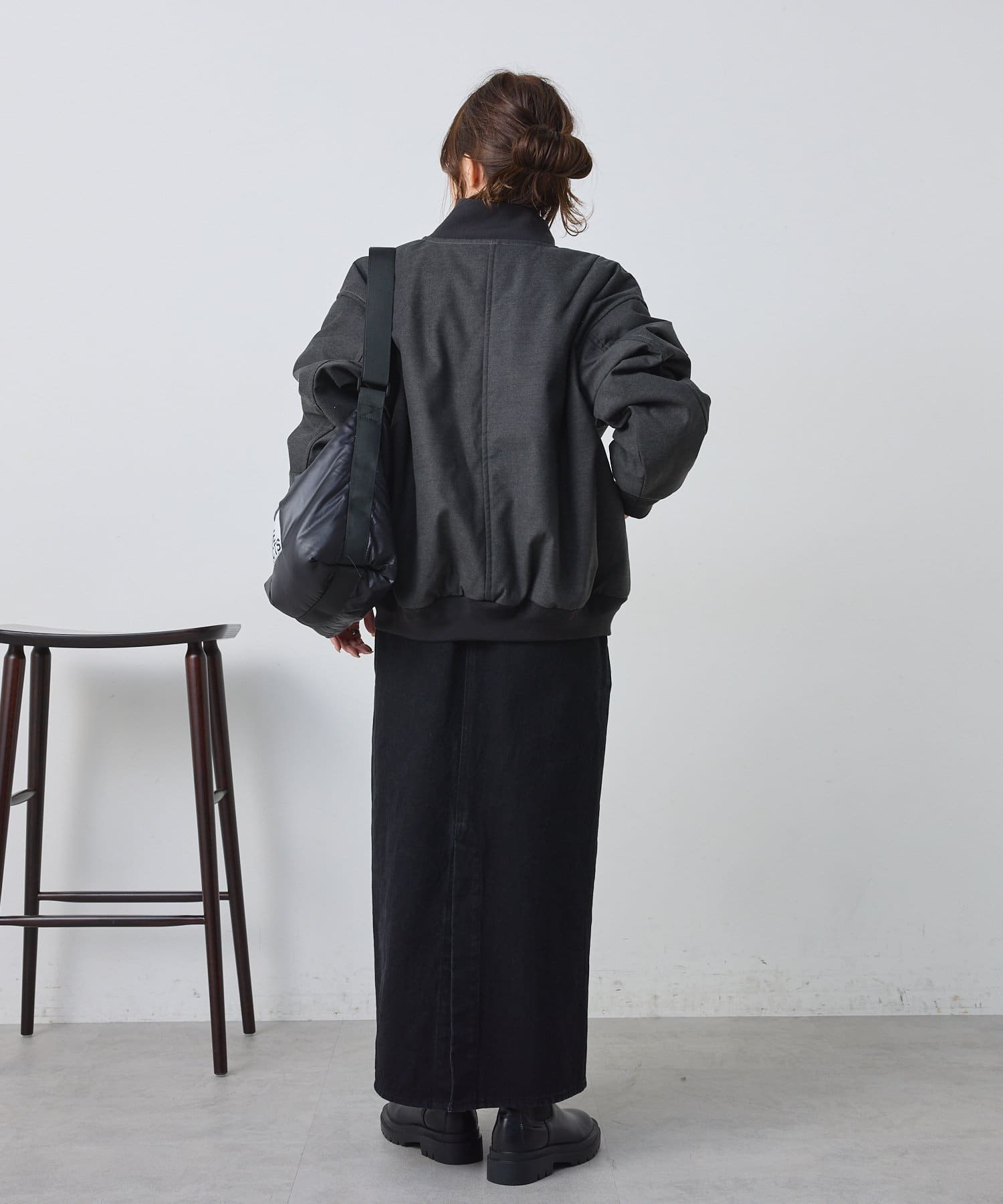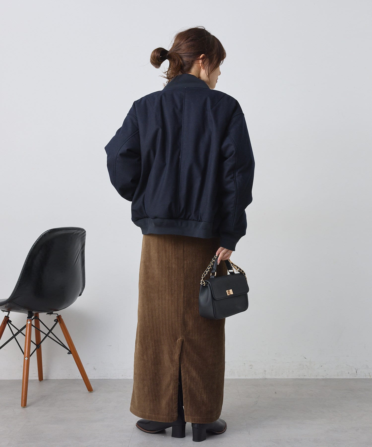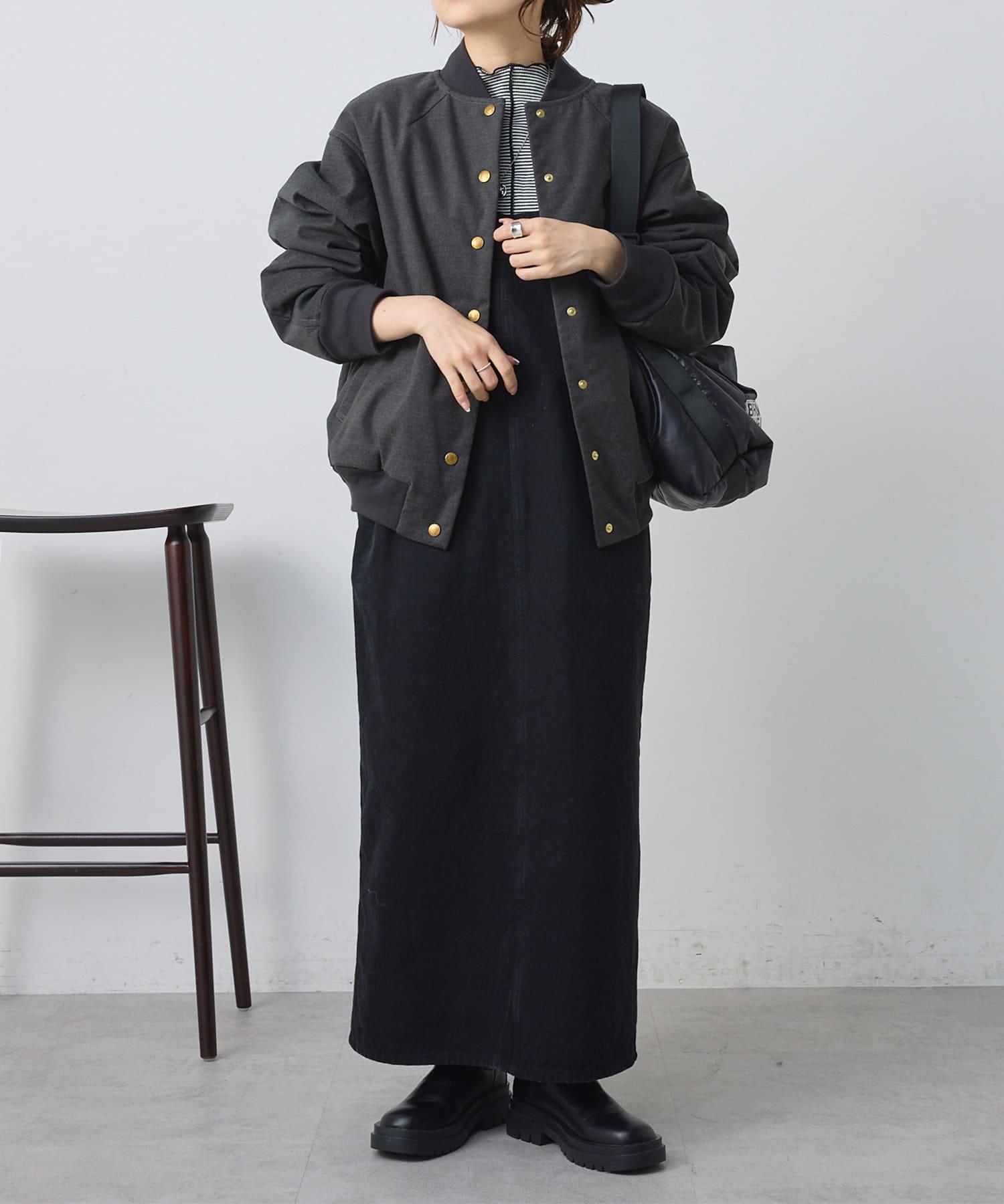 リブ使いが特徴のスタジャンのディティールを、わざと上品見えな素材に落し込むことでMIXされたテイストを楽しめる1着。