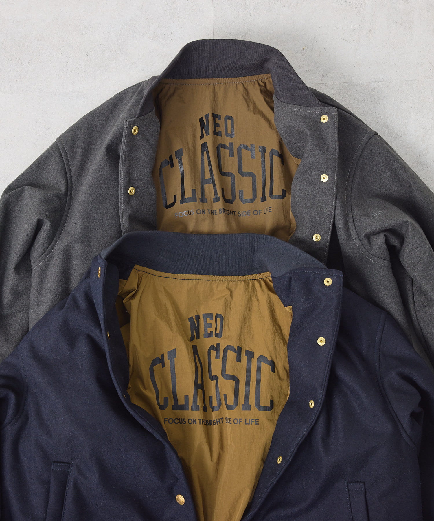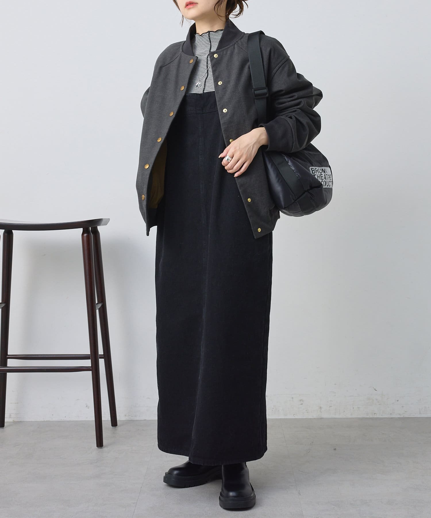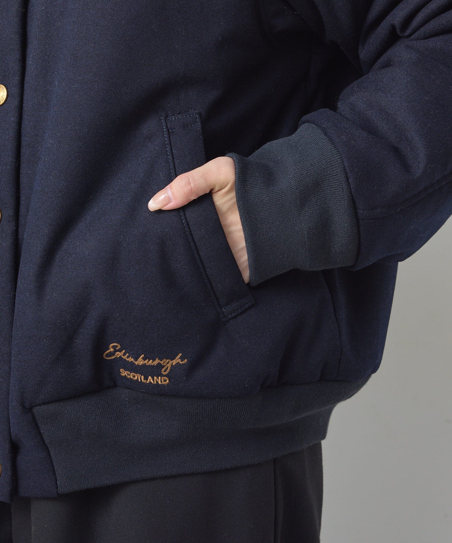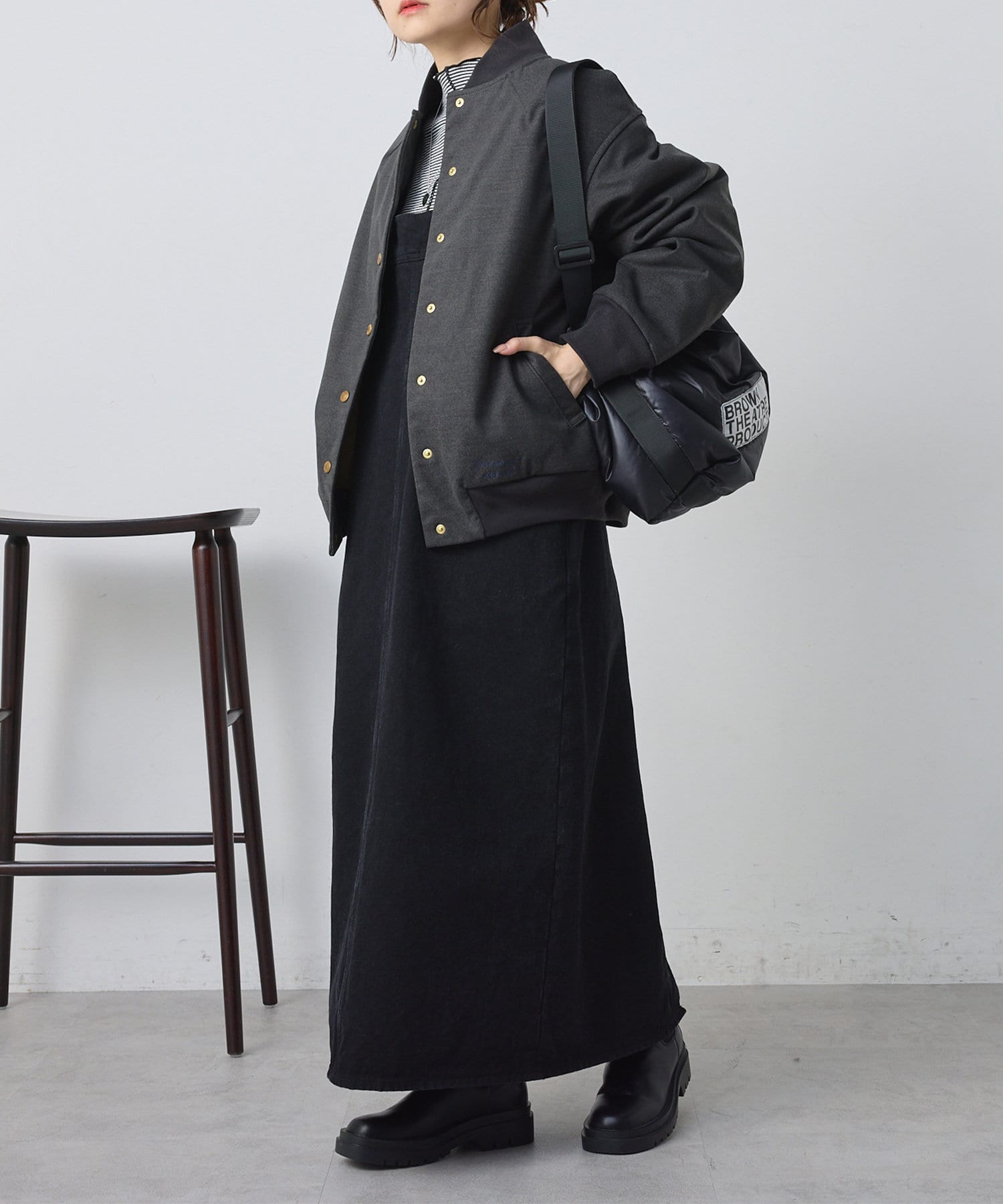 リブ使いが特徴のスタジャンのディティールを、わざと上品見えな素材に落し込むことでMIXされたテイストを楽しめる1着。