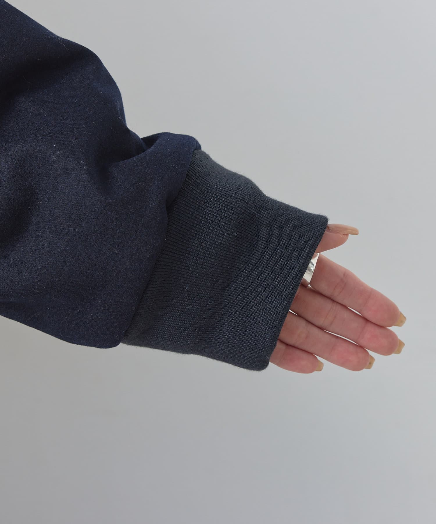 同色に仕立てたリブは、冷たい空気を防ぐだけでなくデザインを引き締める効果も。