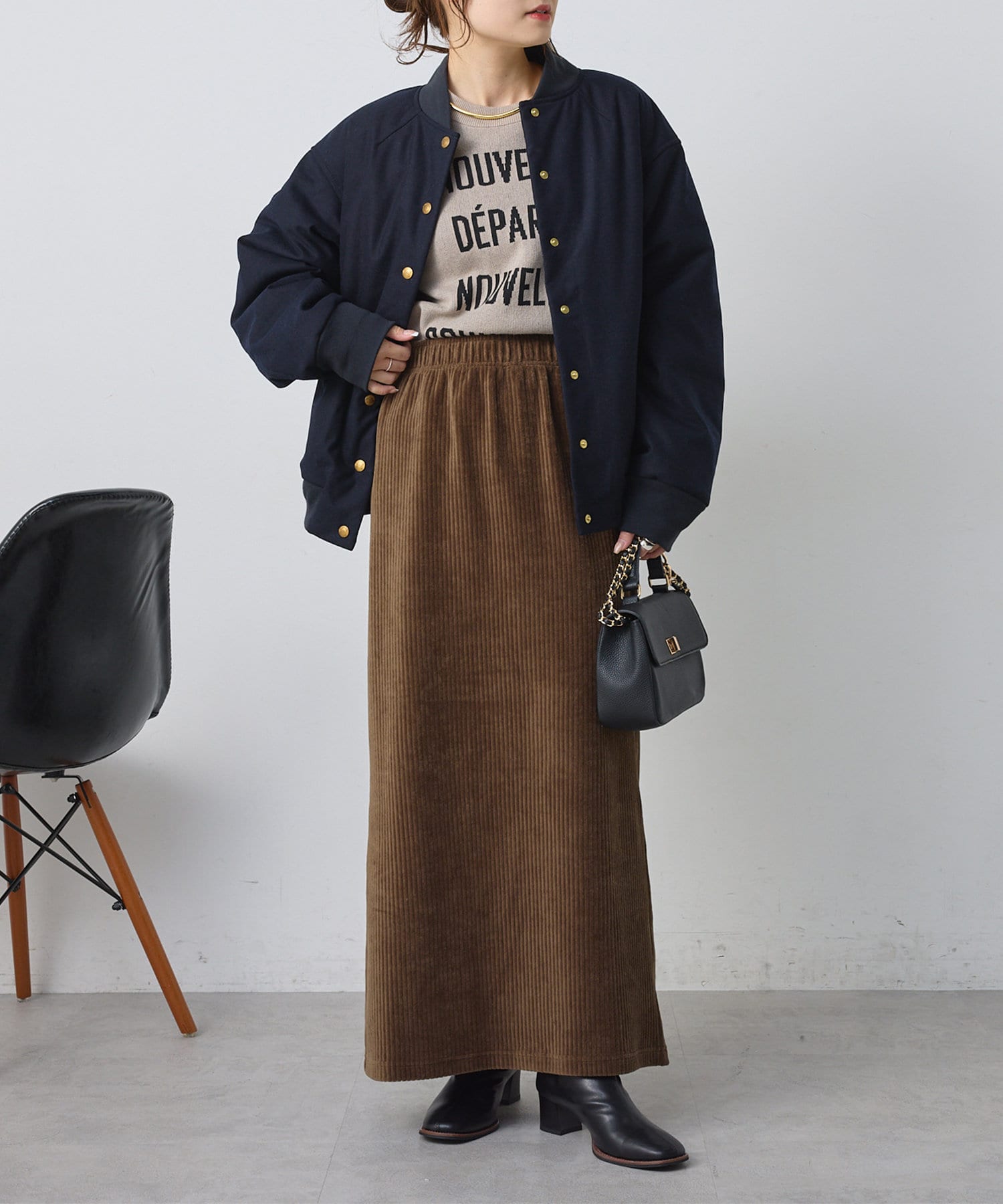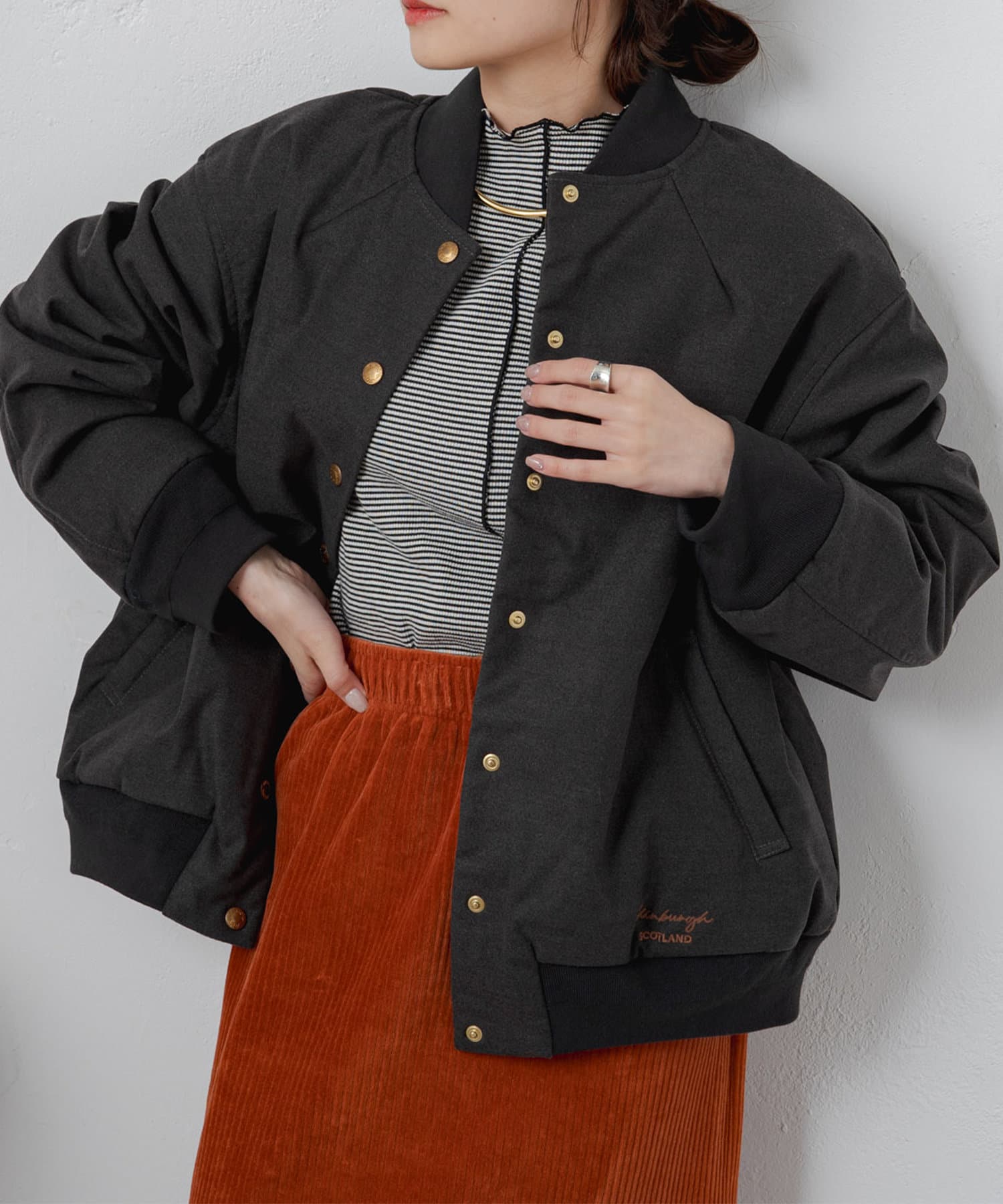 リブやゴールドのボタン使いなど、存在感のあるジャケットなので、コーディネートのメイン使いにオススメです。