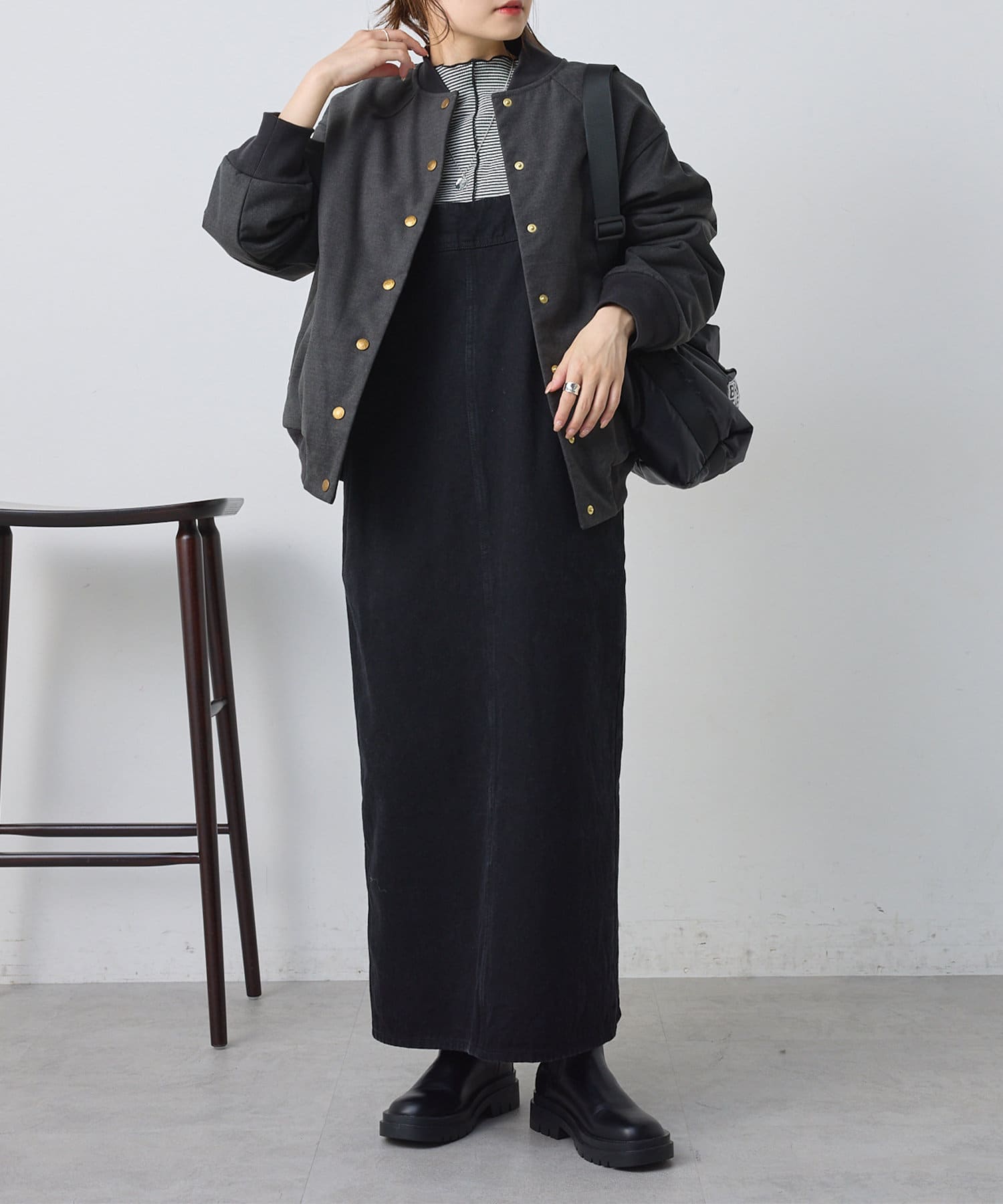 腰周りのすっきり見える着丈なので、シンプルなワンピースコーデのアクセントに最適。