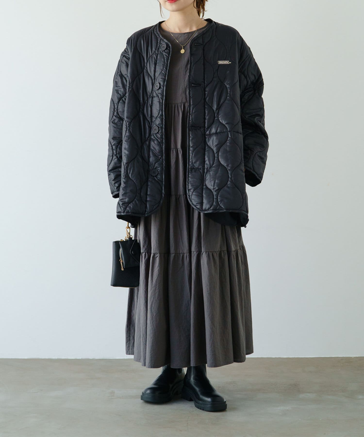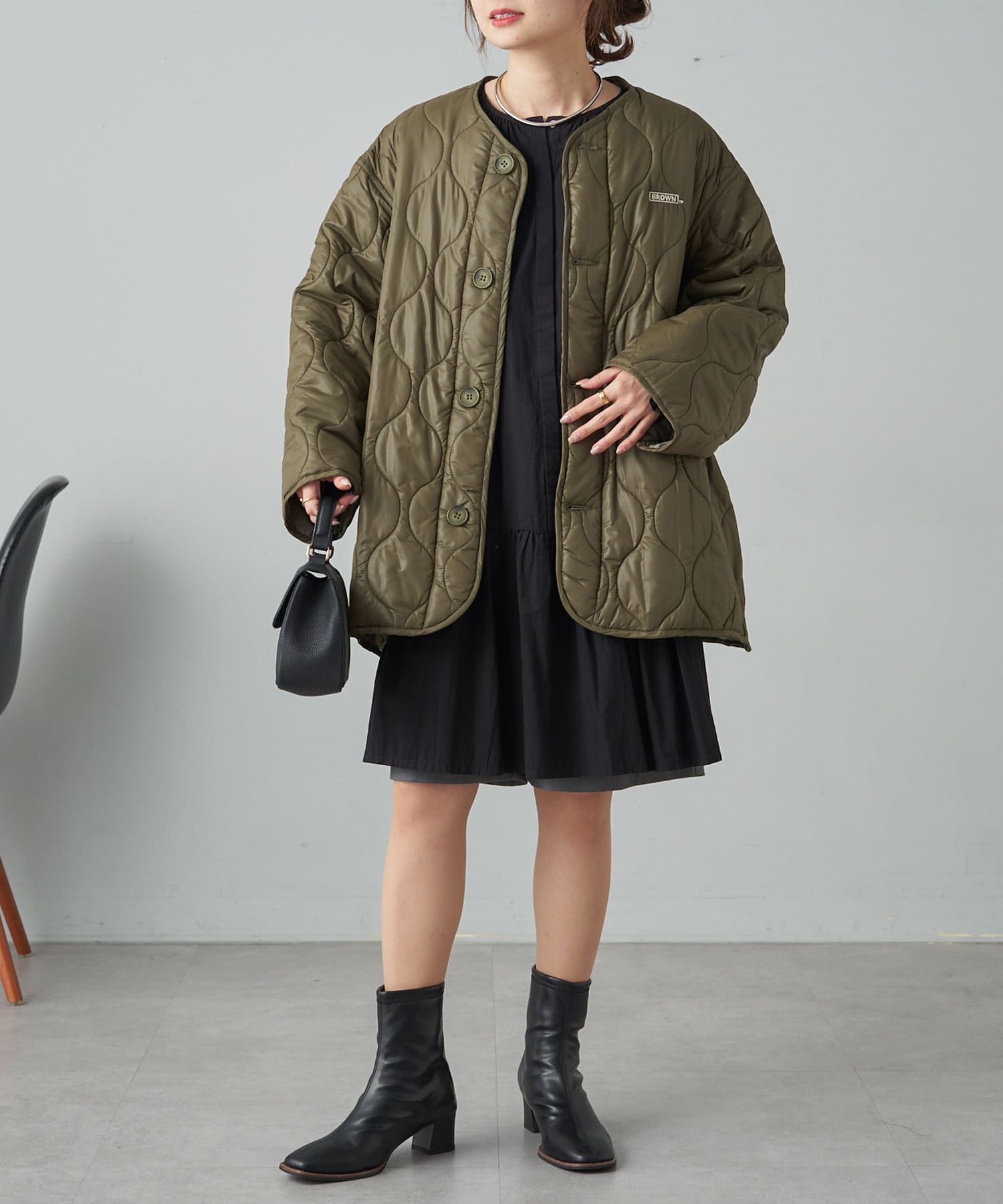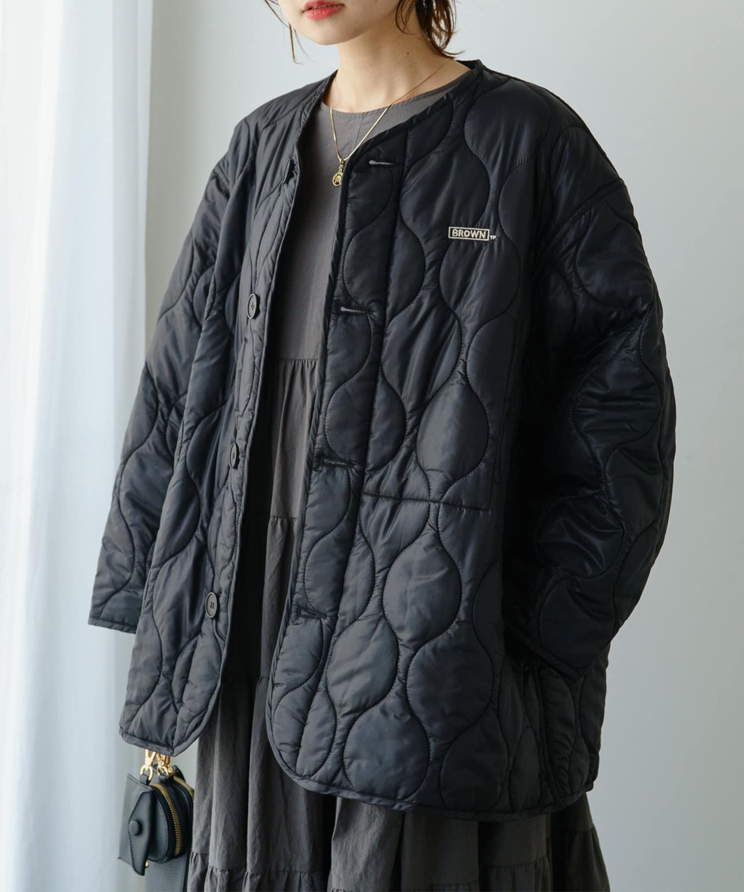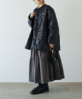 ノーカラーデザインなので、ハイネックのトップスや襟ありインナー合わせが◎