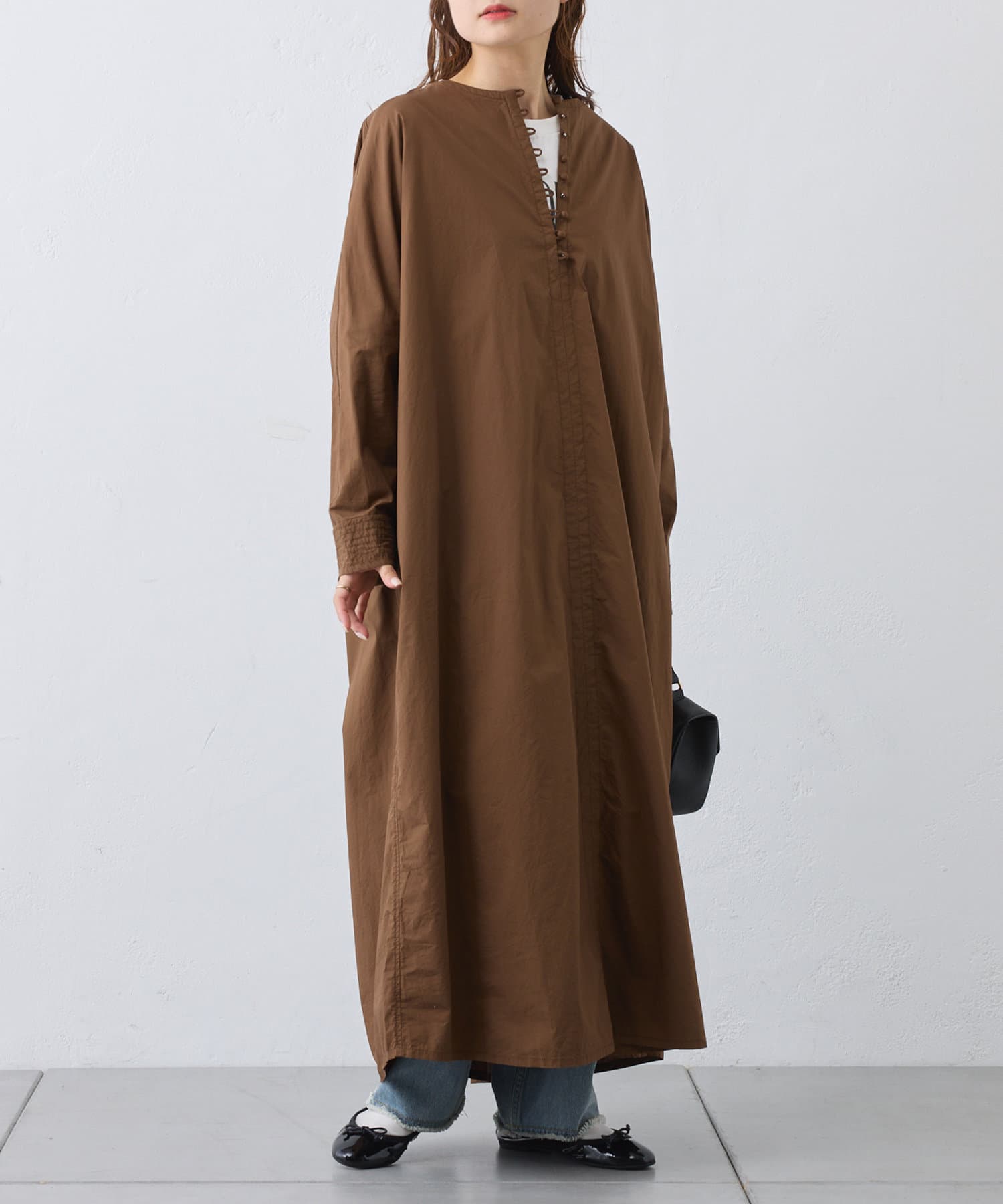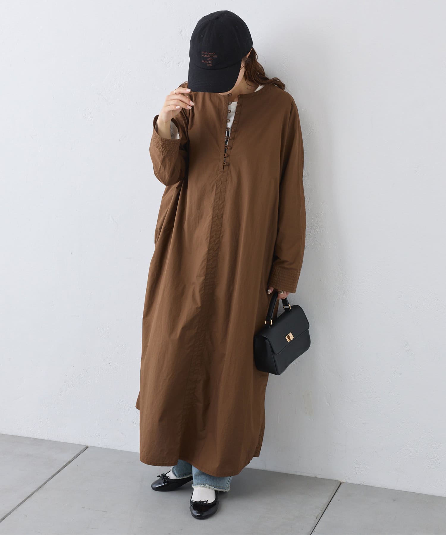 サイズ感:着丈はくるぶしが隠れるくらいのロング丈。下にカットソーとデニムを着ていましたが、ゆったりとしたサイズ感なので余裕がありました。