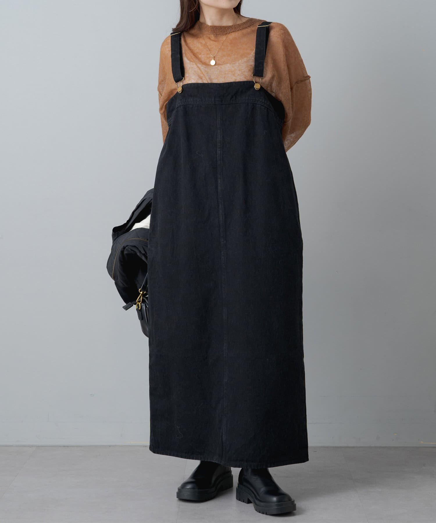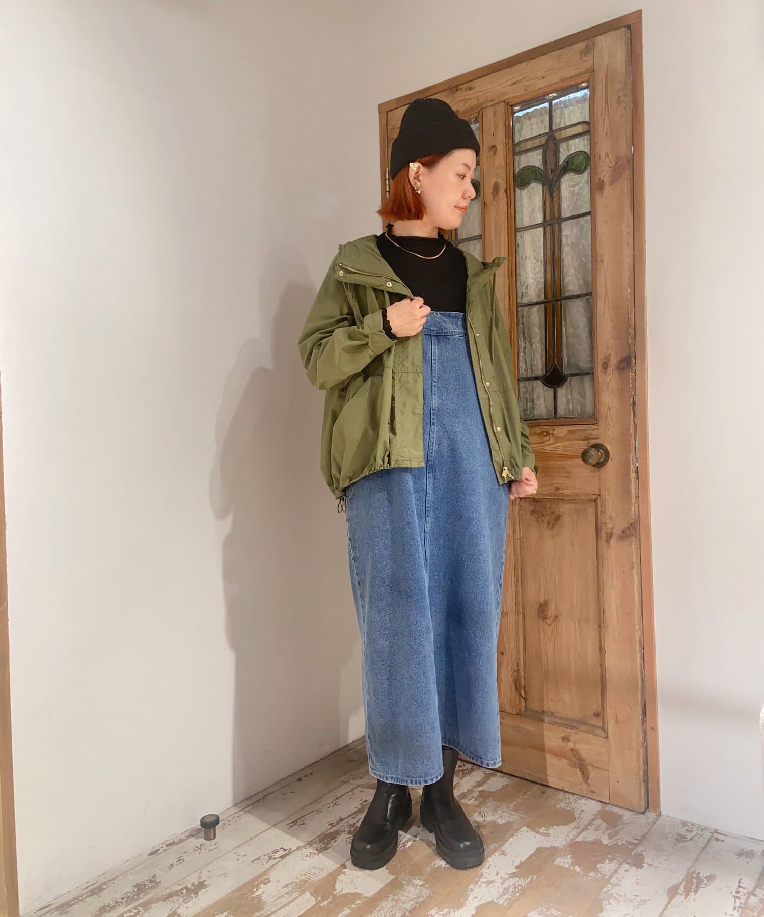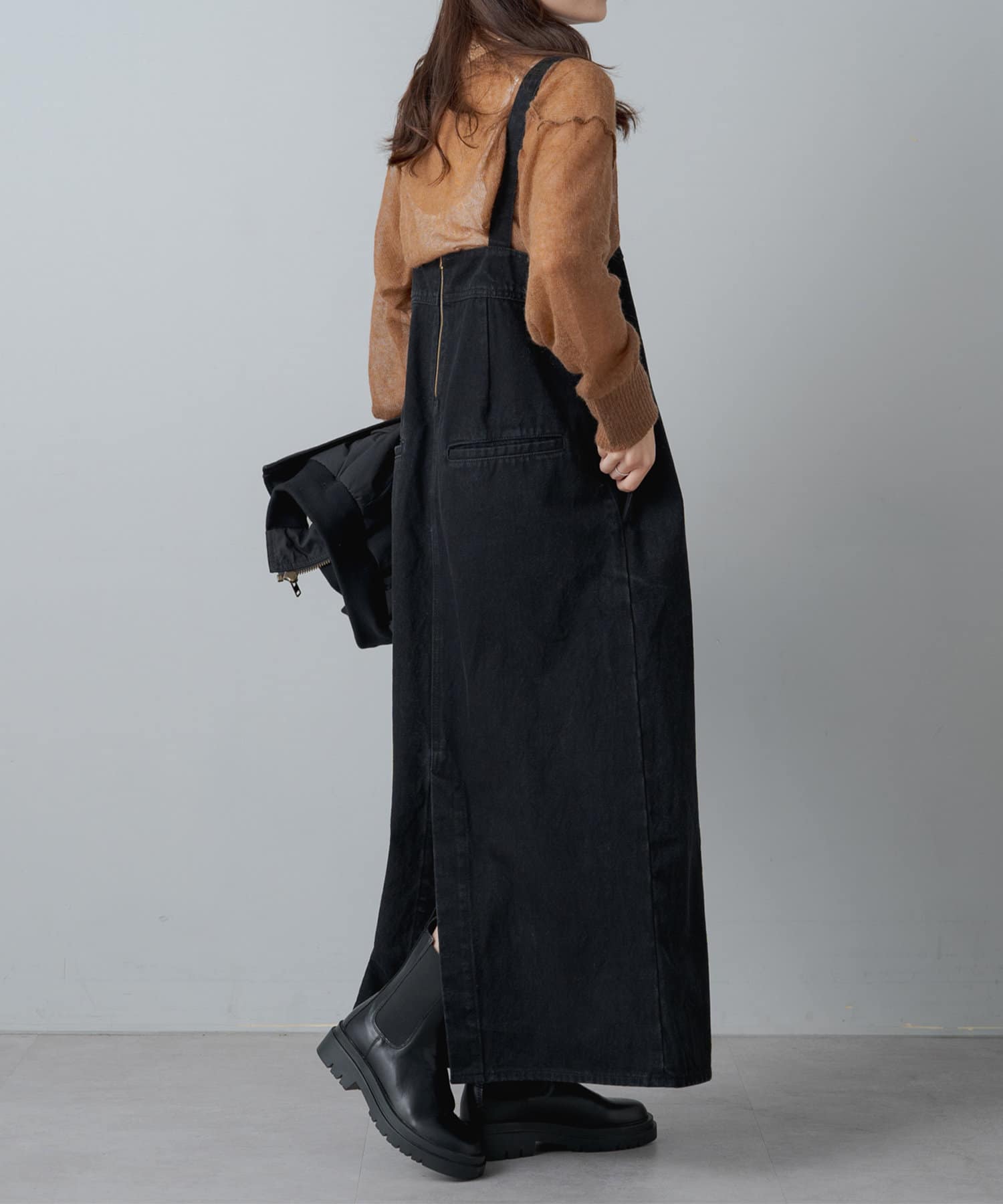 身幅が大きめの作りになっているので、中に厚手のものを着やすいです。逆に上からニットを着てスカートみたいに見せることも出来るので万能です◎
