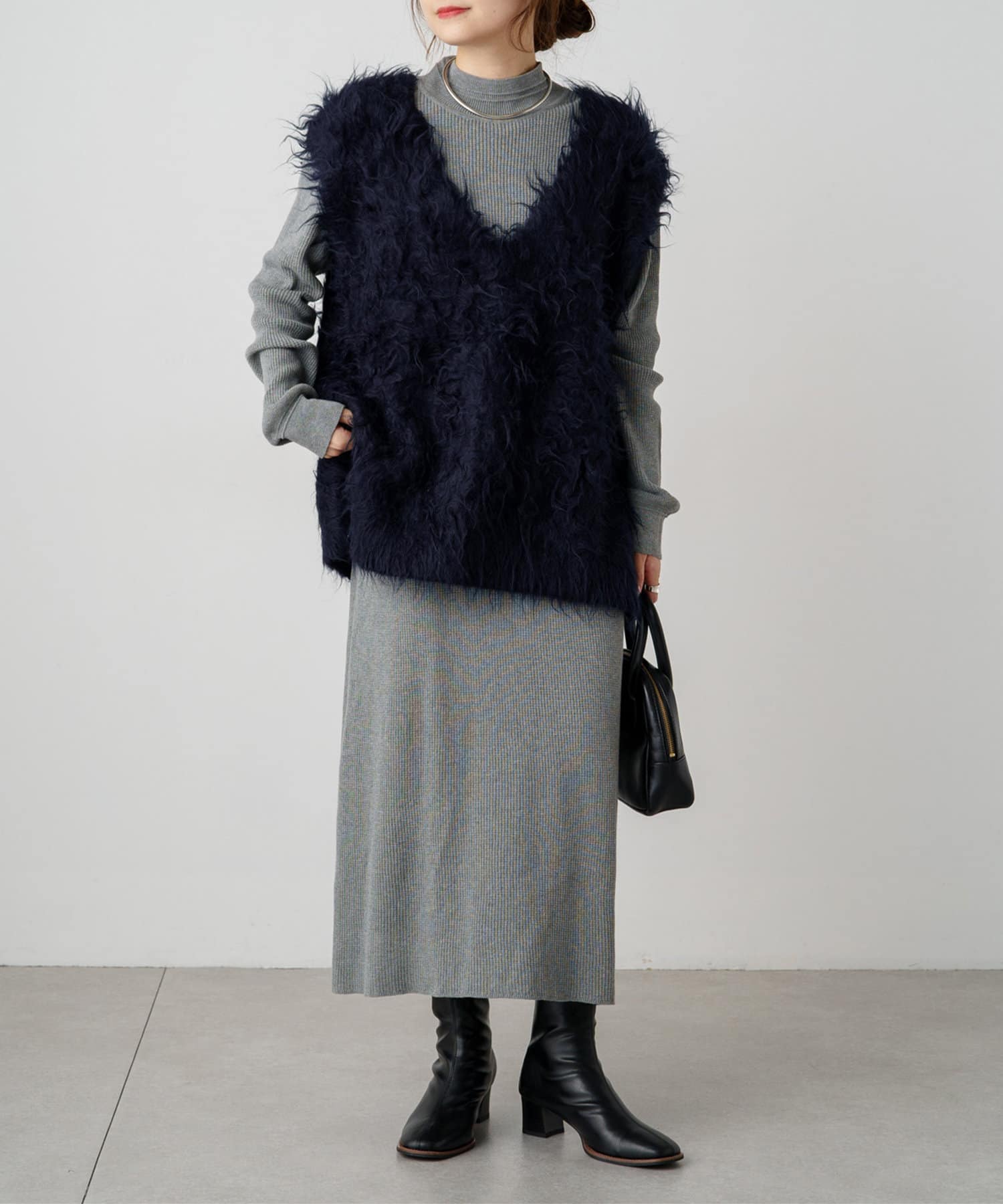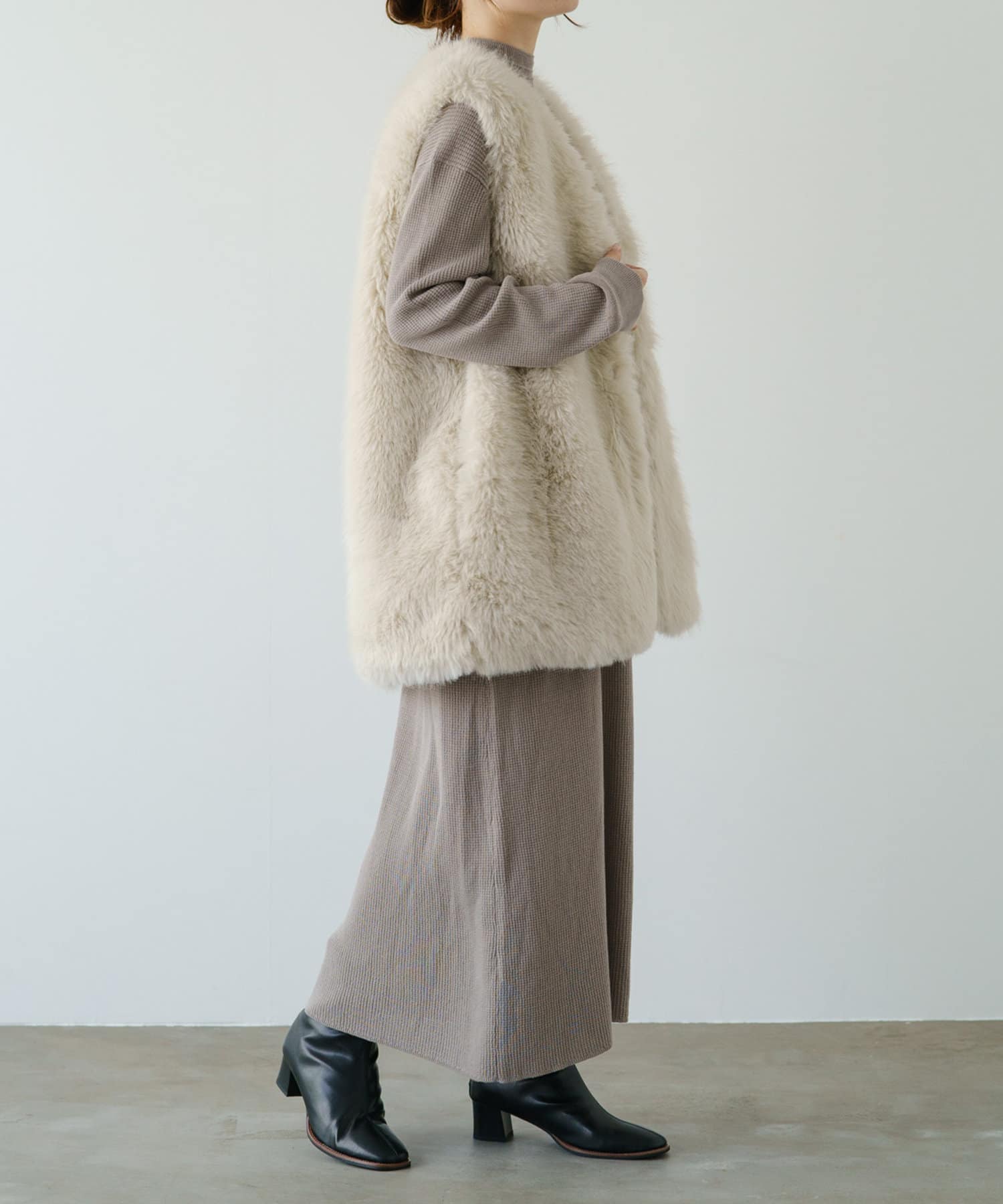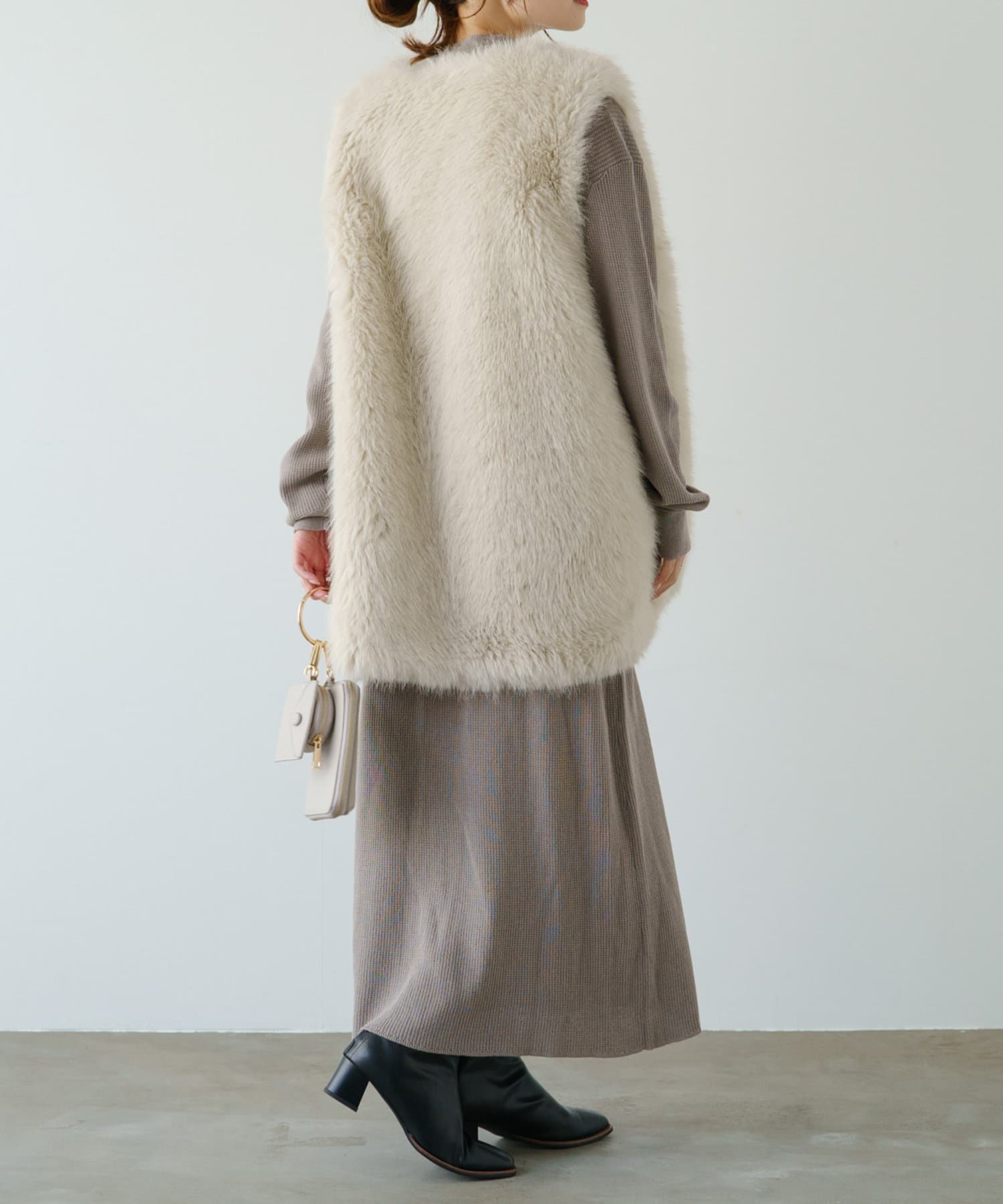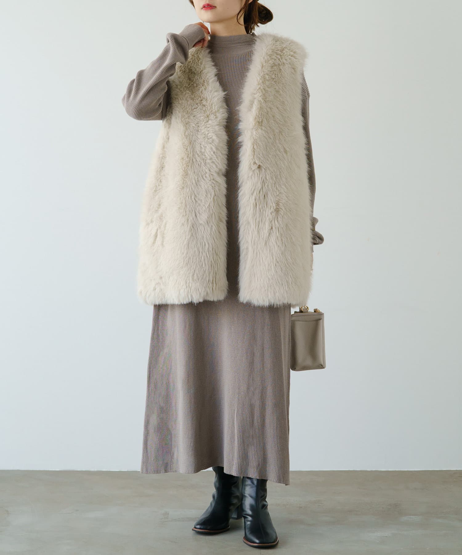 1枚での着こなしはもちろん、トレンドのファーベストを合わせたスタイリングもおすすめ。