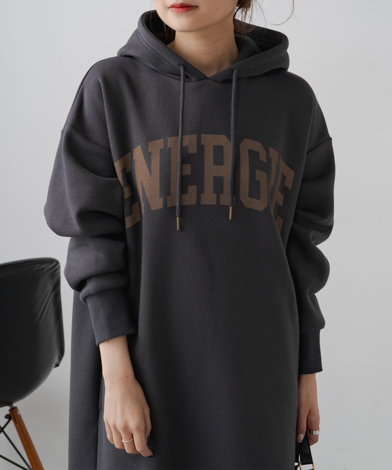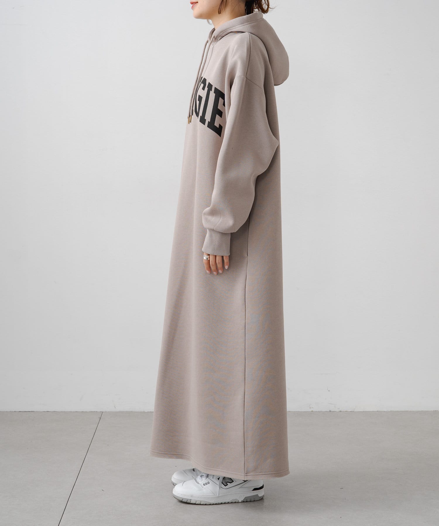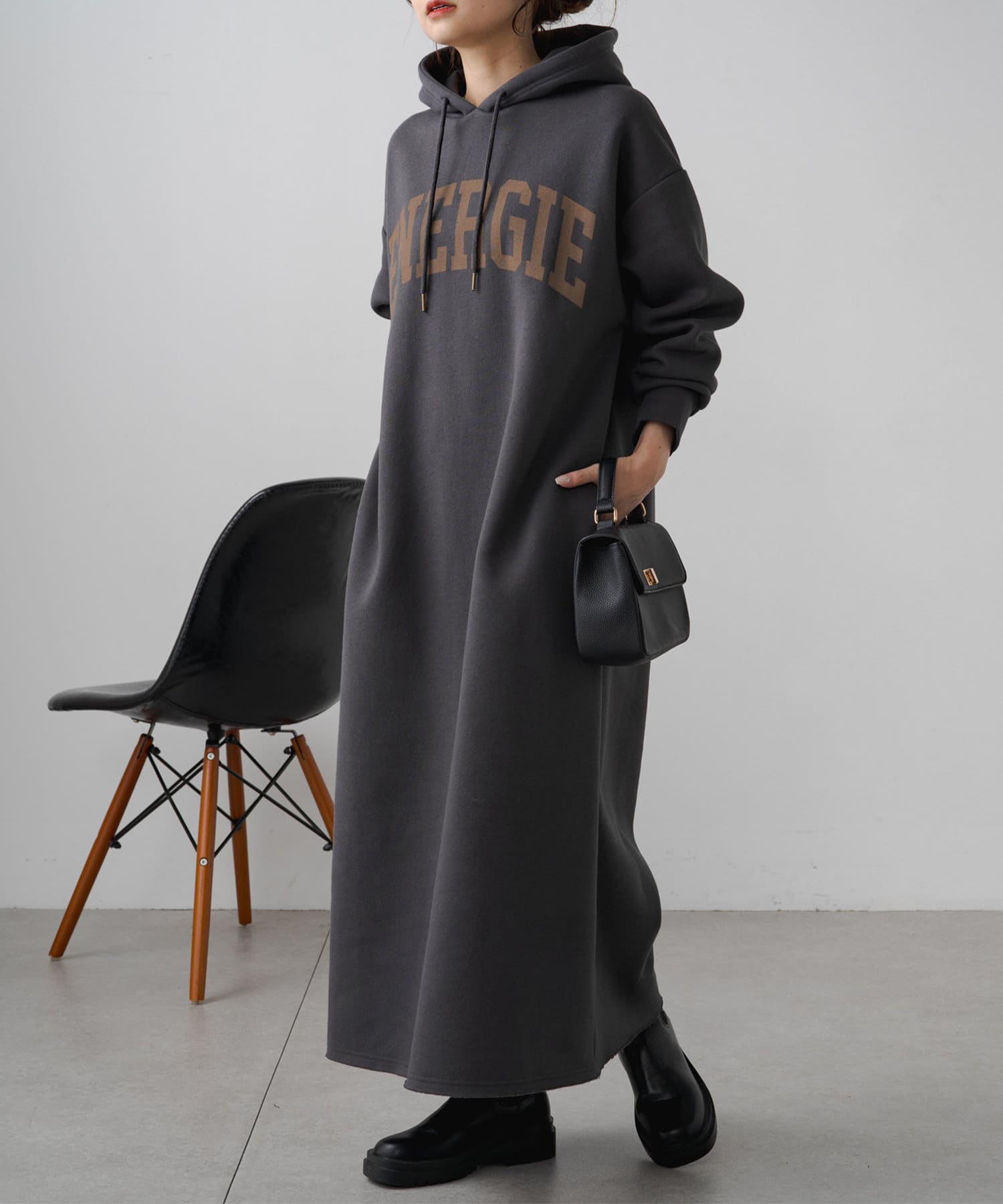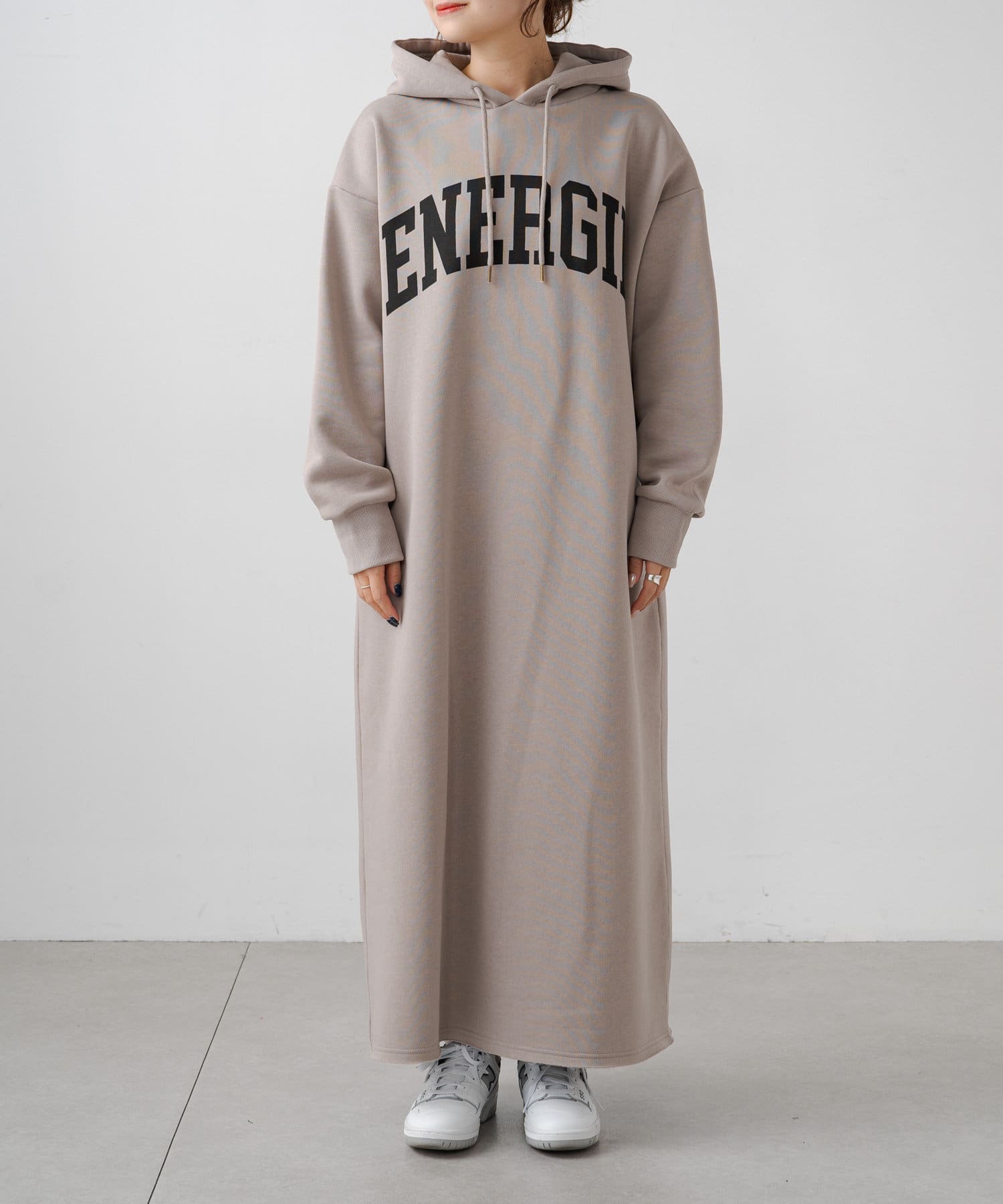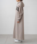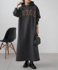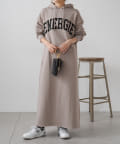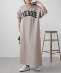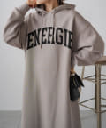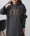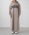 フード付きのシンプルなスウェットワンピースに、オリジナルのカレッジロゴでアレンジをプラス。