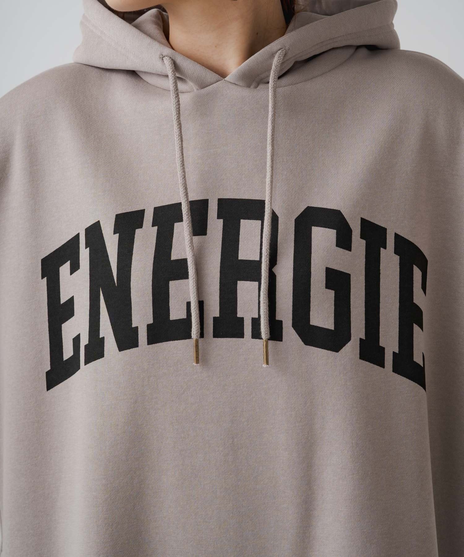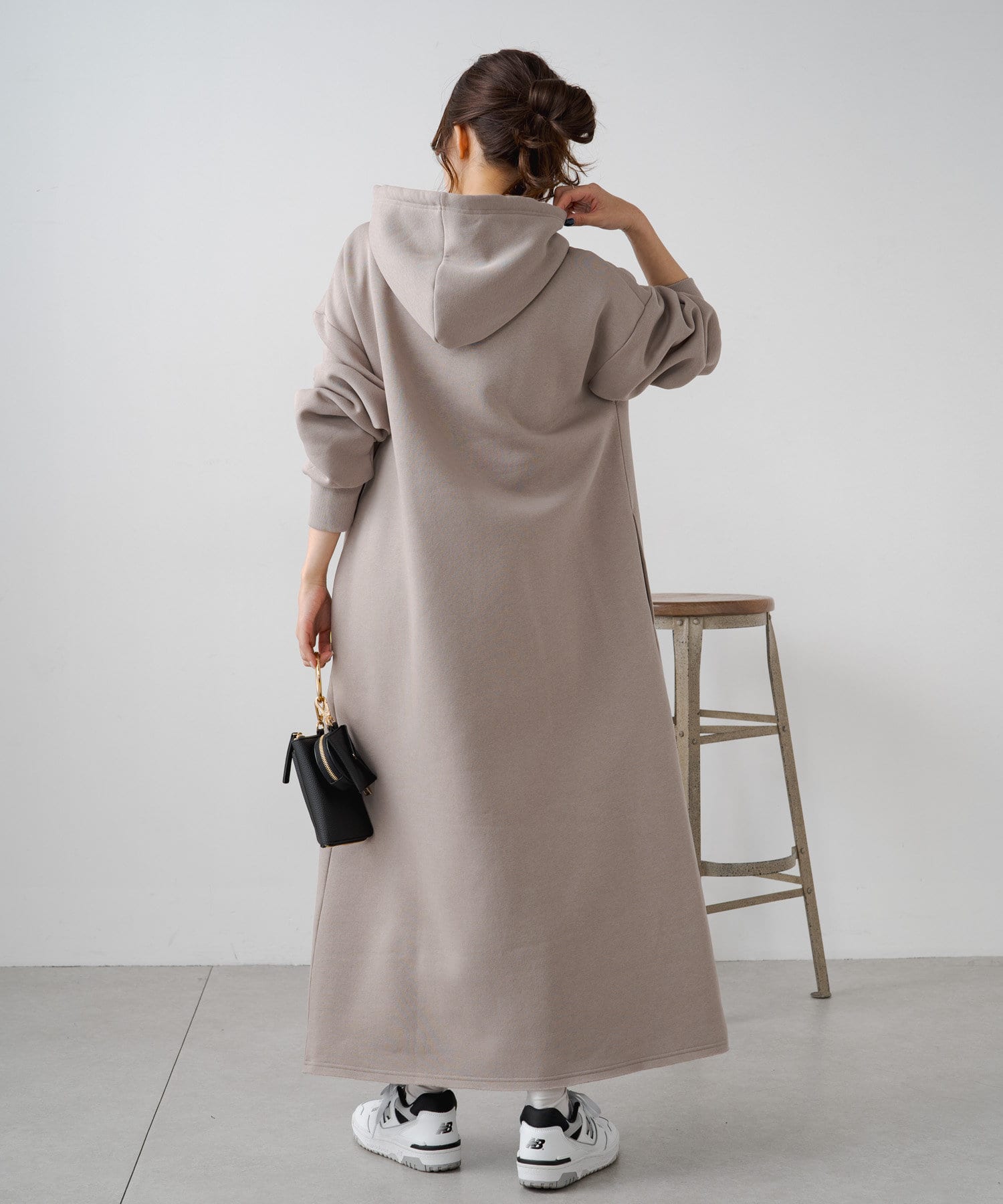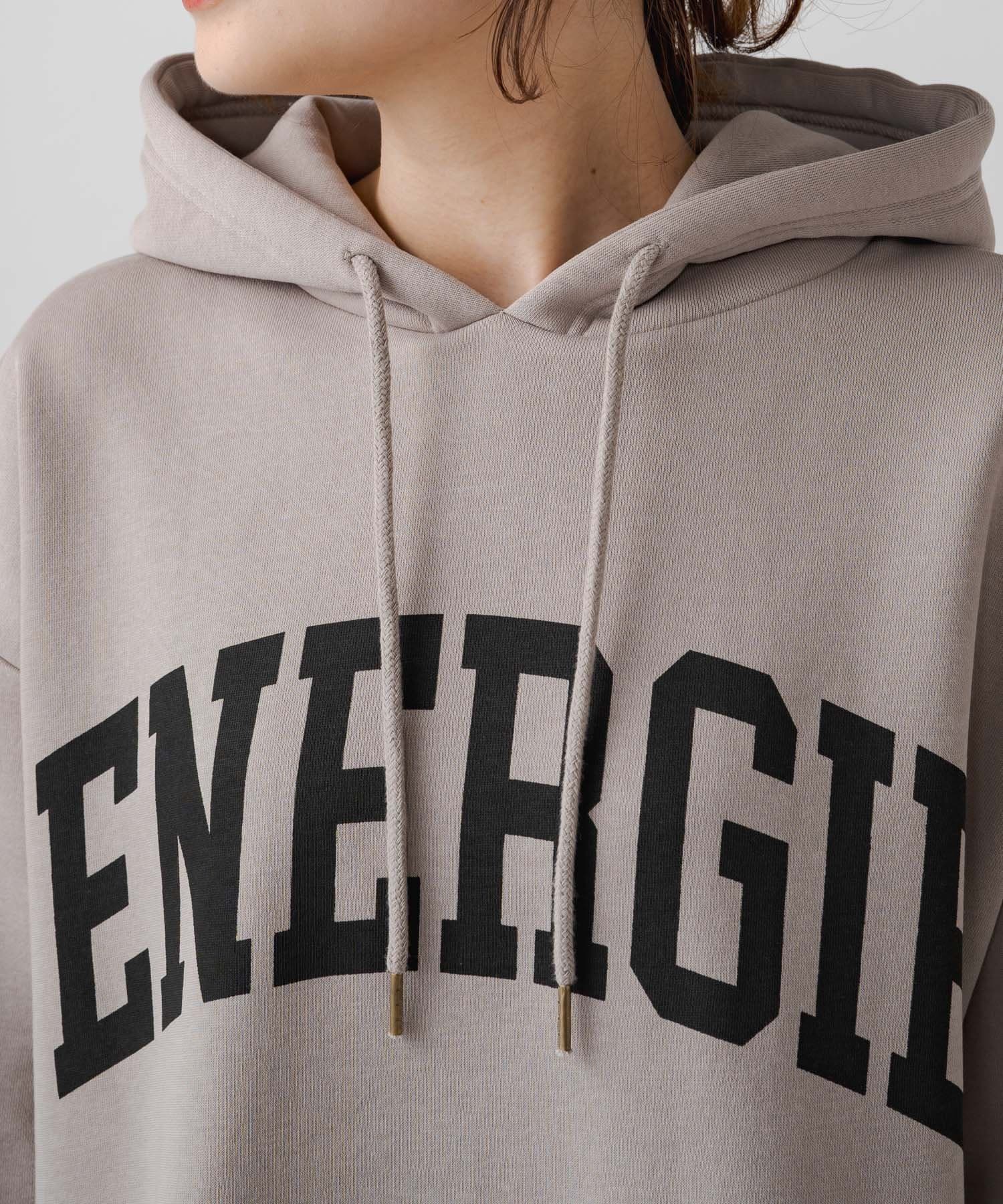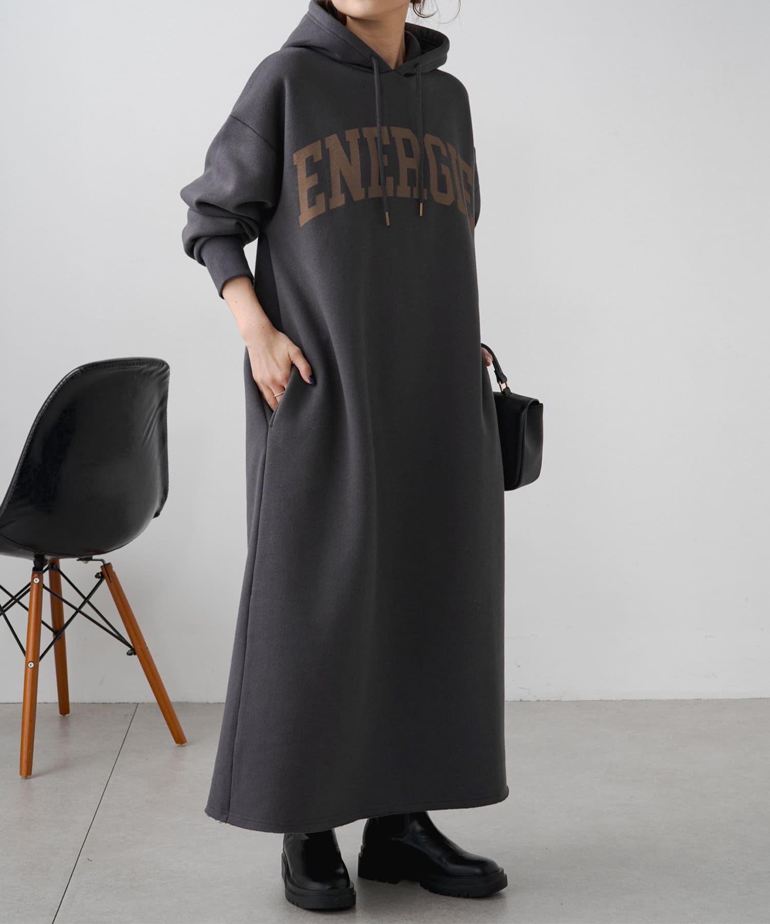 フード付きのシンプルなスウェットワンピースに、オリジナルのカレッジロゴでアレンジをプラス。