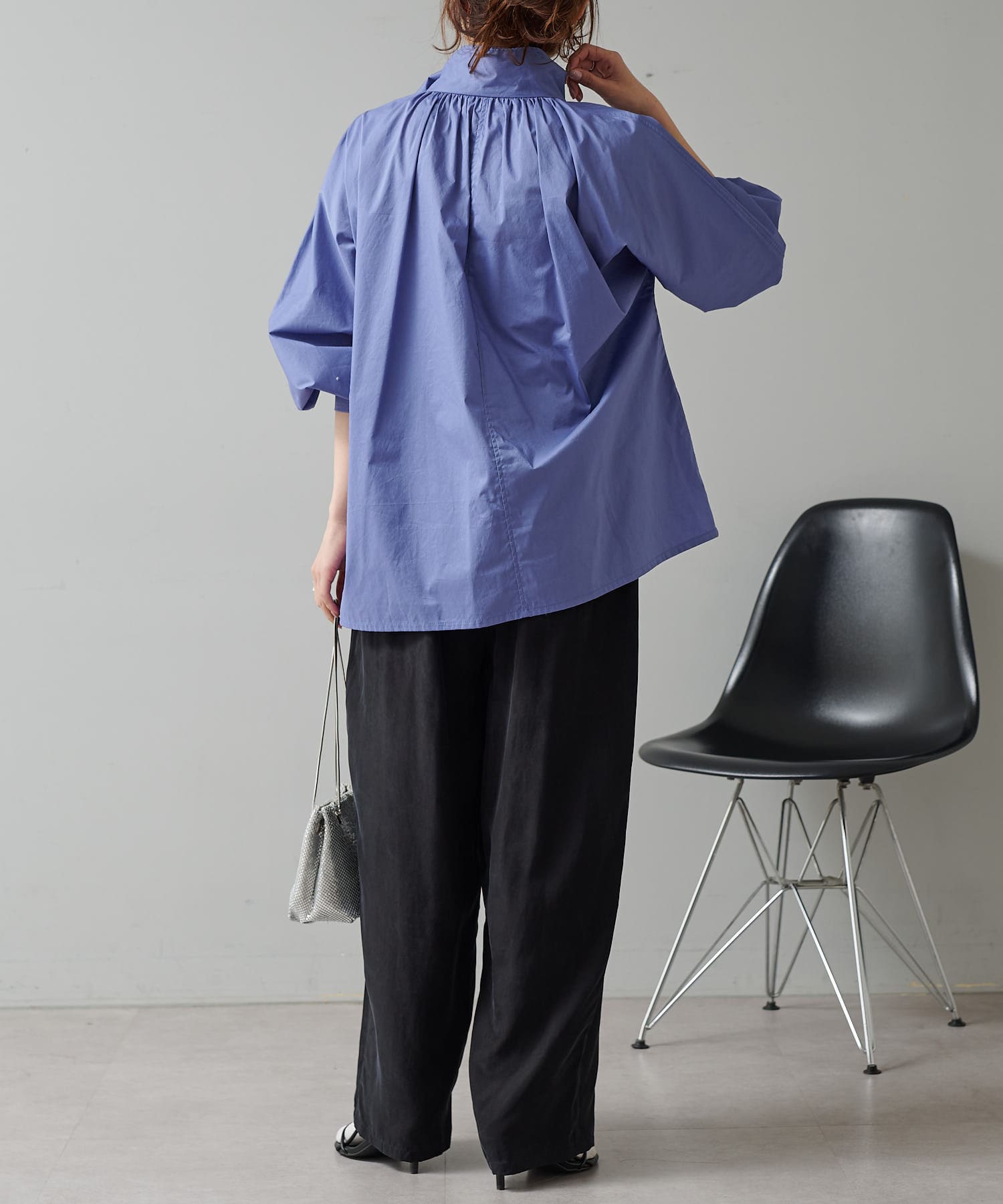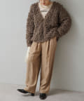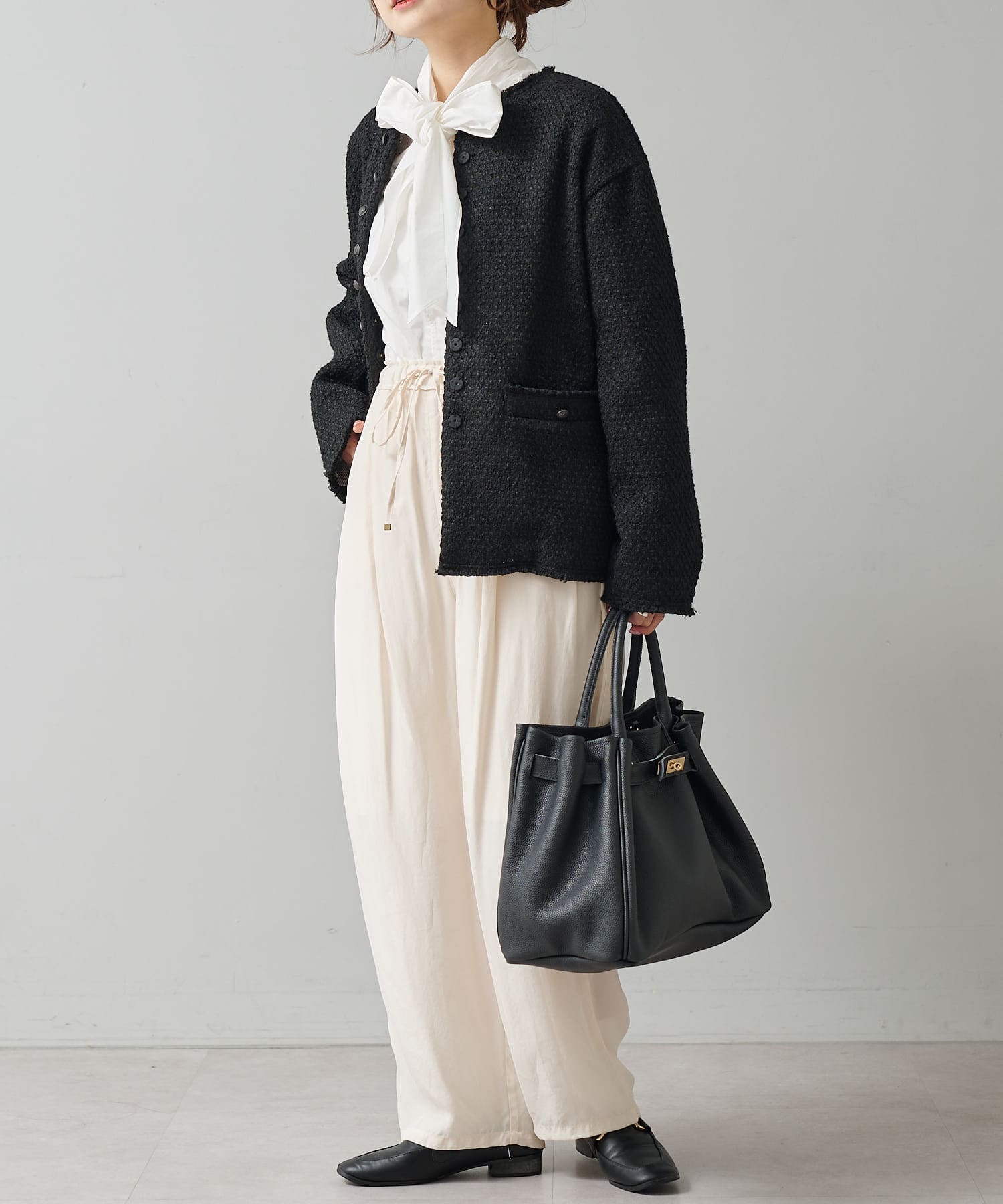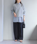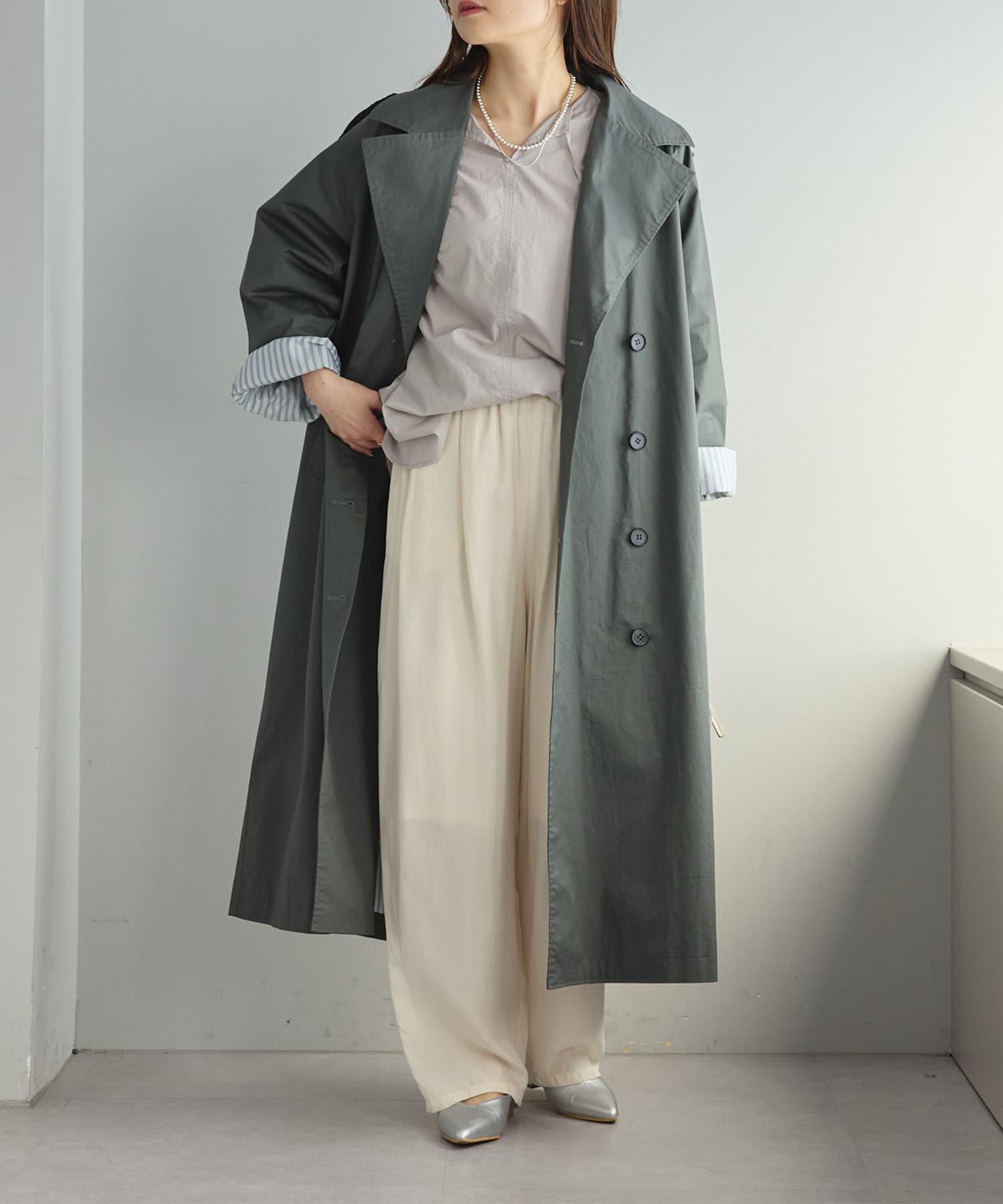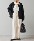 やや丸みのあるコクーンシルエットですが、落ち感のある素材なので丸みは感じずに、スタイリッシュな雰囲気を演出。