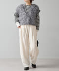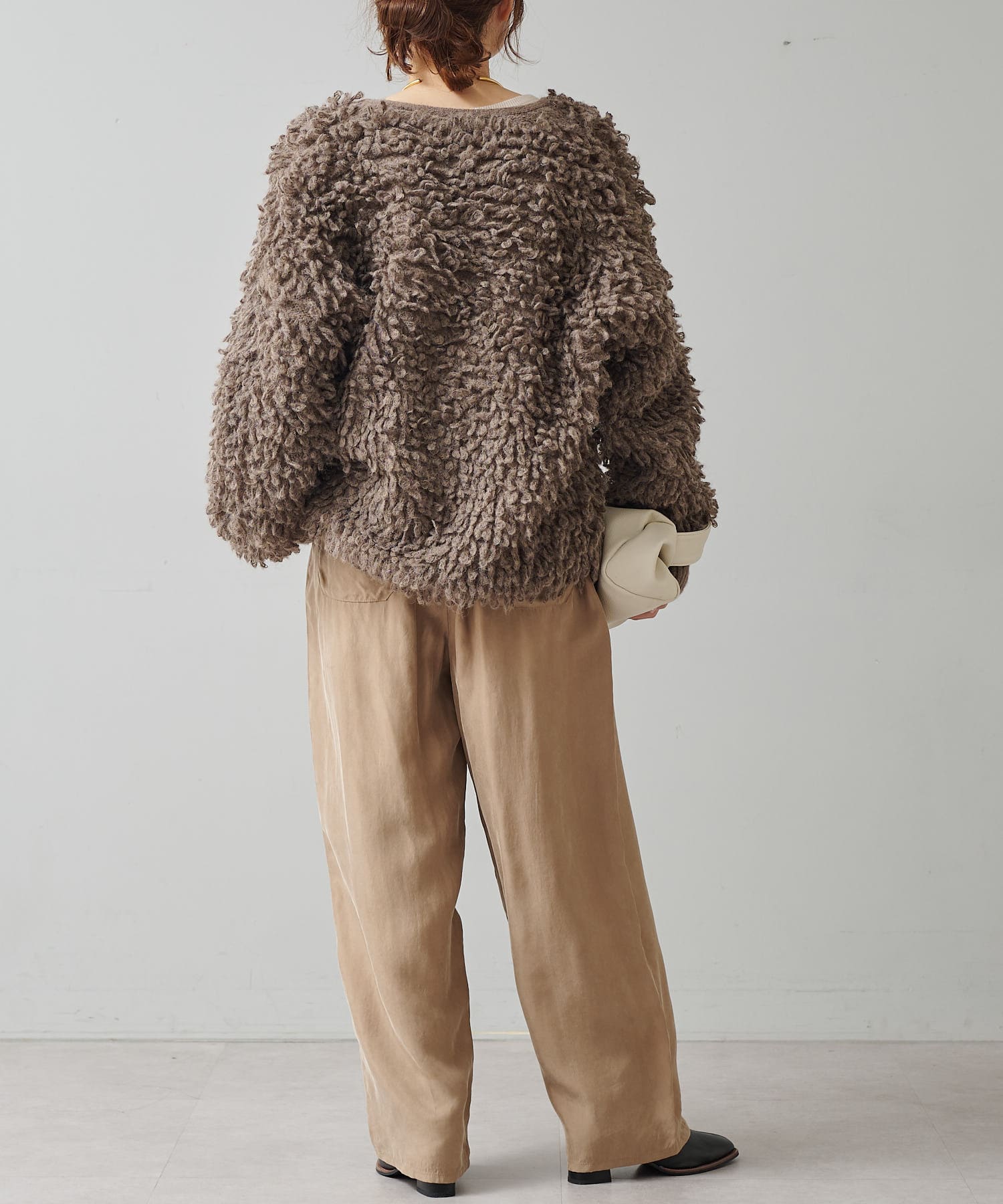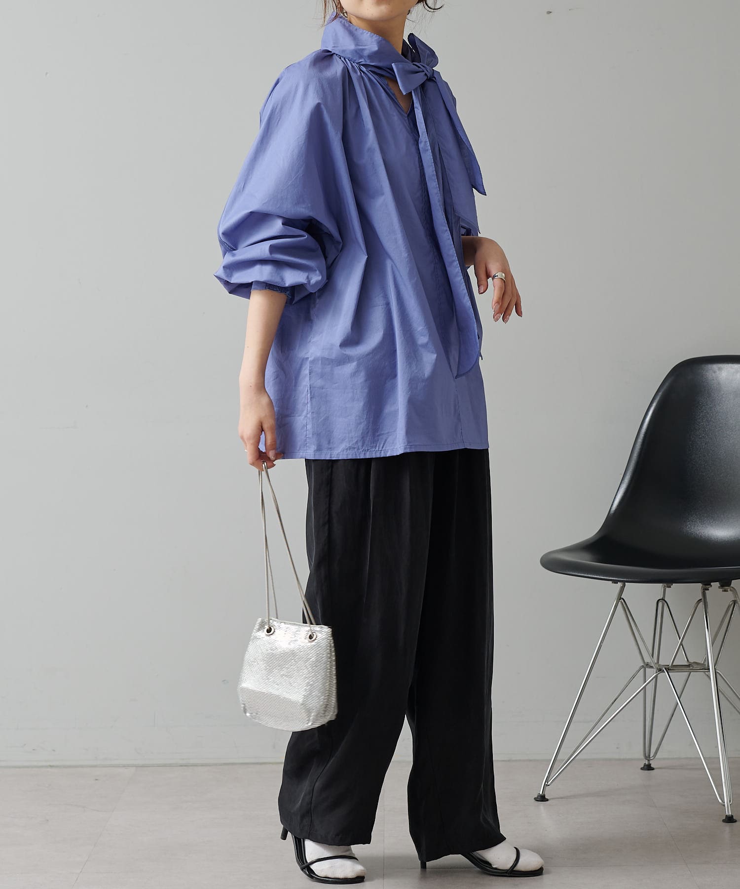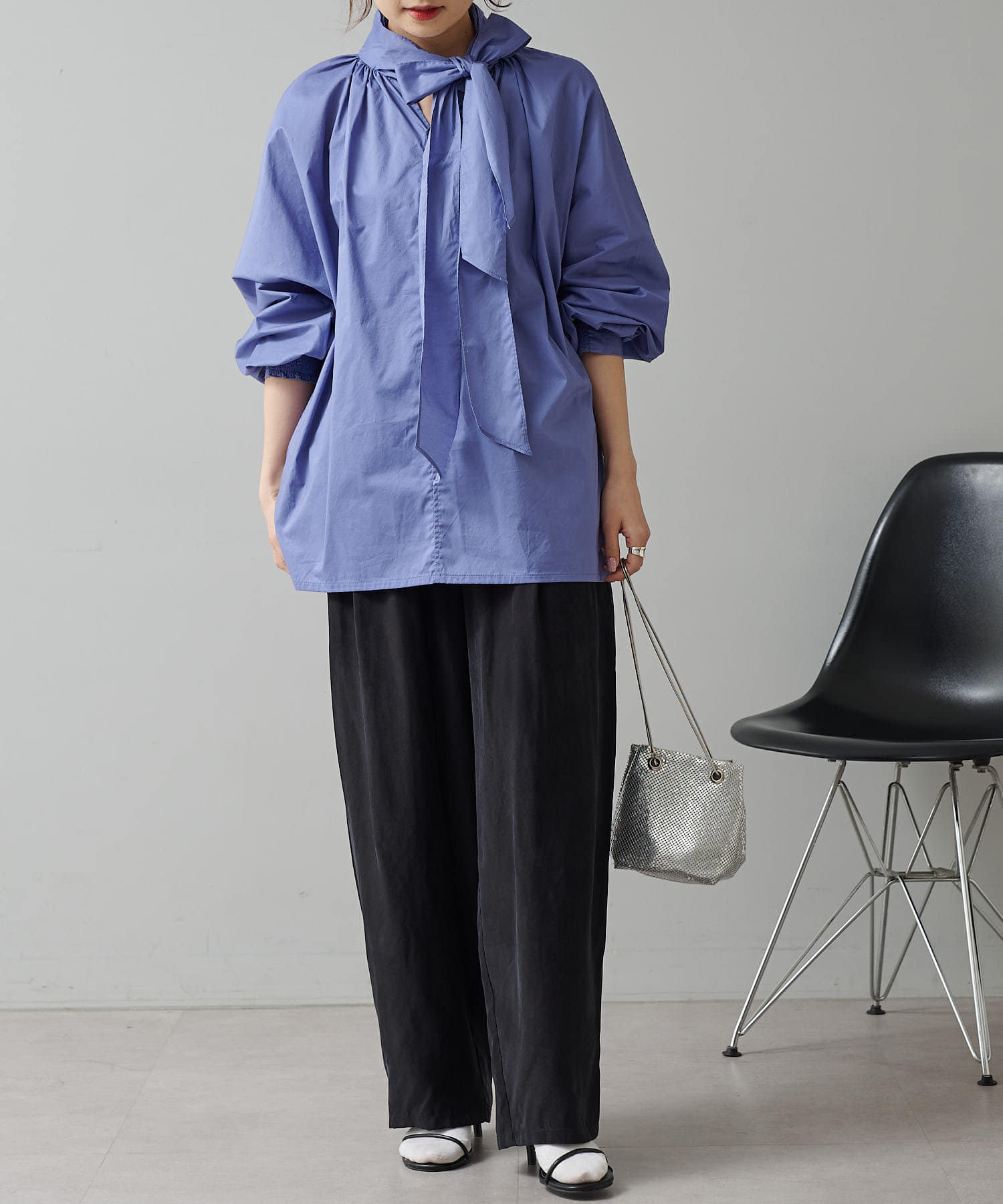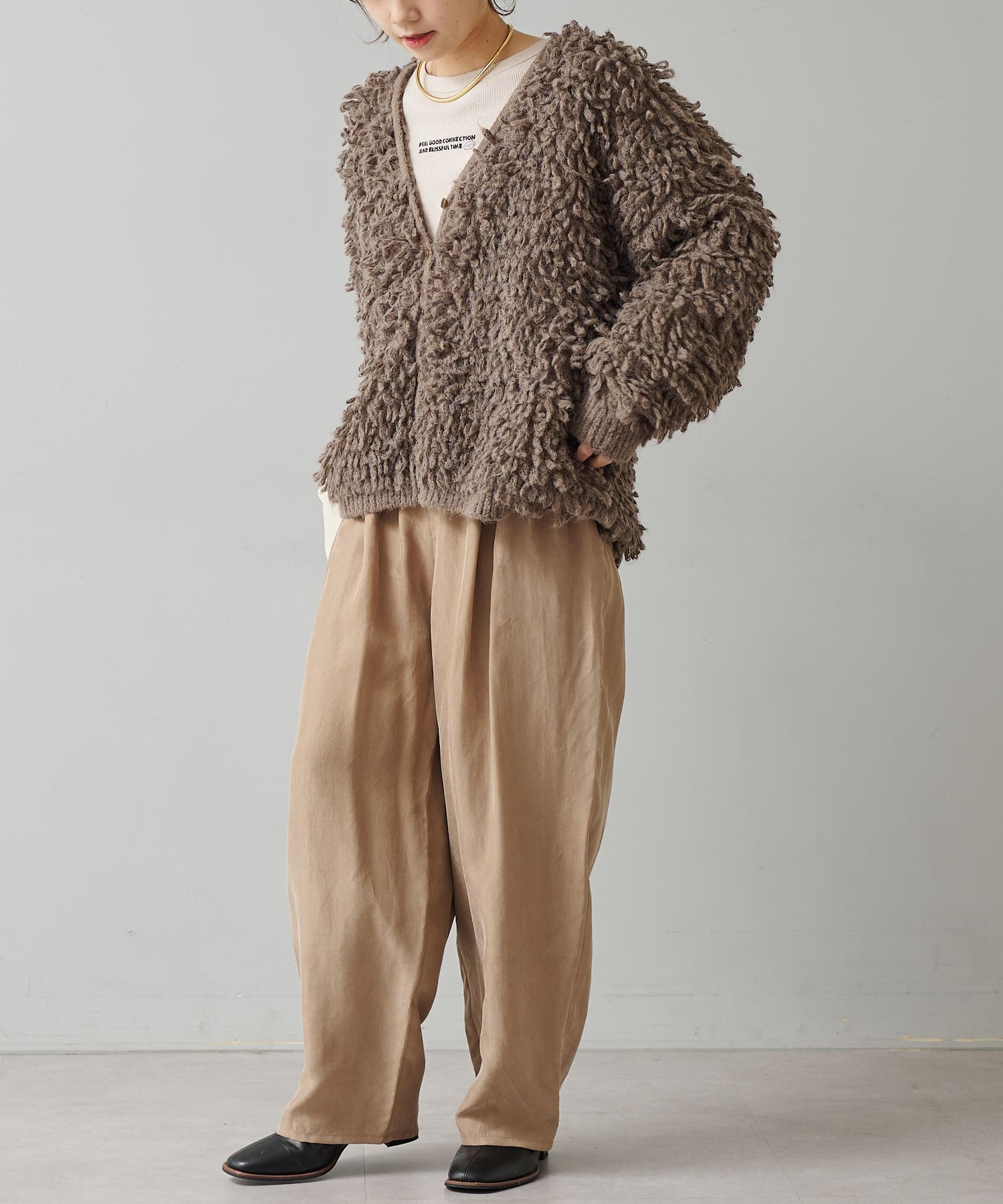 やや丸みのあるコクーンシルエットですが、落ち感のある素材なので丸みは感じずに、スタイリッシュな雰囲気を演出。
