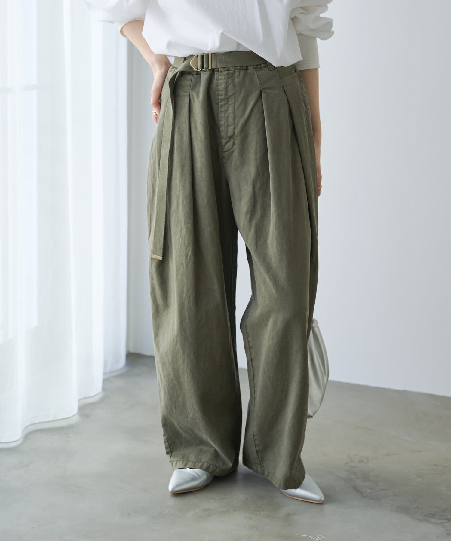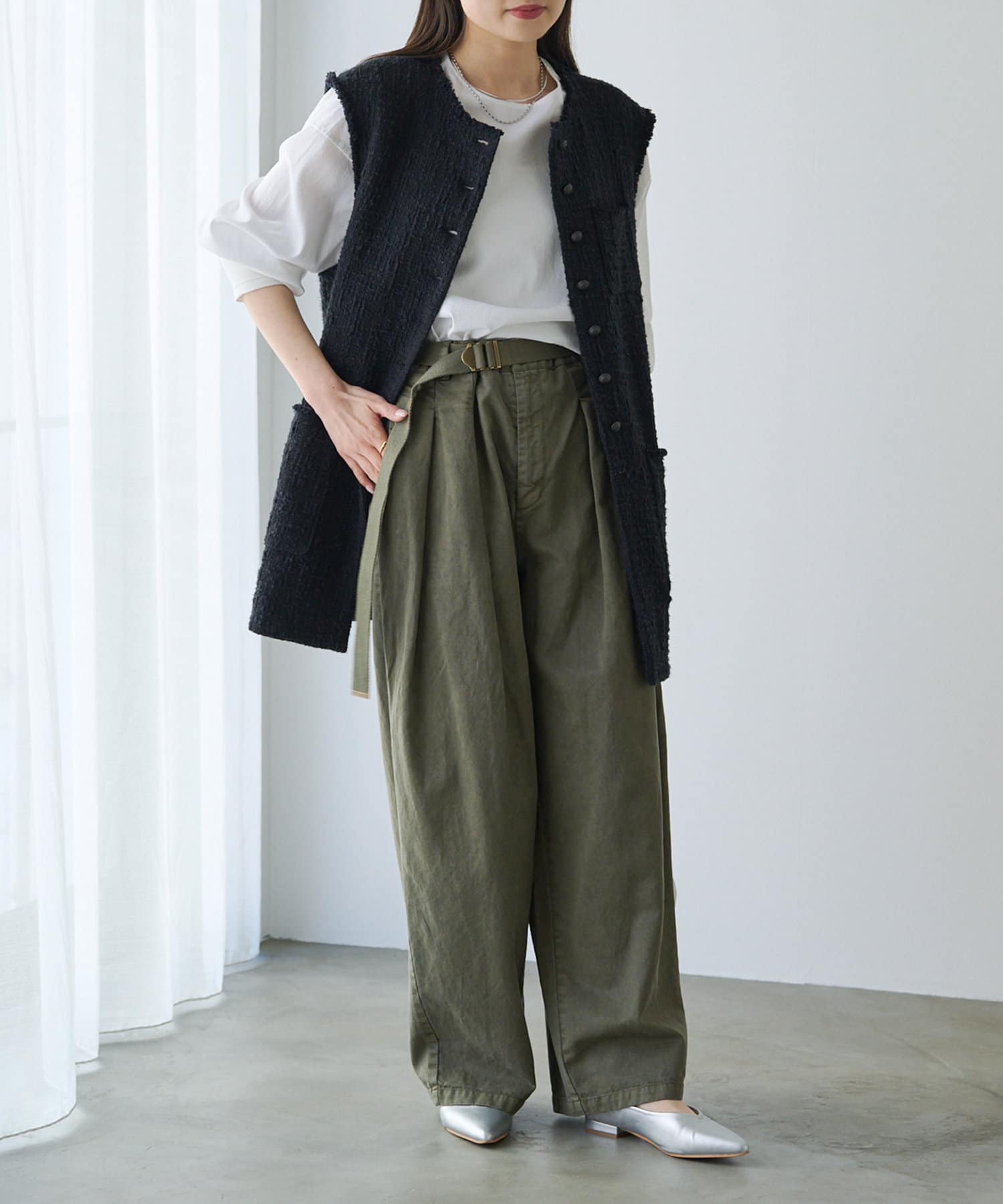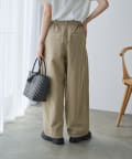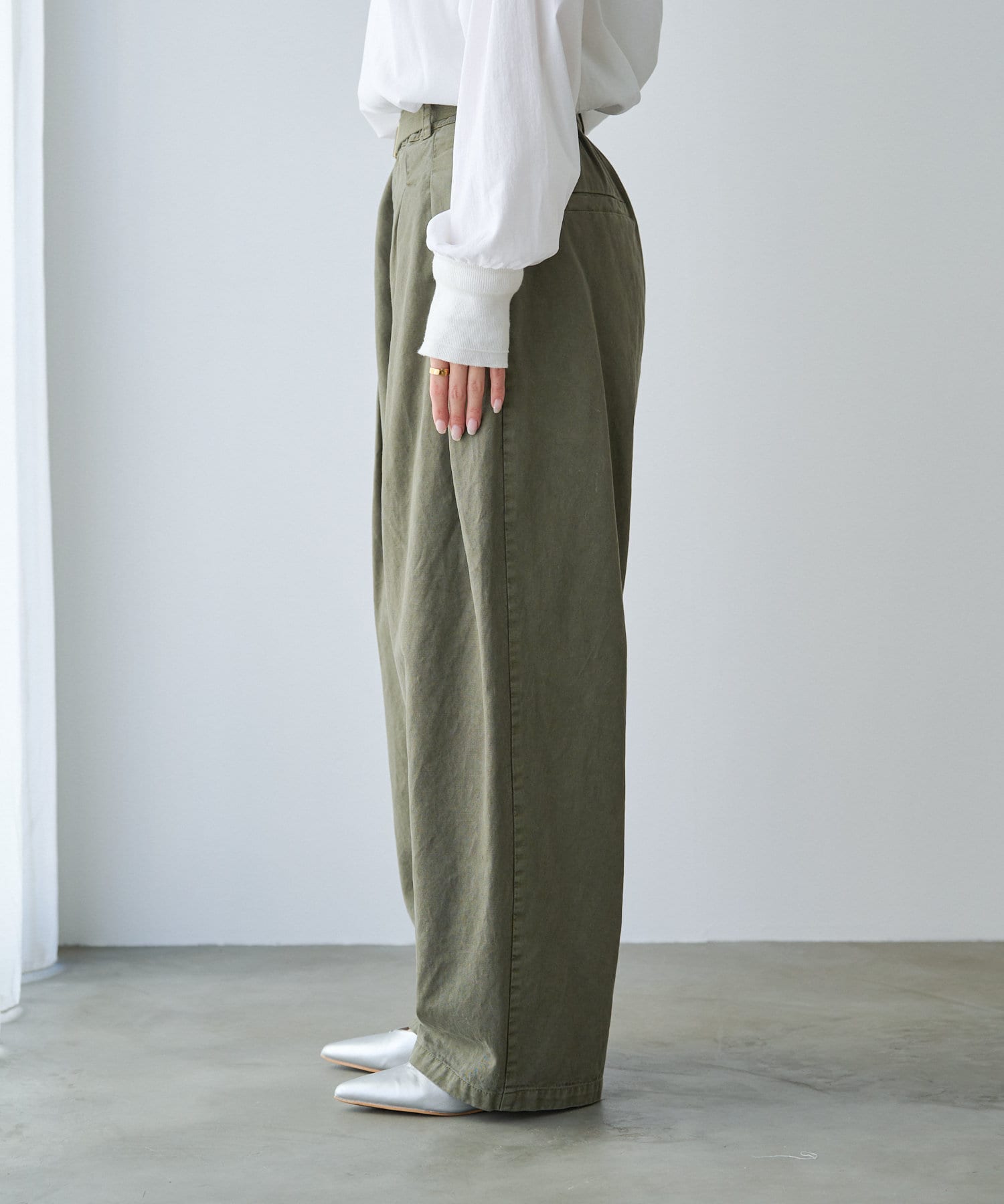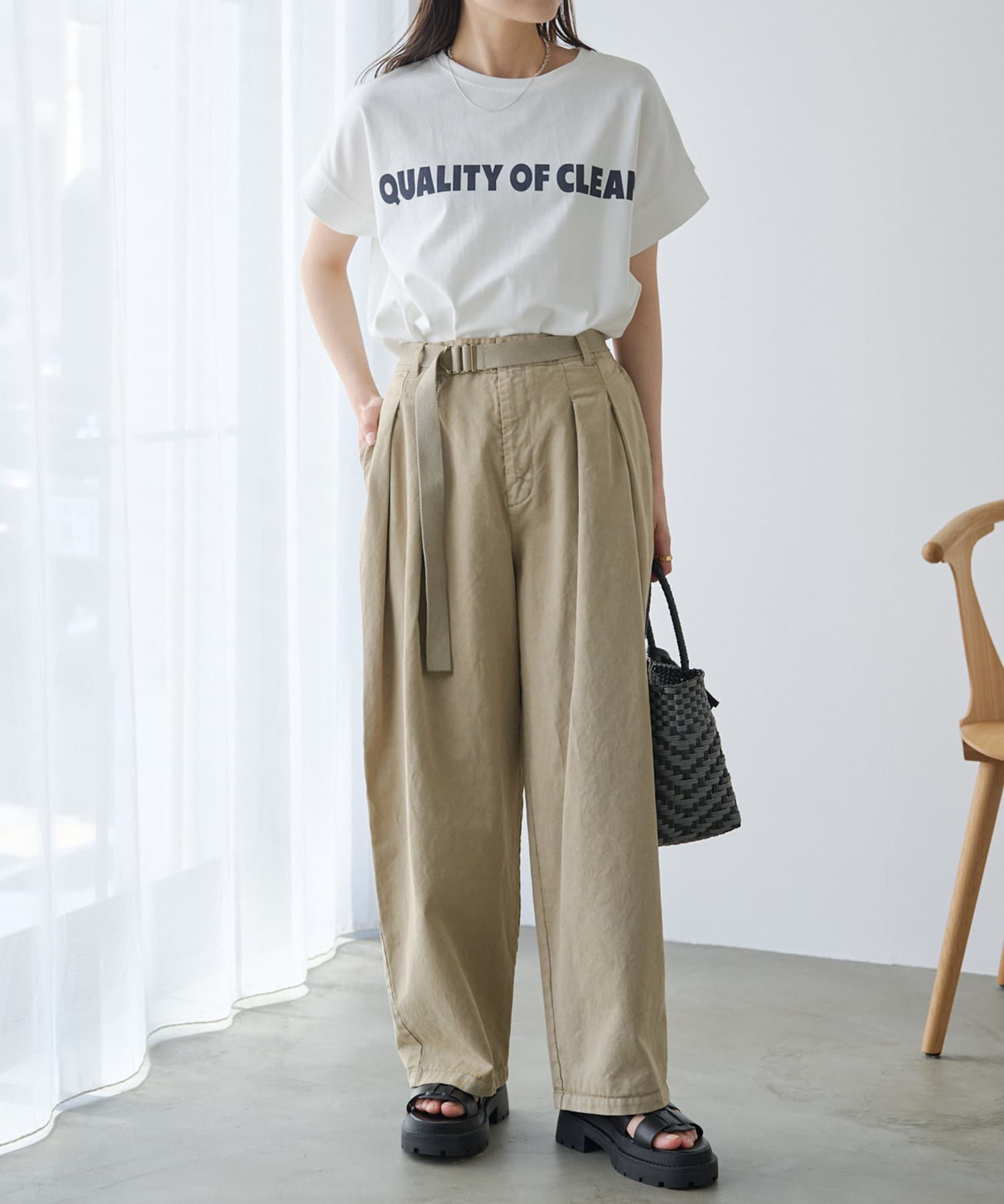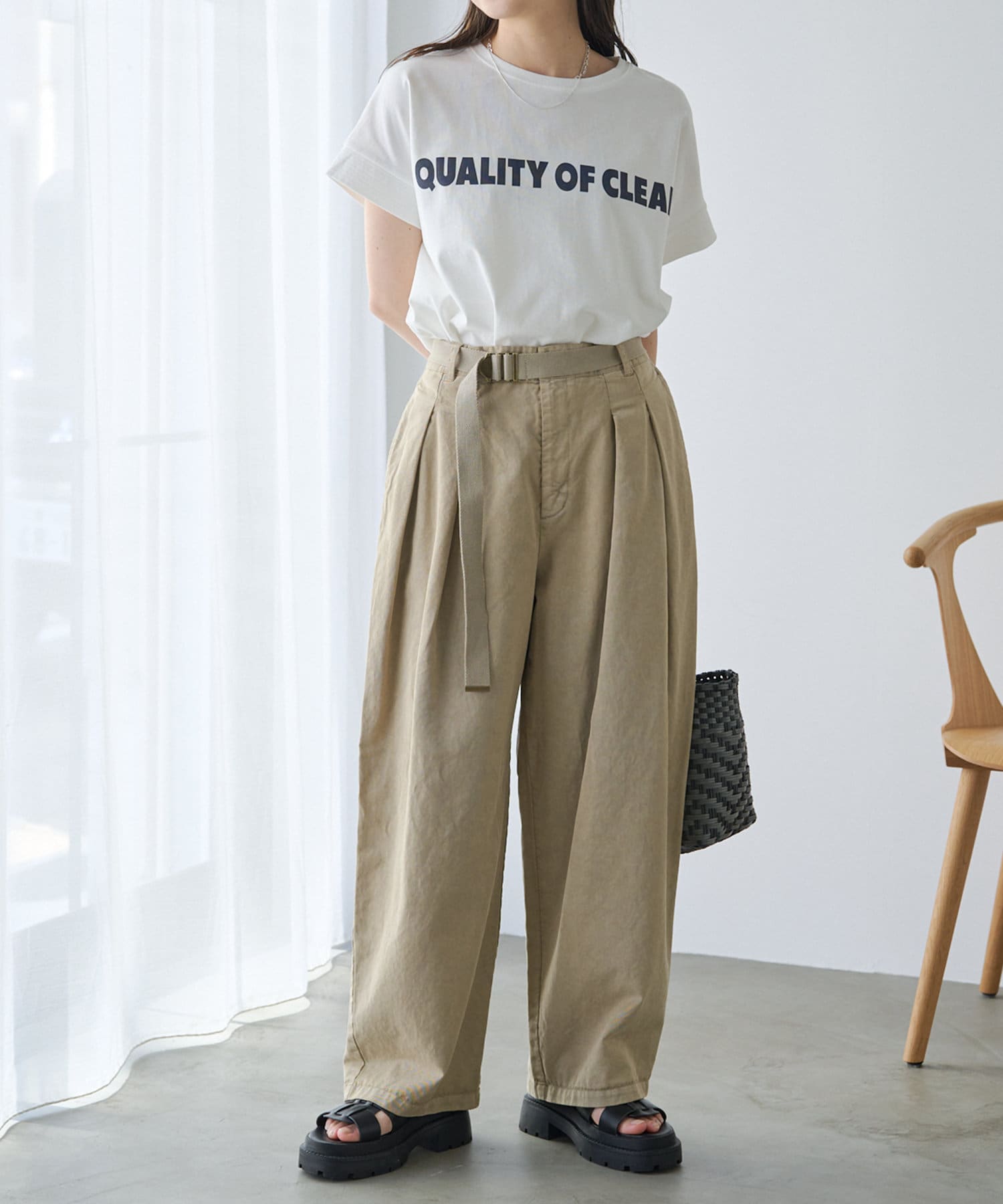 ダブルタックを入れたルーズなシルエットで、こなれ感のあるカジュアルなスタイリングに導きます。