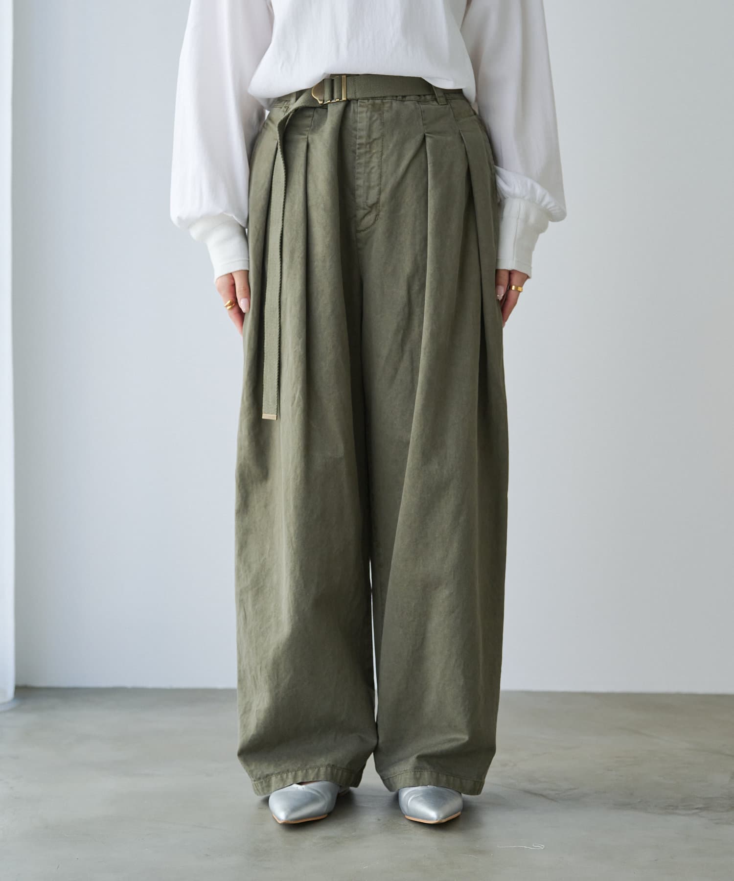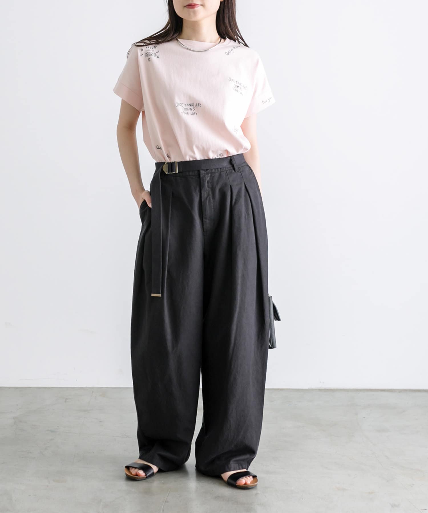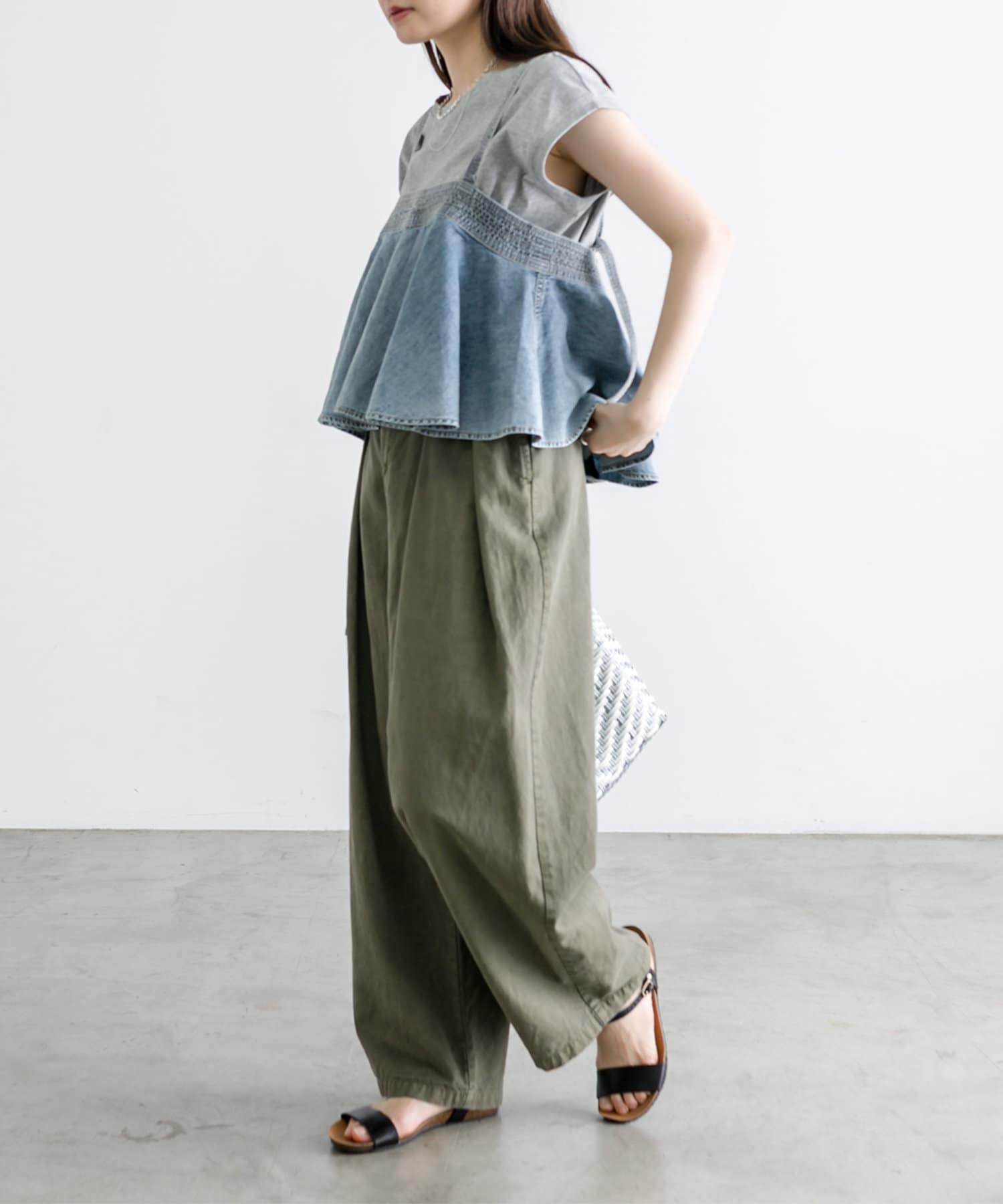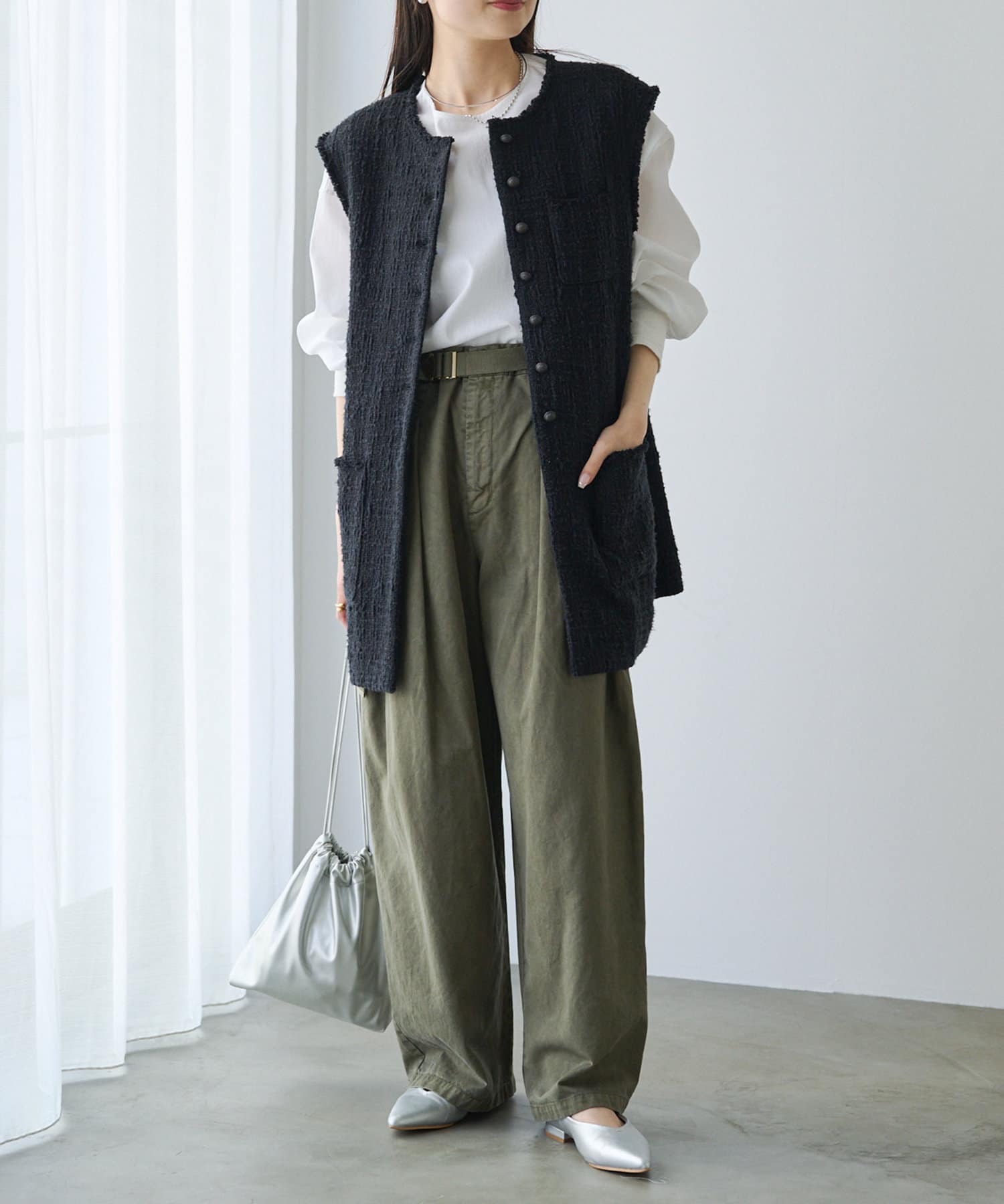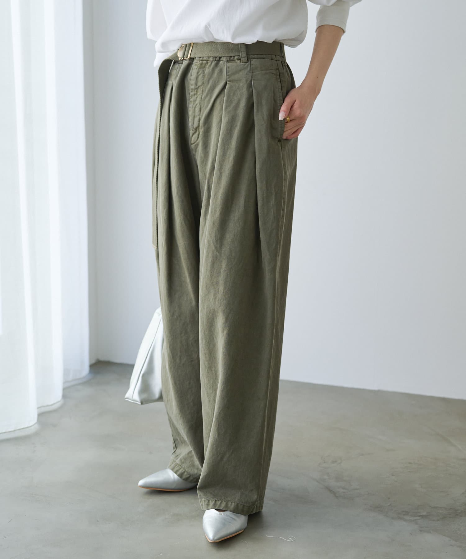 ダブルタックを入れたルーズなシルエットで、こなれ感のあるカジュアルなスタイリングに導きます。