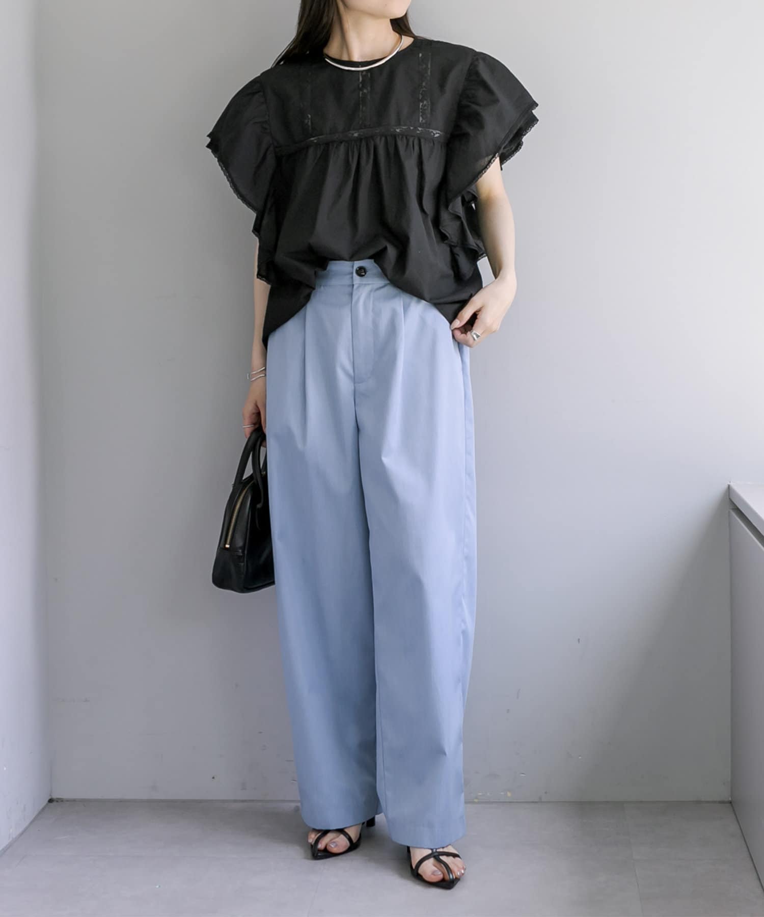 ウエストにタックが入っているので、トップスをタックインしたスタイルや前だけ引っ掛けメリハリを付けた着こなしがオススメ。