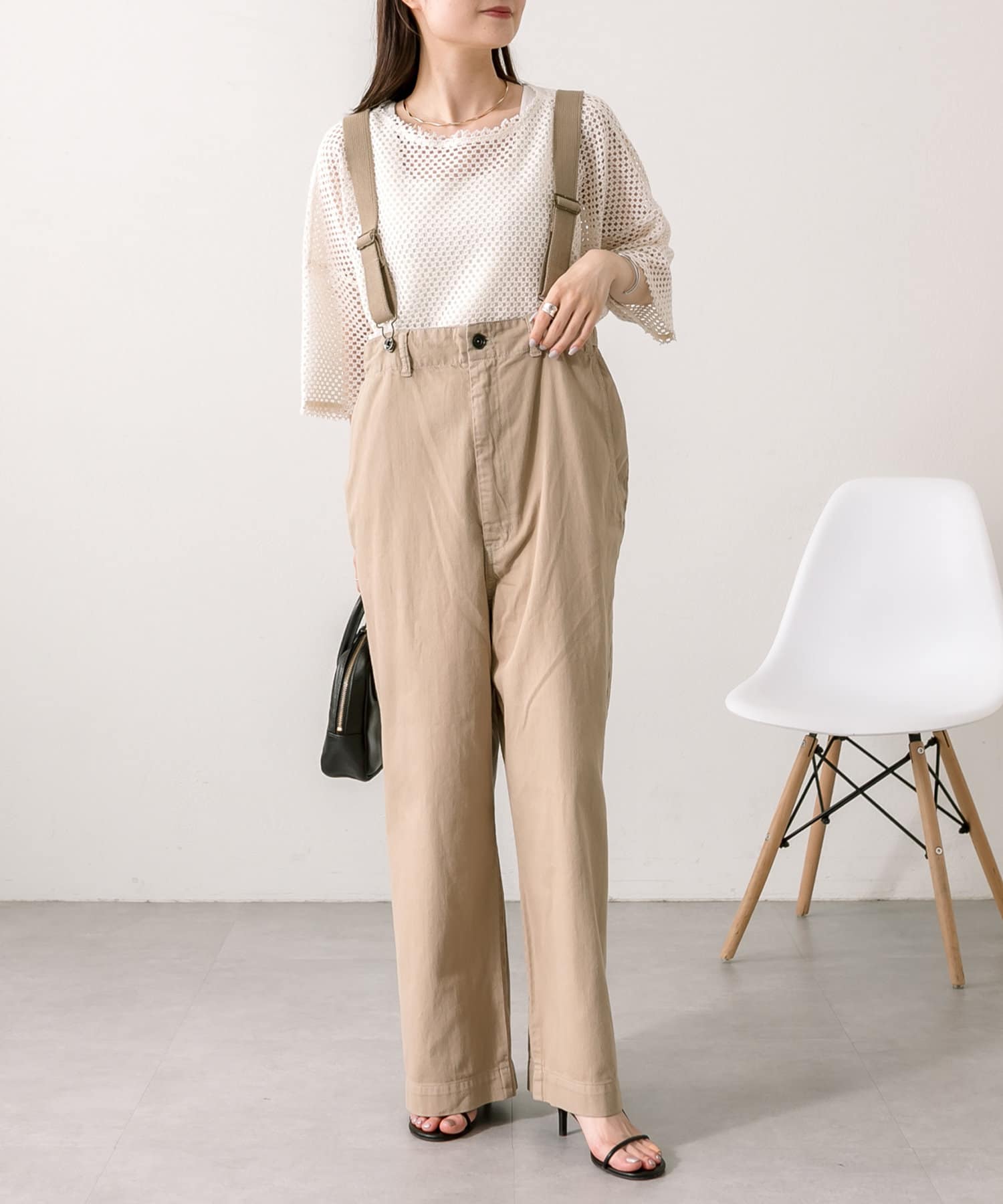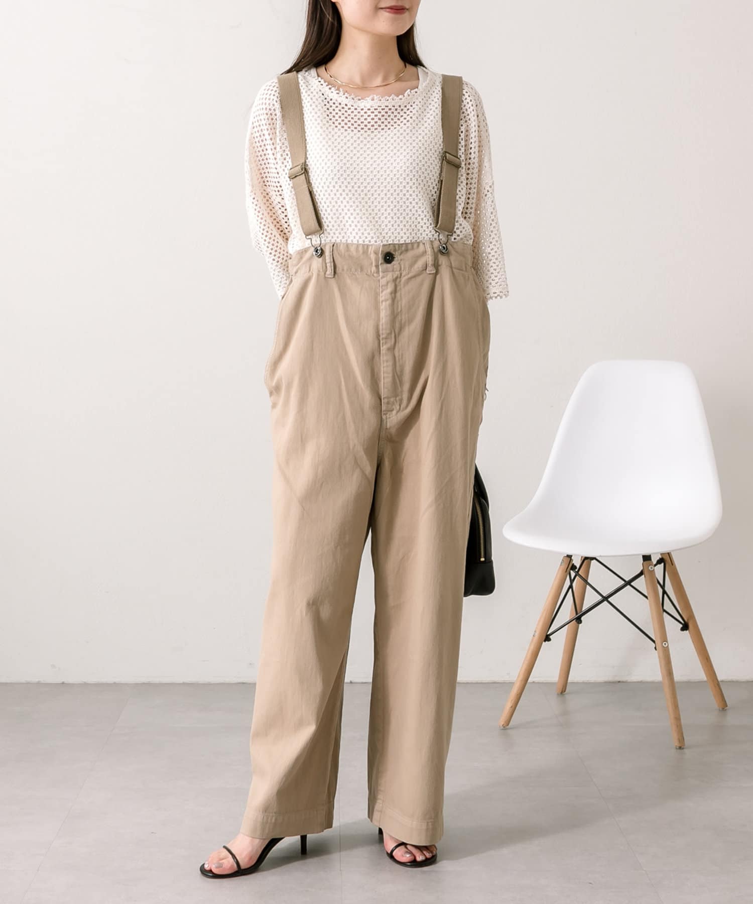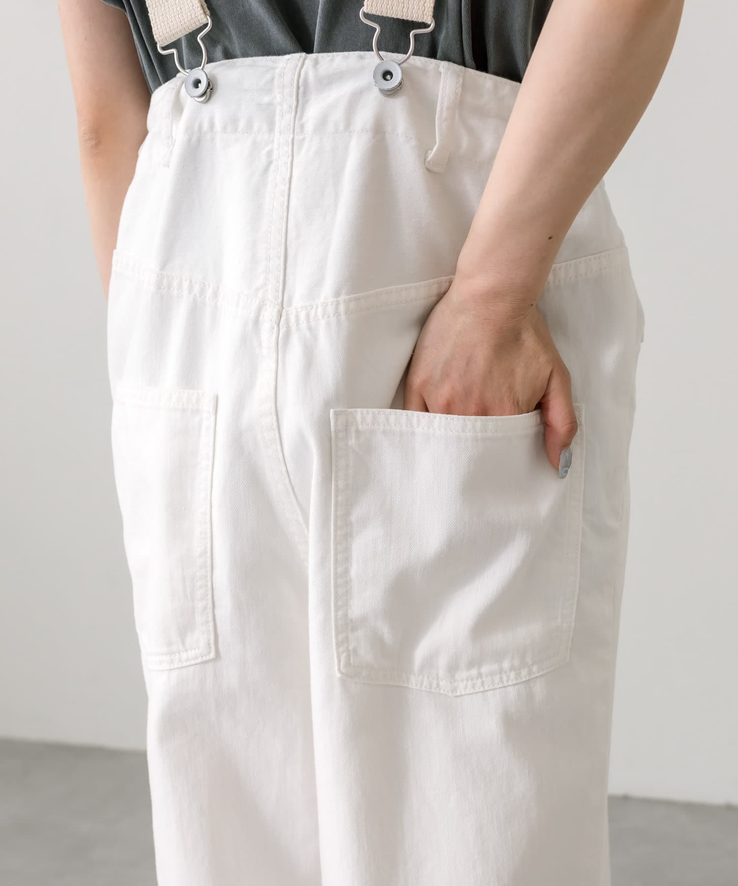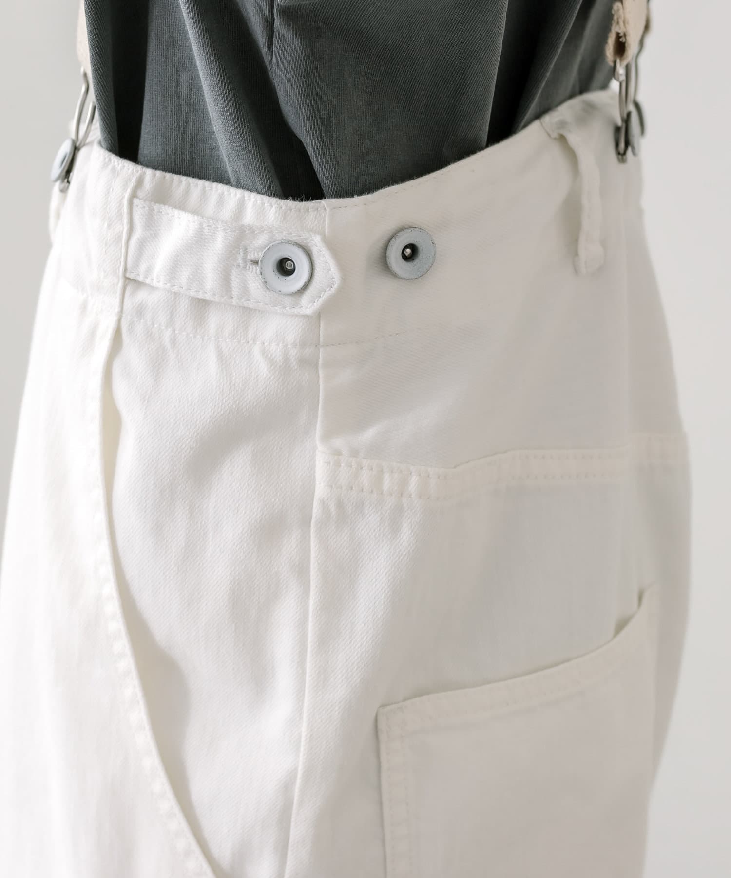 股上を深くとっているので、サスペンダーを付けてサロペットのように着用することも可能。
