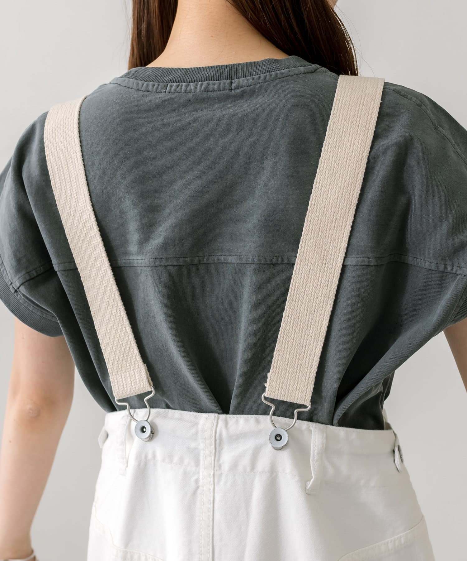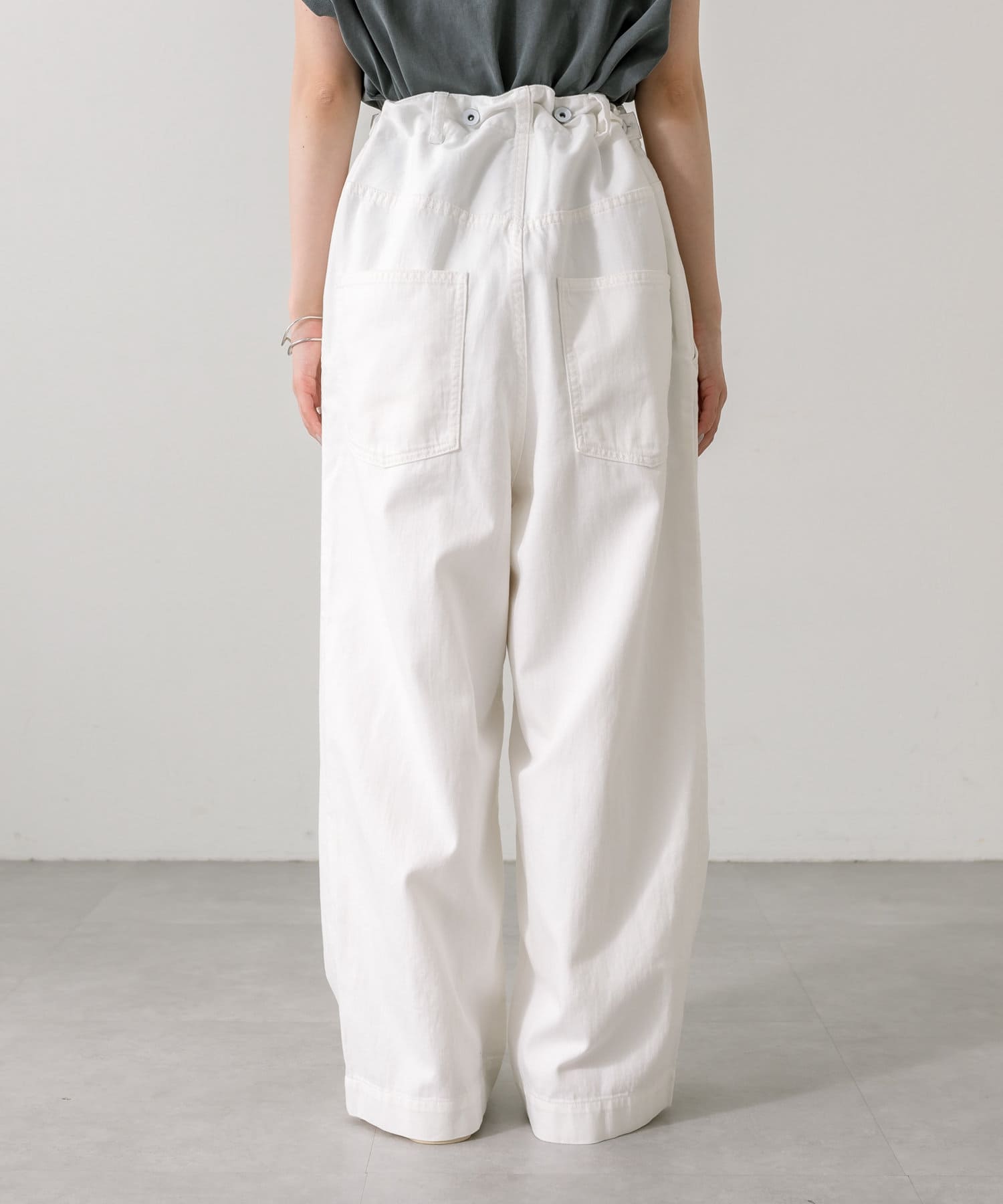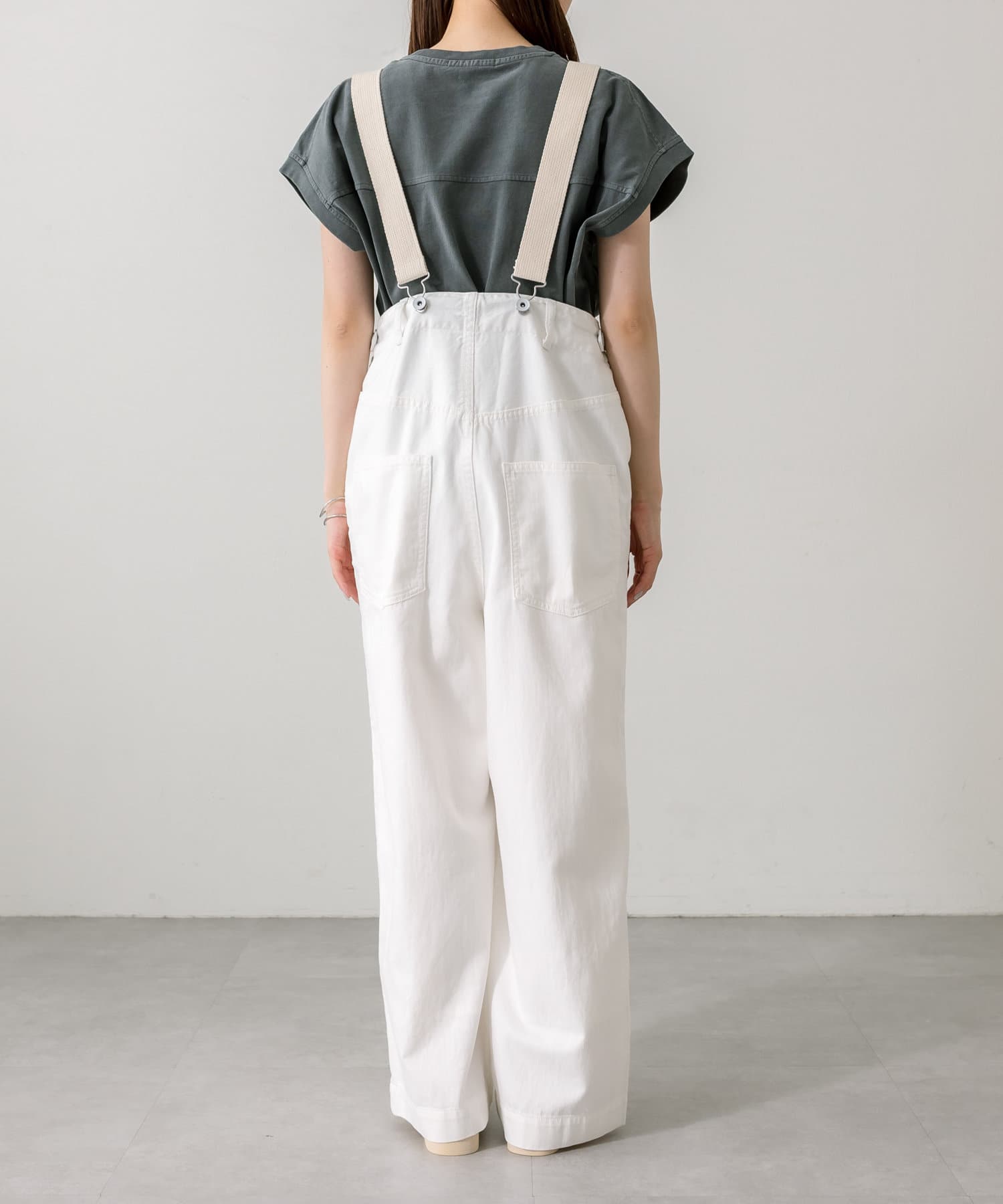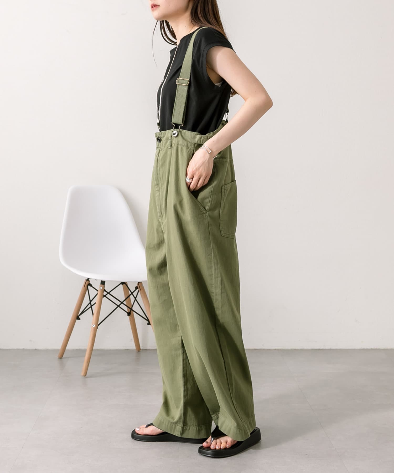 股上を深くとっているので、サスペンダーを付けてサロペットのように着用することも可能。