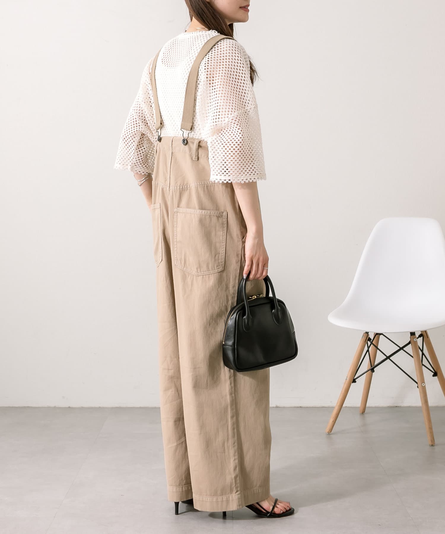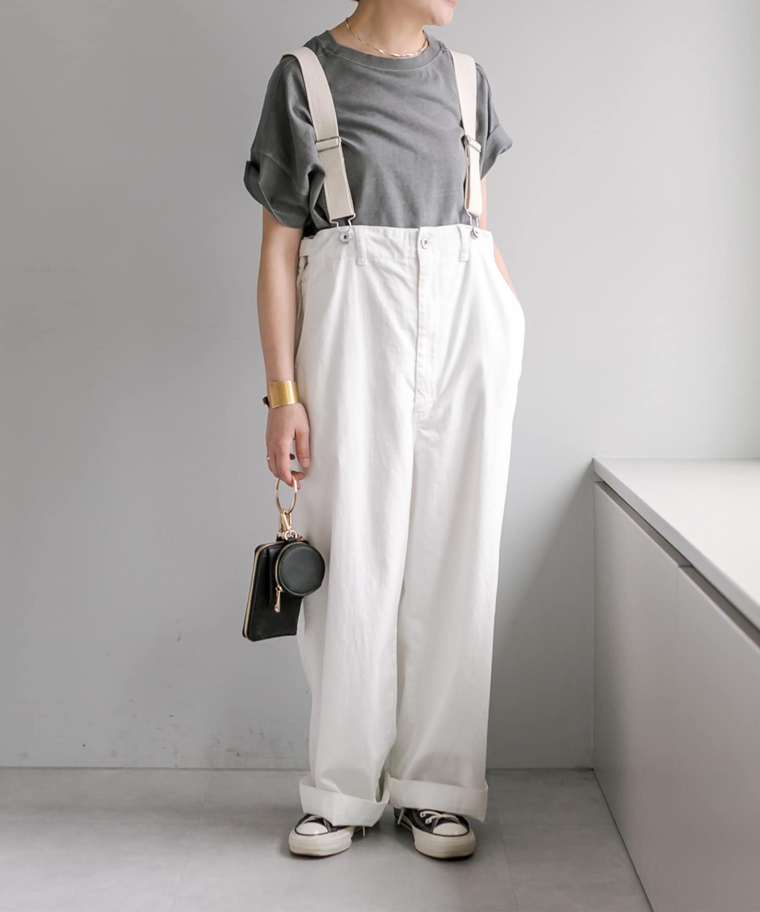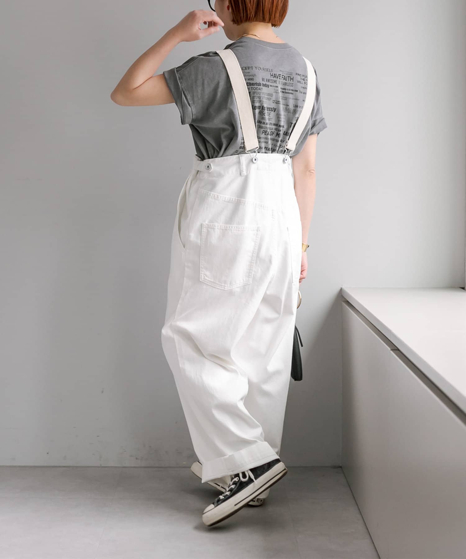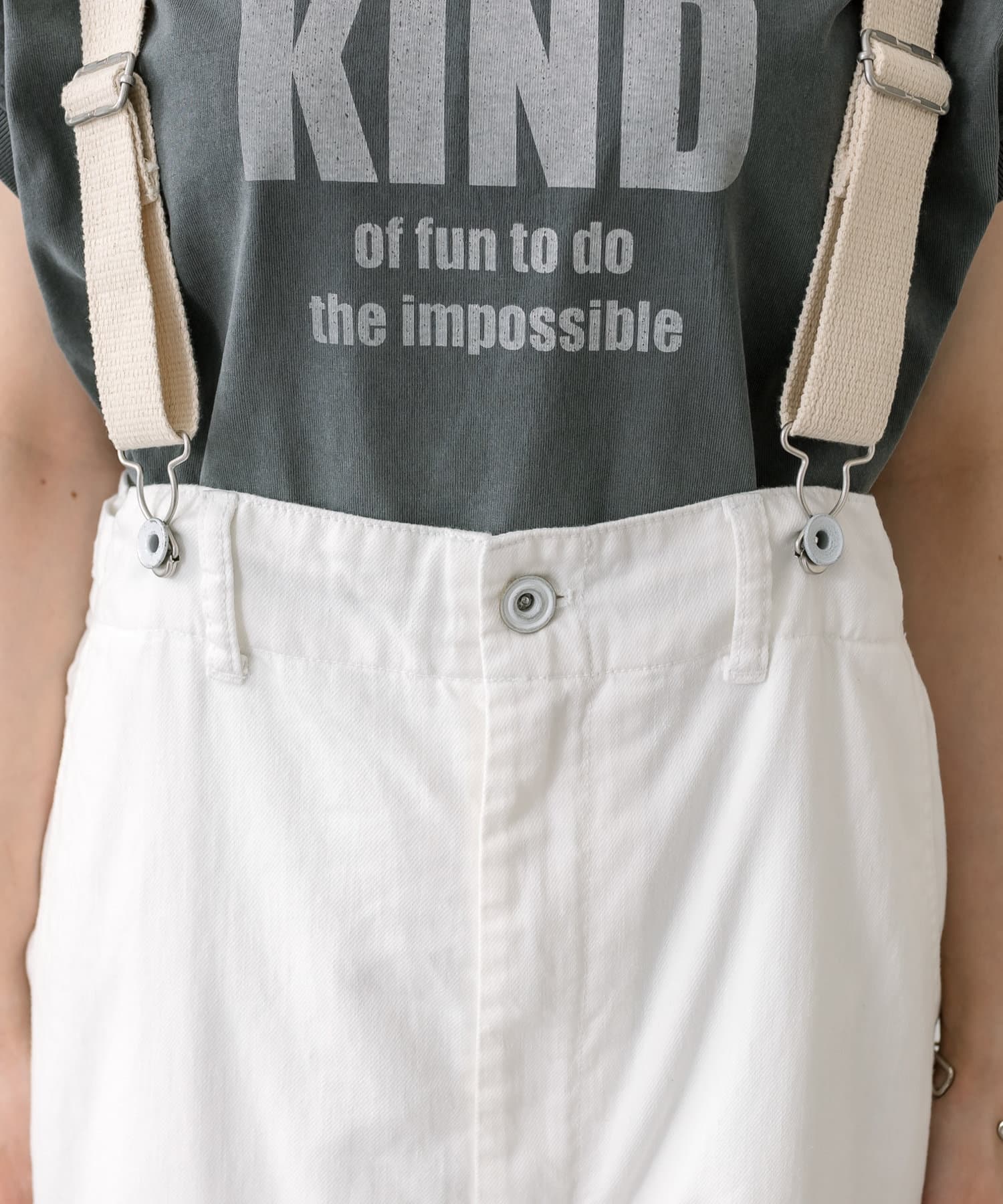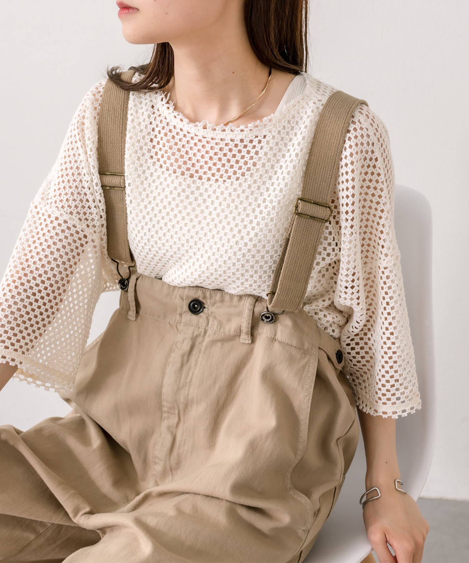 股上を深くとっているので、サスペンダーを付けてサロペットのように着用することも可能。