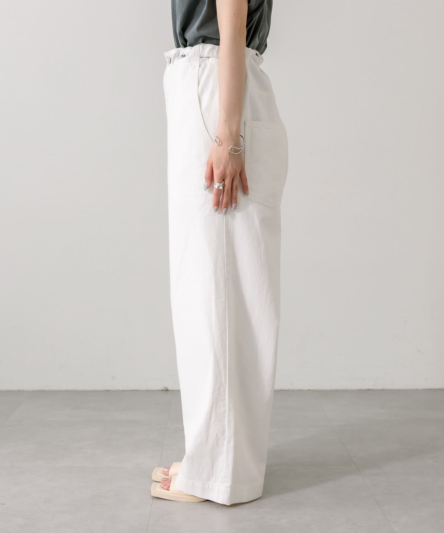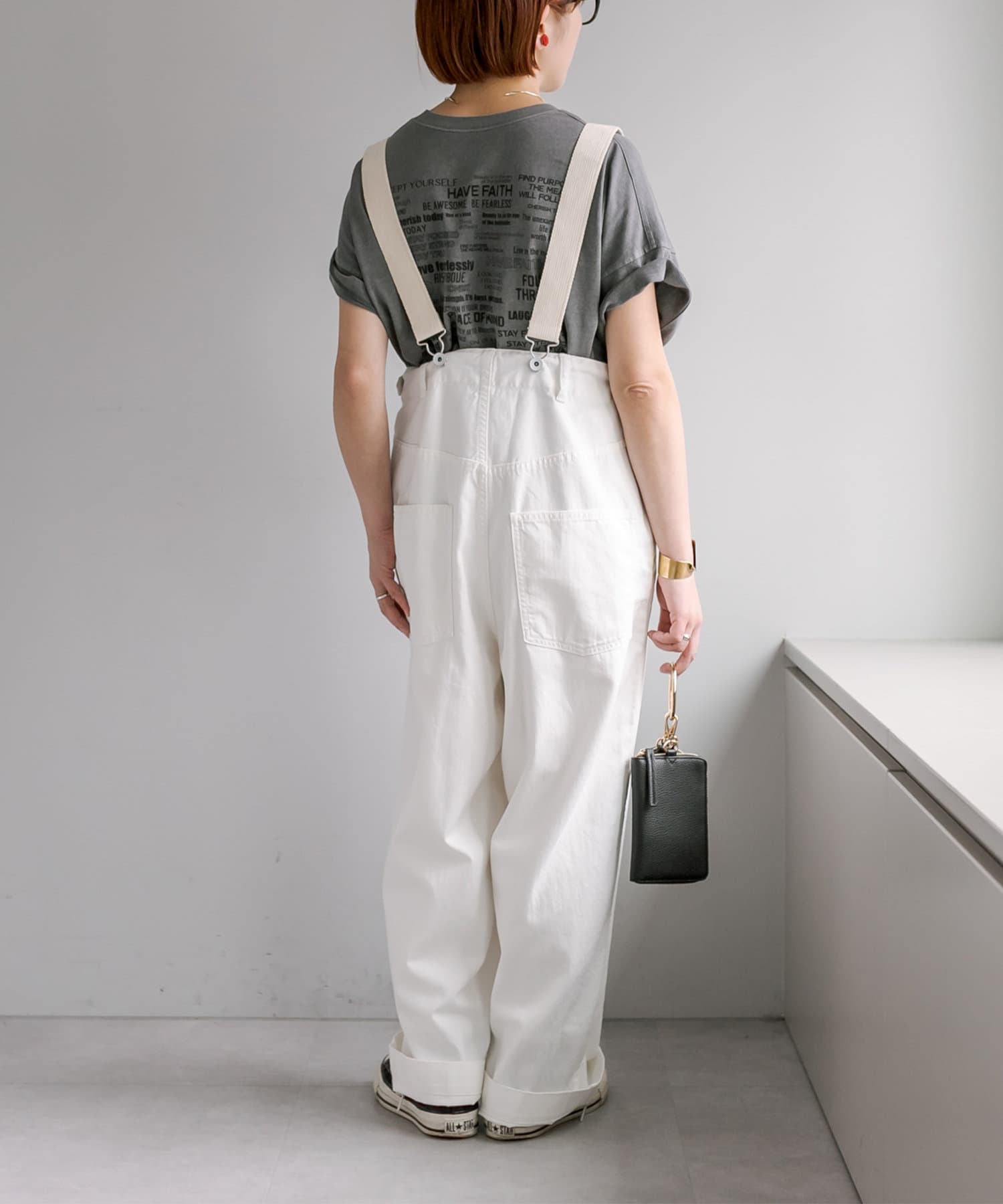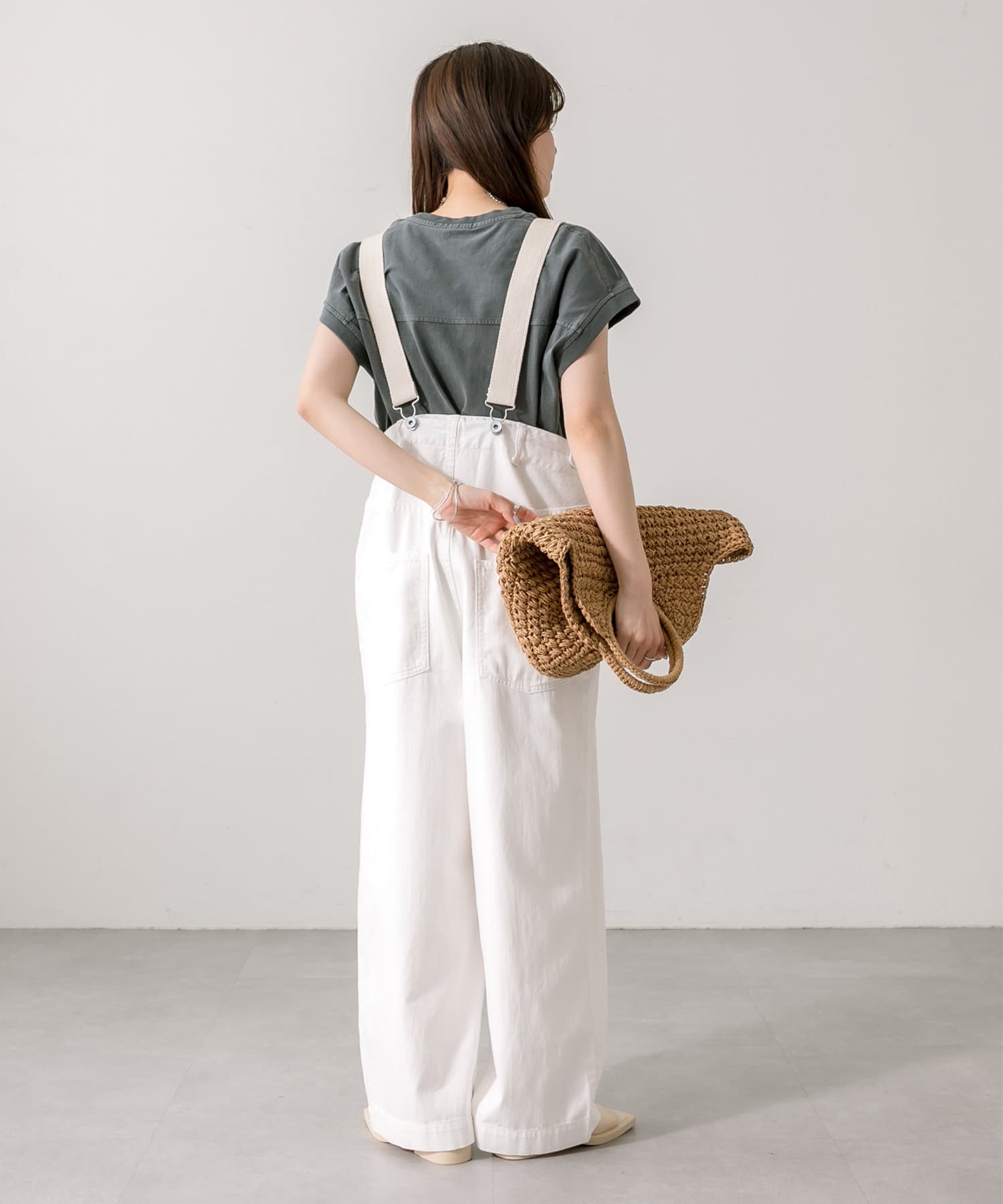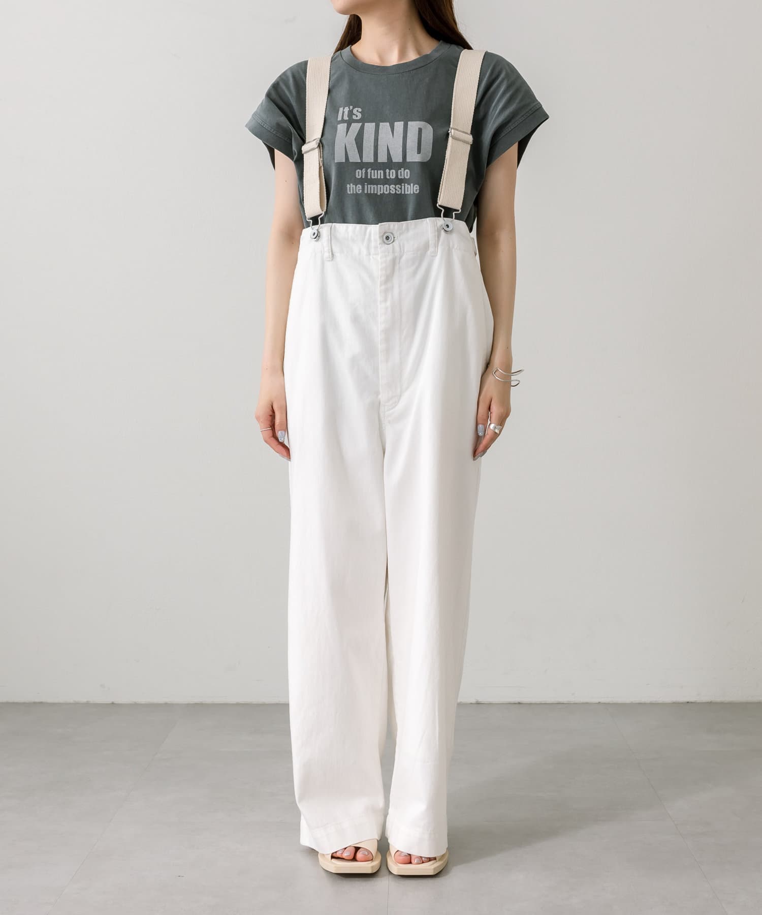 股上を深くとっているので、サスペンダーを付けてサロペットのように着用することも可能。