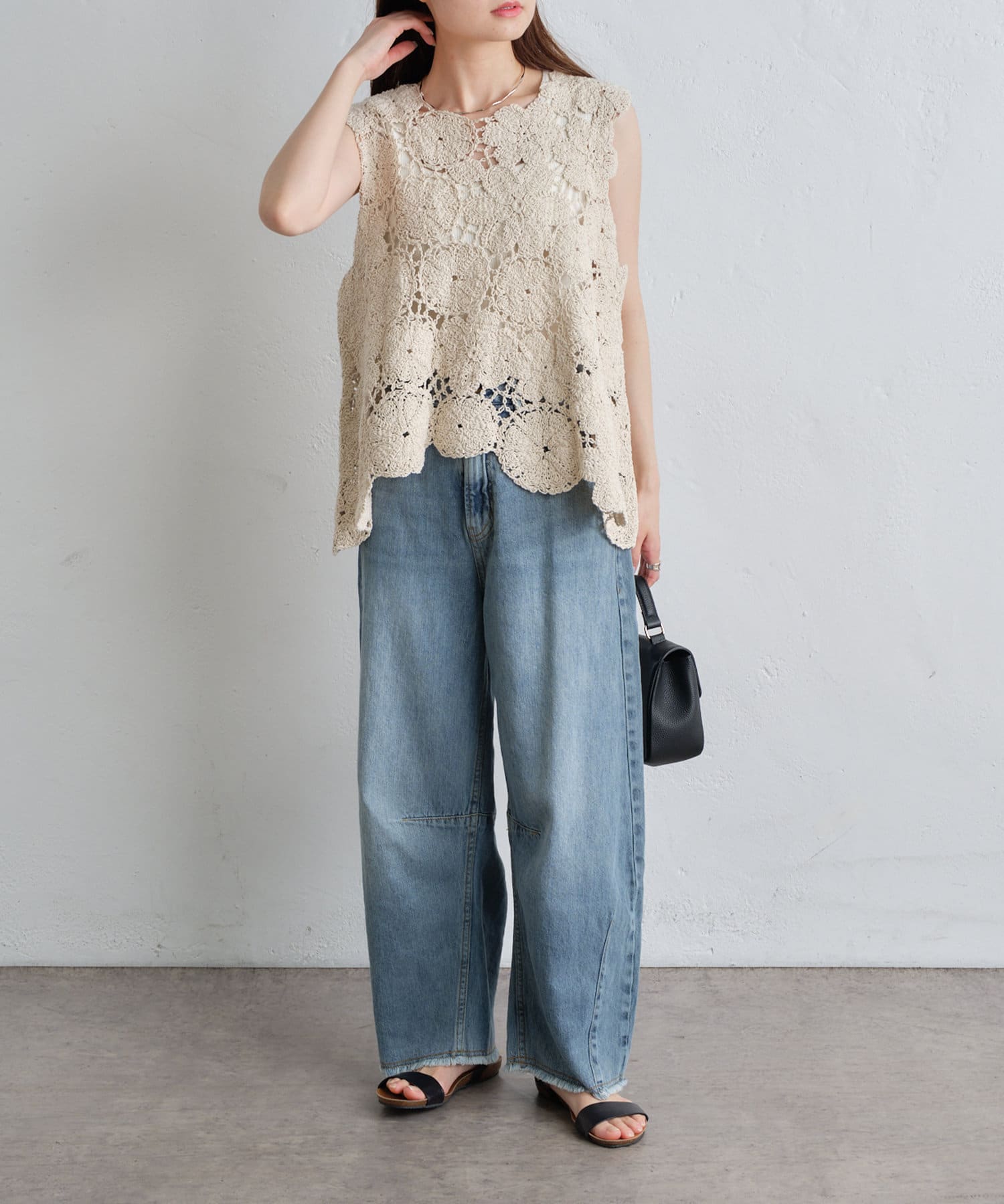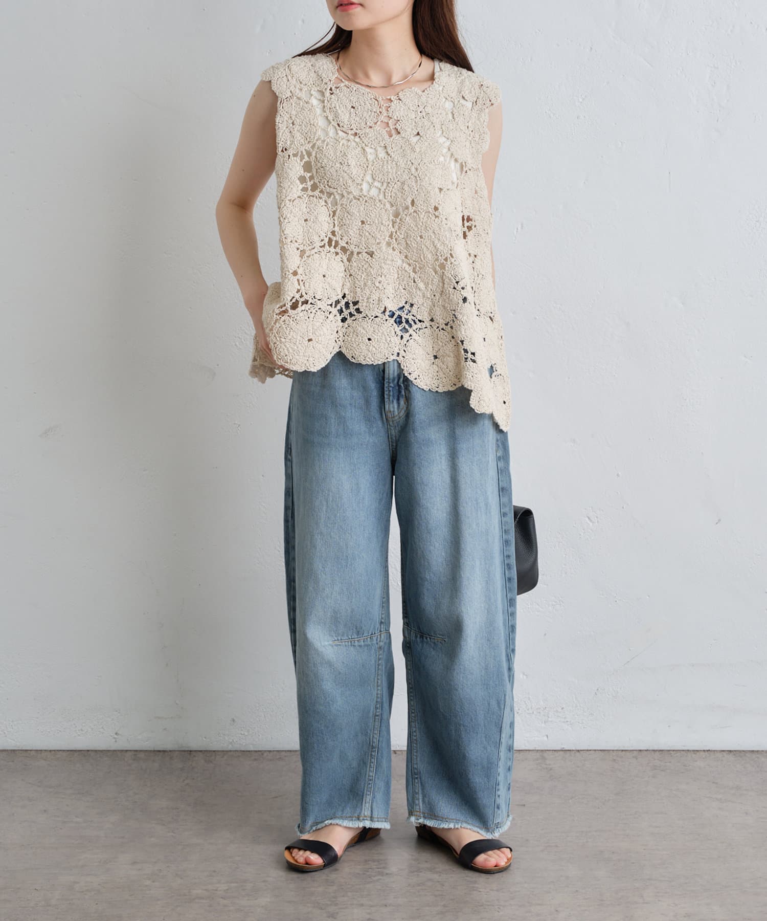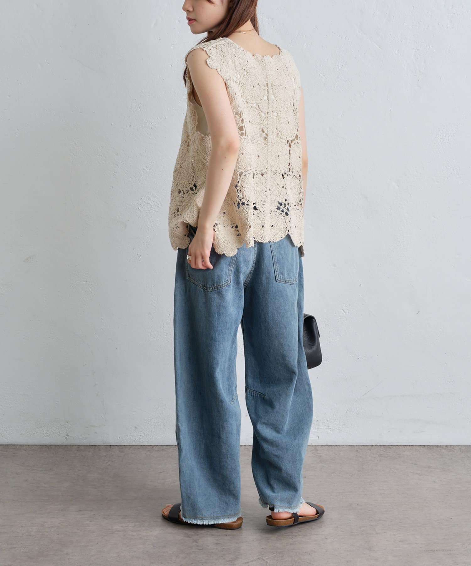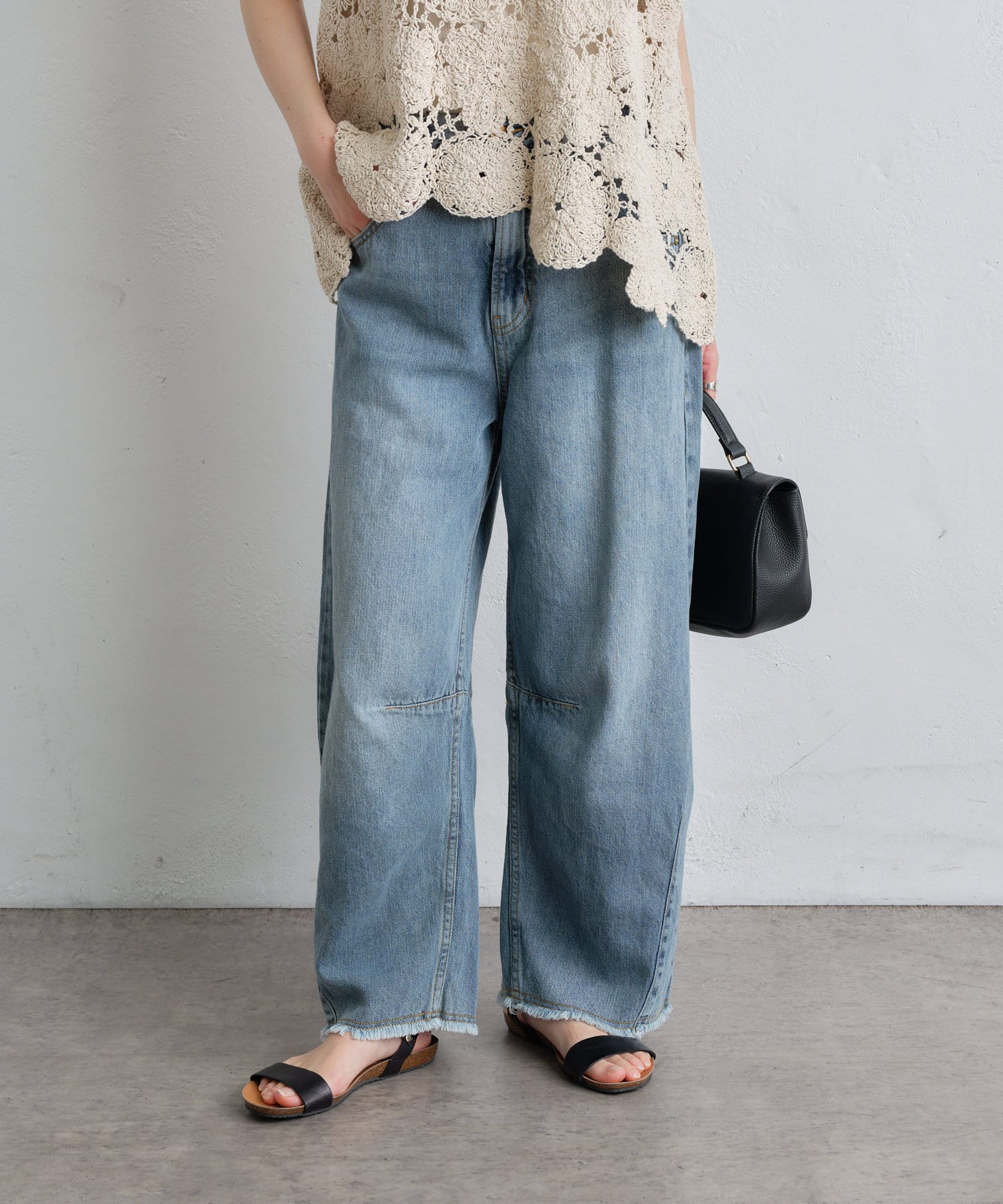 洗いざらしのナチュラルな表情と裾のフリンジがヴィンテージ感を演出します。