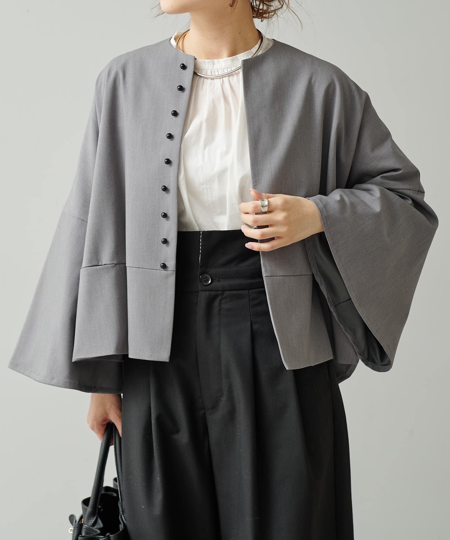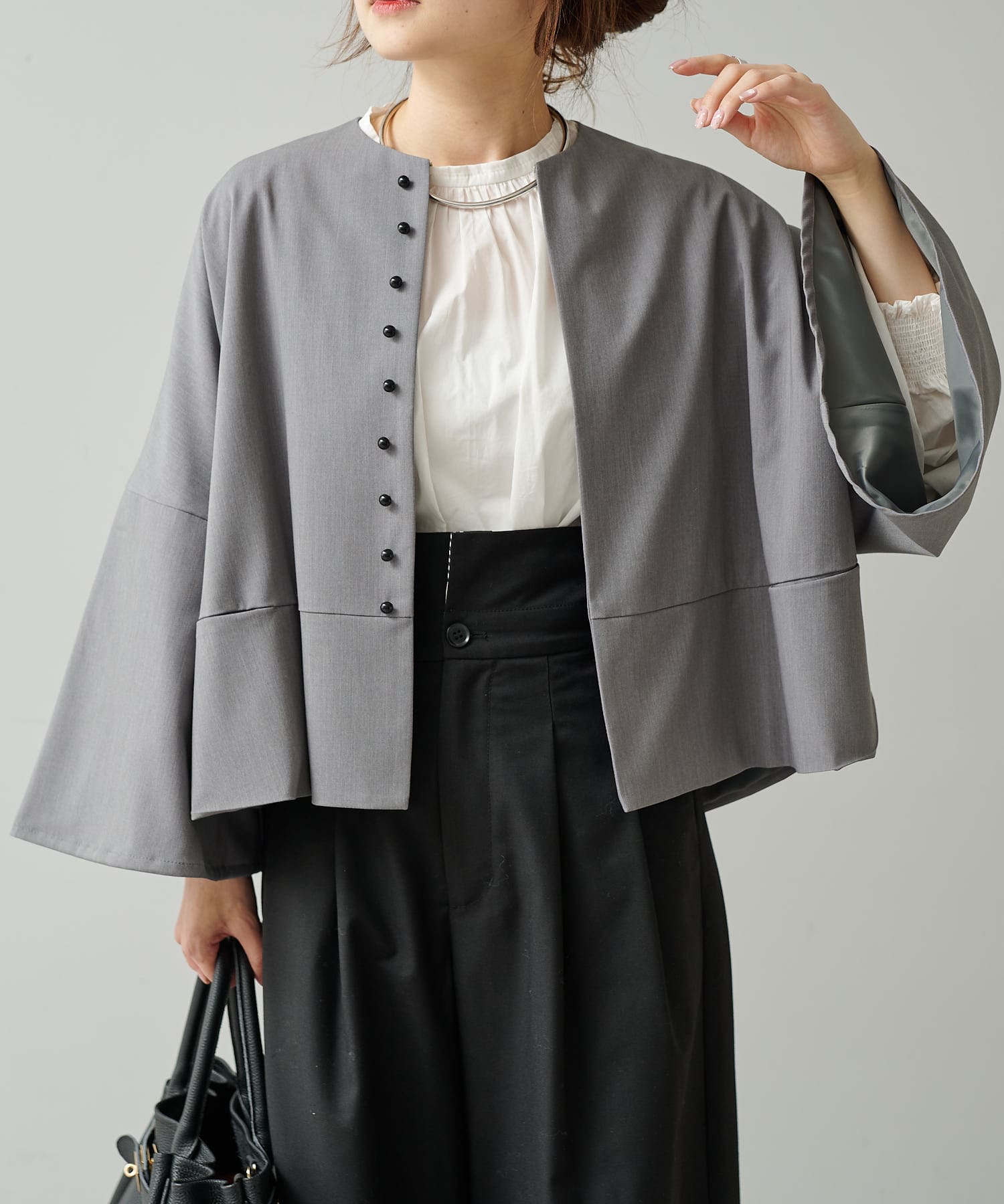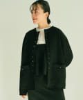 首元に沿うノーカラーのラウンドネックなので、カーディガンやベストだけでなくジャケットとの相性も抜群。