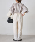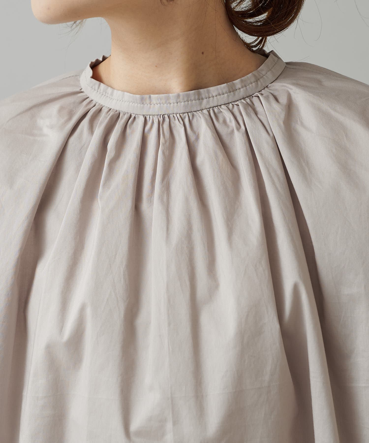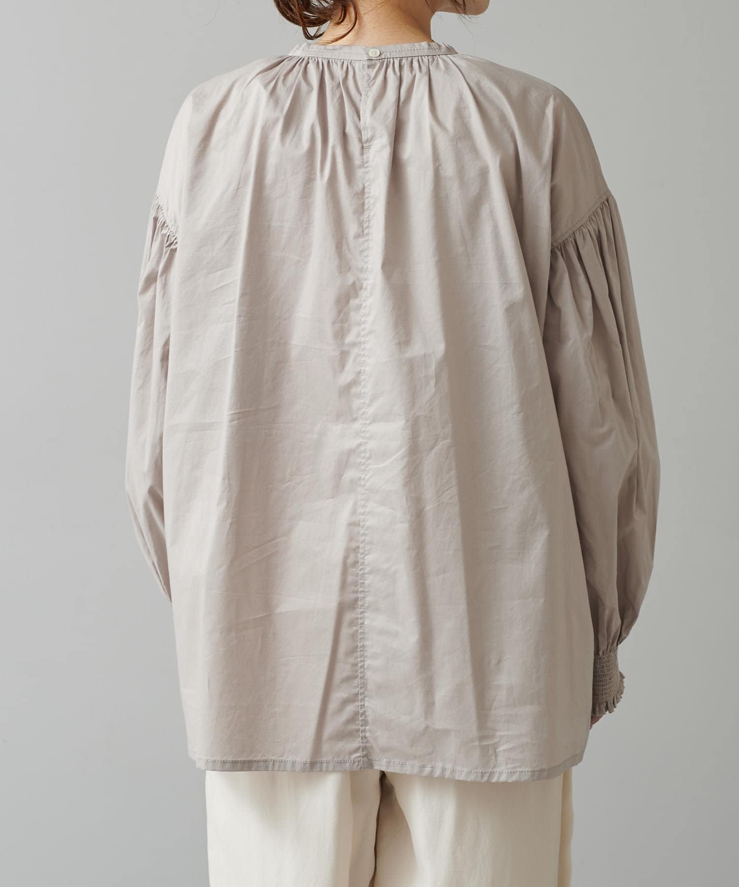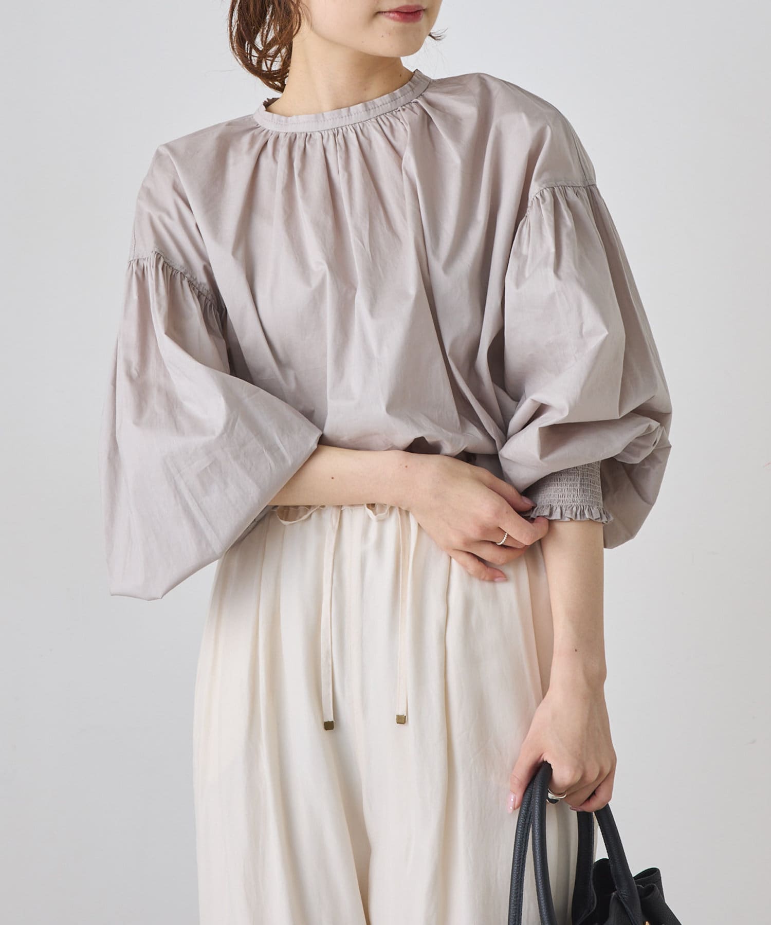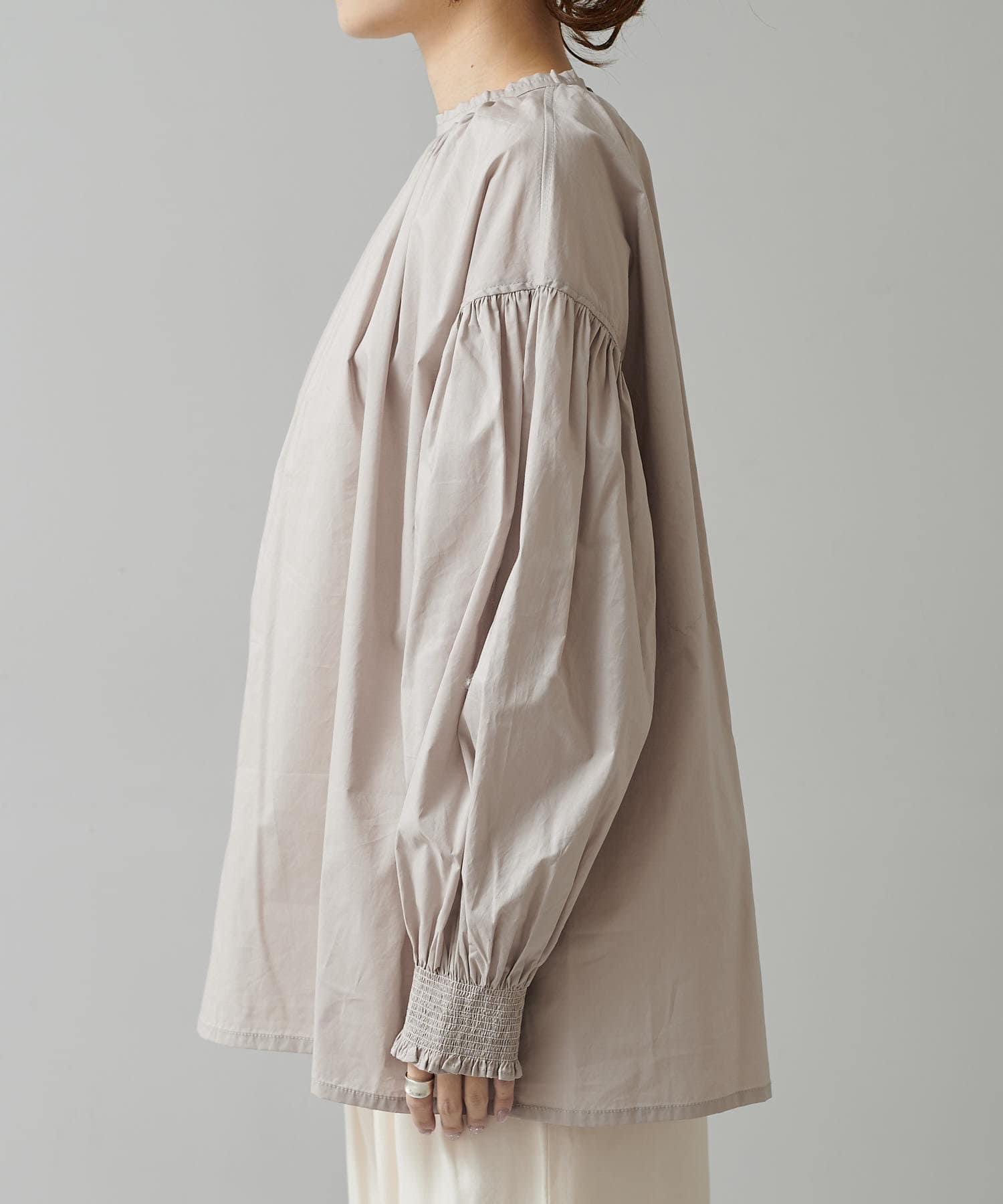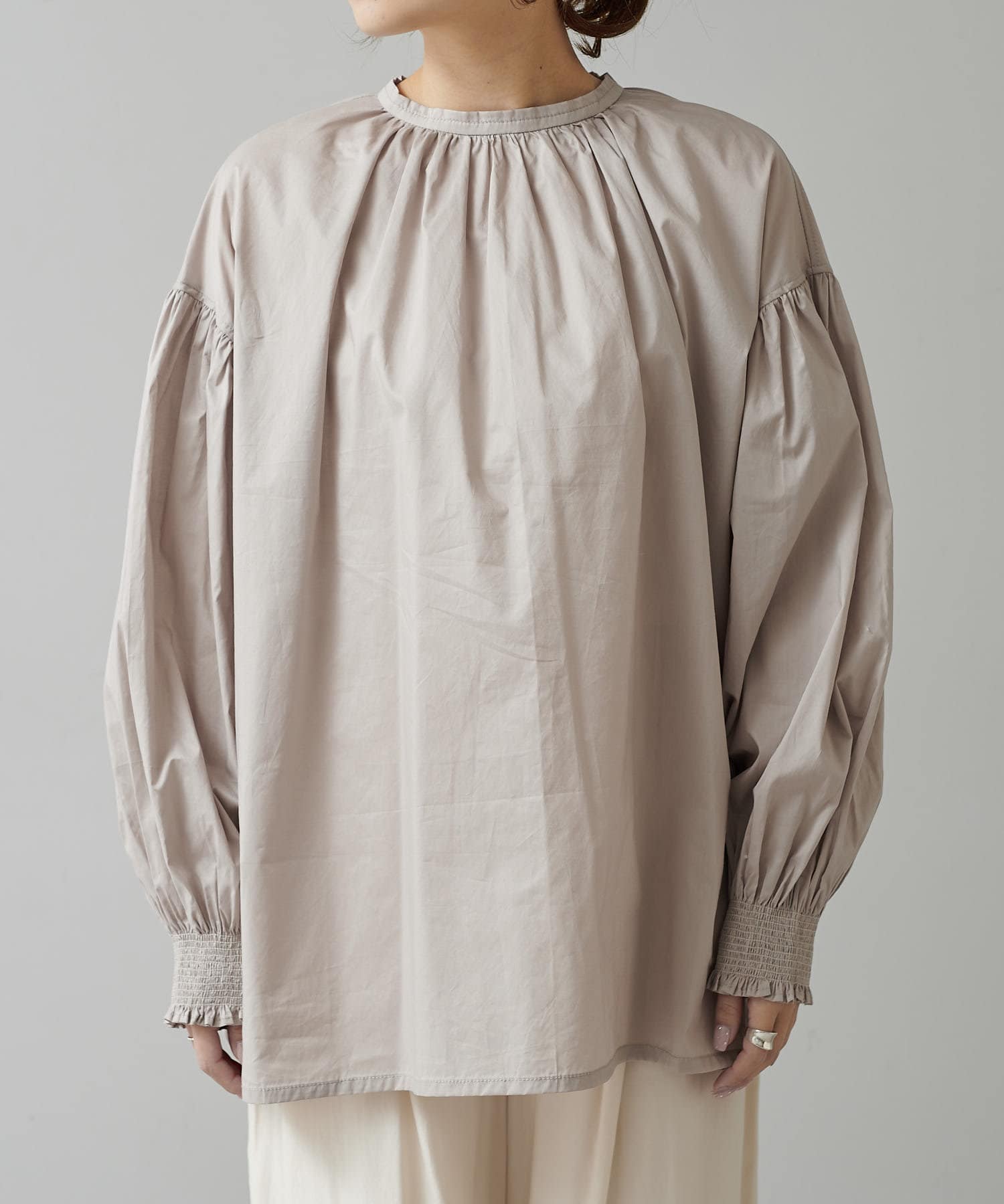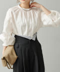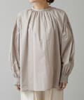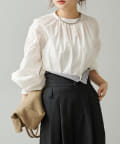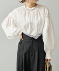 手首を引き締める袖口のシャーリングが、ふんわりボリュームのあるアームラインを引き立てるプルオーバーブラウス。