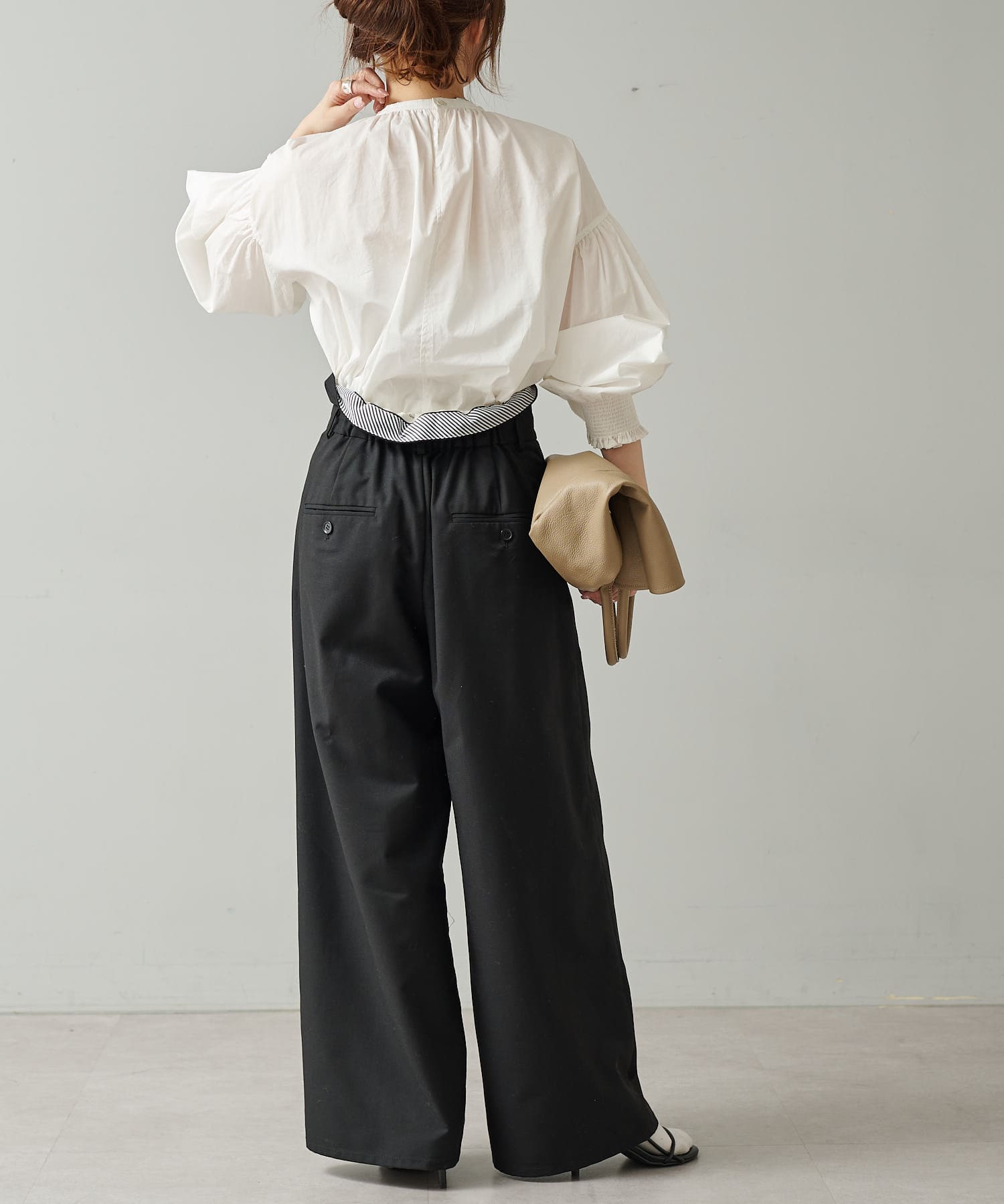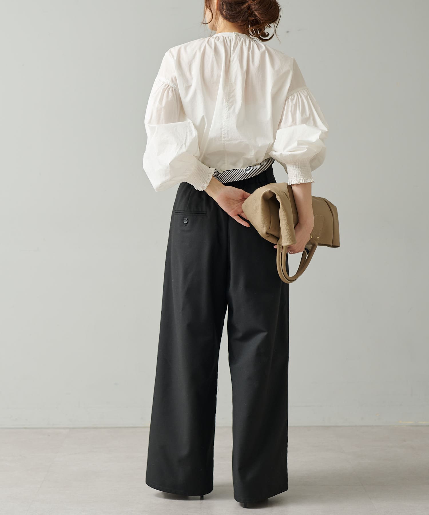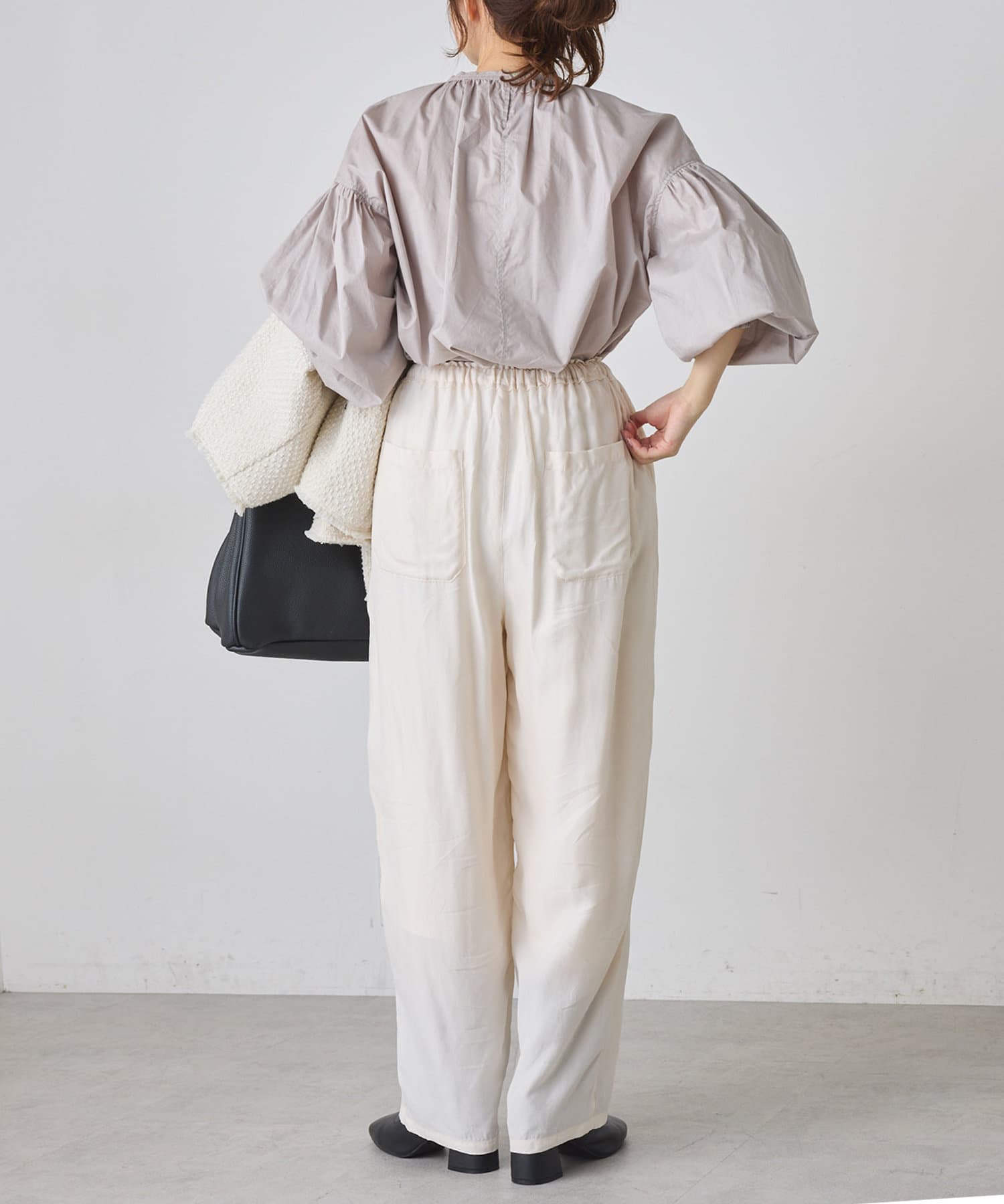 袖にはシャーリングを施しているので袖口を上げて着ると、よりボリュームが出てオススメです。