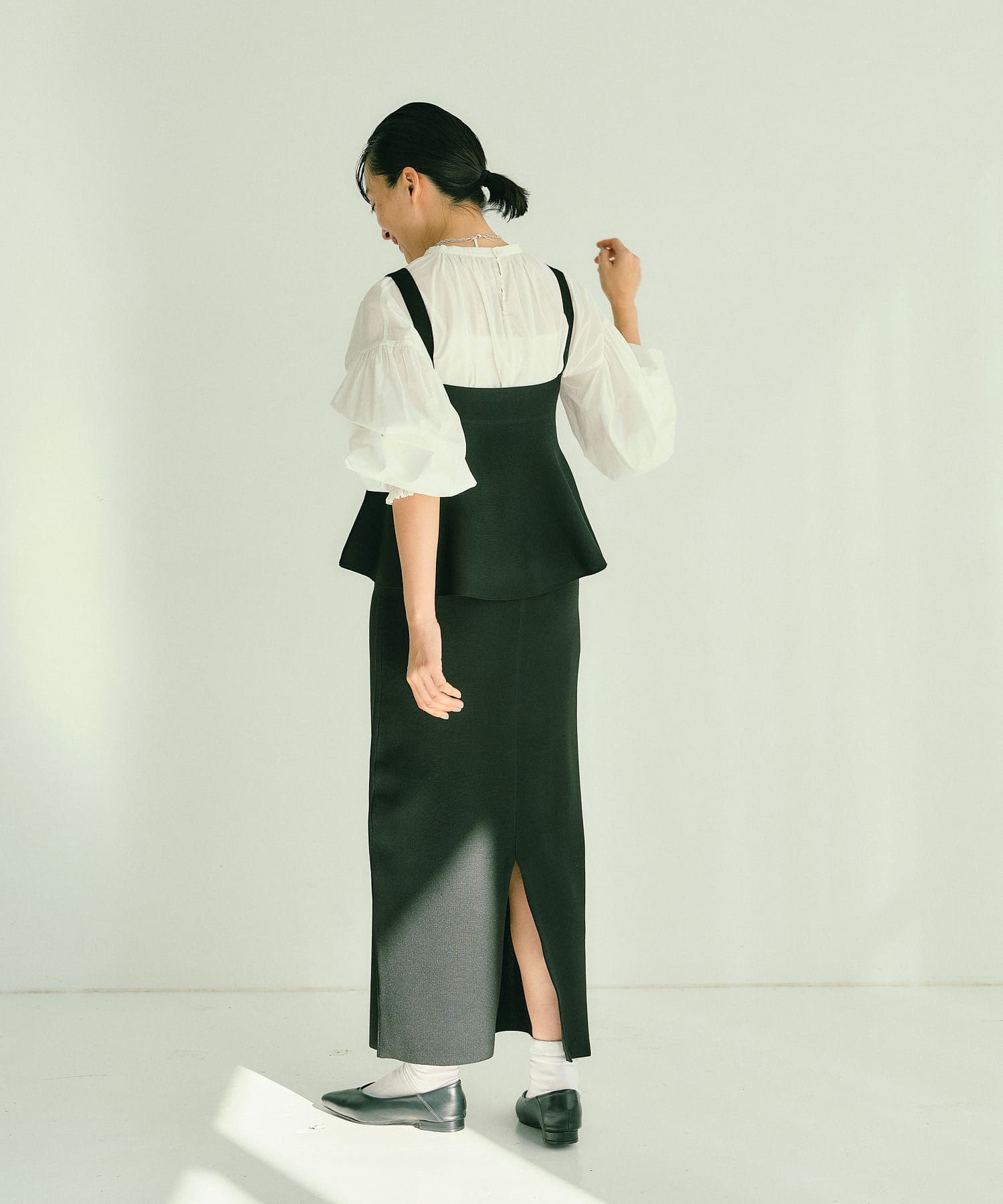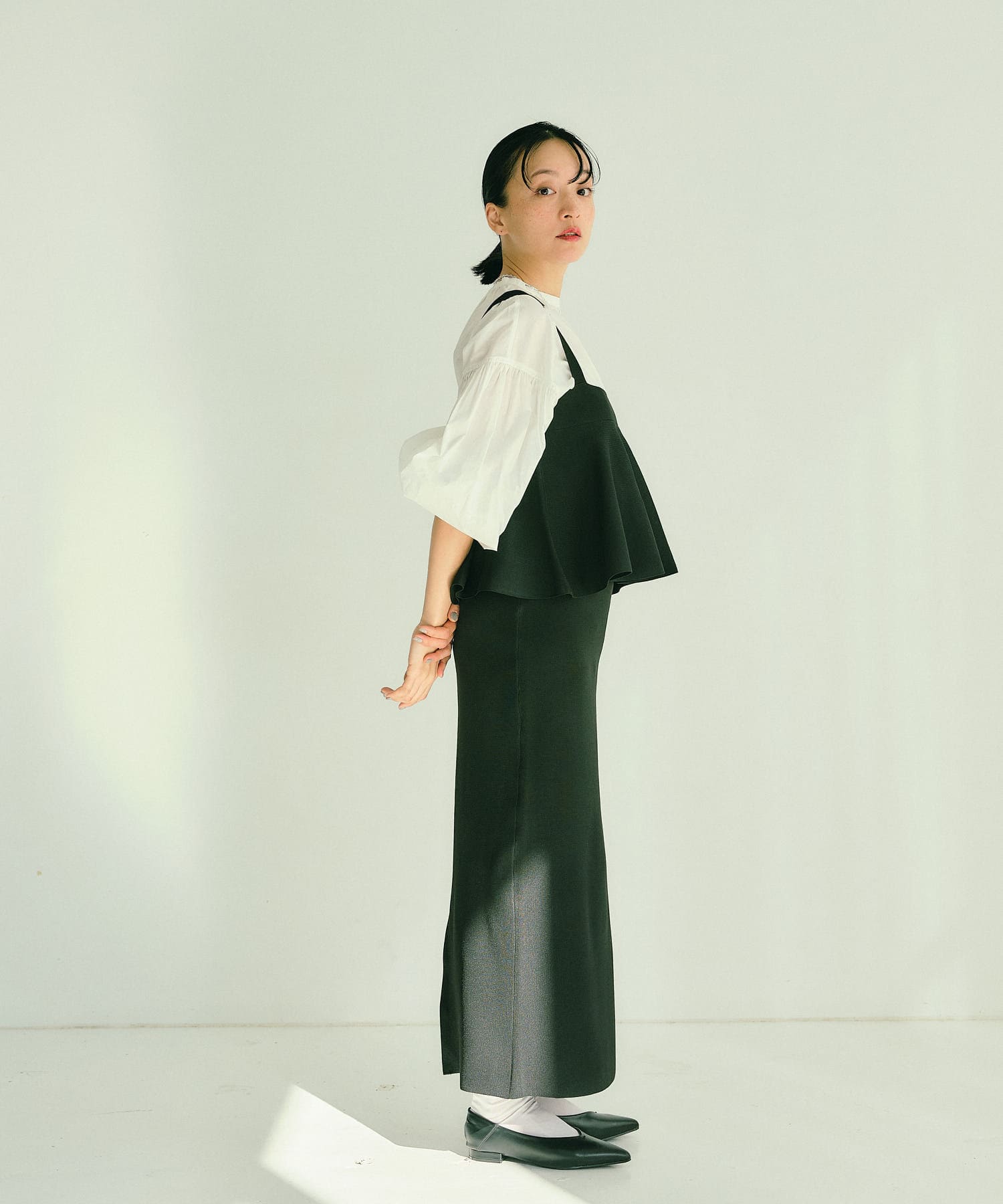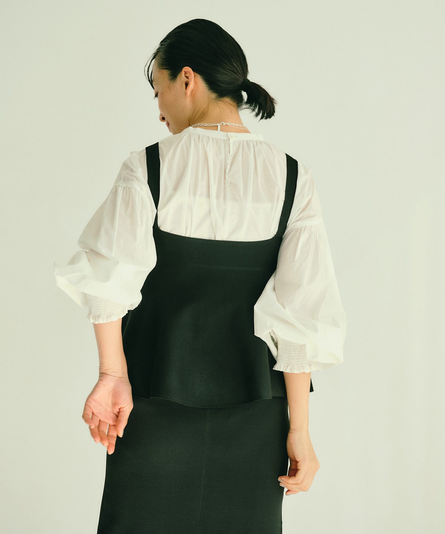 袖にはシャーリングを施しているので袖口を上げて着ると、よりボリュームが出てオススメです。