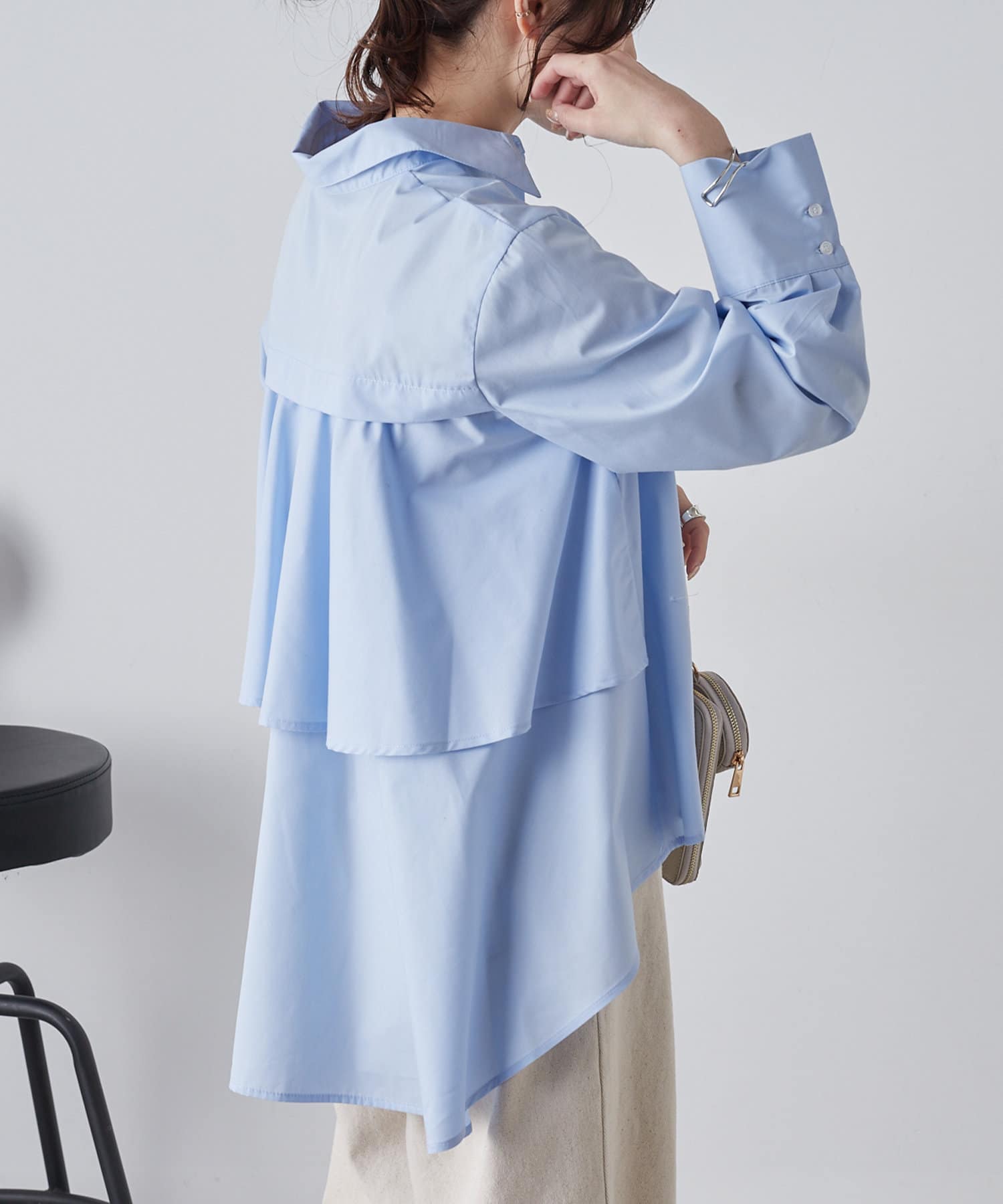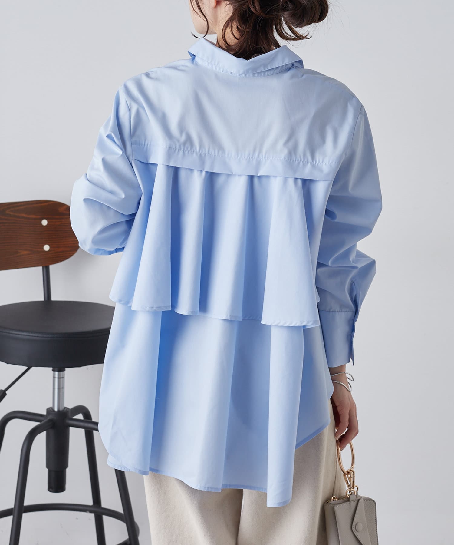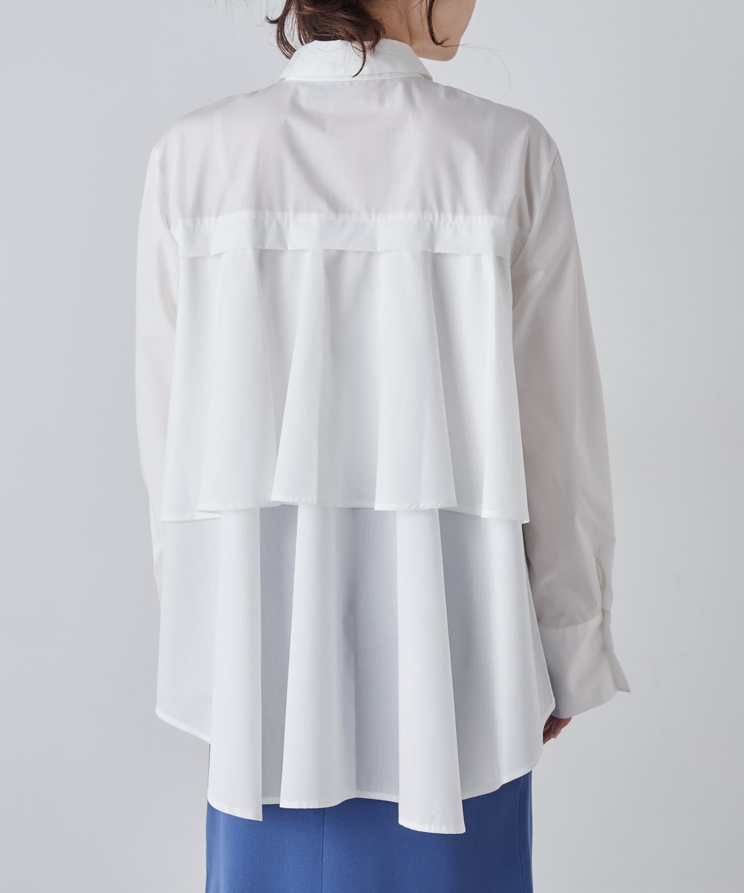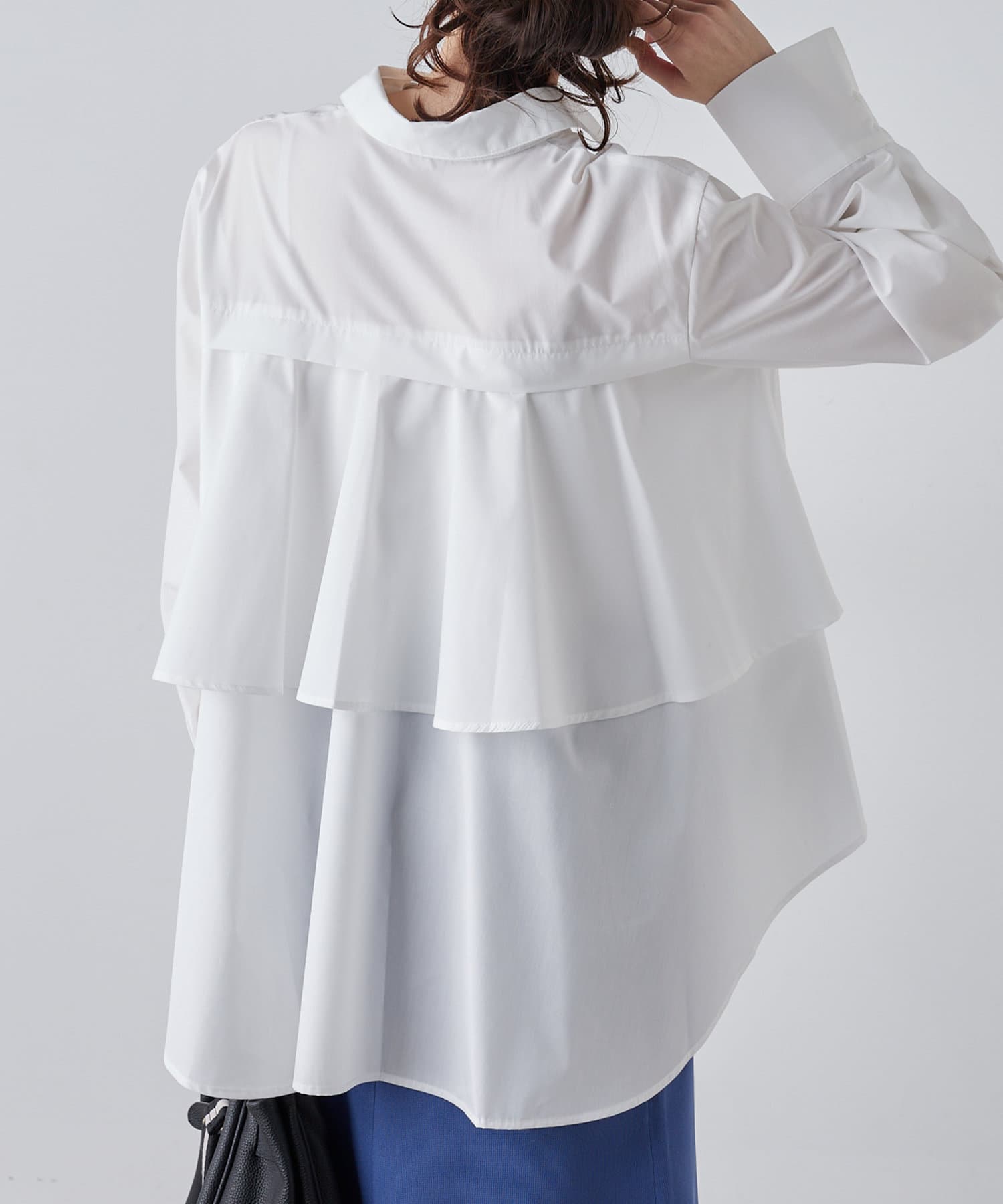 バックのティアードデザインがポイントが華やかさと女性らしい抜け感がもたらすブラウス。