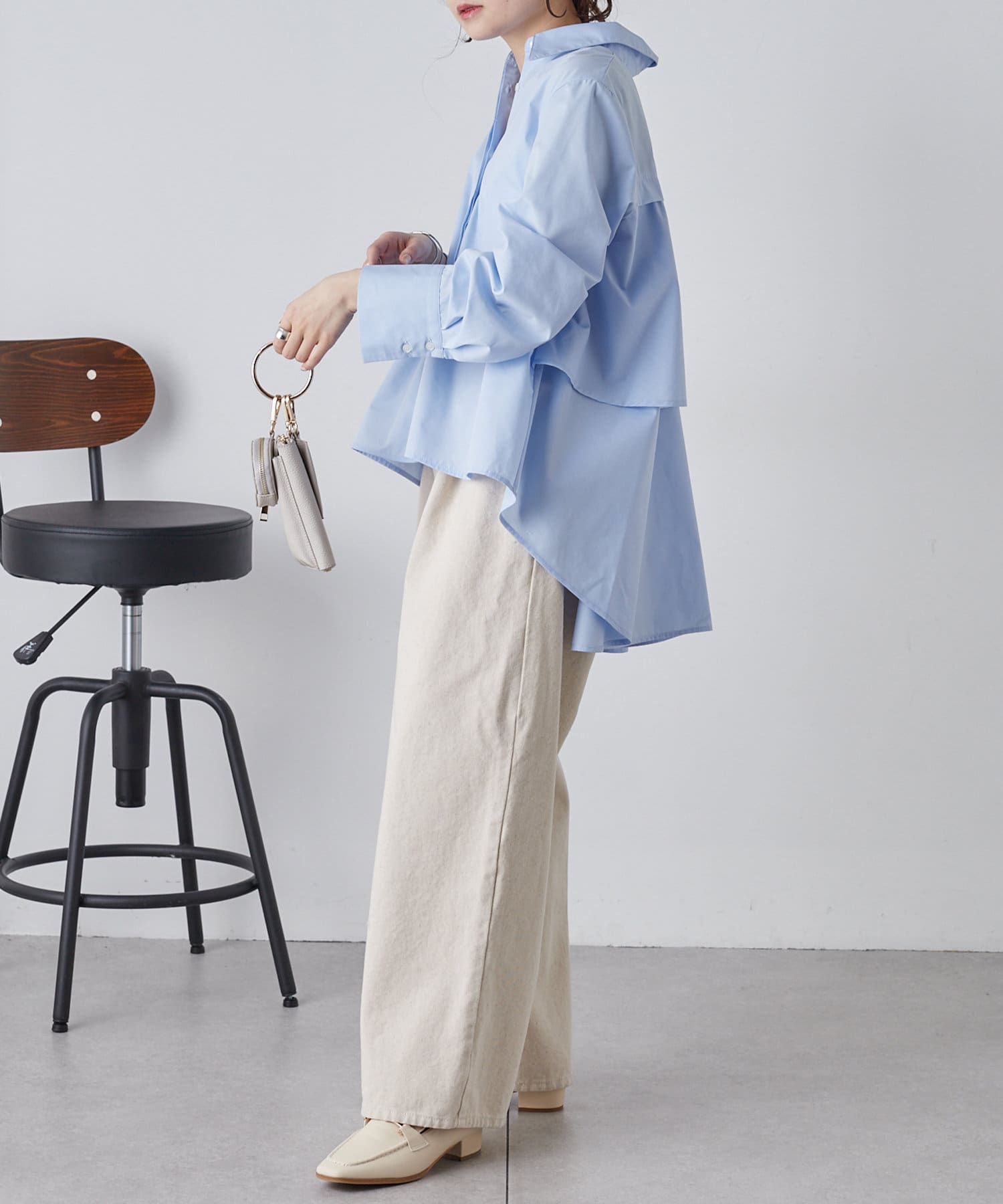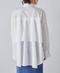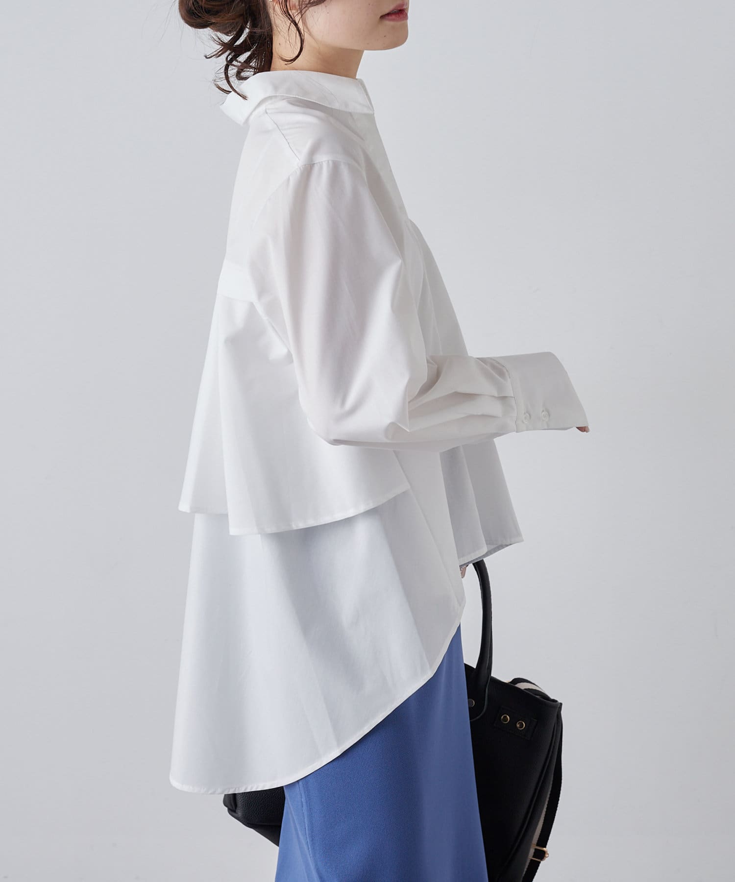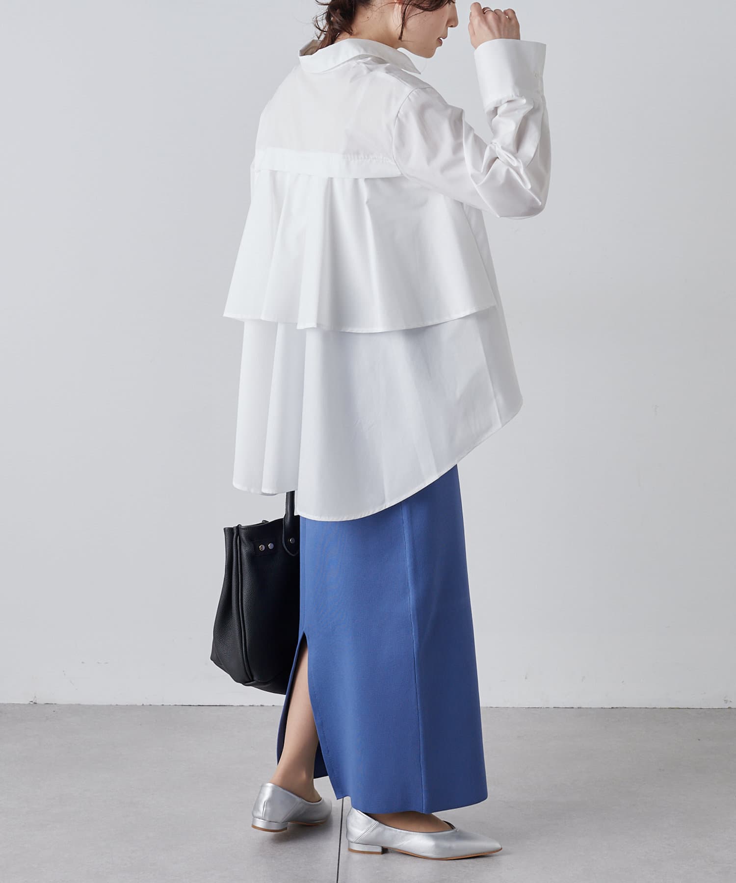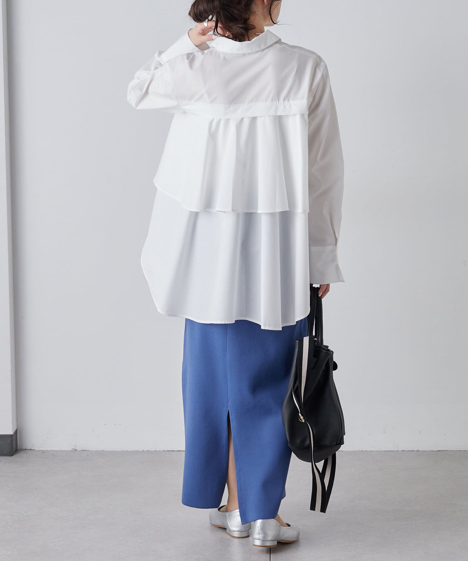 バックのティアードデザインがポイントが華やかさと女性らしい抜け感がもたらすブラウス。
