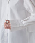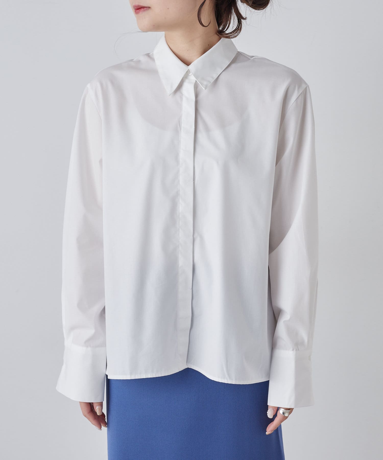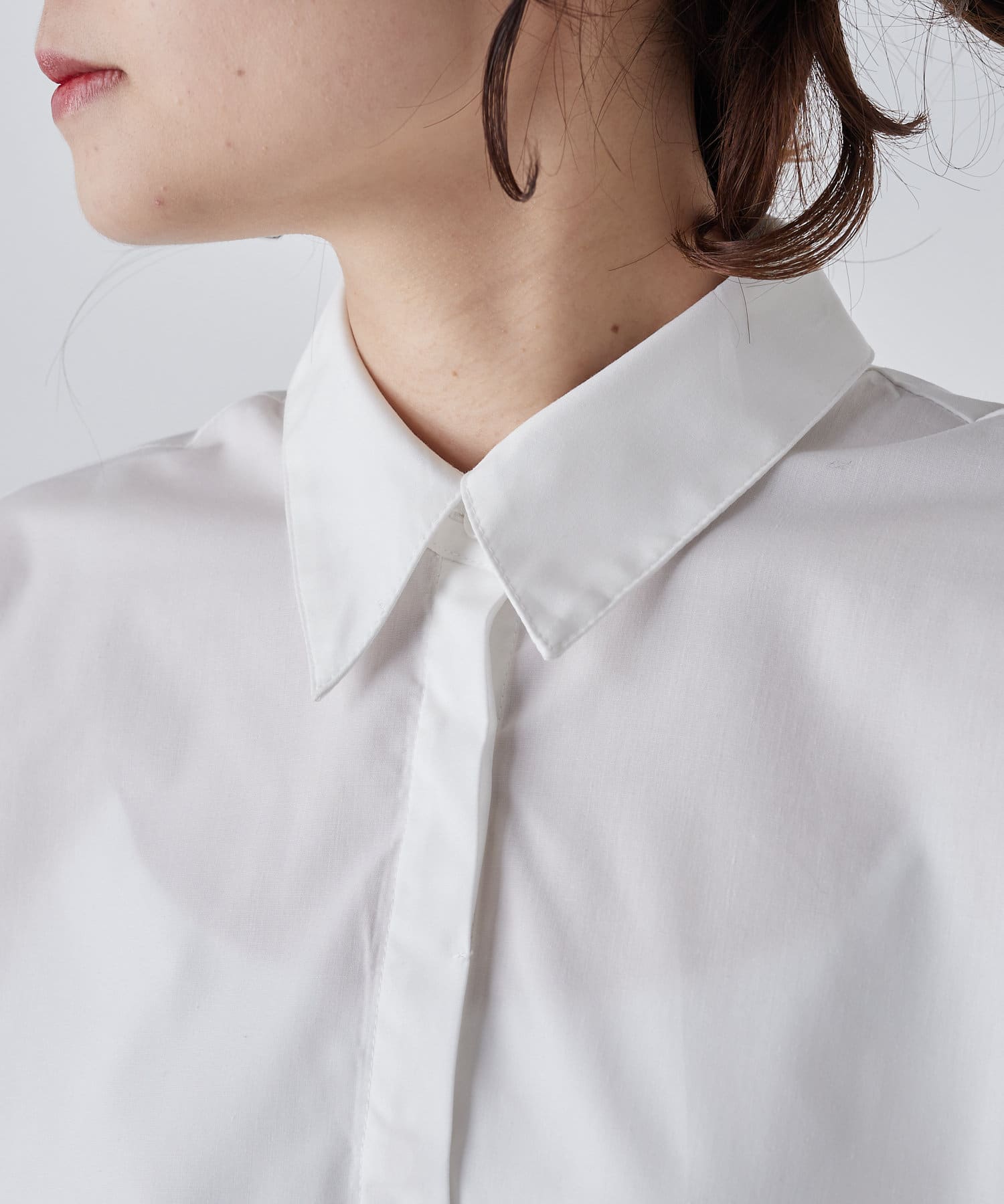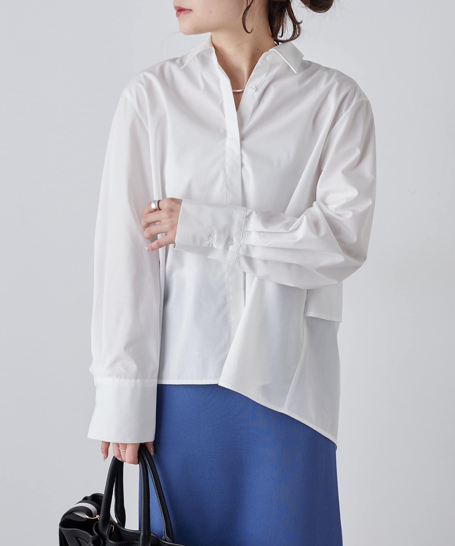 フロントは比翼デザインでシンプルなシャツ見えデザインにし、コーディネートのしやすさがポイント。