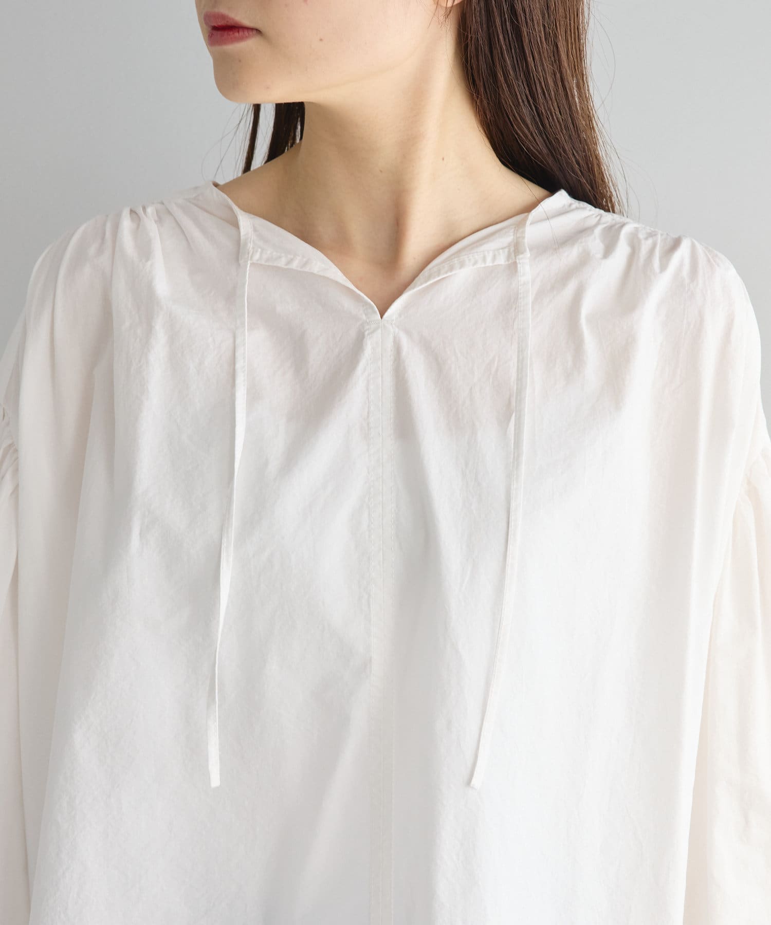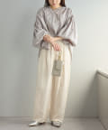 首元に付けた紐はルーズに流すと抜け感のある大人カジュアルスタイルに。