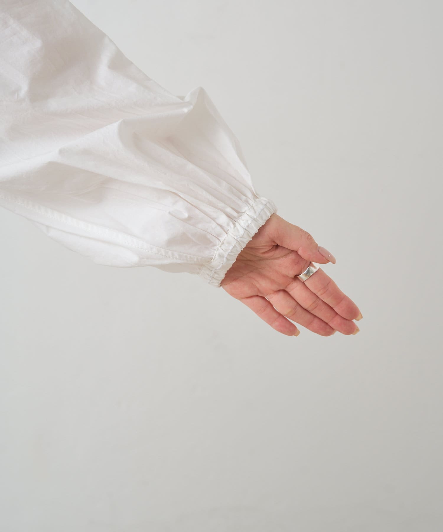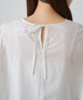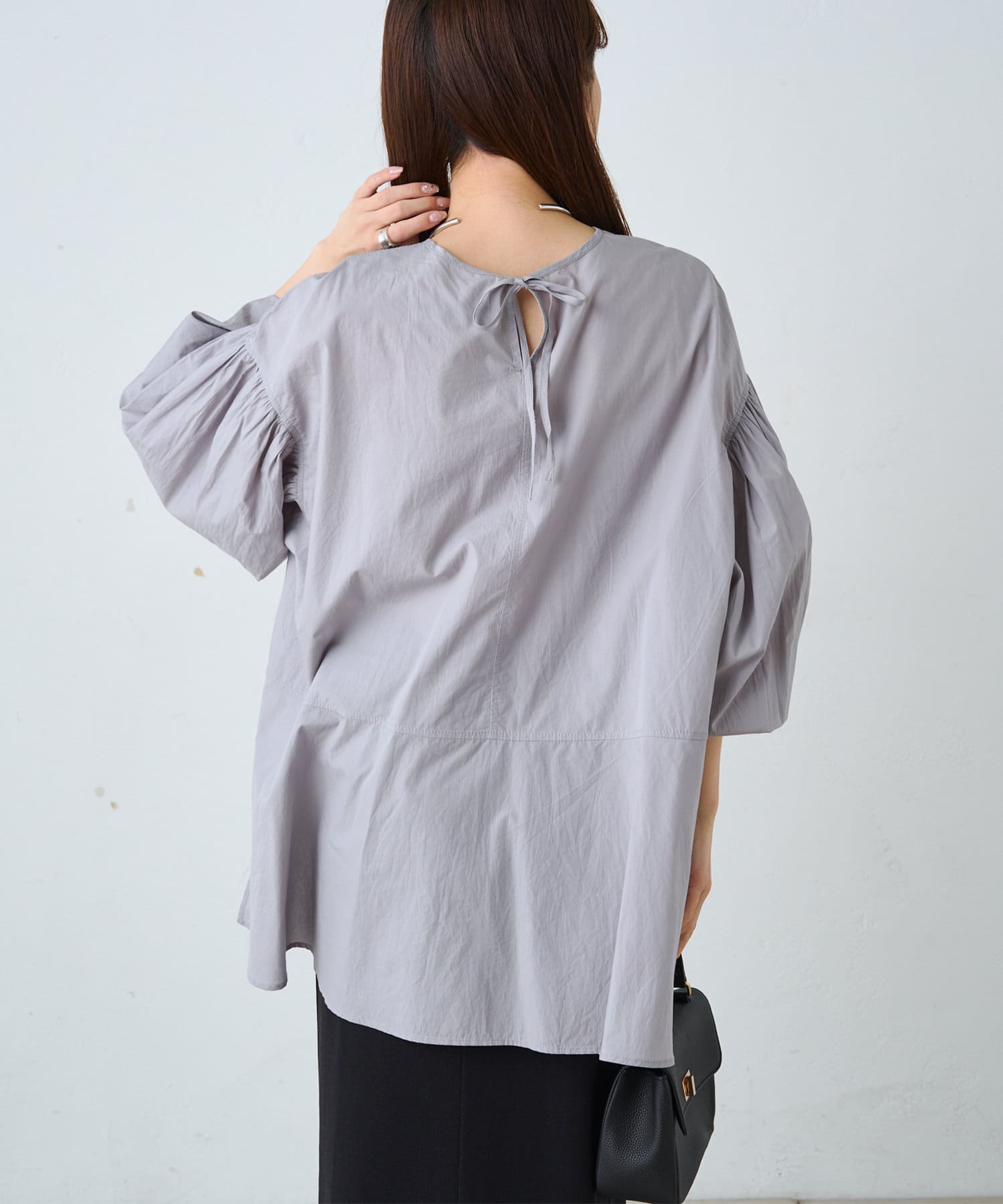 袖口はゴム仕様なので、捲し上げてさらにボリュームをプラスするのもおすすめ。バックの華奢なリボンとさりげないフレアデザインがアクセントになっています。