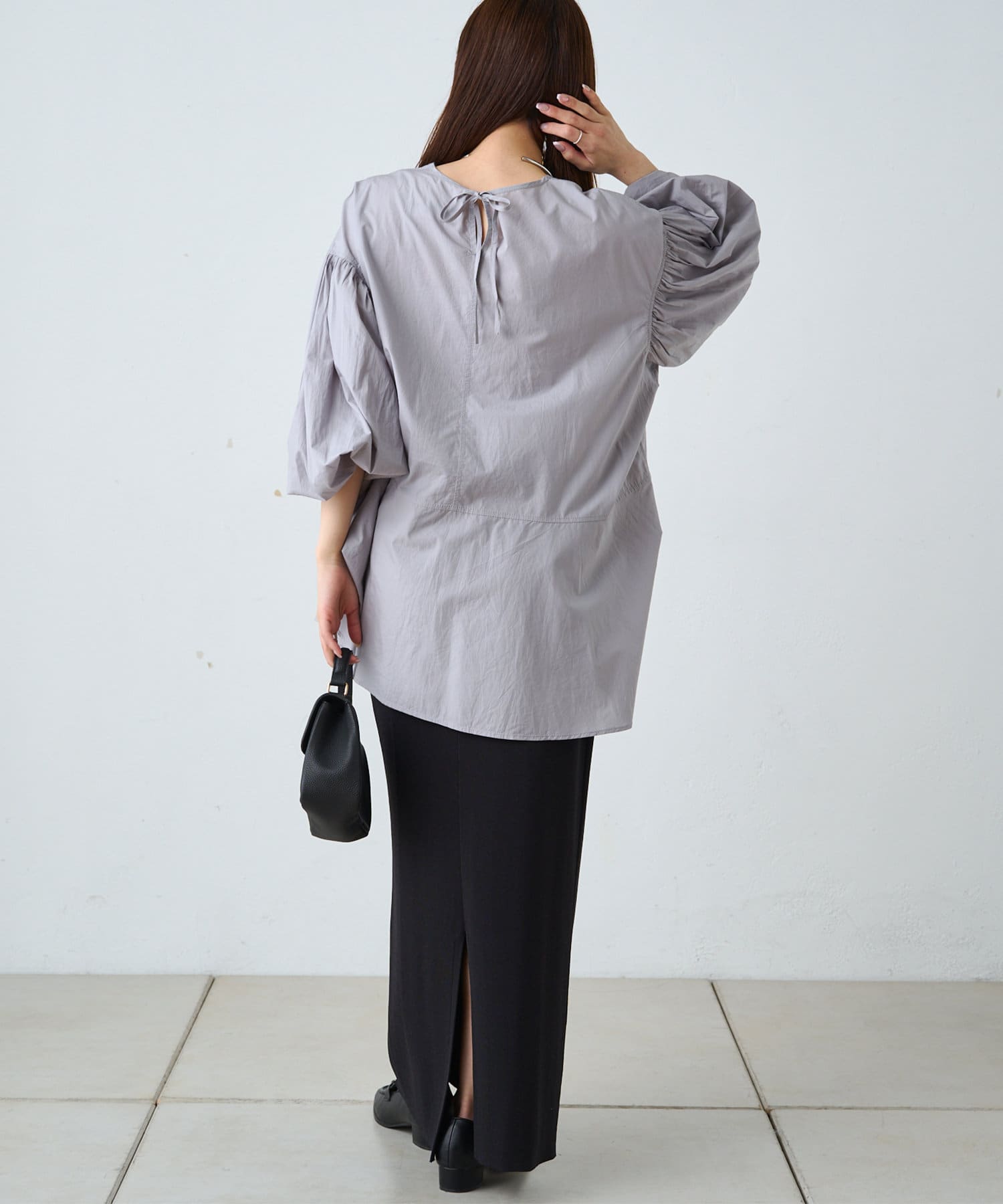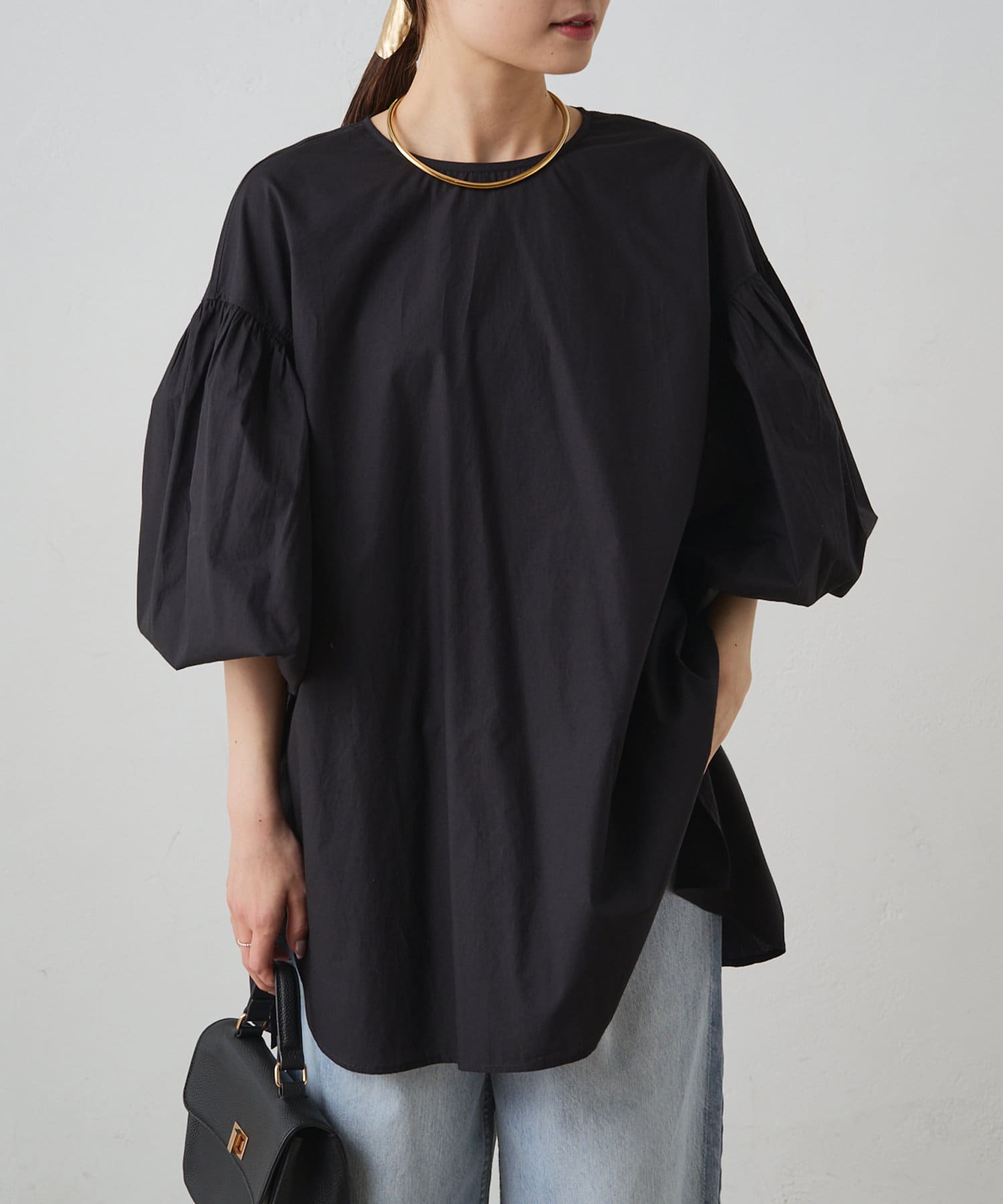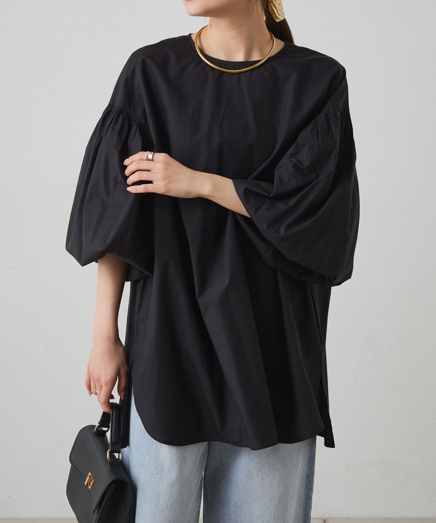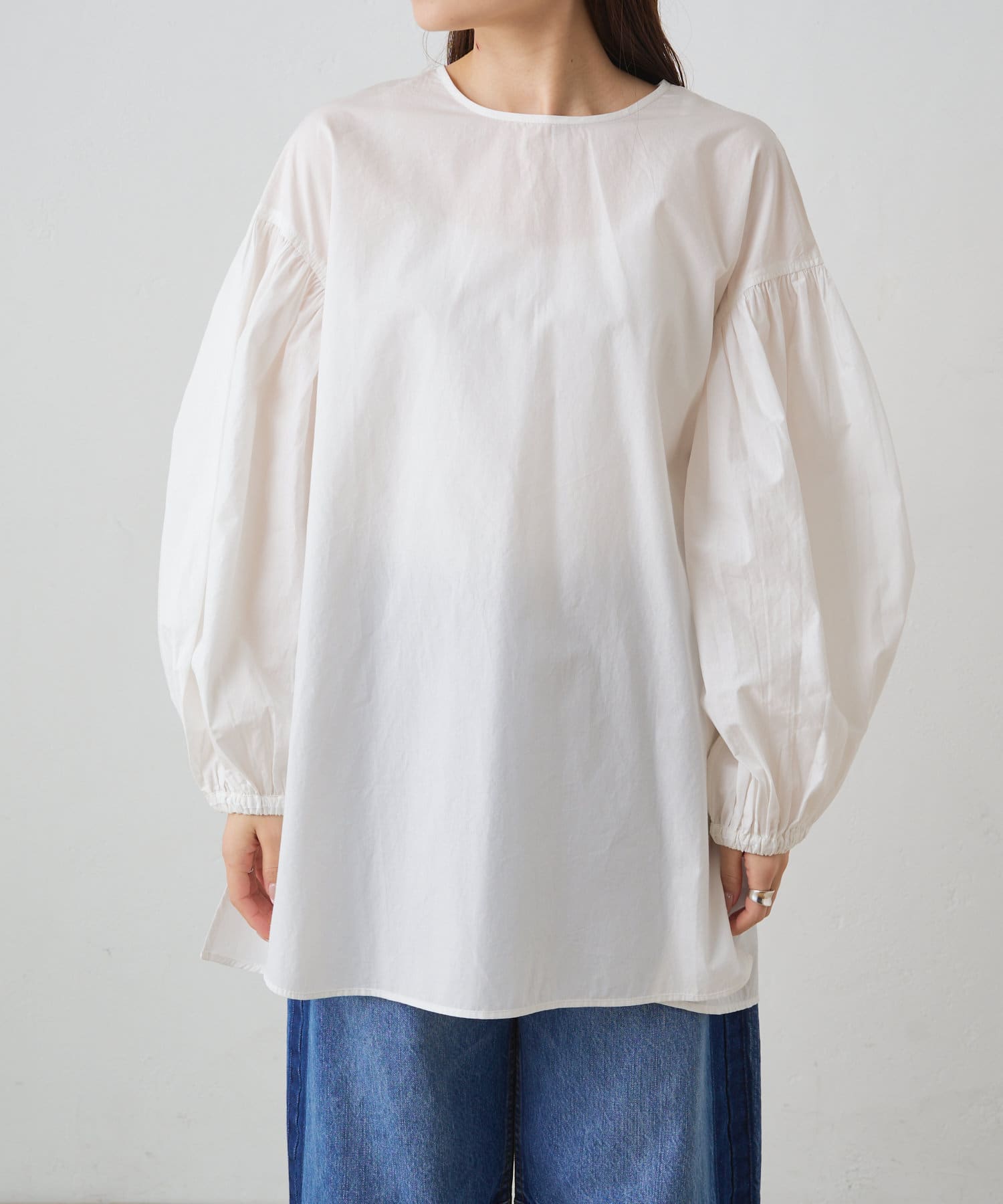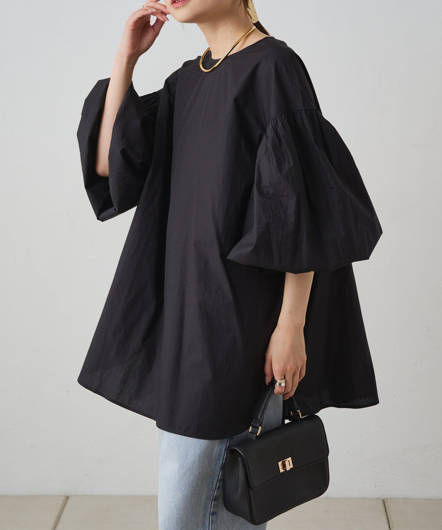 ボリュームスリーブが目を惹くチュニックブラウス。