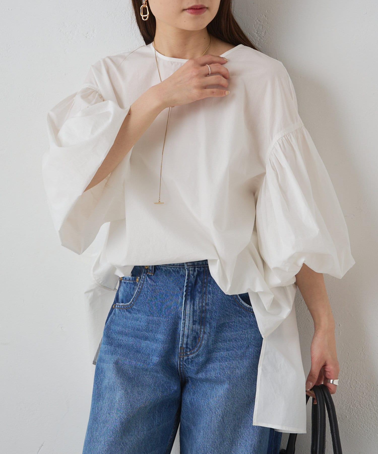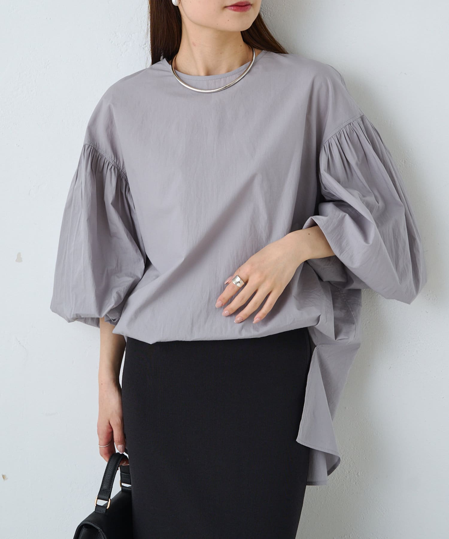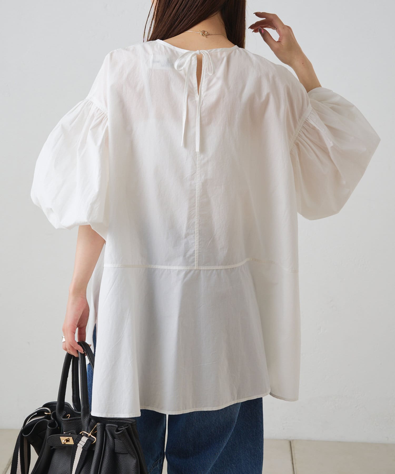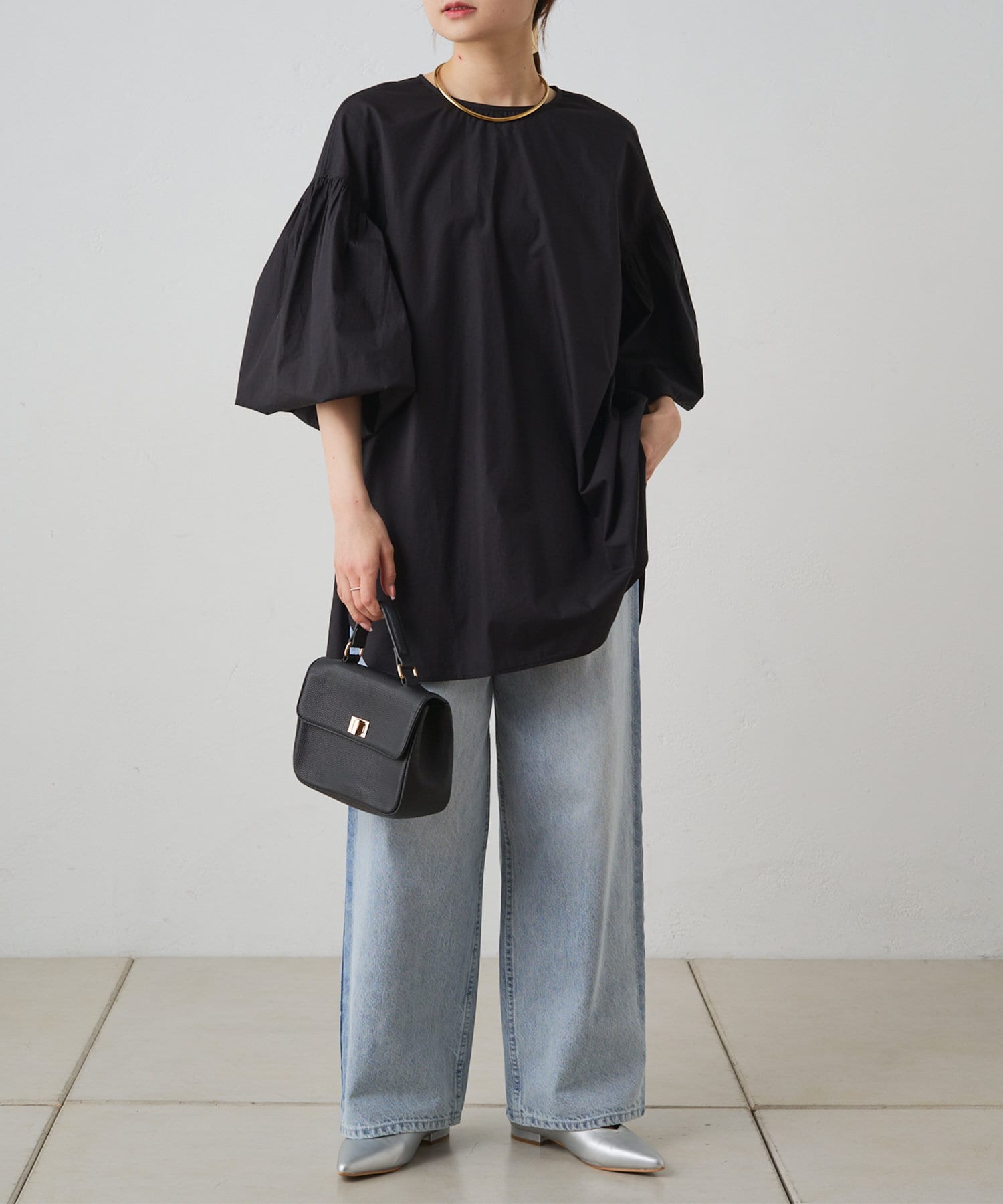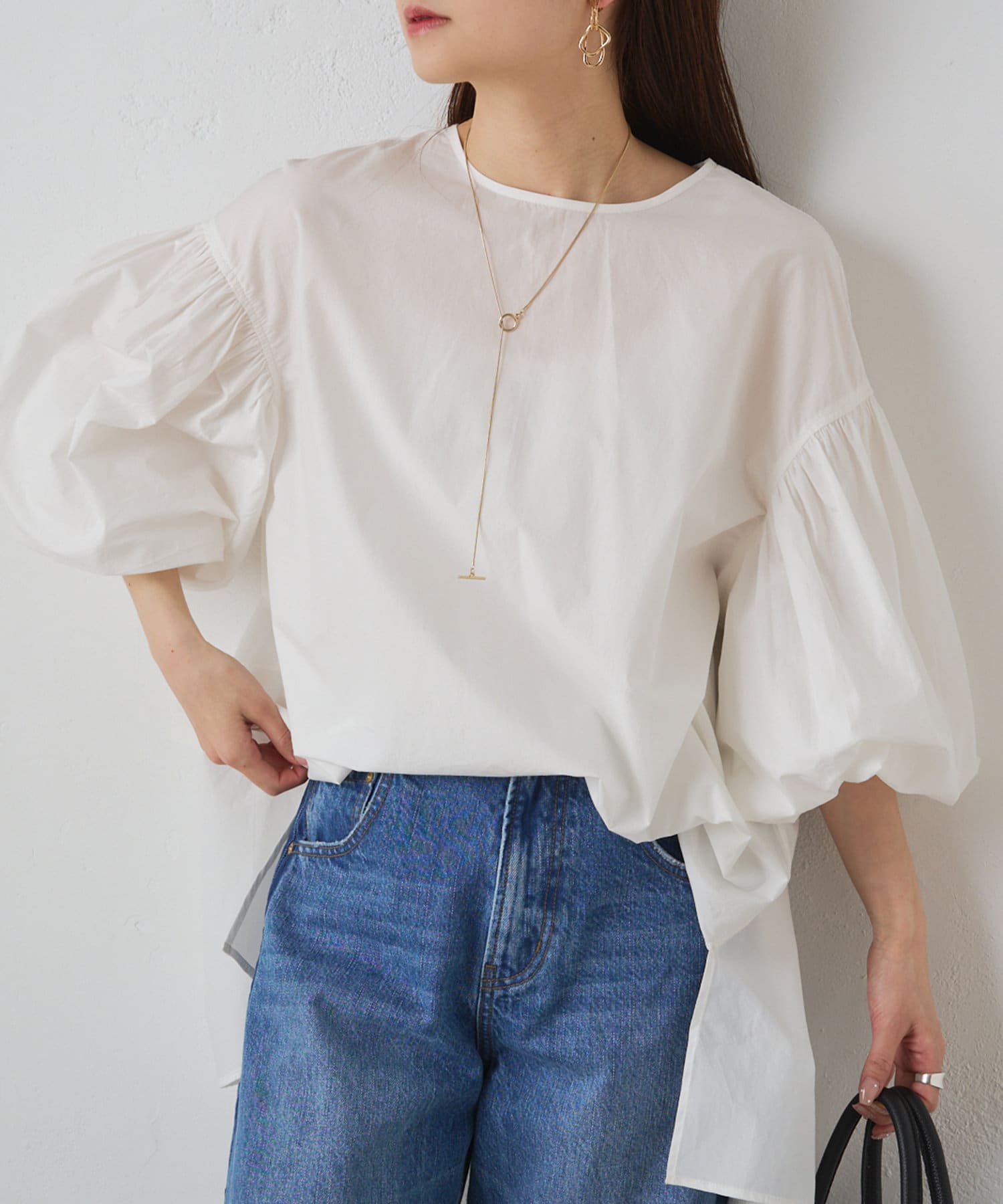 ボリュームスリーブが目を惹くチュニックブラウス。