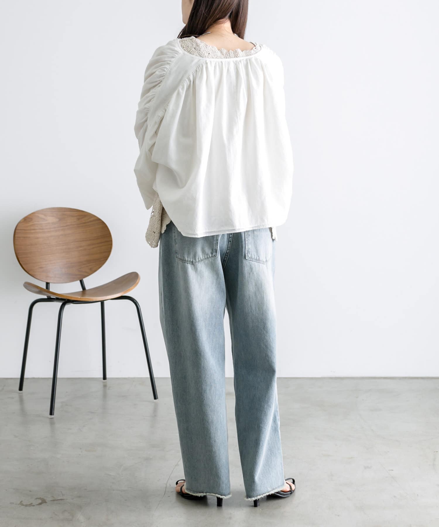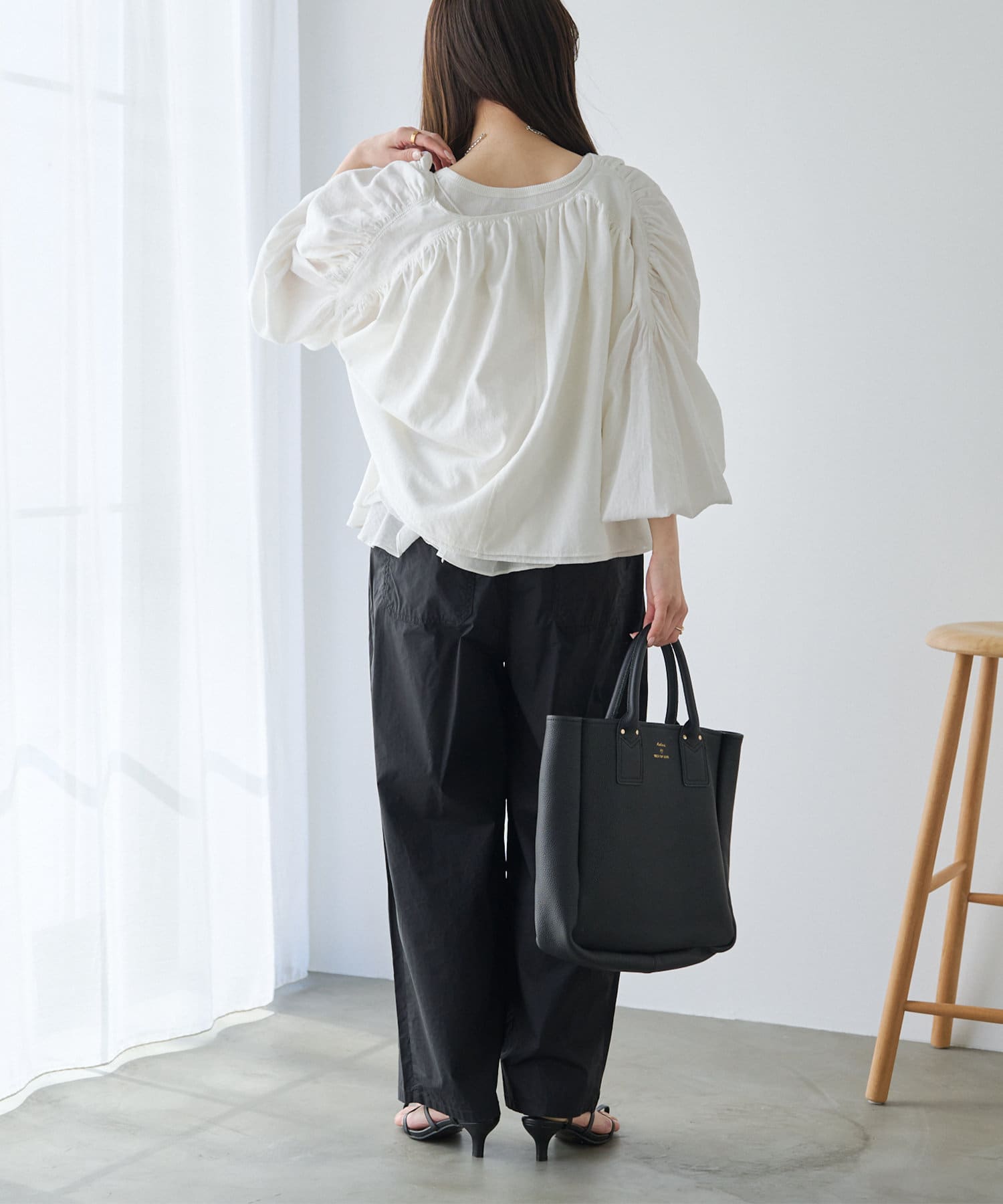 甘さのあるギャザーブラウスは、カジュアル見えのデニムパンツやカーゴ系のボトムスとの合わせが、バランスのよいコーデへの近道。