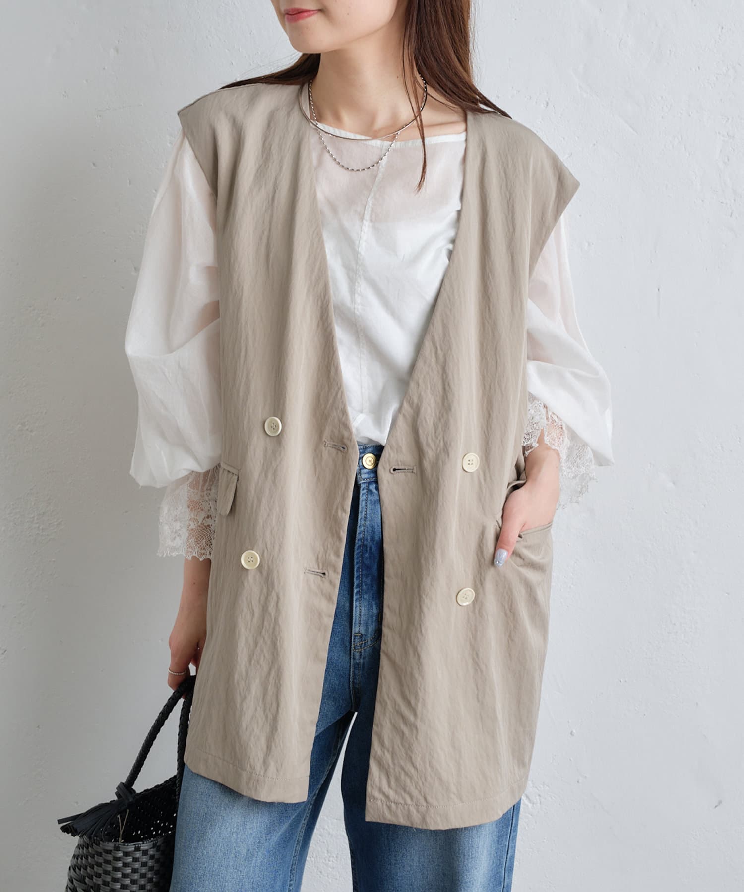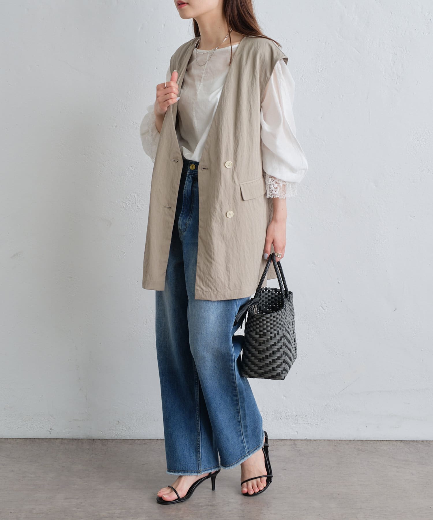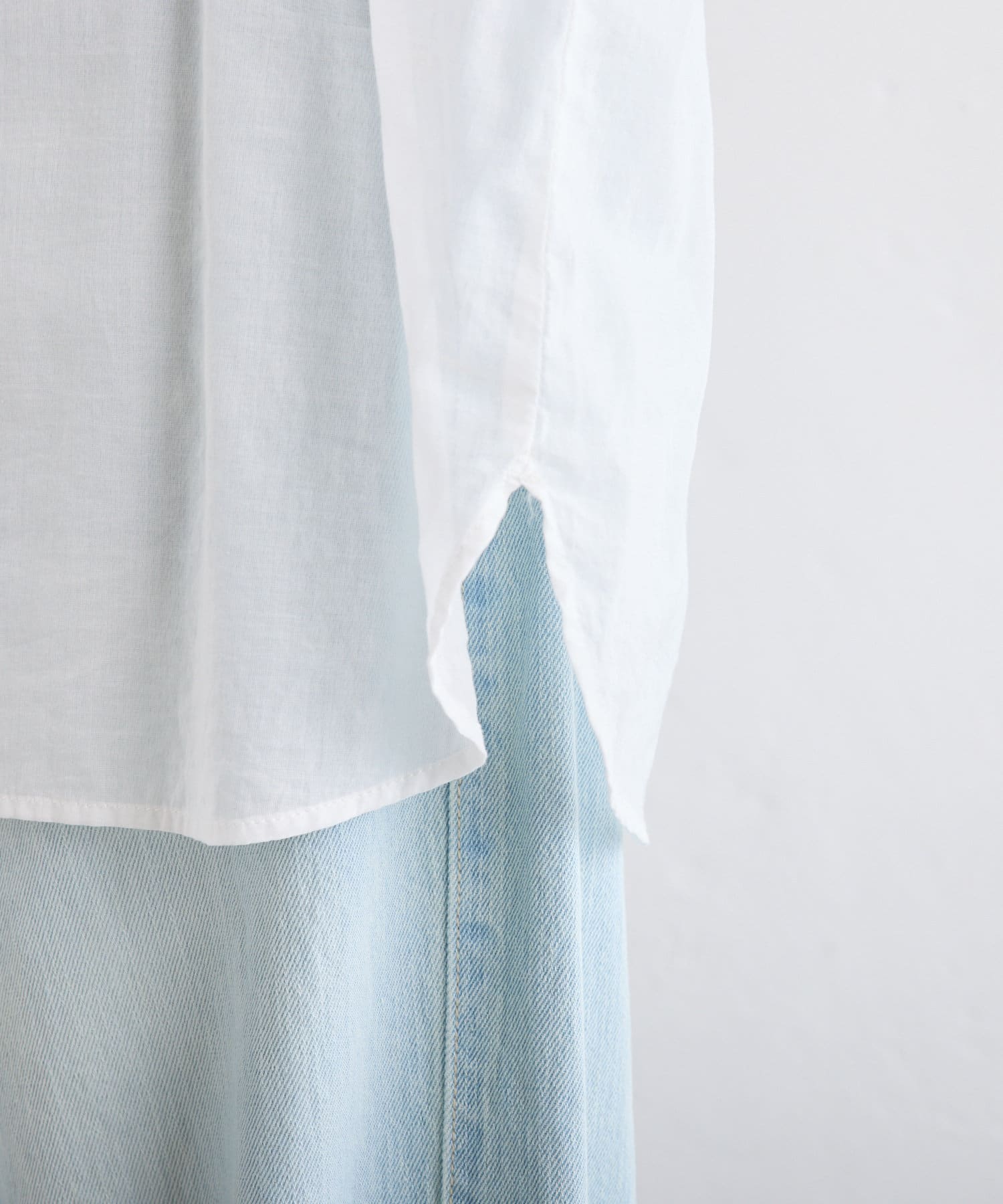 ヒップが隠れる着丈なのでボトムはスラックスからスカートまで幅広く相性が良いです。