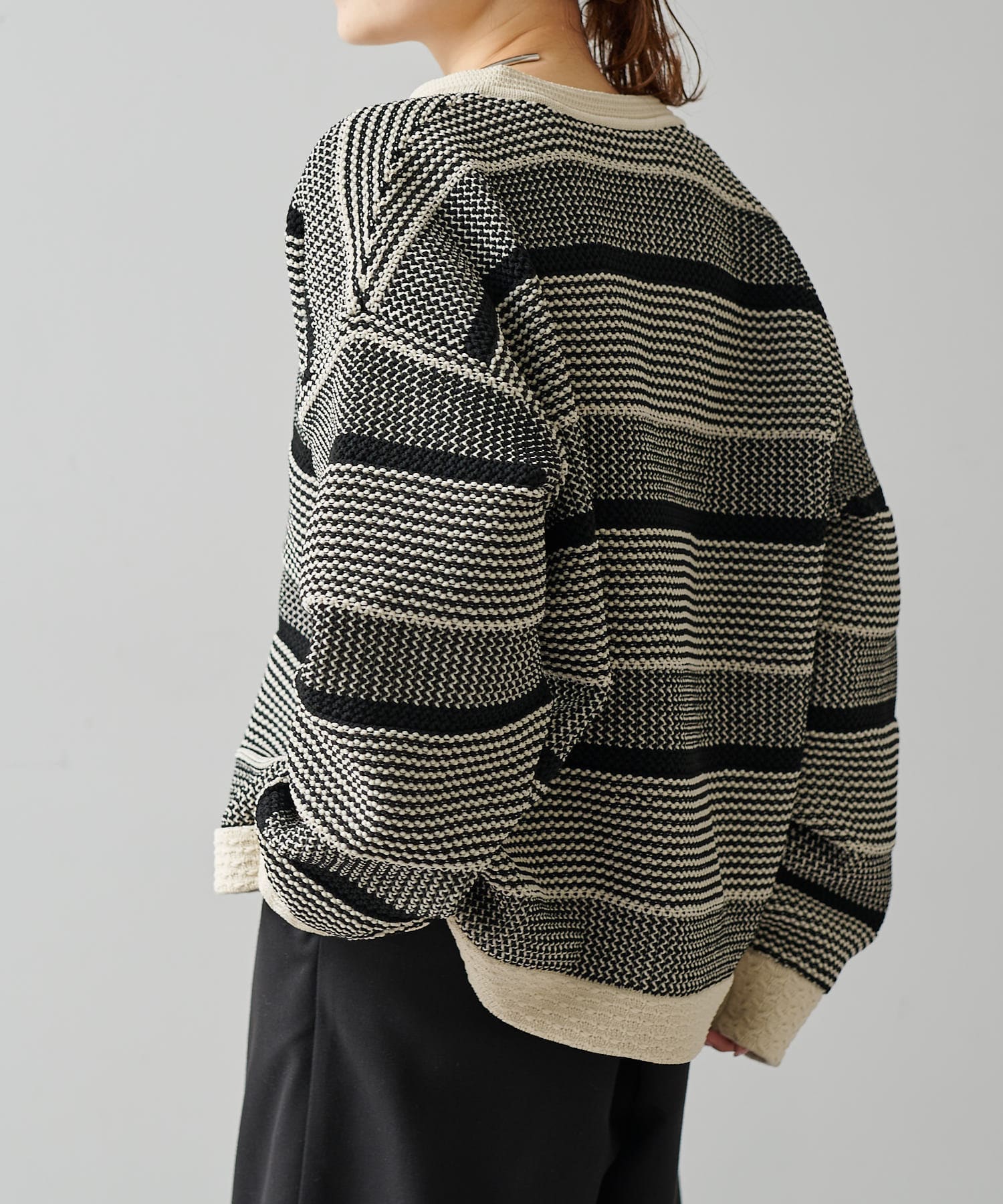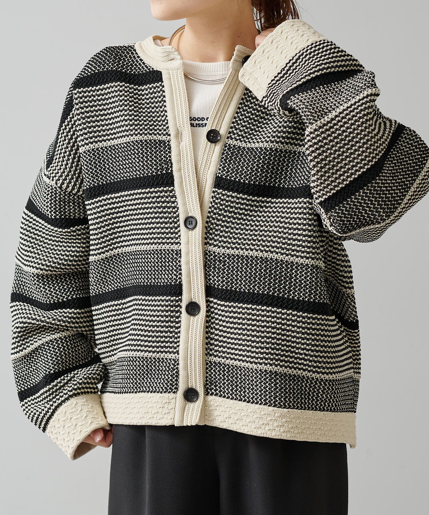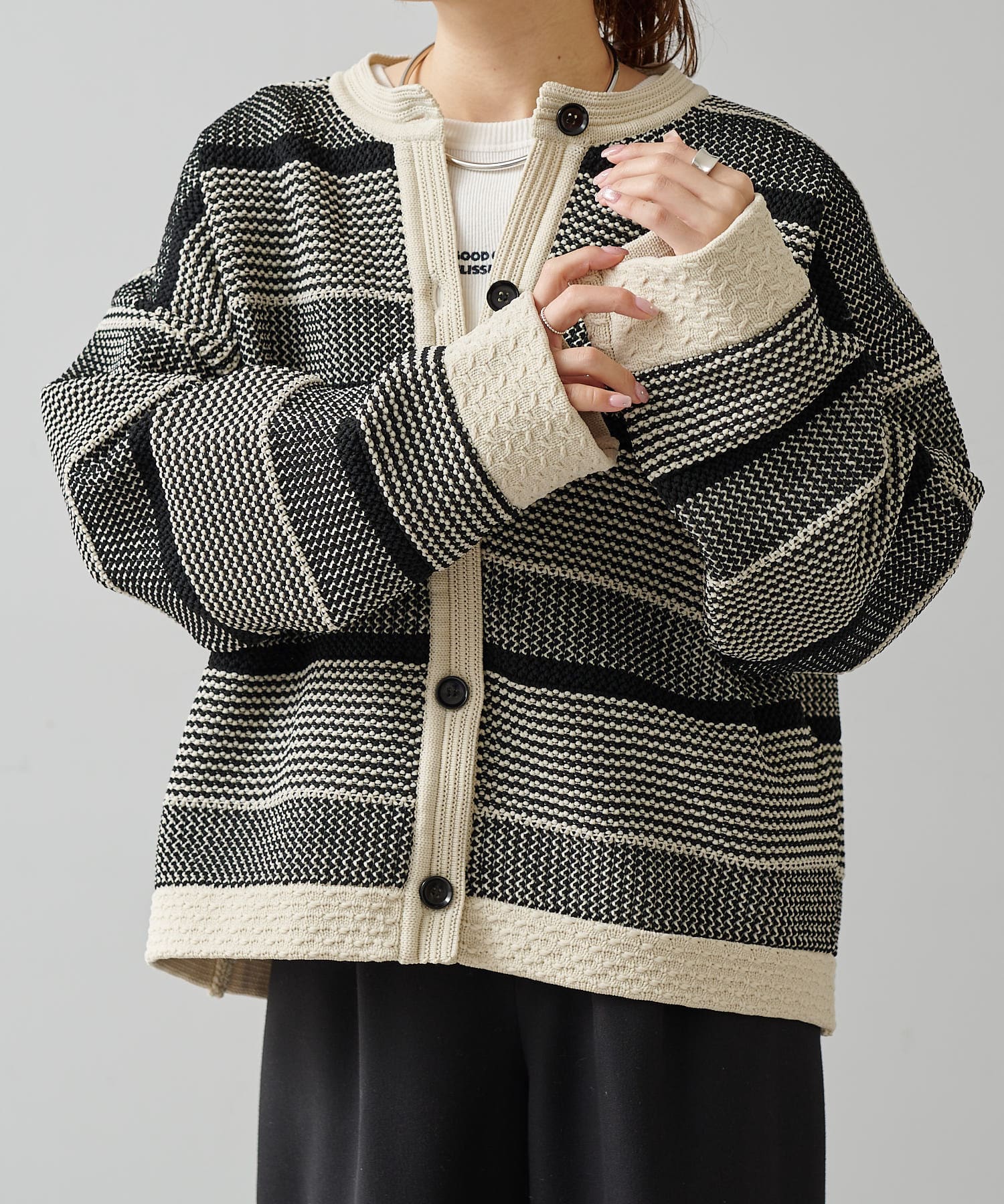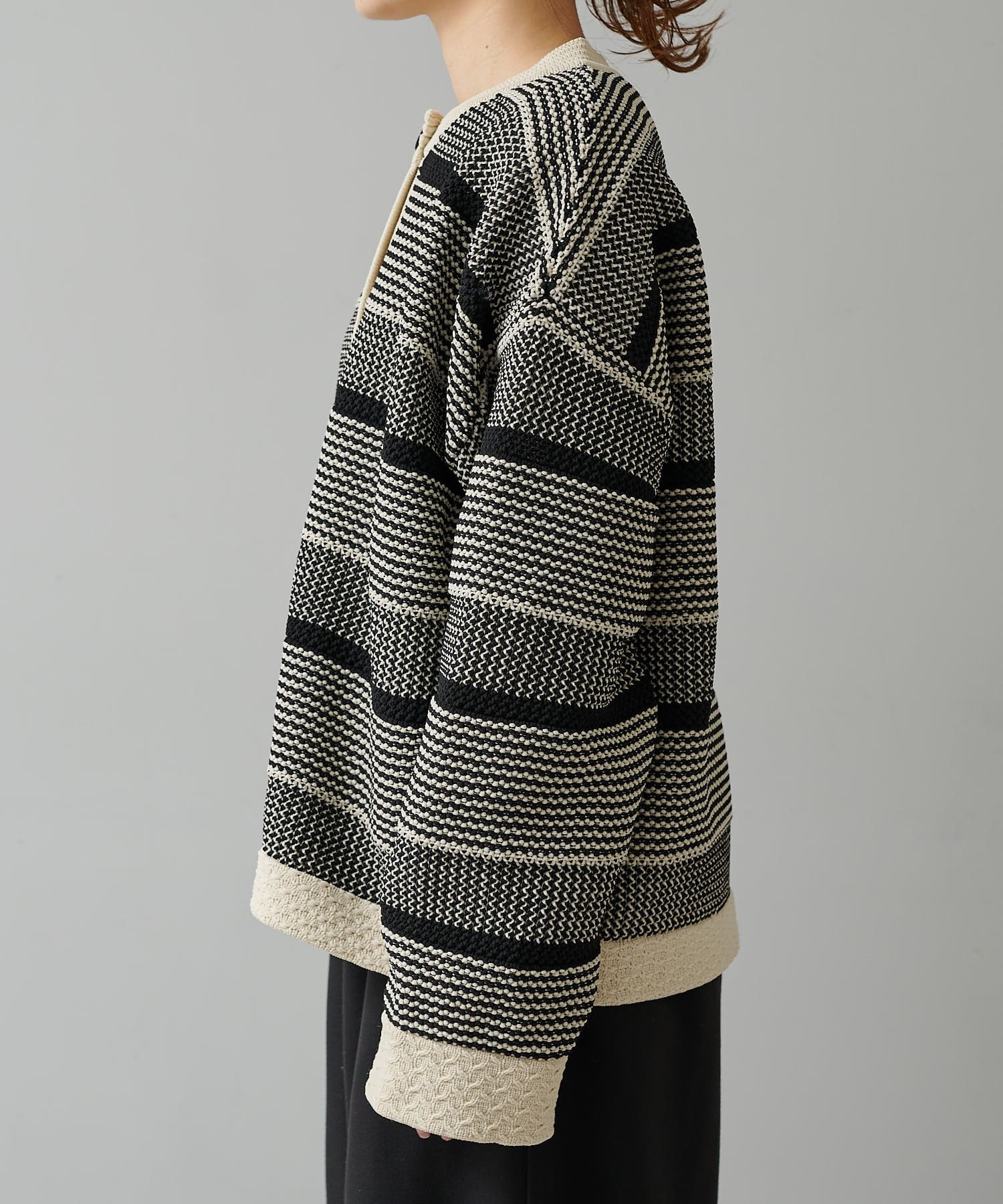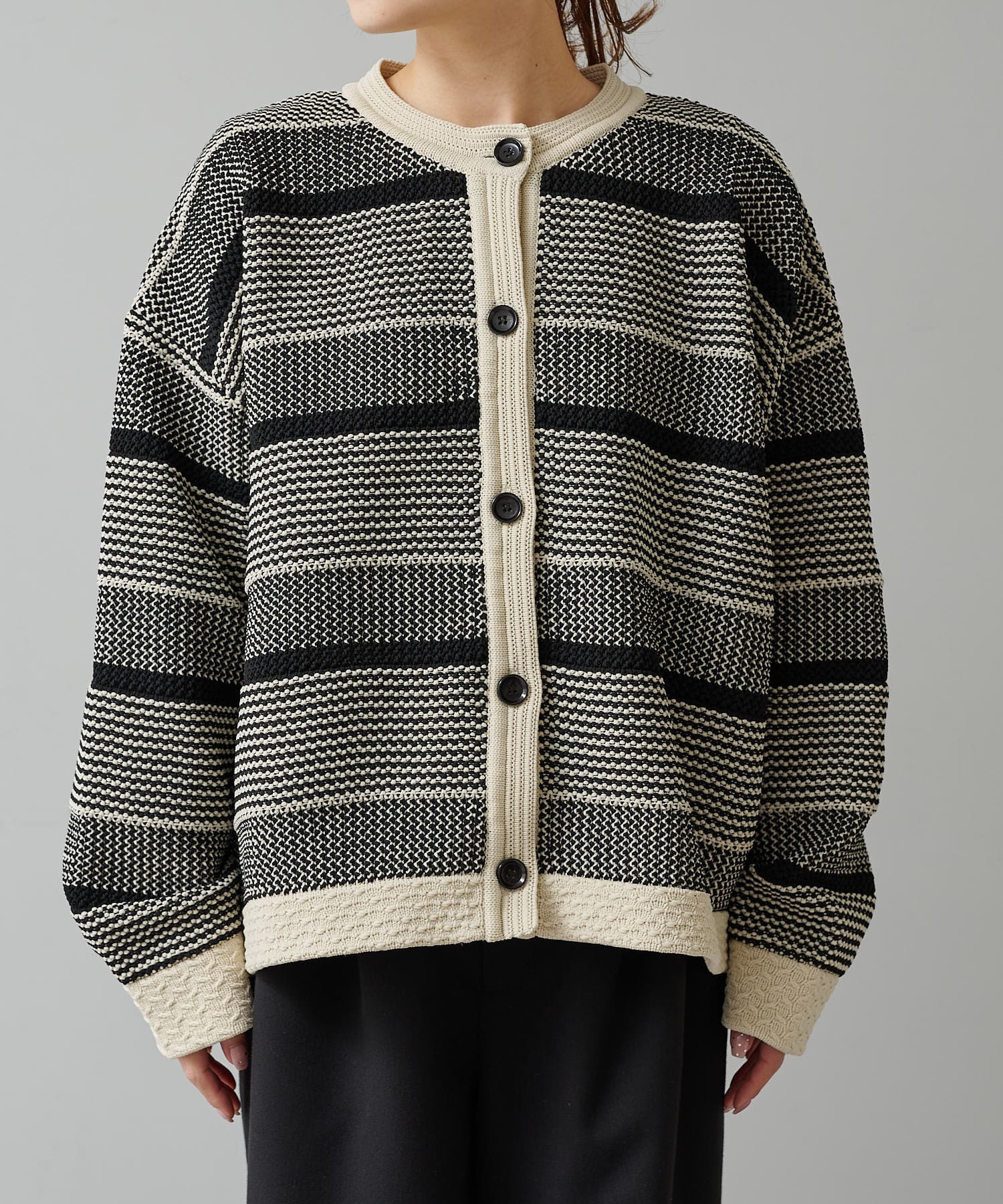 オーバーシルエットに表情豊かなミックスジャガードが存在感抜群なカーディガン。