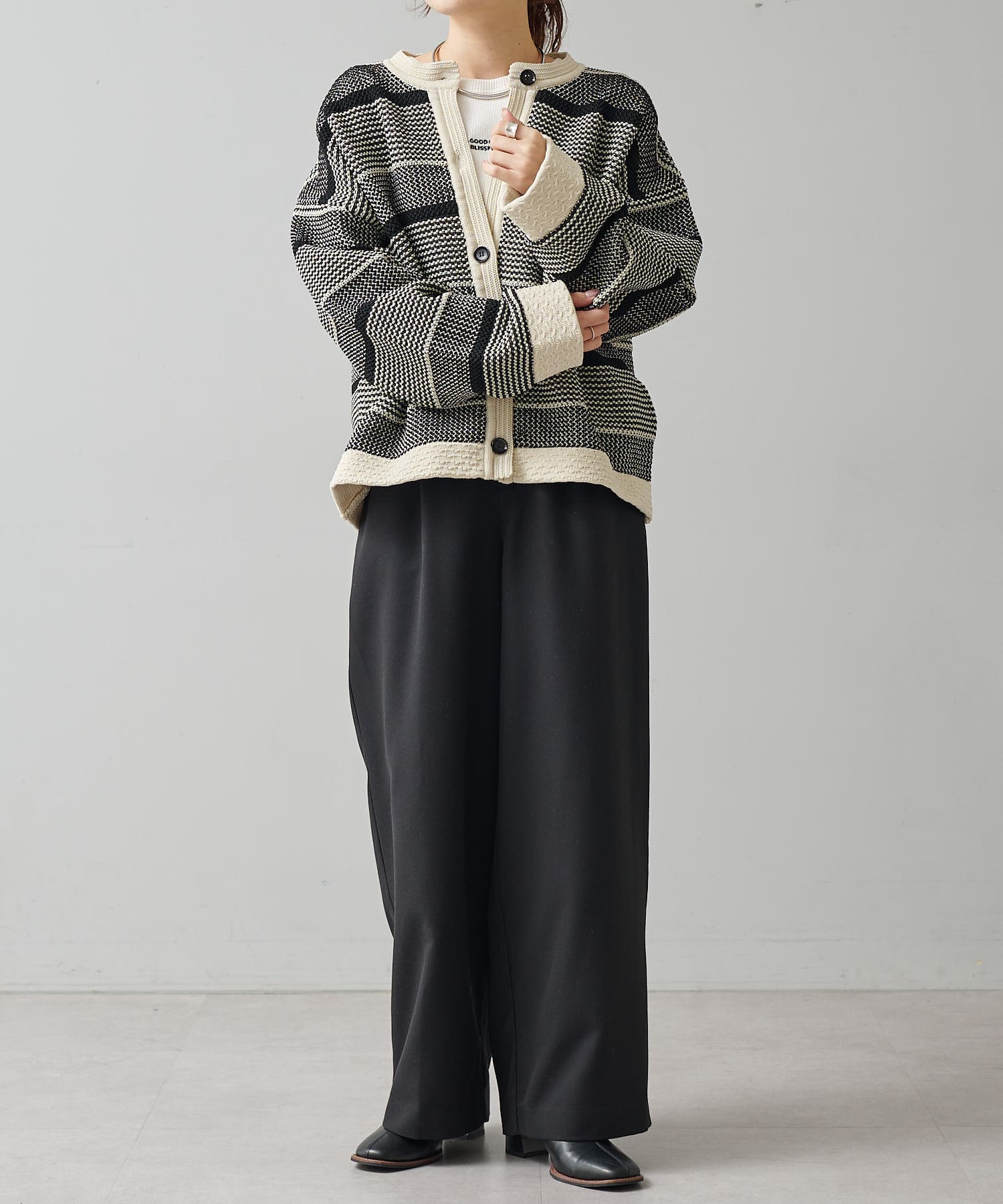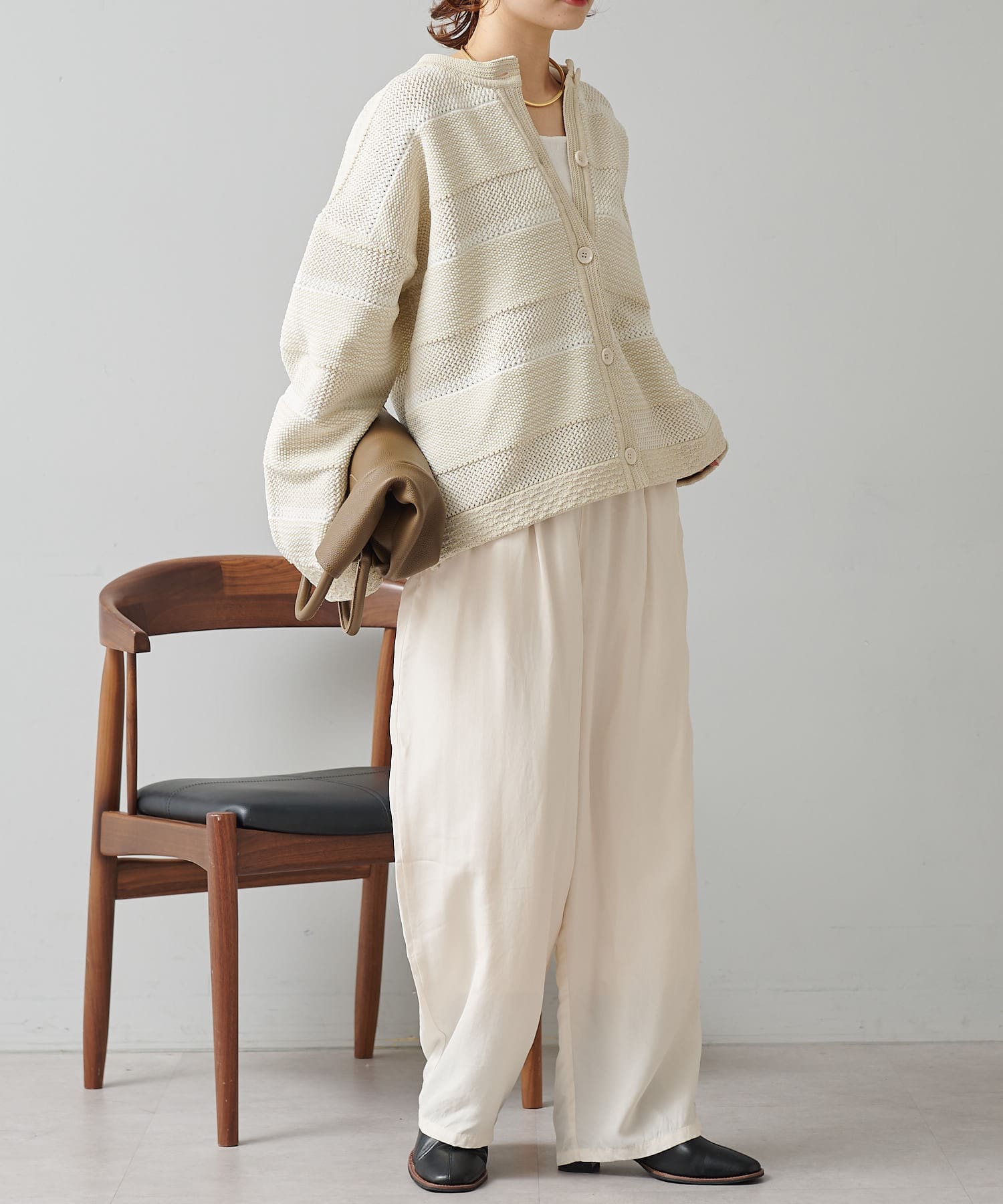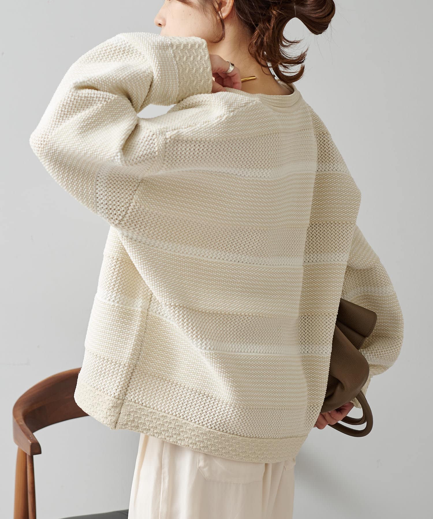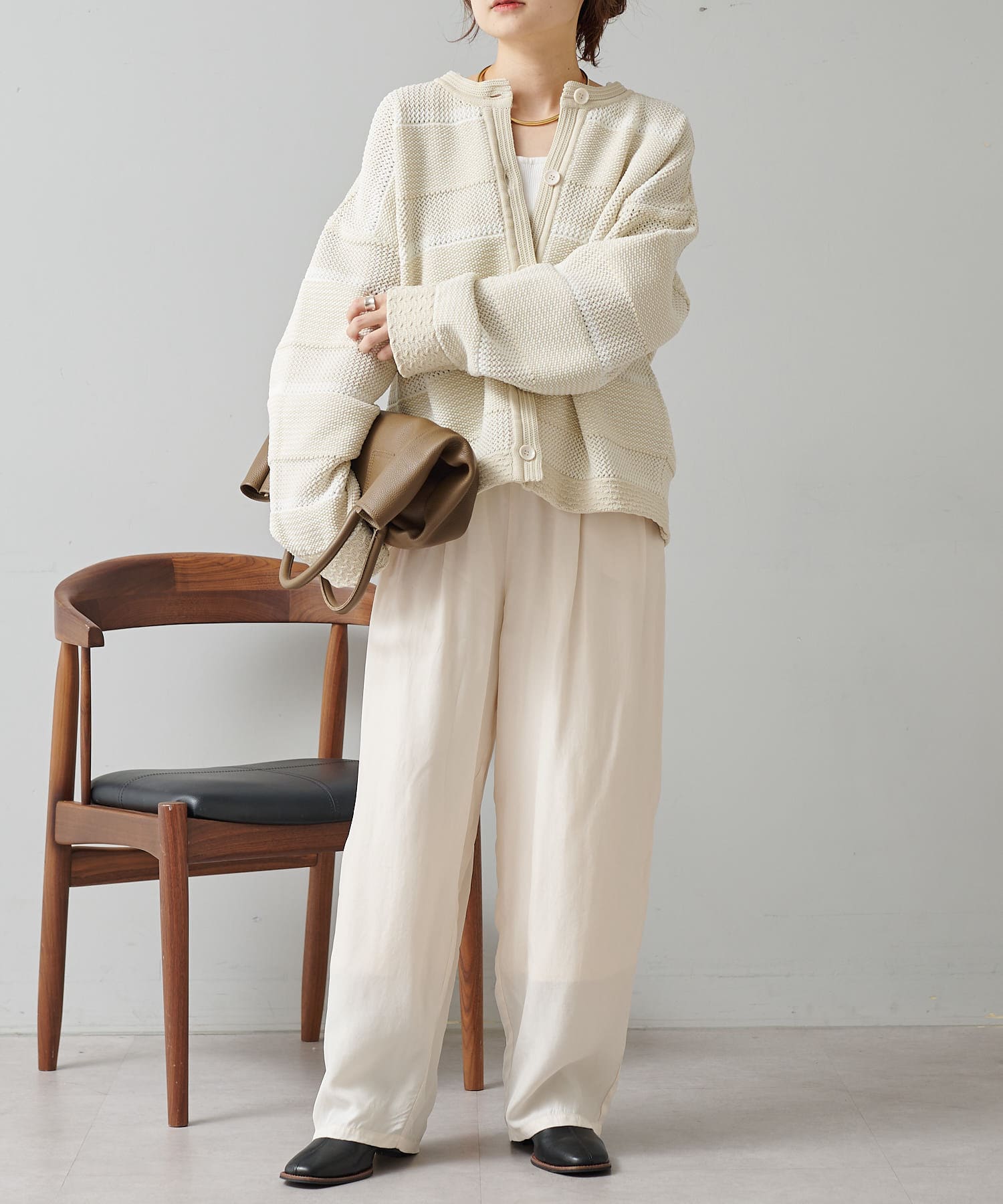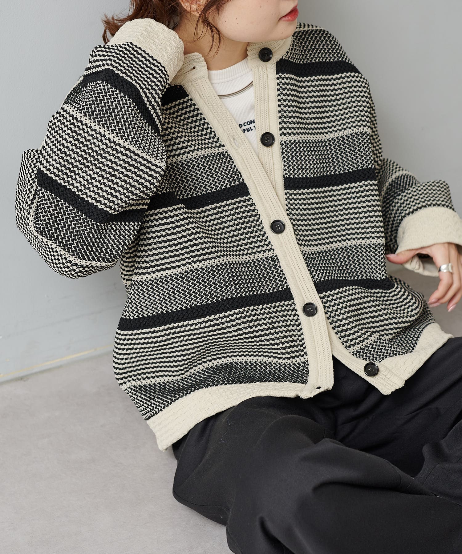 オーバーシルエットに表情豊かなミックスジャガードが存在感抜群なカーディガン。