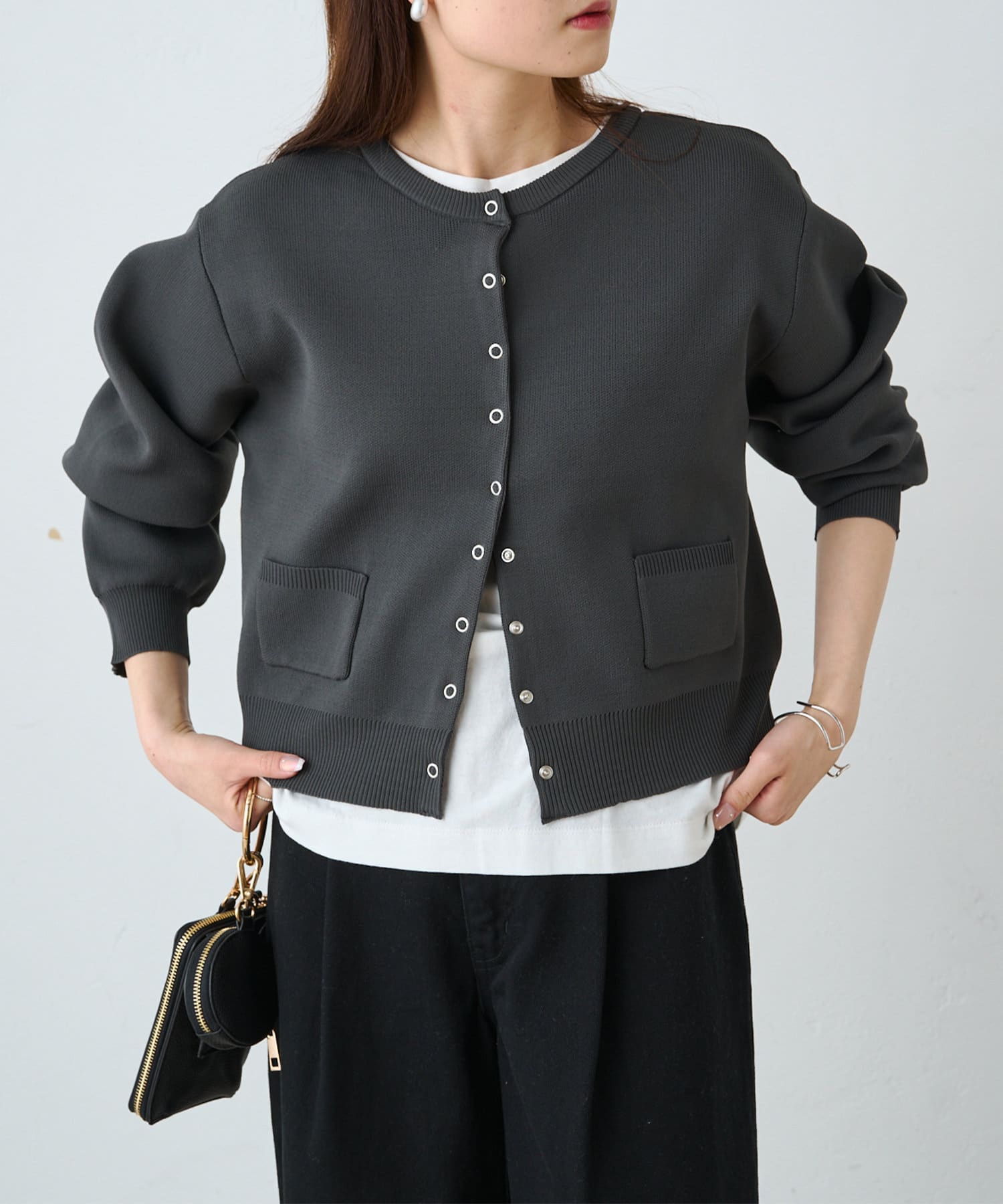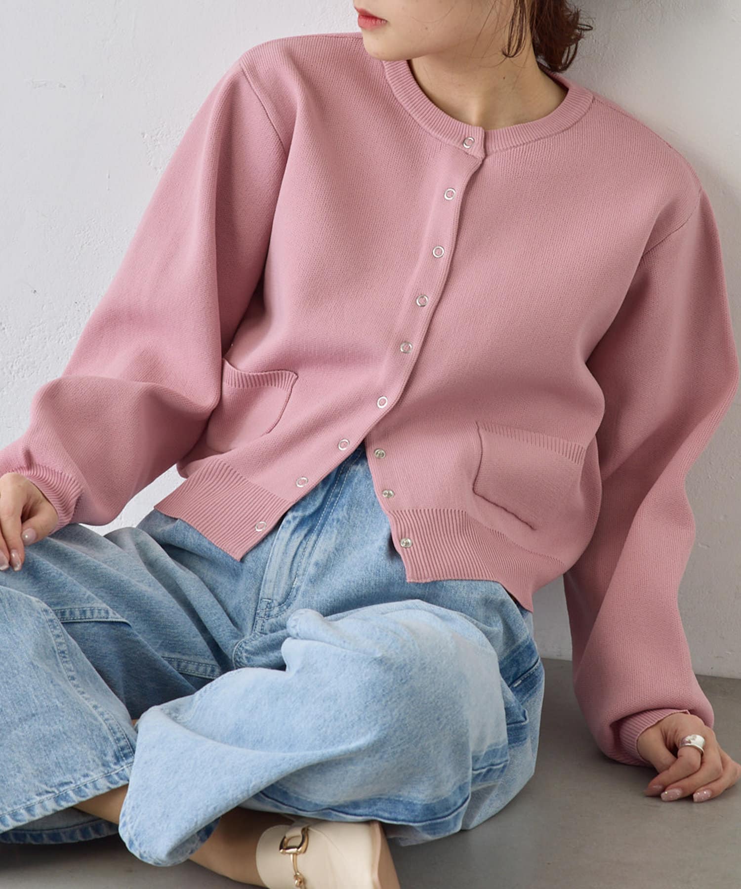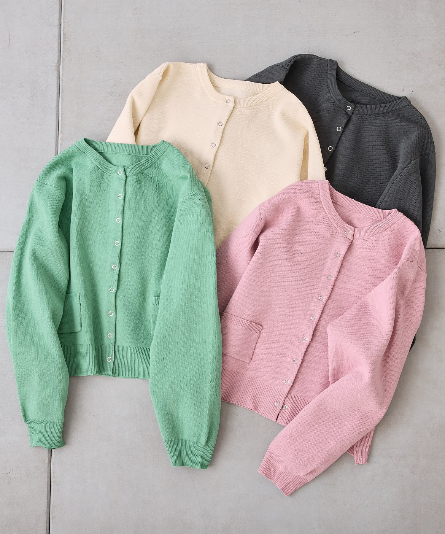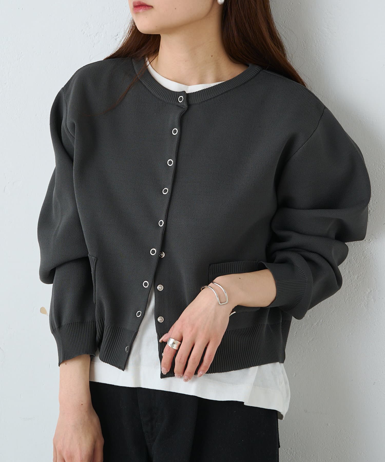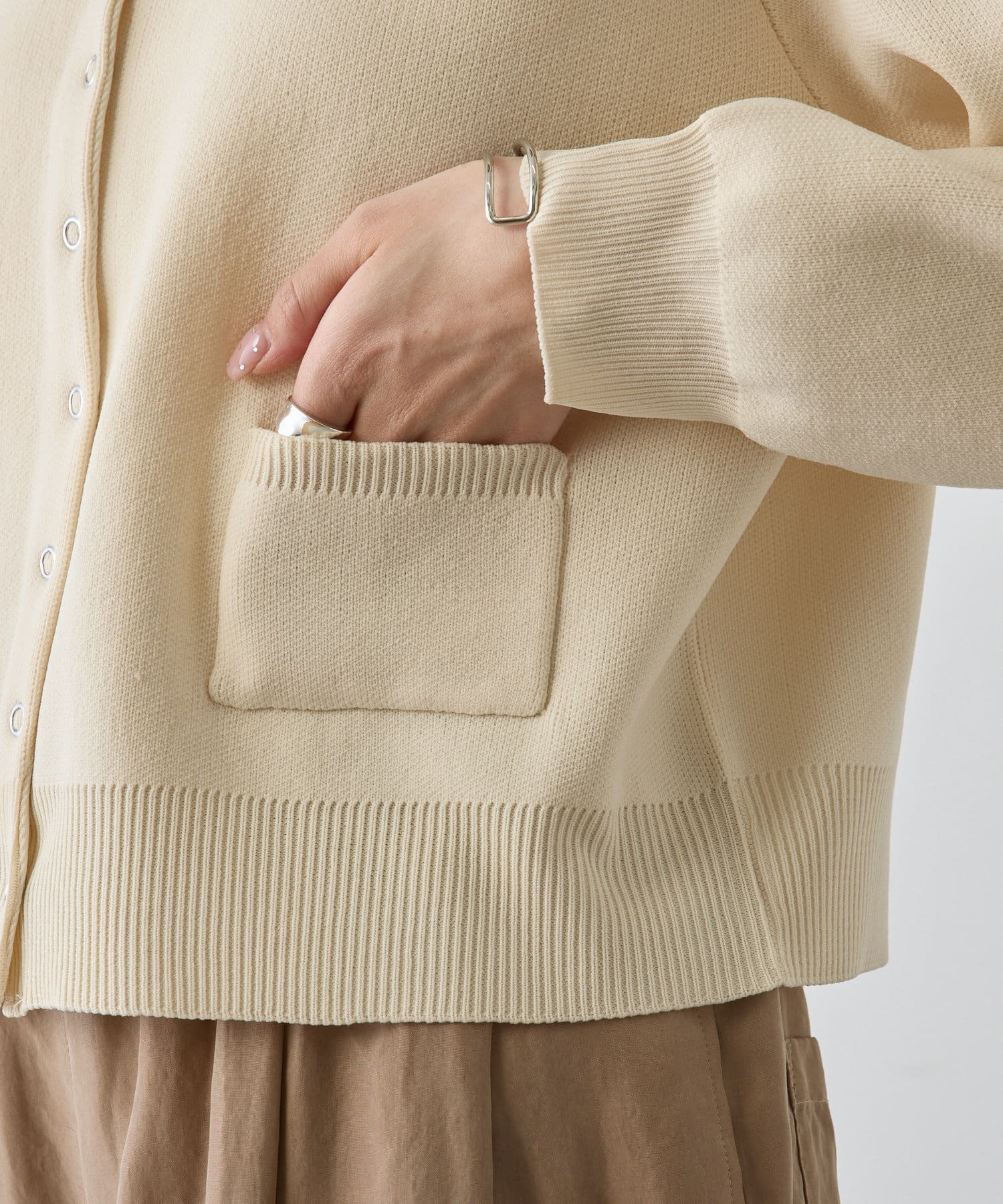 リングドットボタンとミニポケットがさりげないアクセントで目を惹くカーディガン。