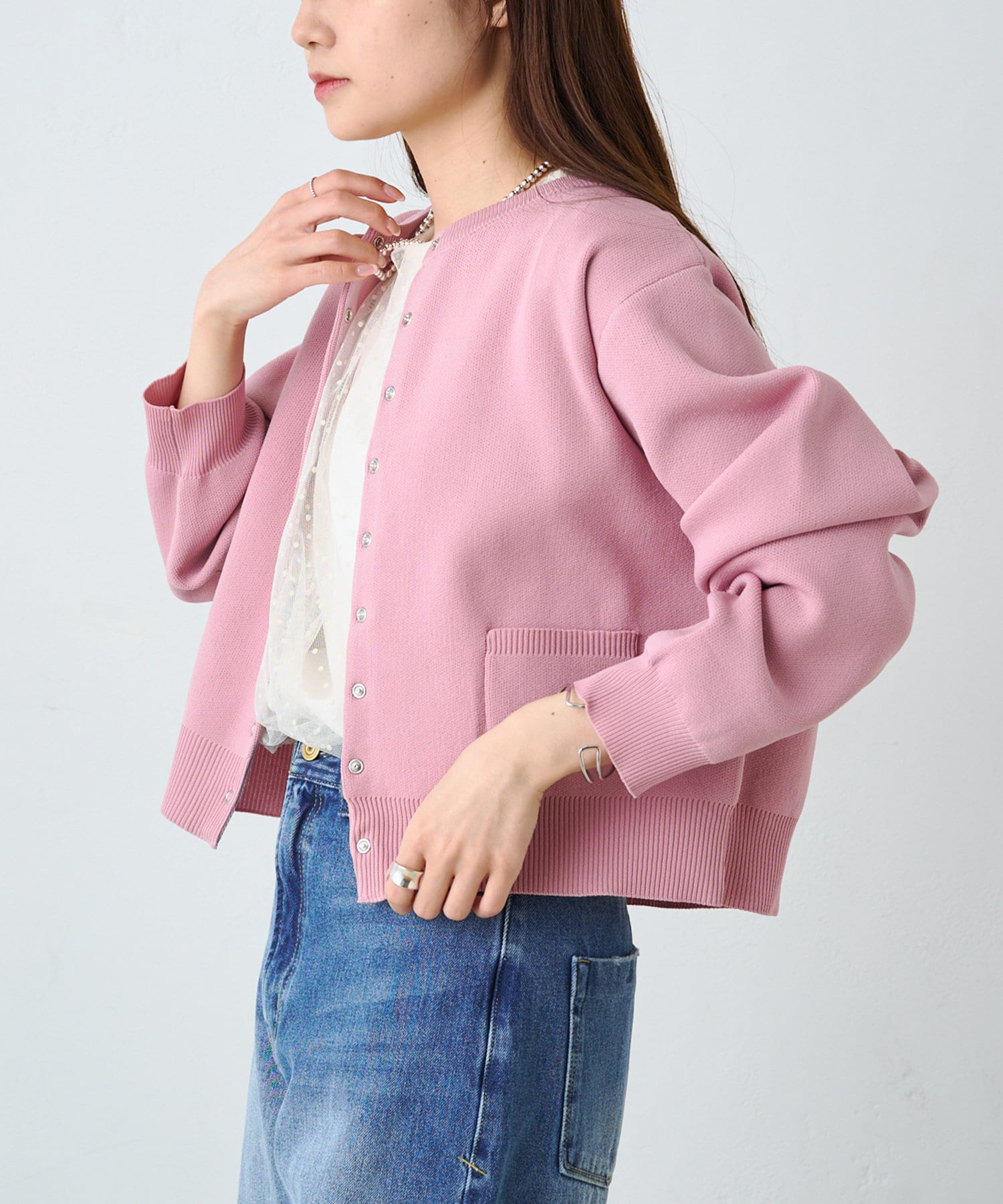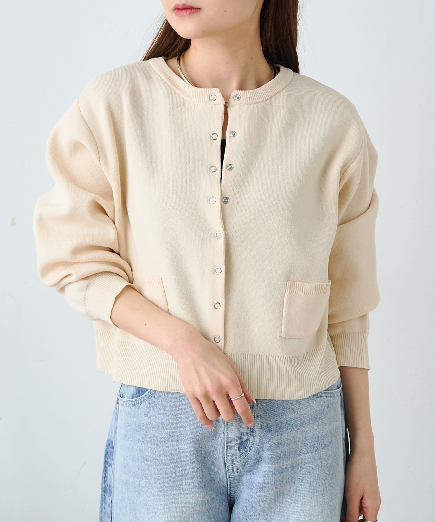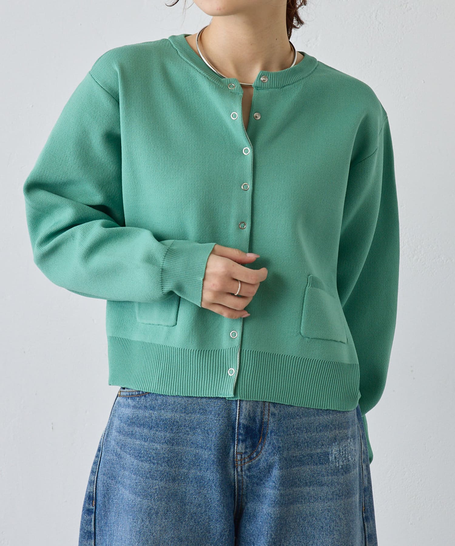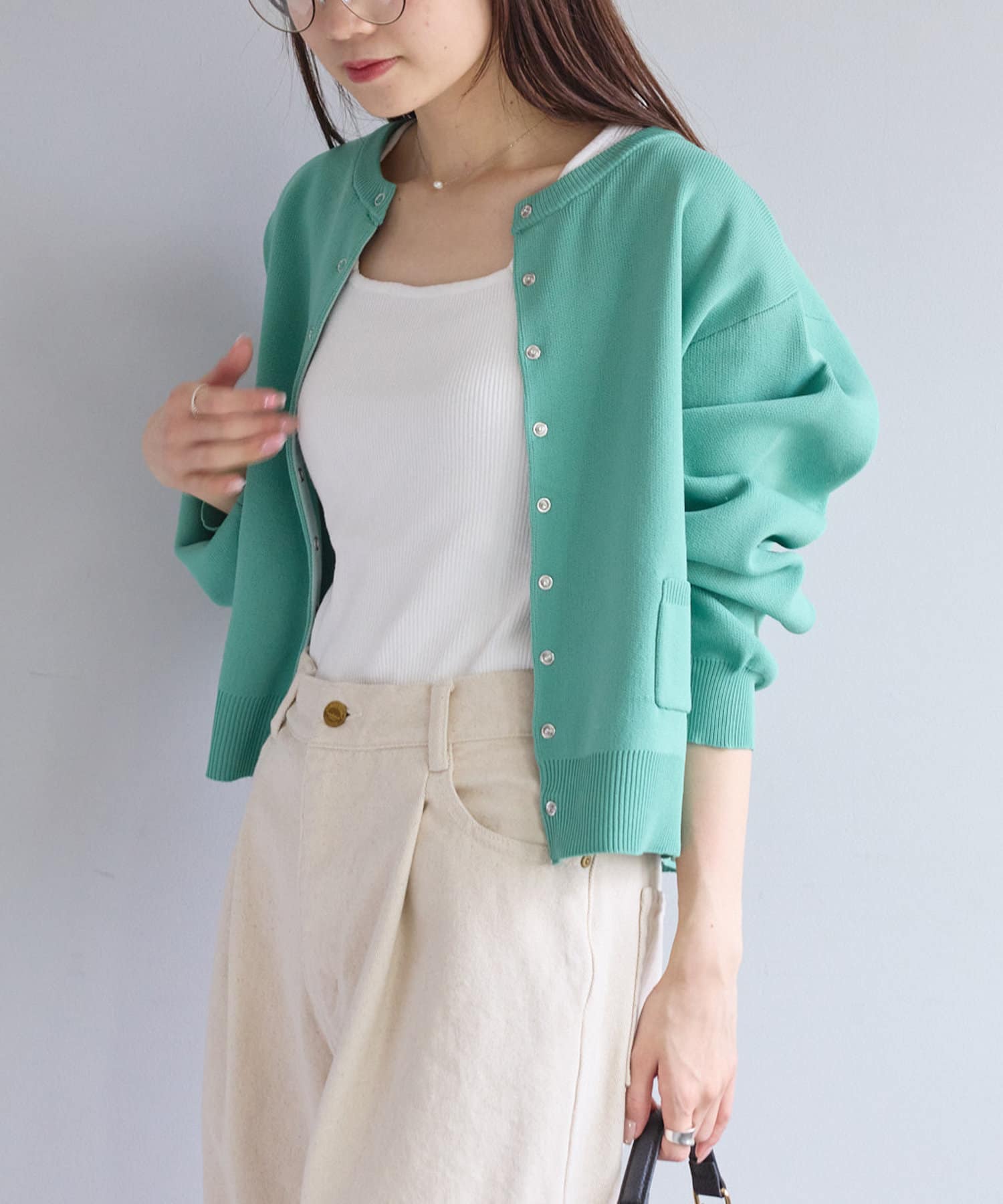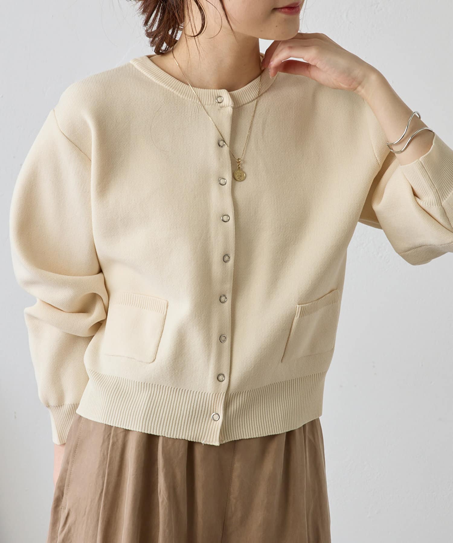 リングドットボタンとミニポケットがさりげないアクセントで目を惹くカーディガン。