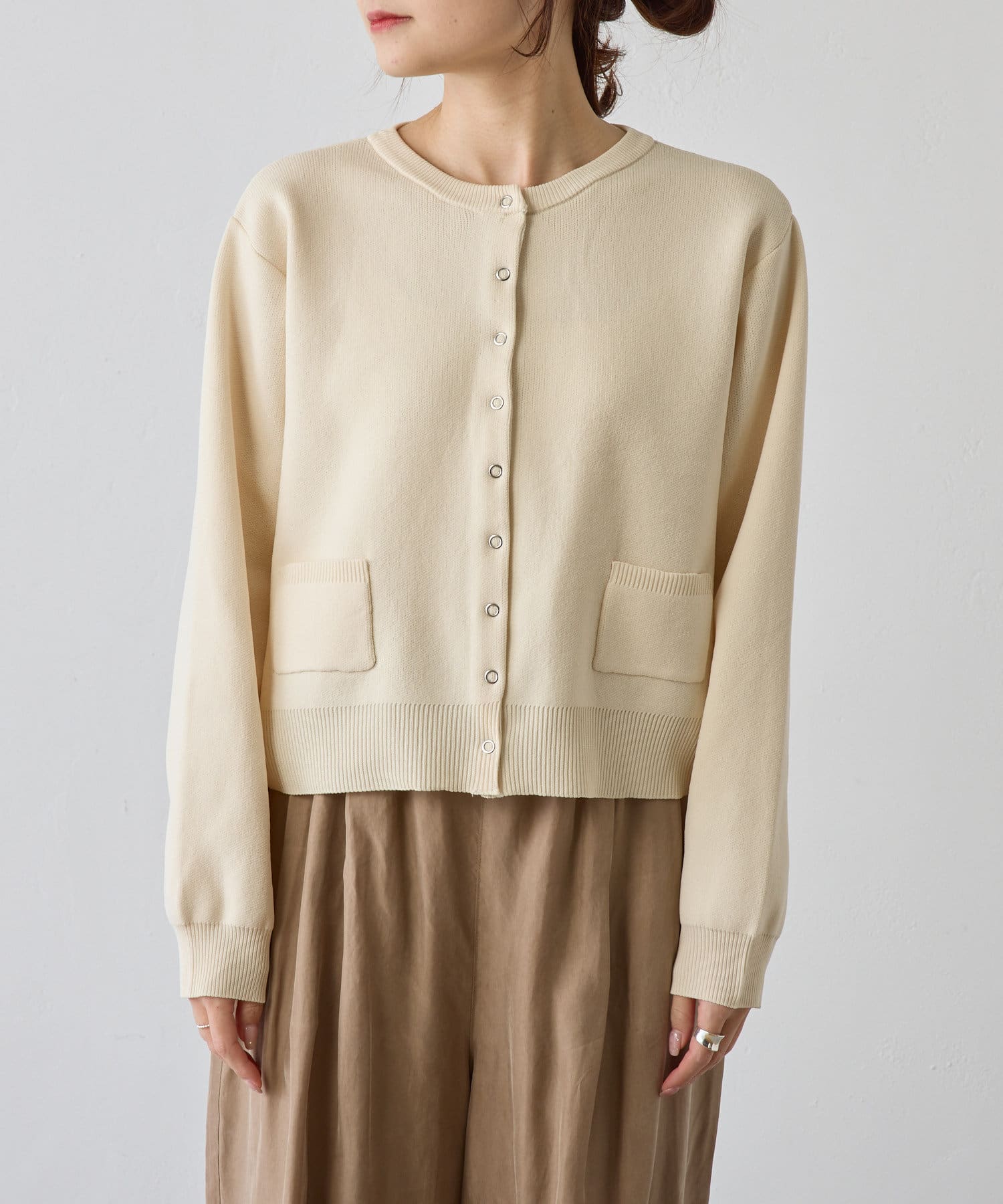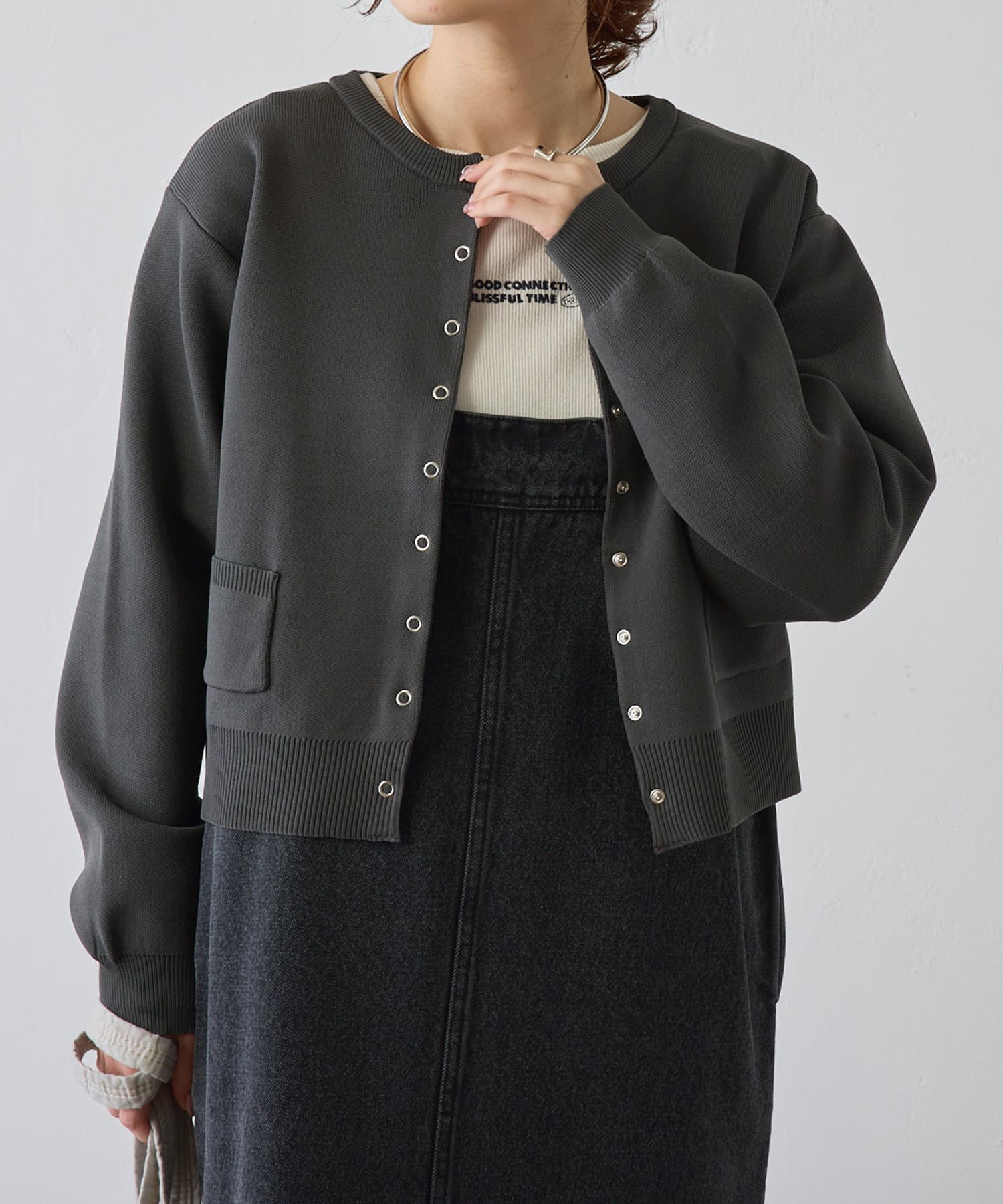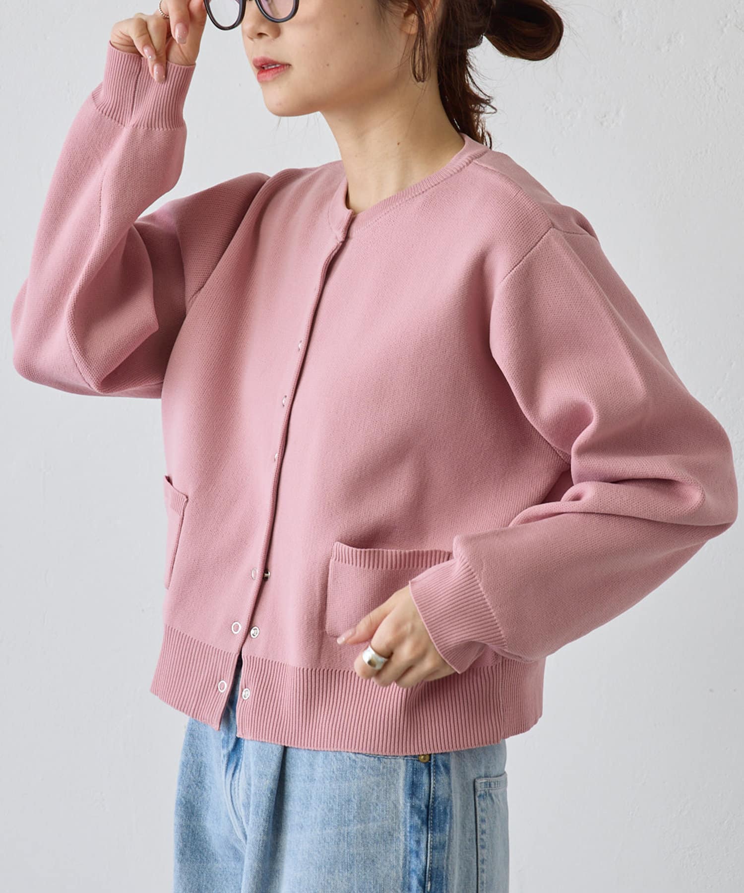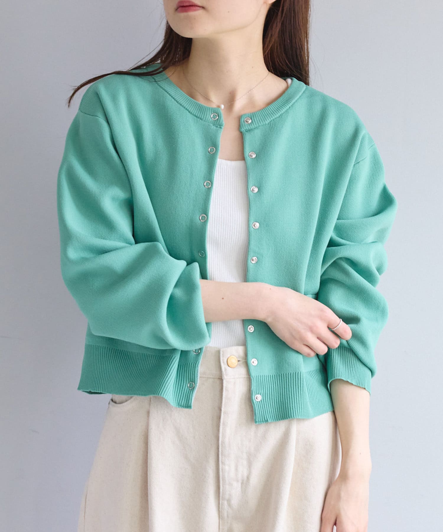 リングドットボタンとミニポケットがさりげないアクセントで目を惹くカーディガン。