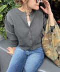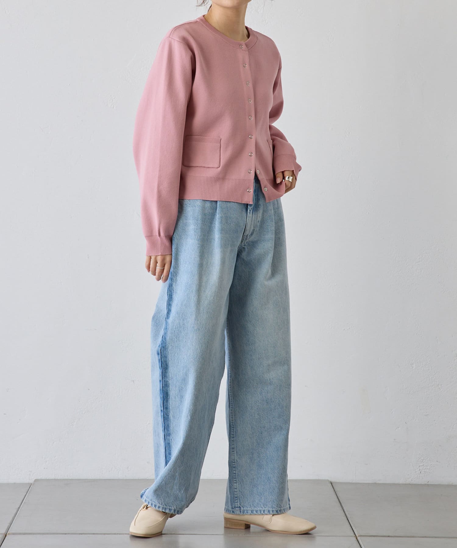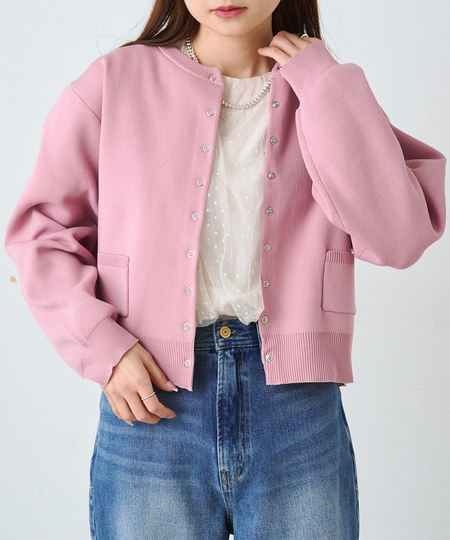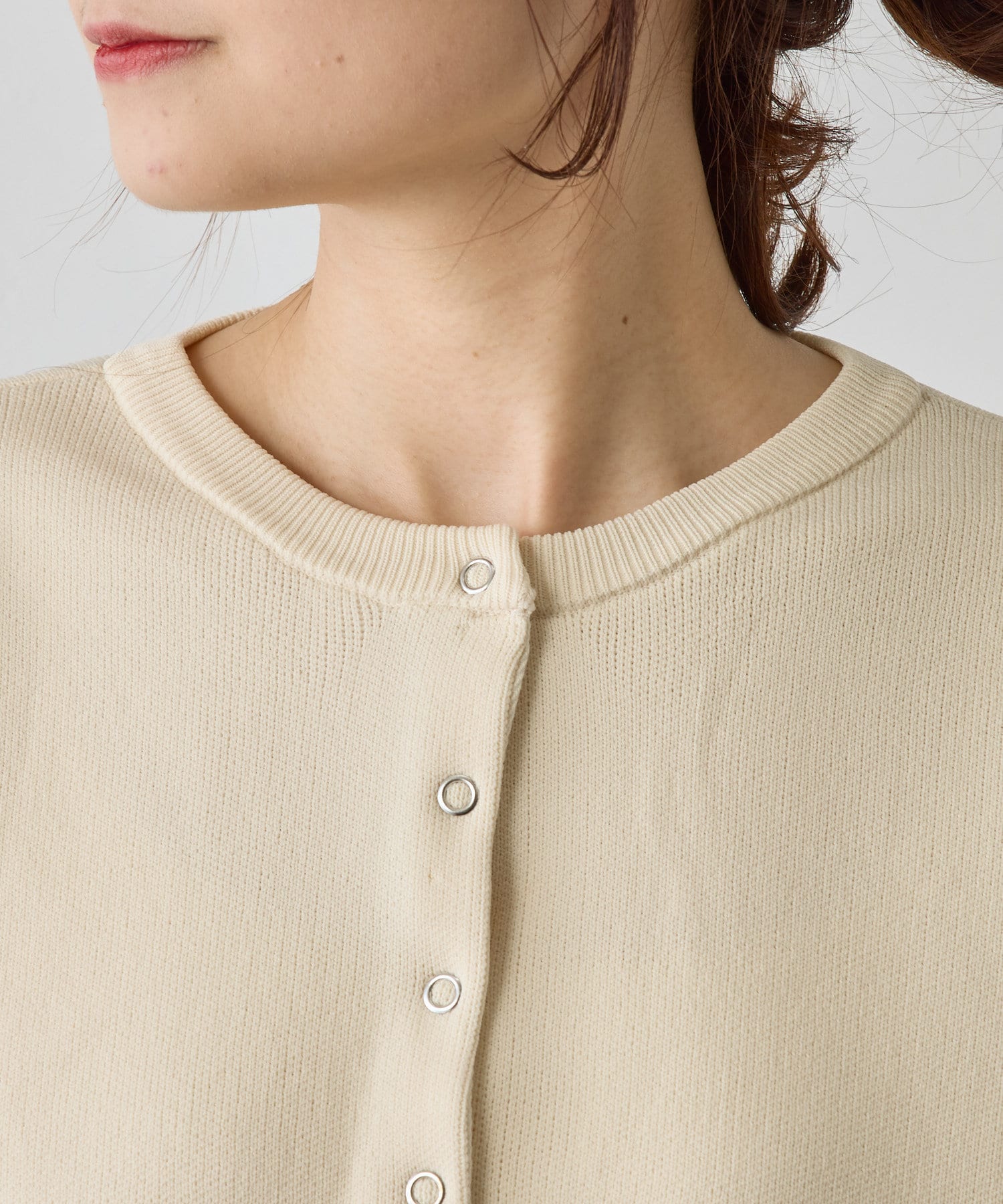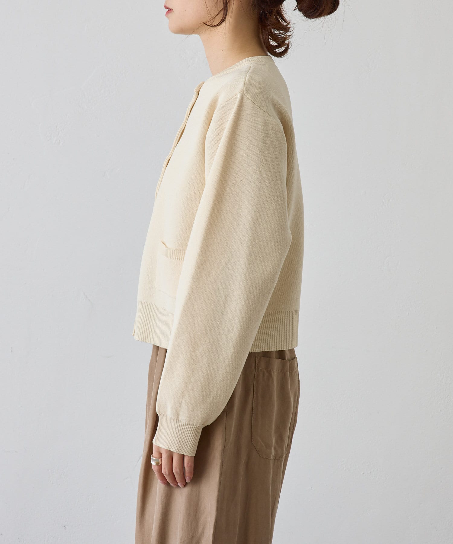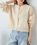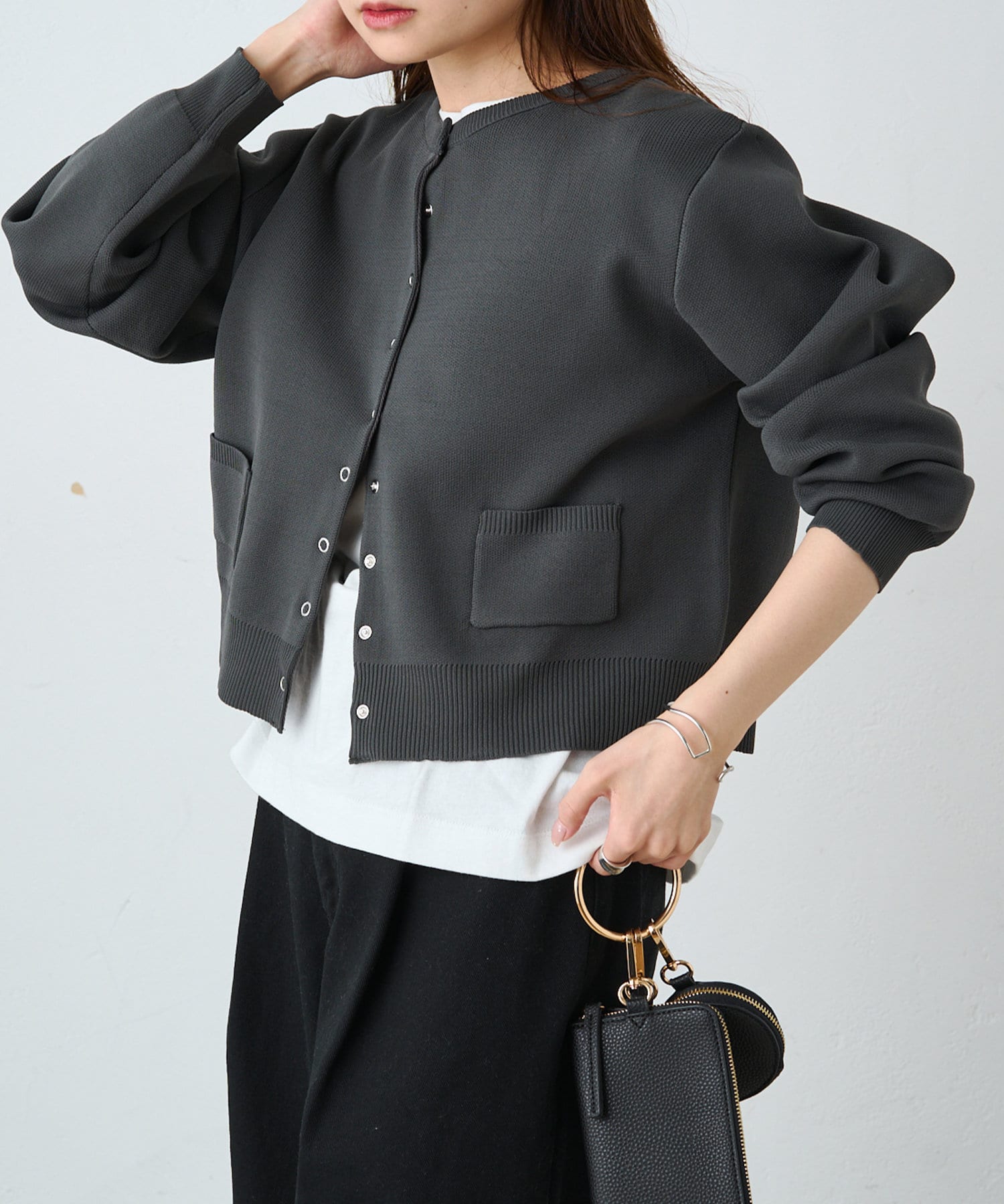 リングドットボタンとミニポケットがさりげないアクセントで目を惹くカーディガン。