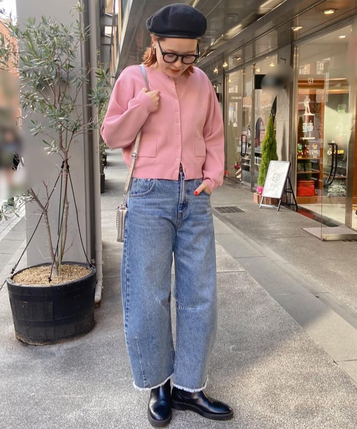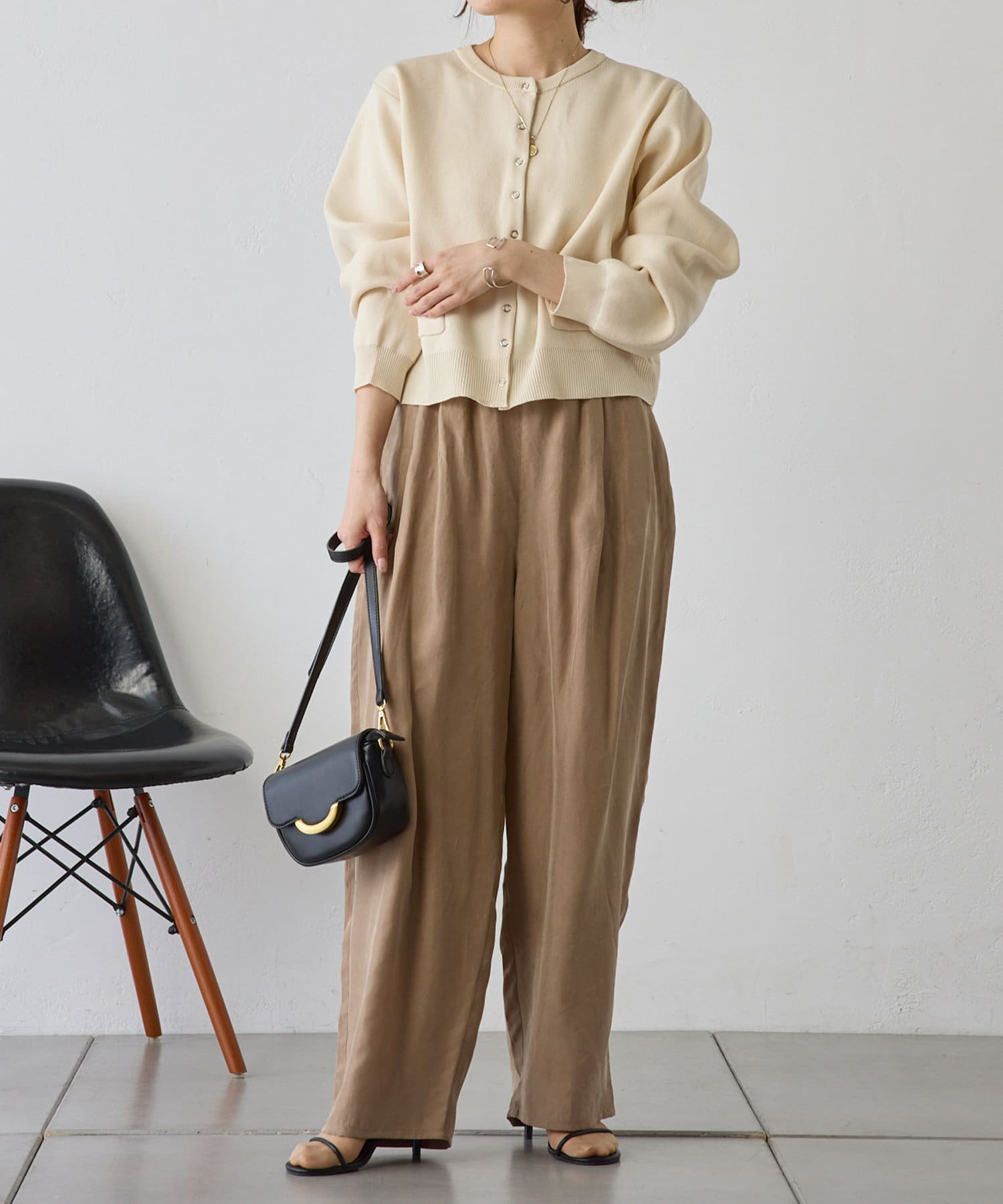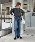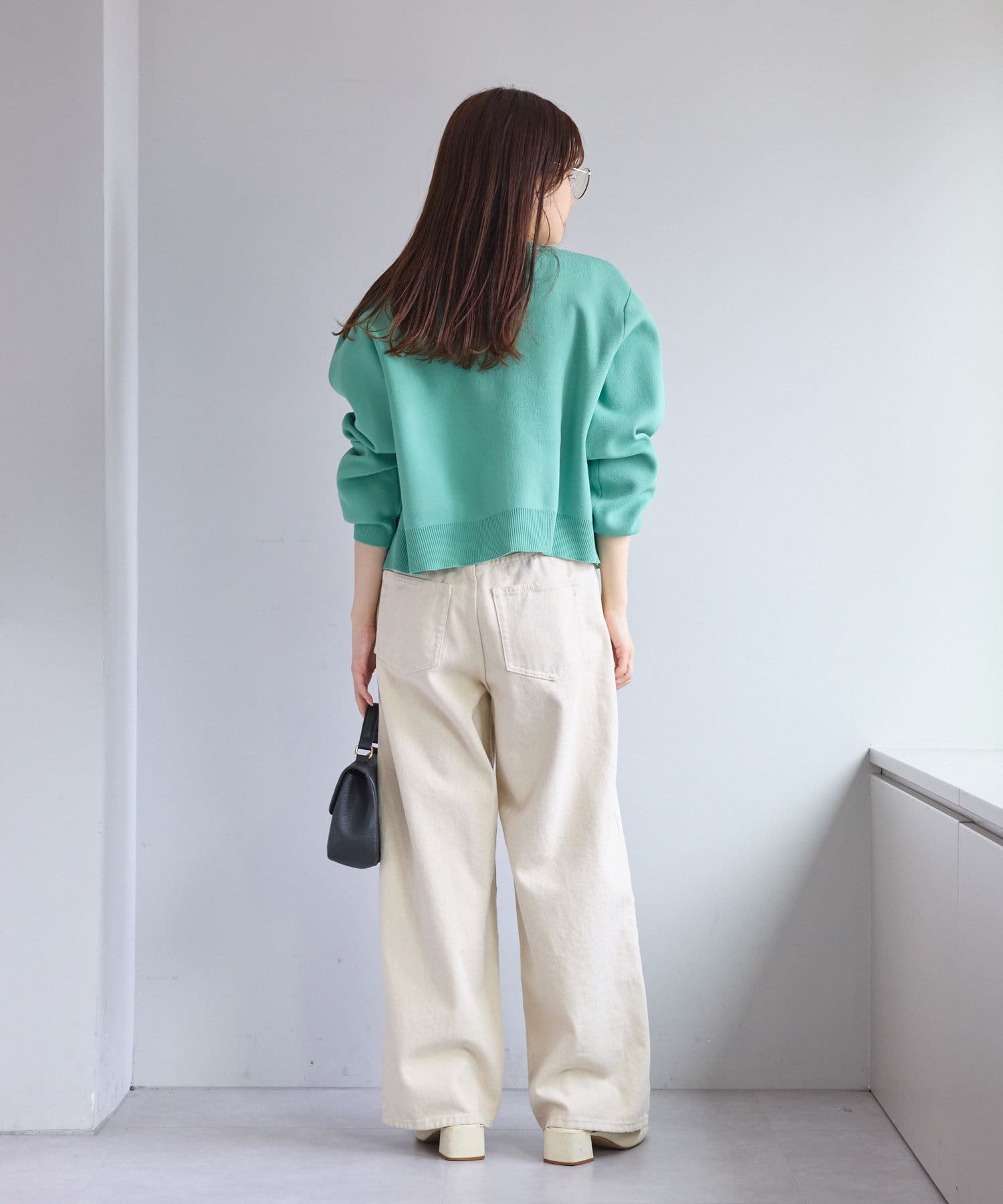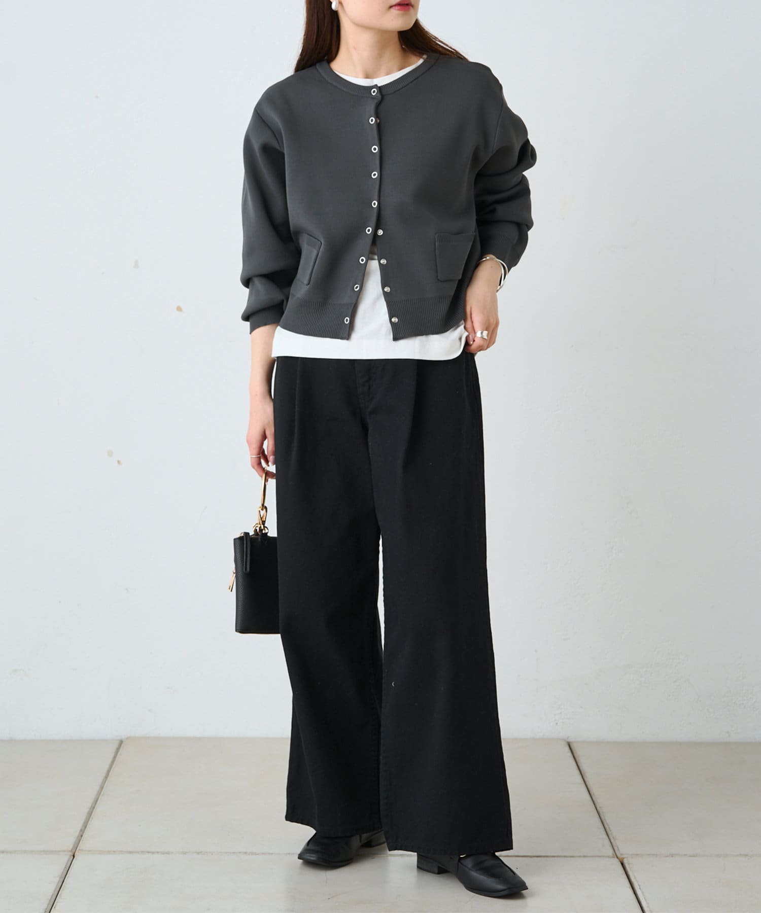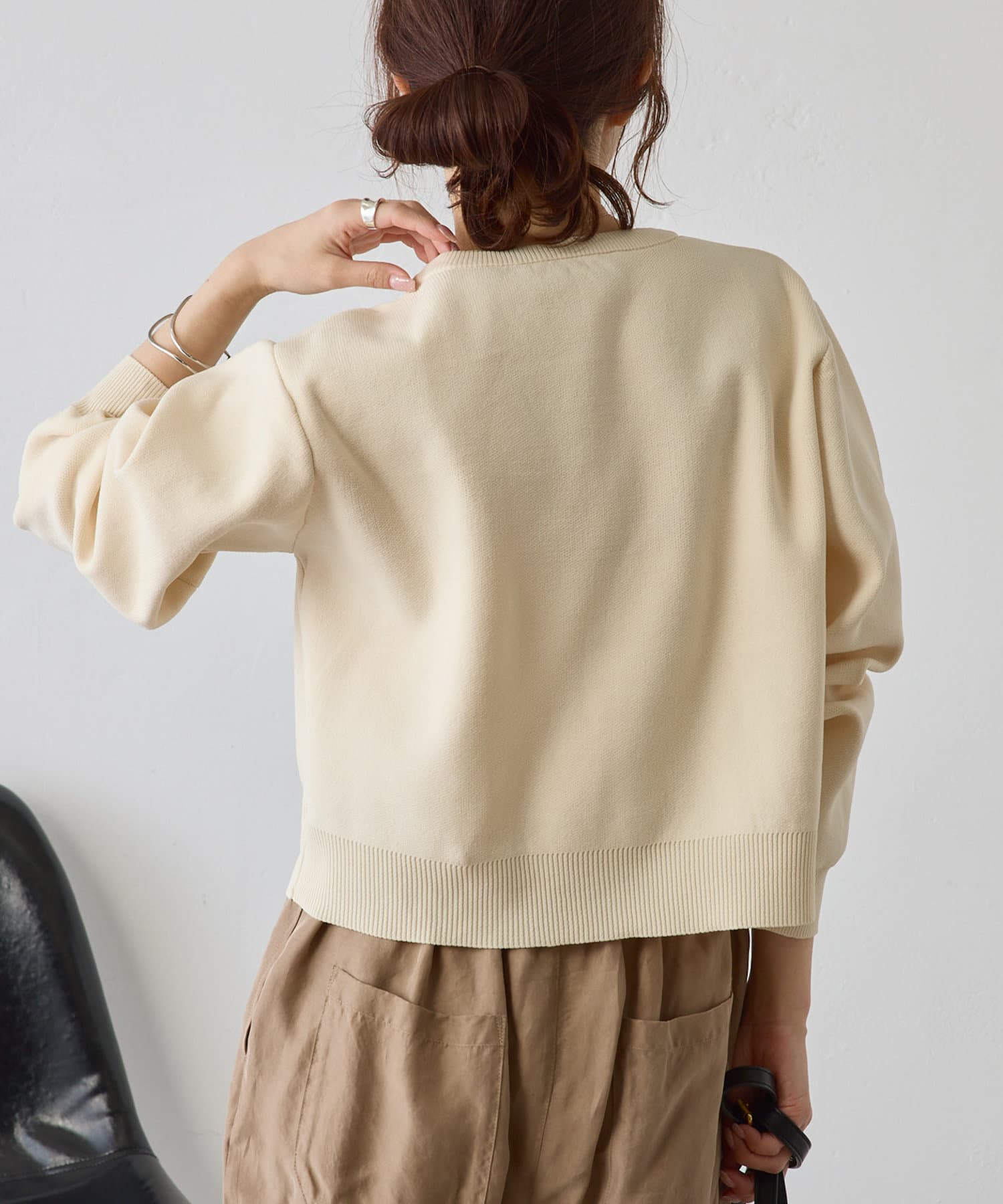 ラウンドネックなので寒い季節にはハイネックインナーとのレイヤードがおすすめ。