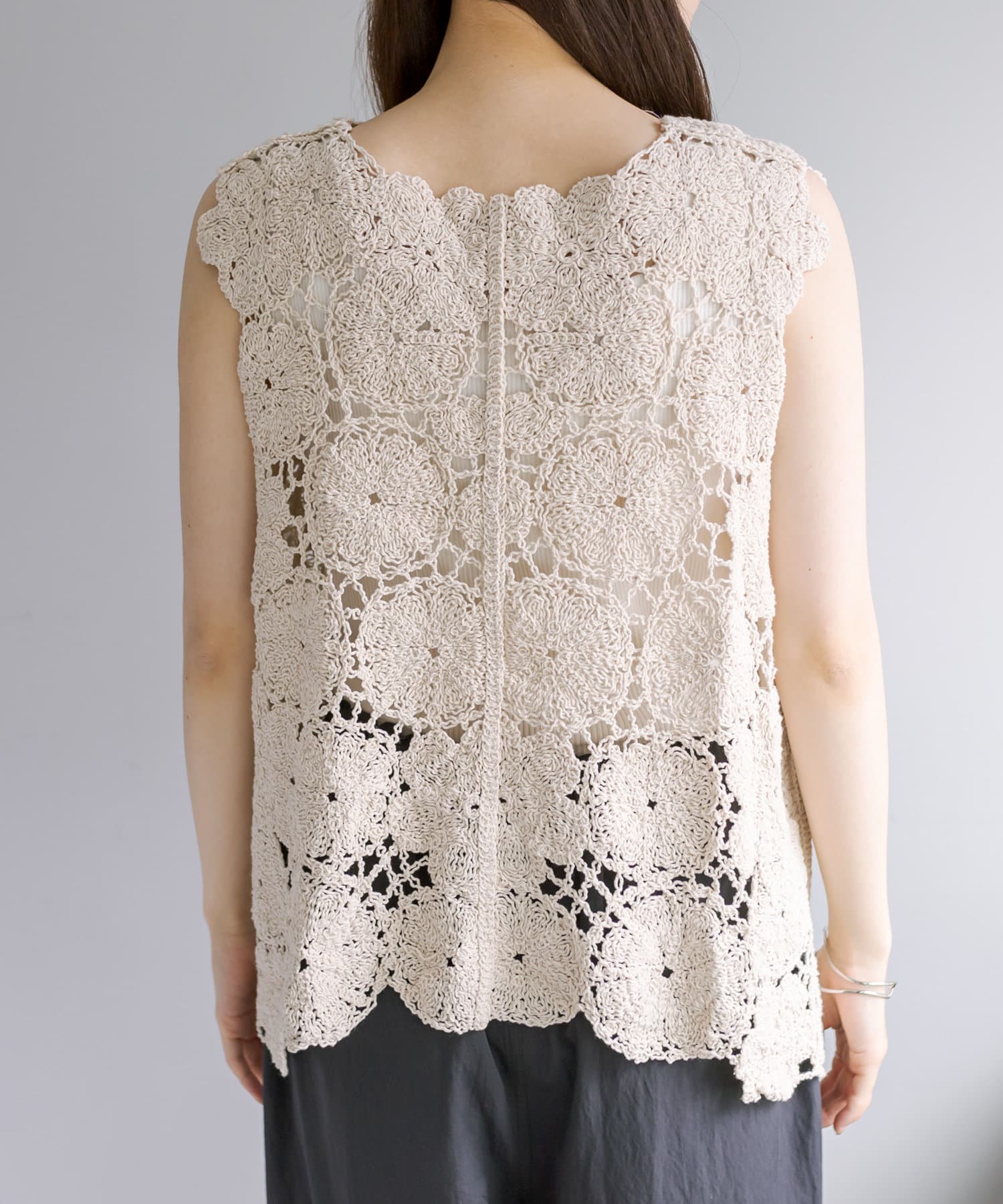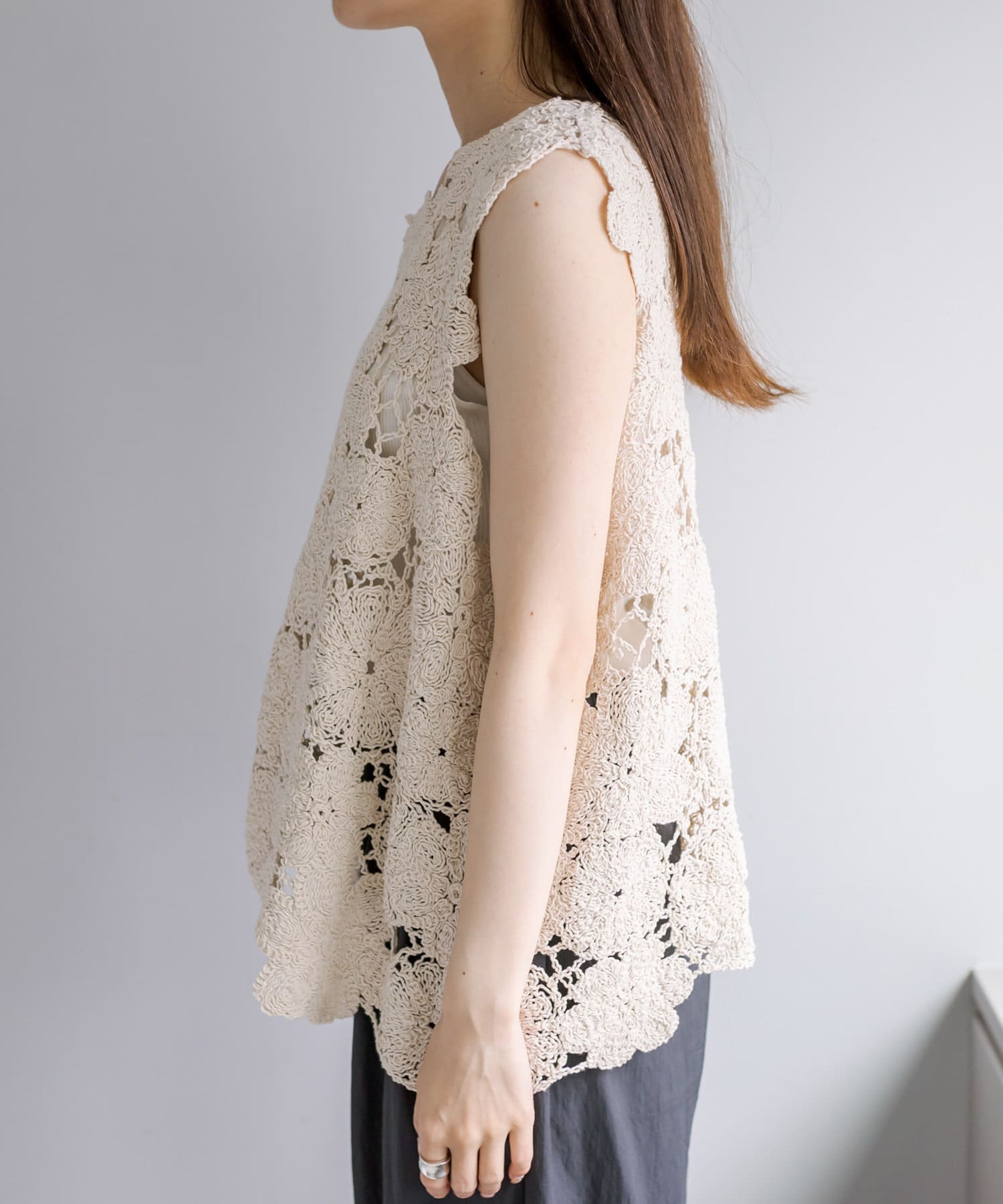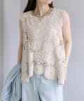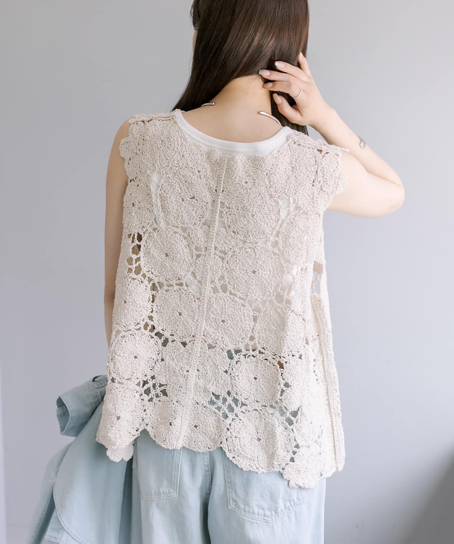 コーデに華やかさをプラスしてくれるカギ針編み風ベスト。