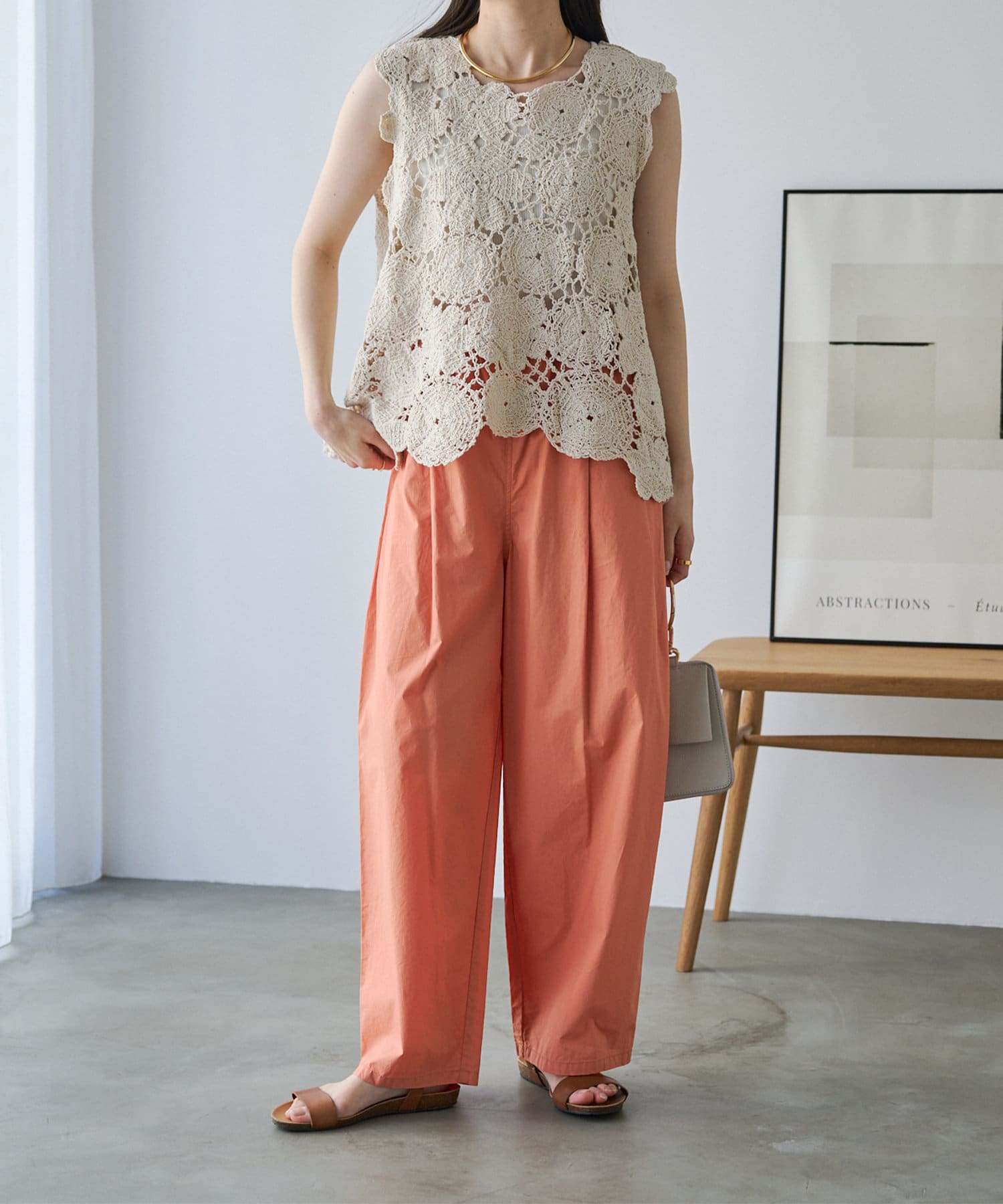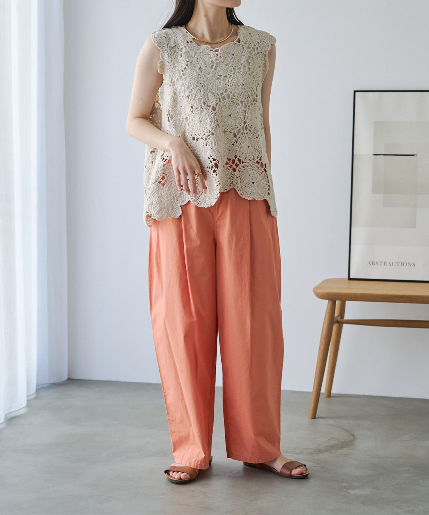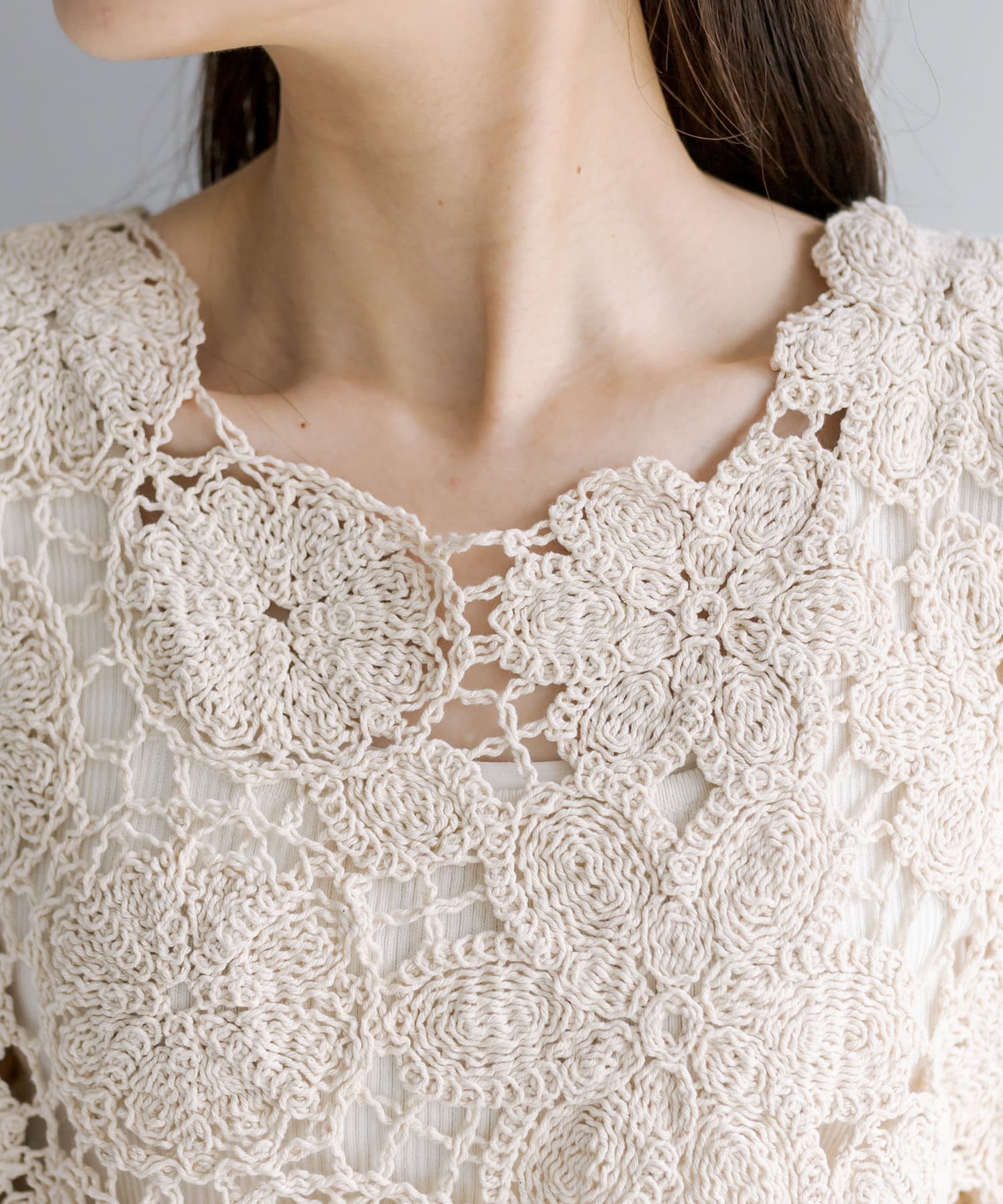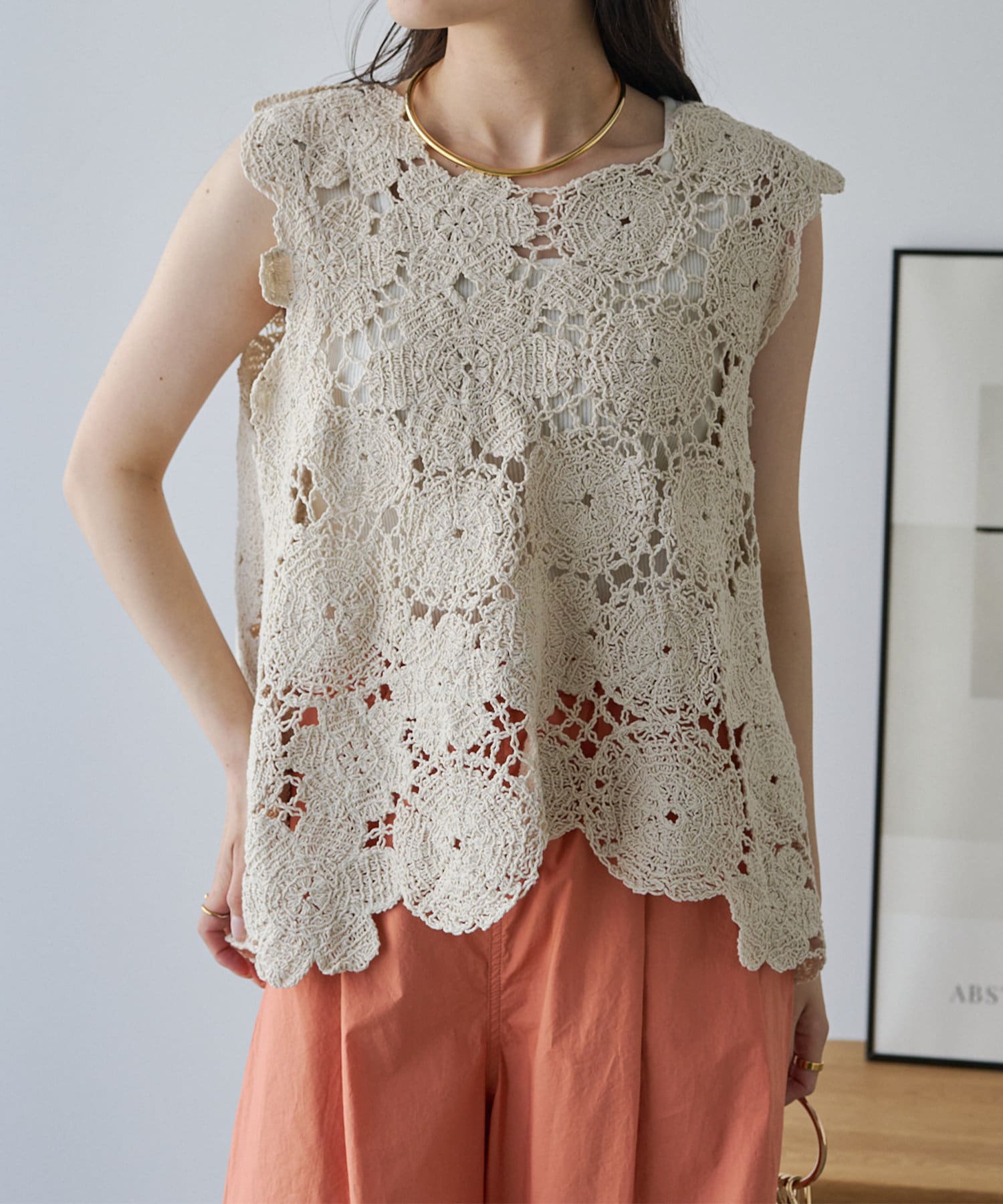コーデに華やかさをプラスしてくれるカギ針編み風ベスト。