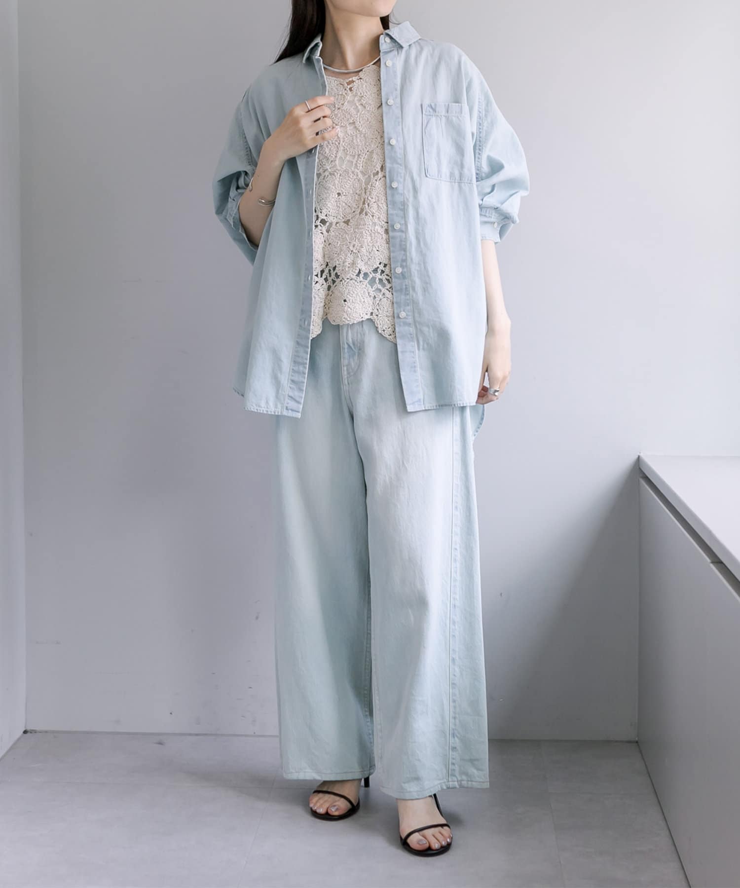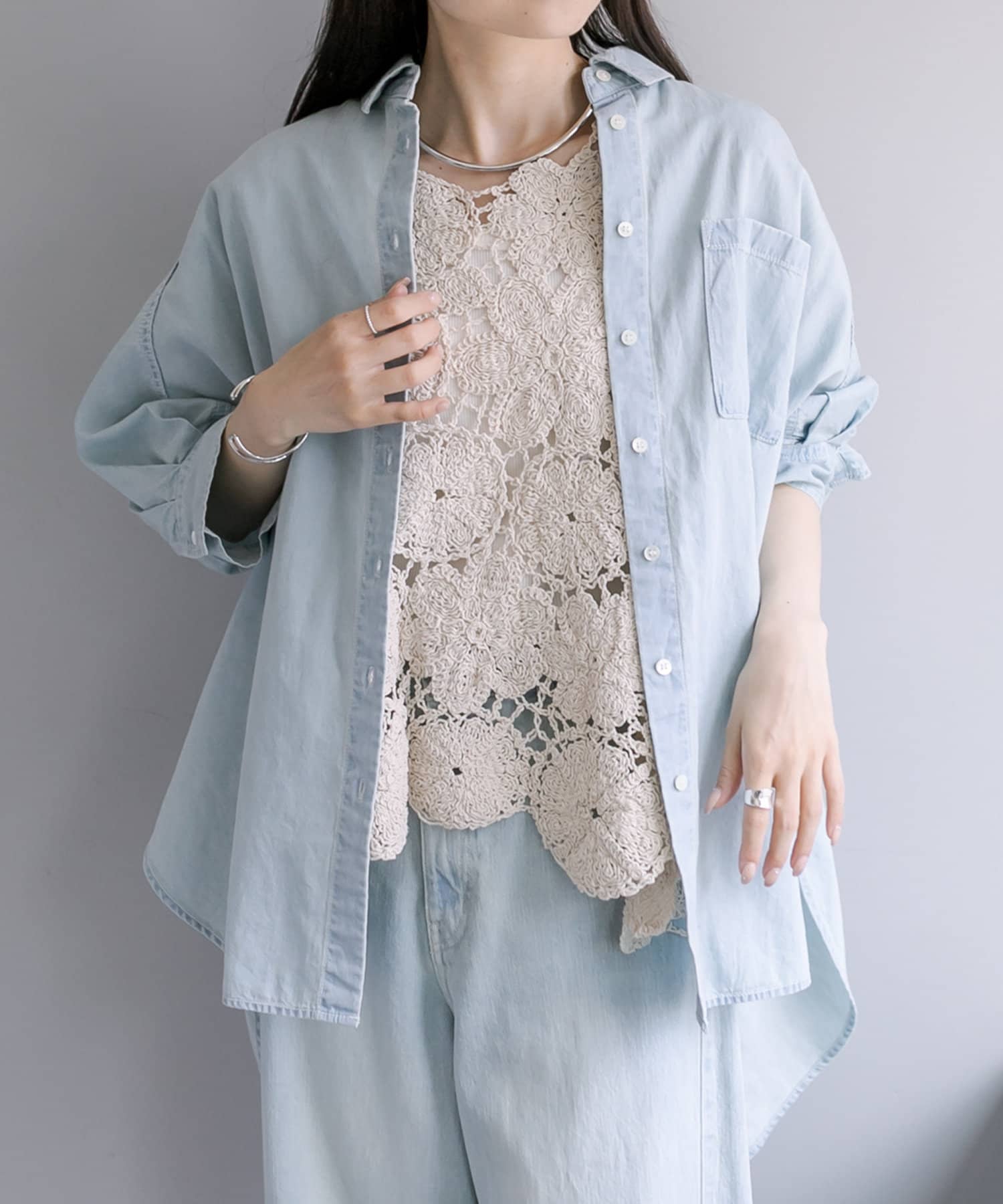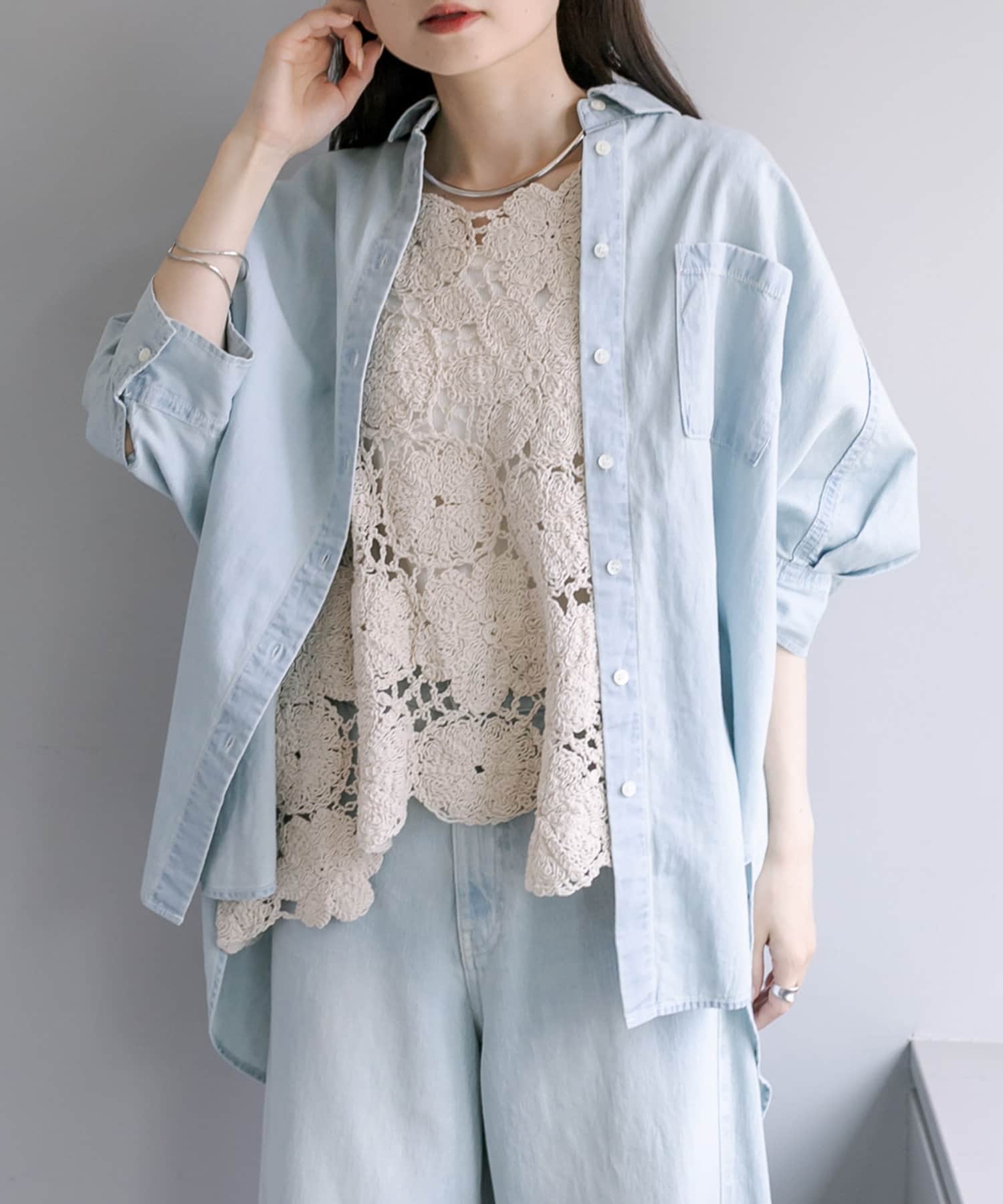 シアーシャツなど軽い羽織と重ねてもしっかりと存在感があるのでサマになります。