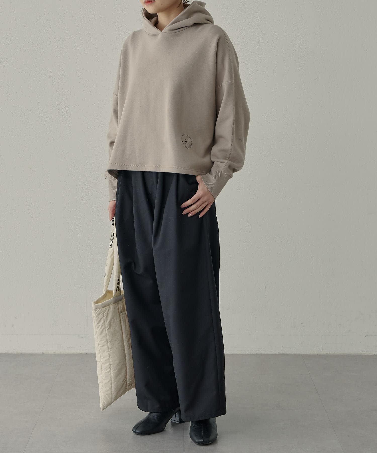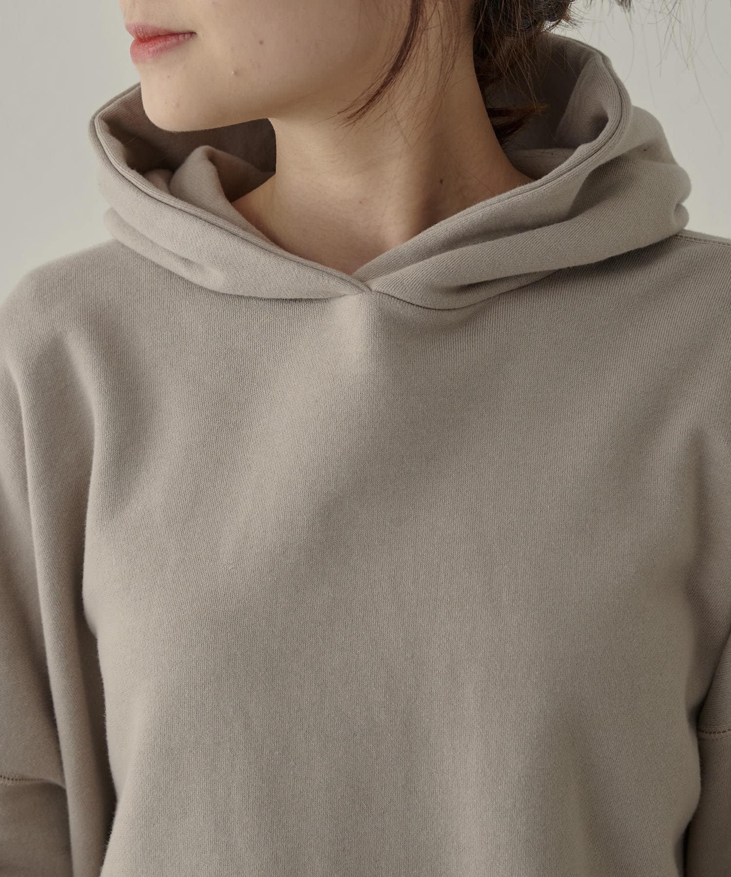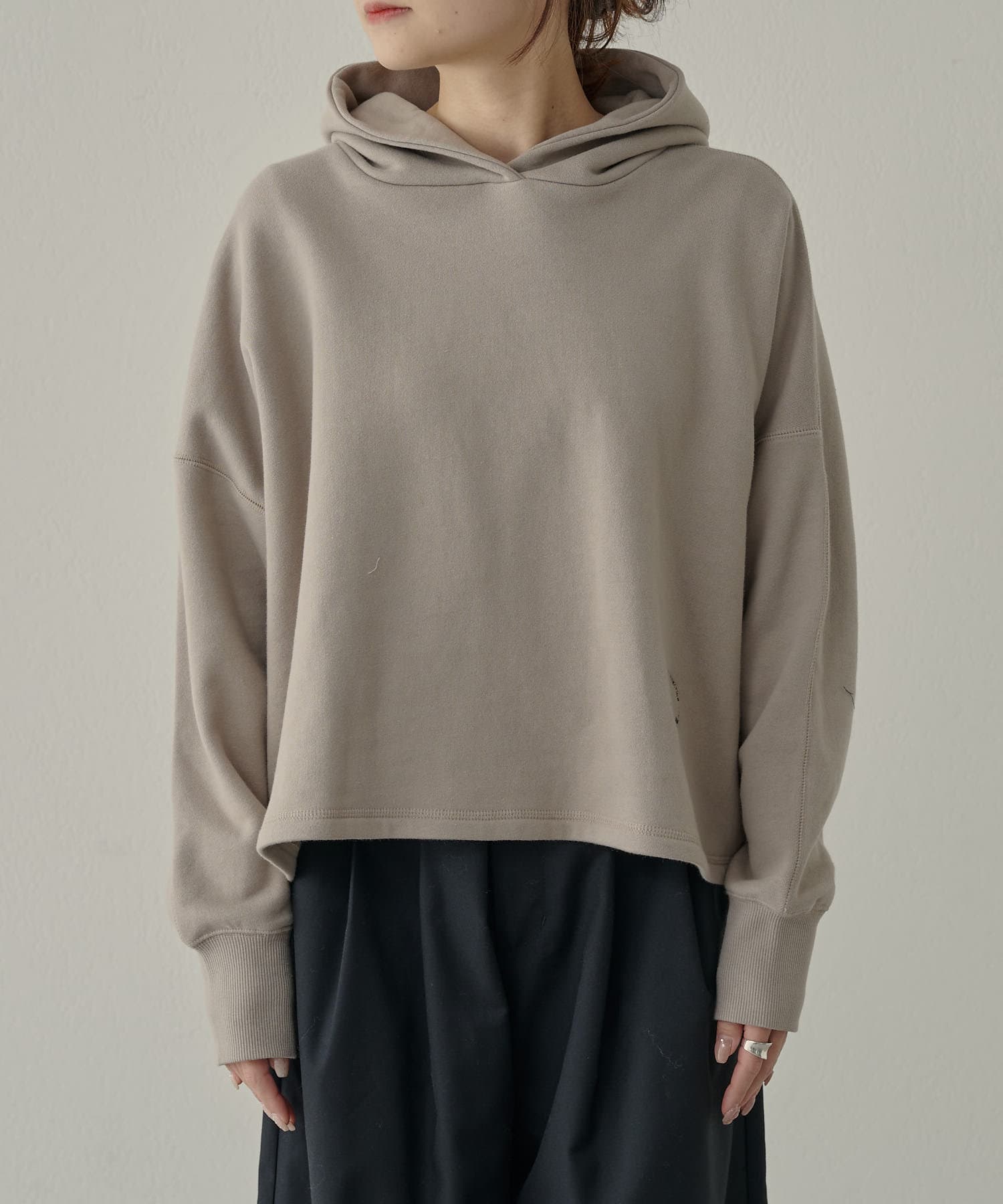 カジュアルな印象の強いパーカーですが、肩位置を落としたドロップショルダーが丸みのある女性らしいシルエットを演出してくれます。