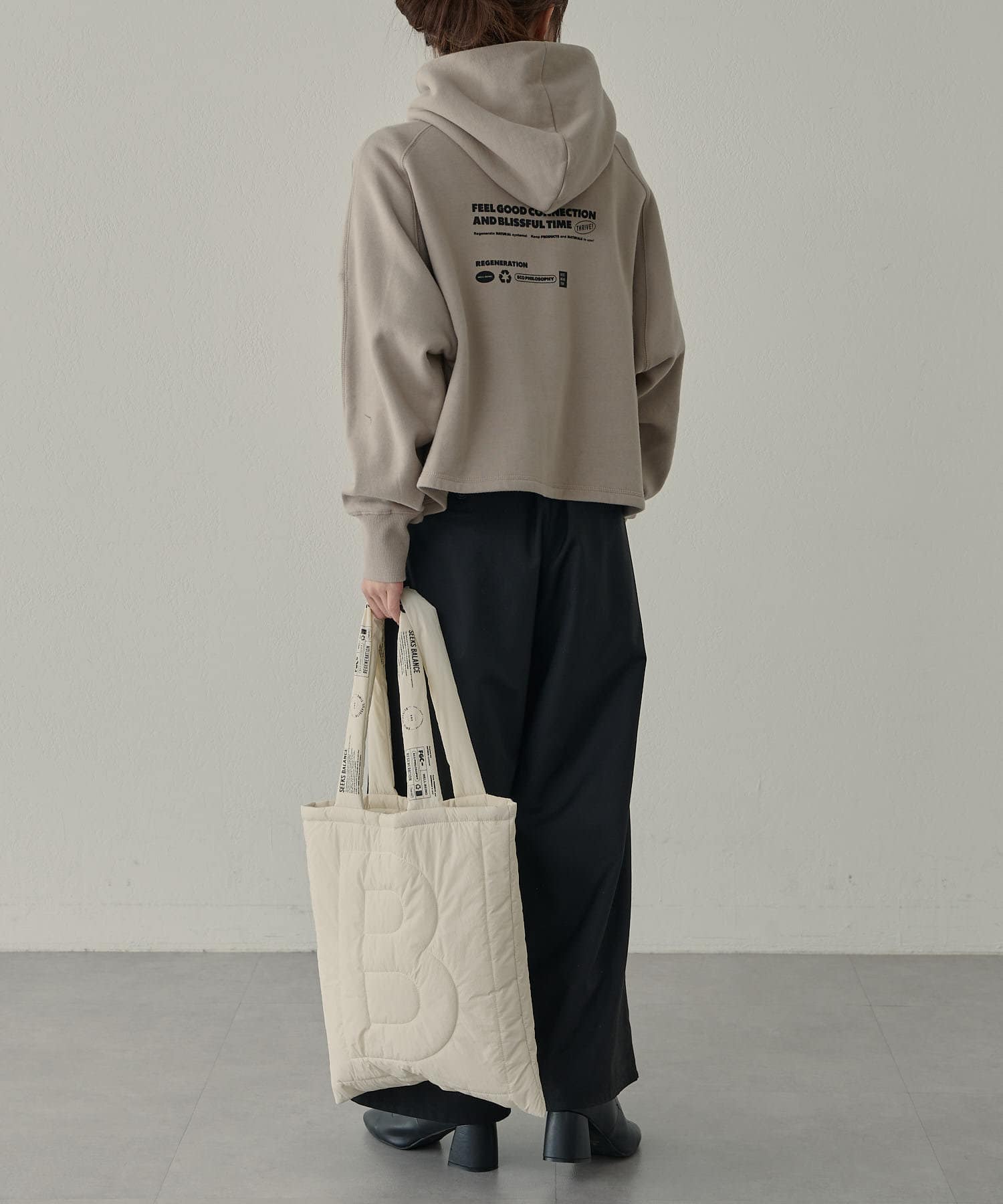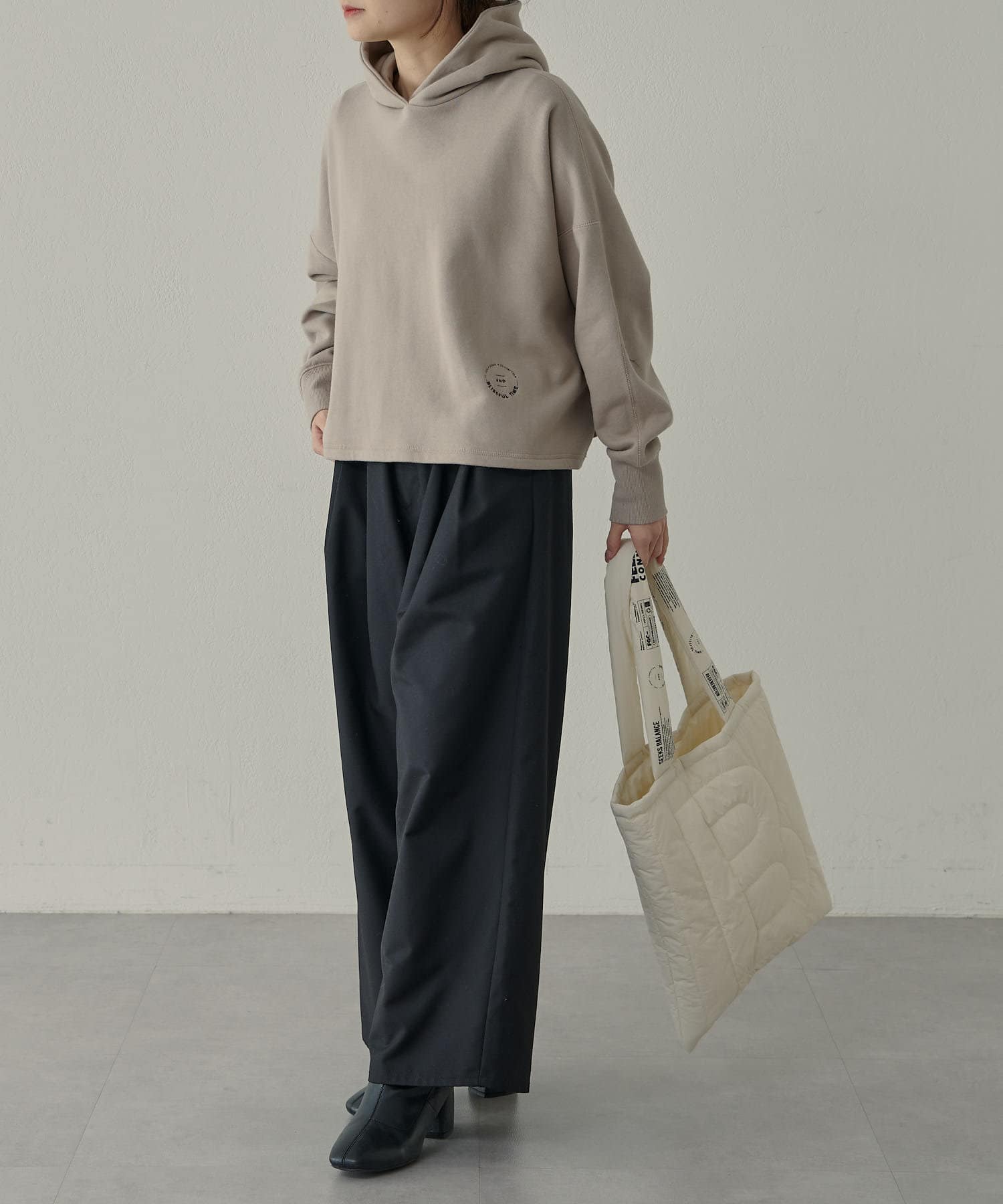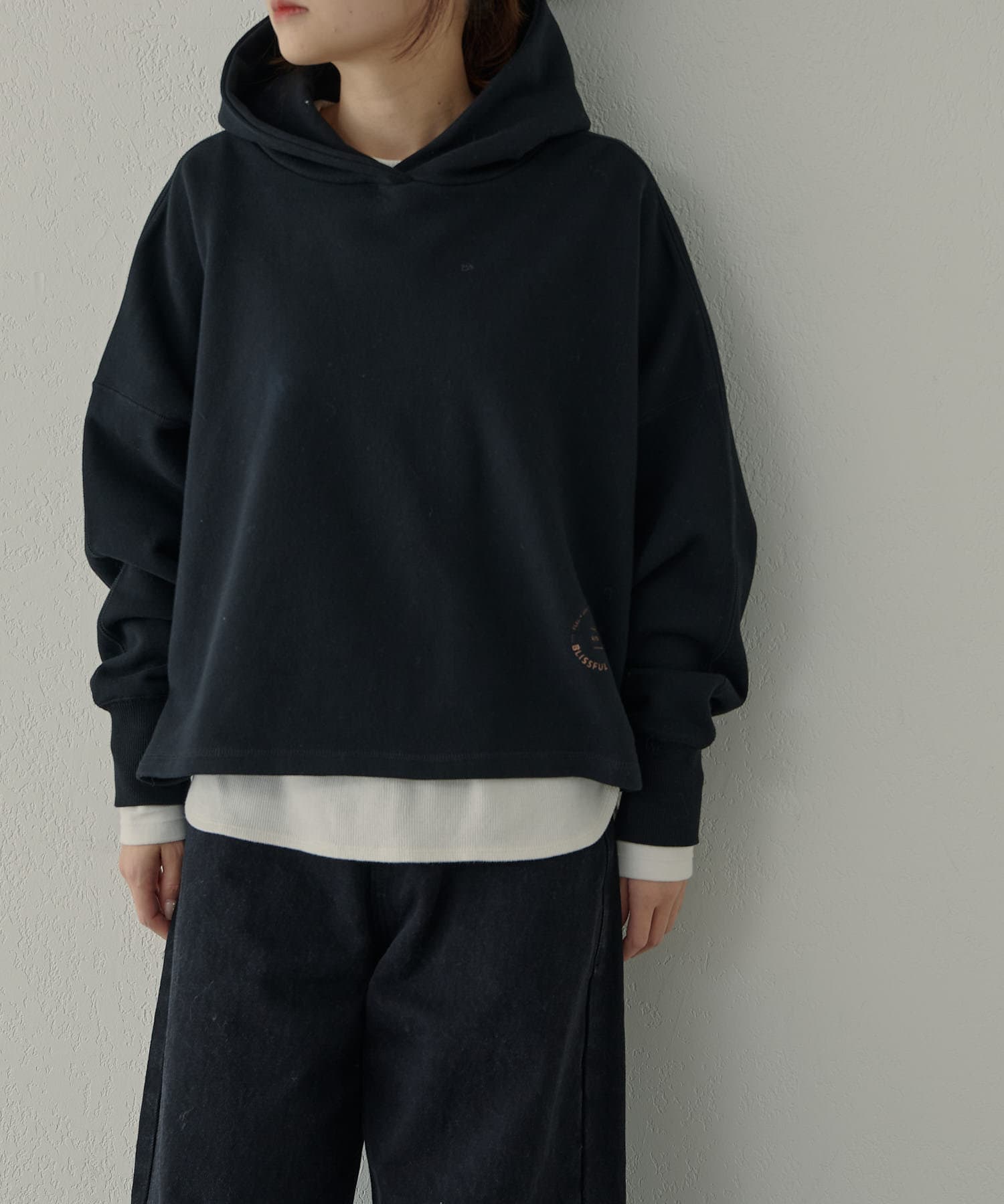 カジュアルな印象の強いパーカーですが、肩位置を落としたドロップショルダーが丸みのある女性らしいシルエットを演出してくれます。