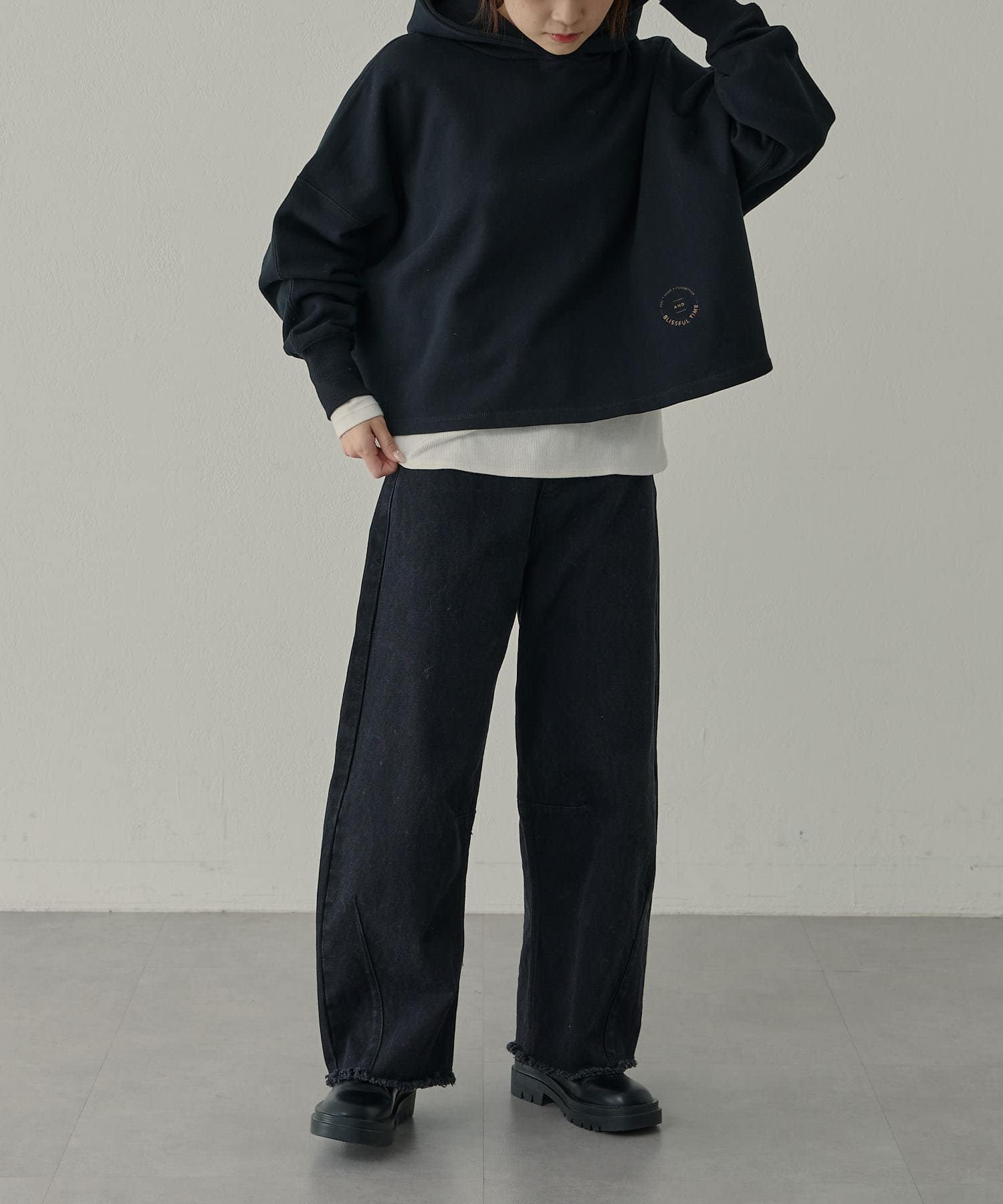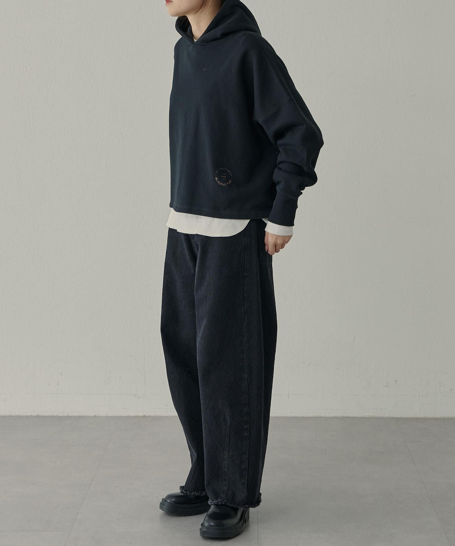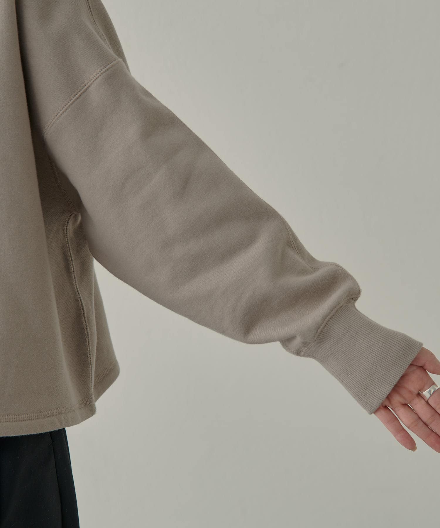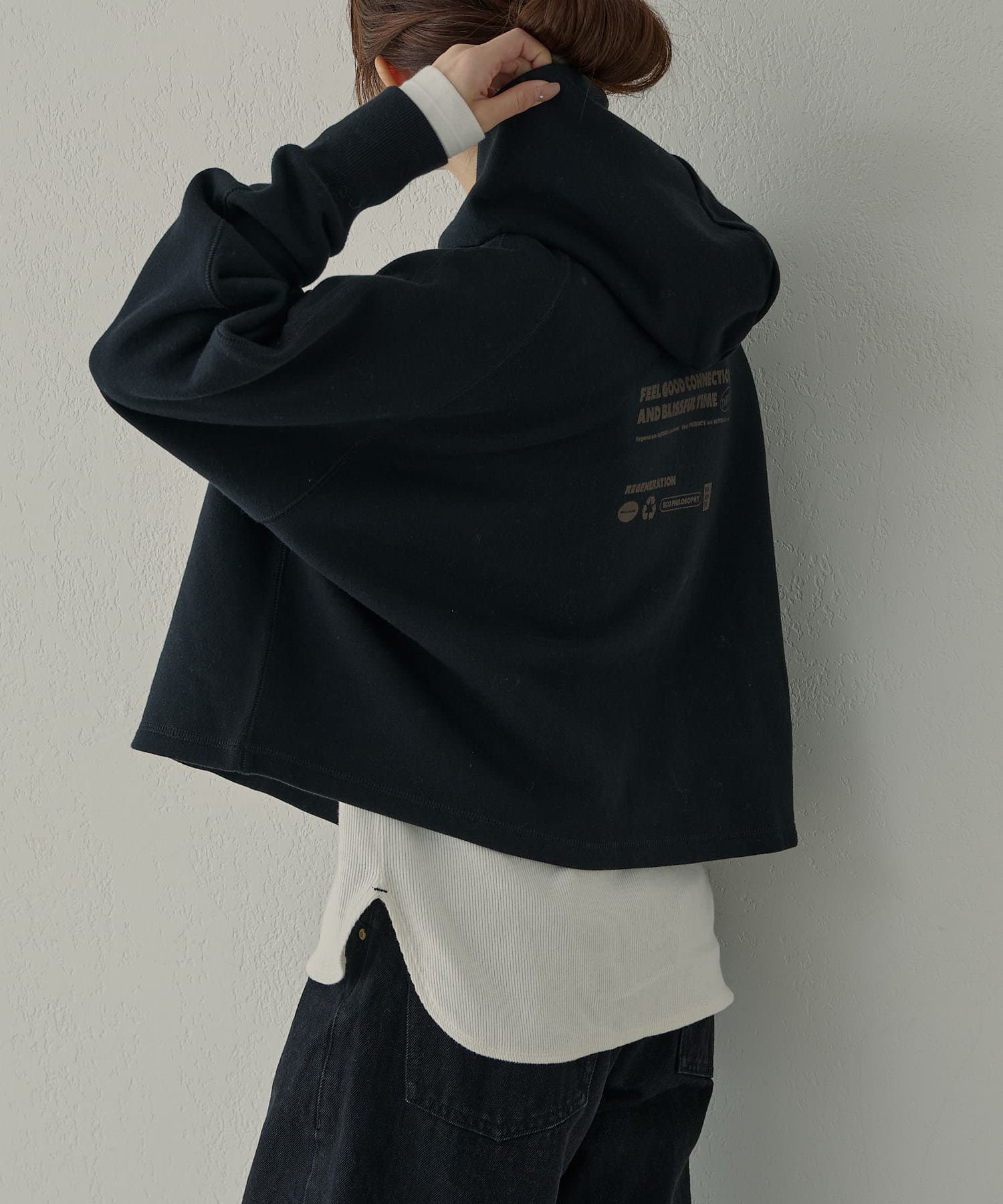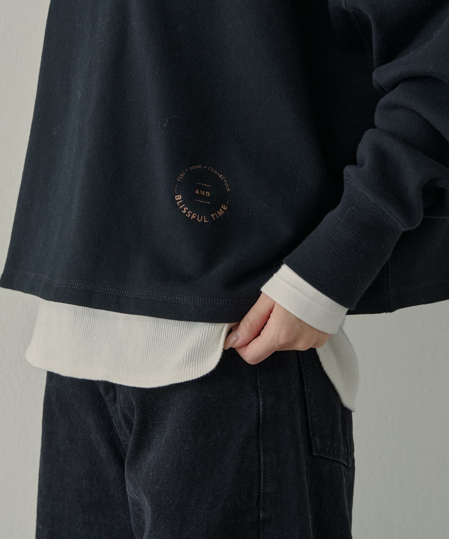 サイズ感:ゆったりとしたサイズ感で一枚でも重ね着でもストレスなく着用いただけます。